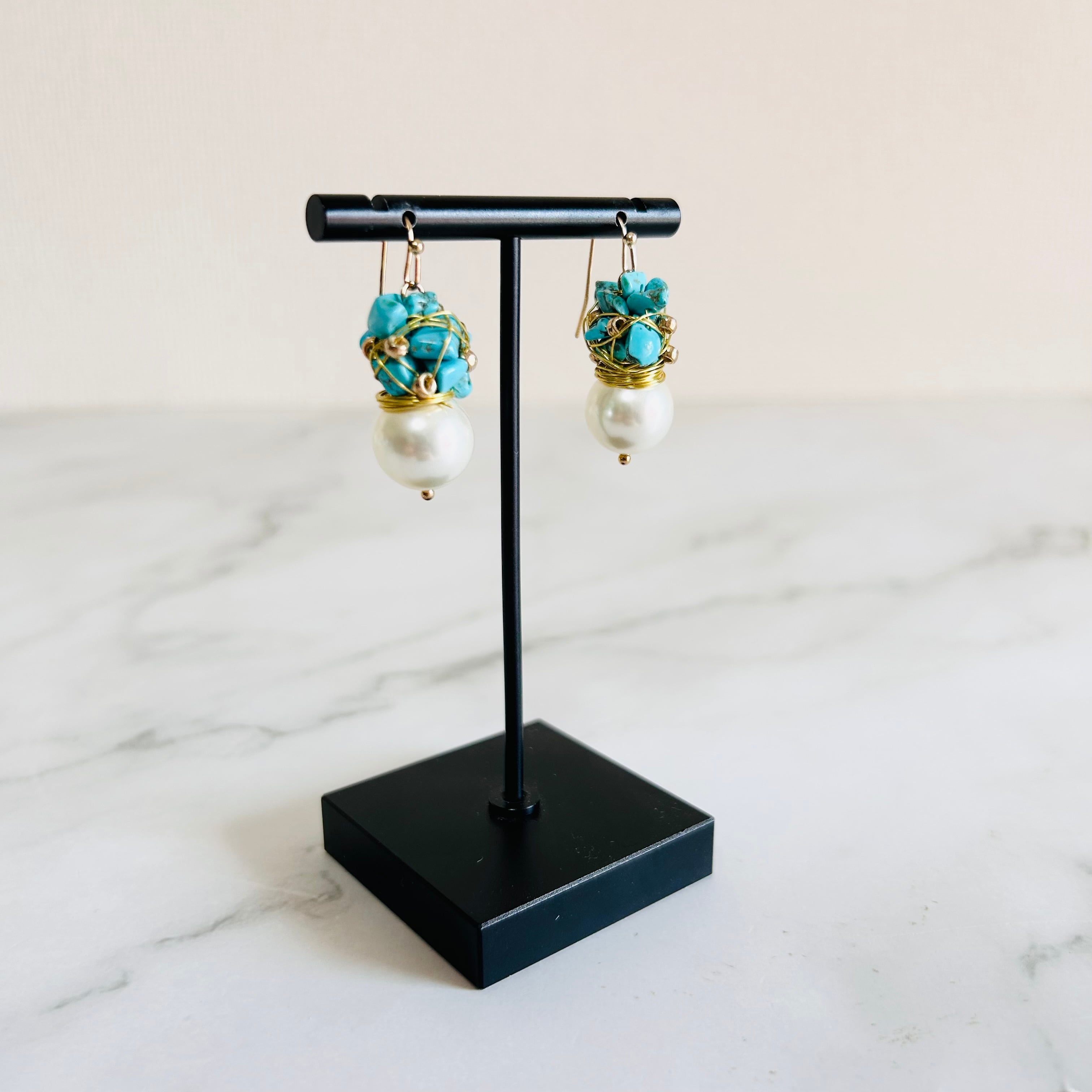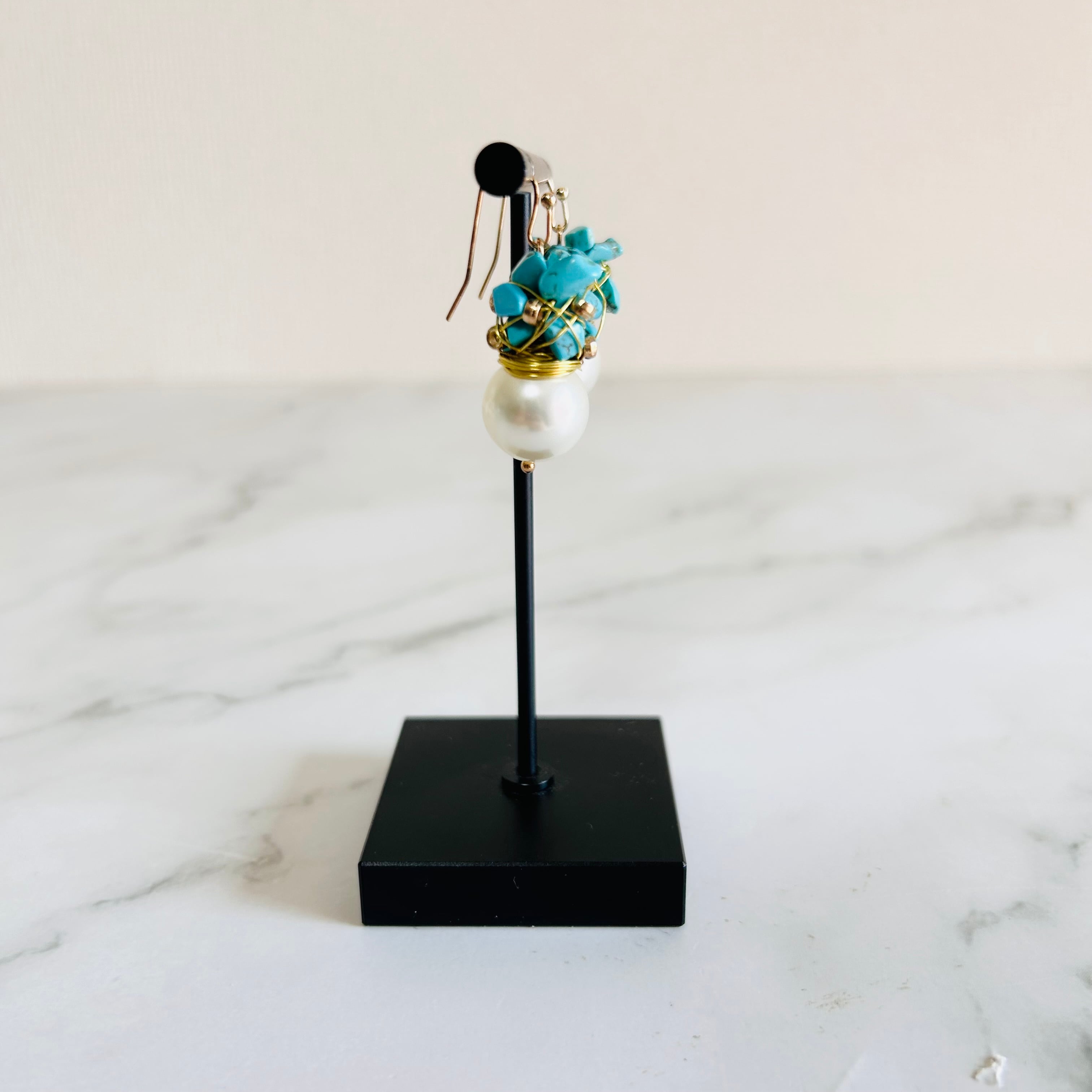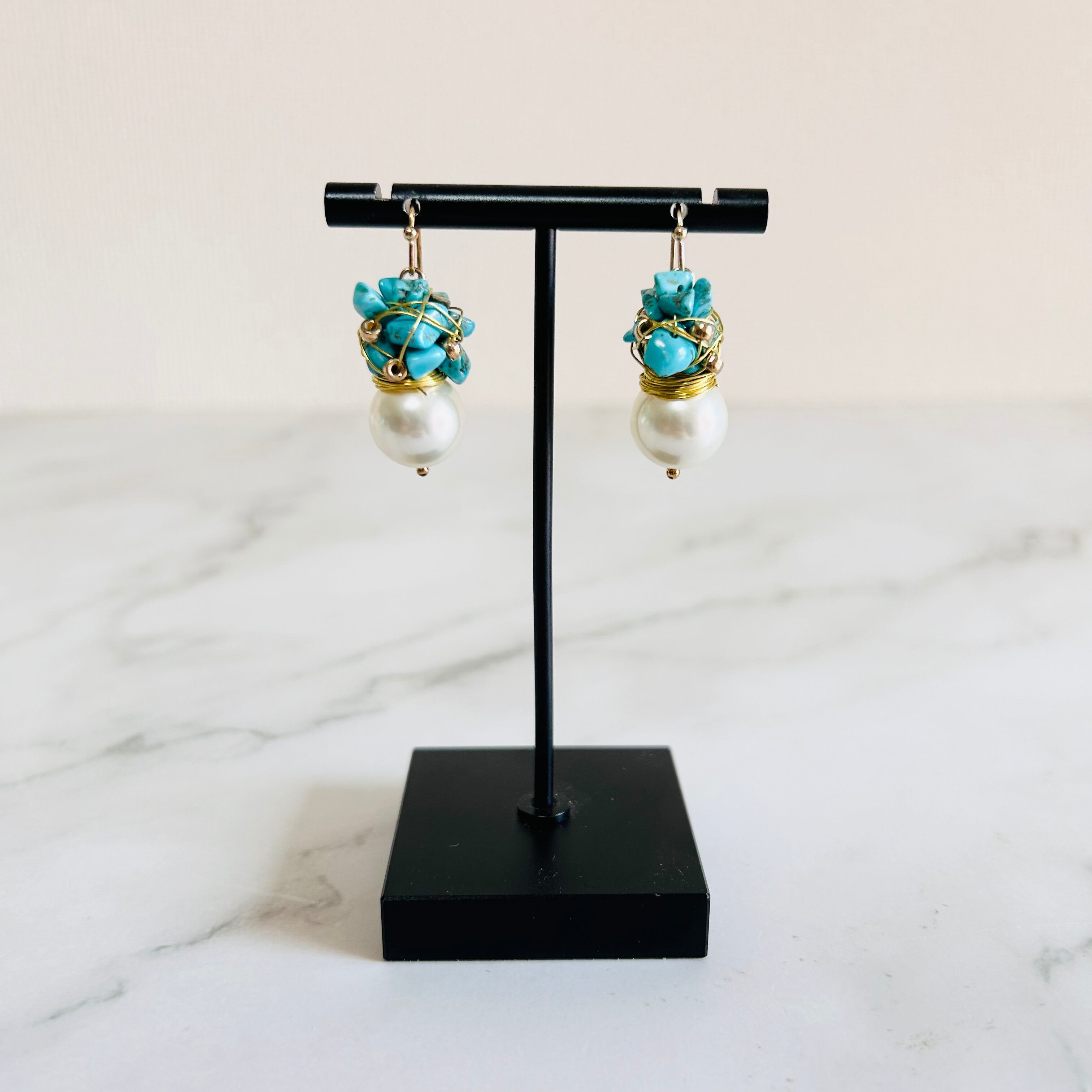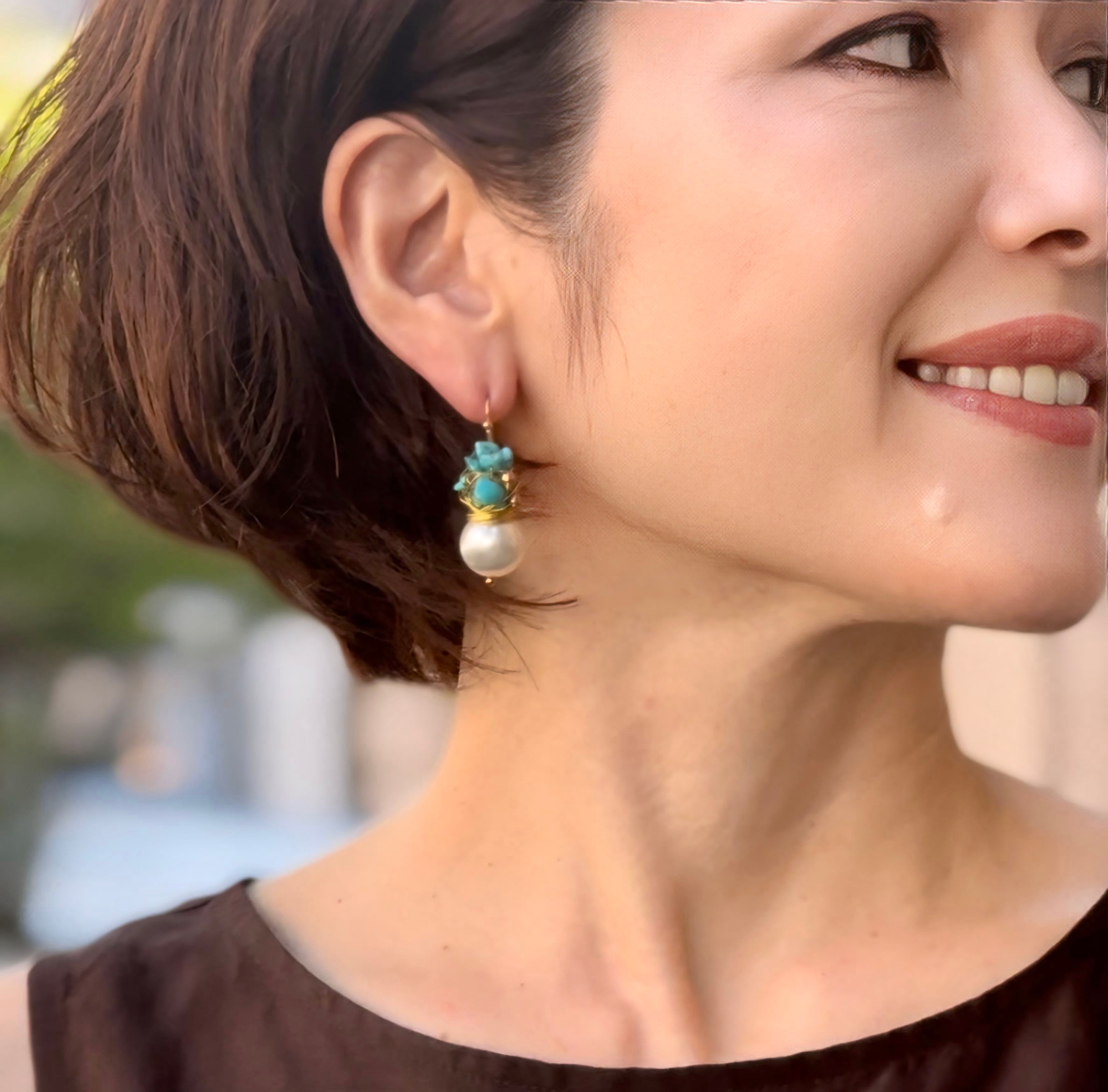 鮮やかなターコイズブルーのさざれ石を贅沢にあしらい、ころんとした大粒パールを添えた、涼しげで存在感のあるピアスです。