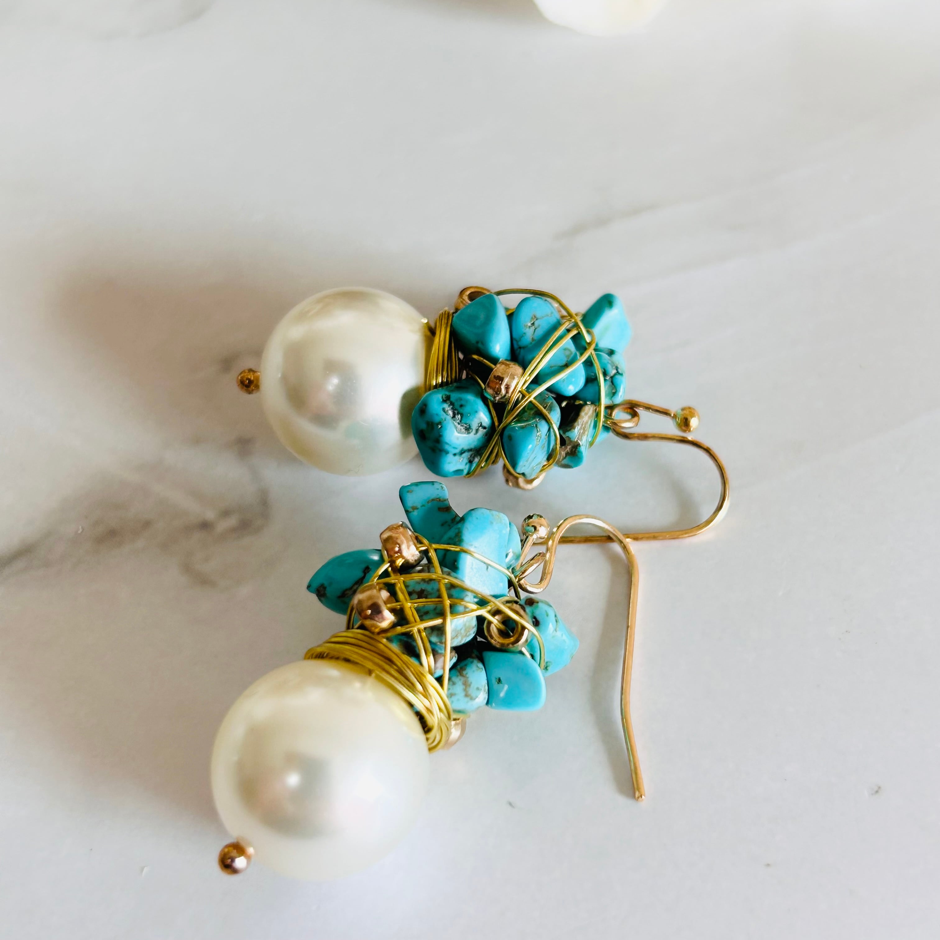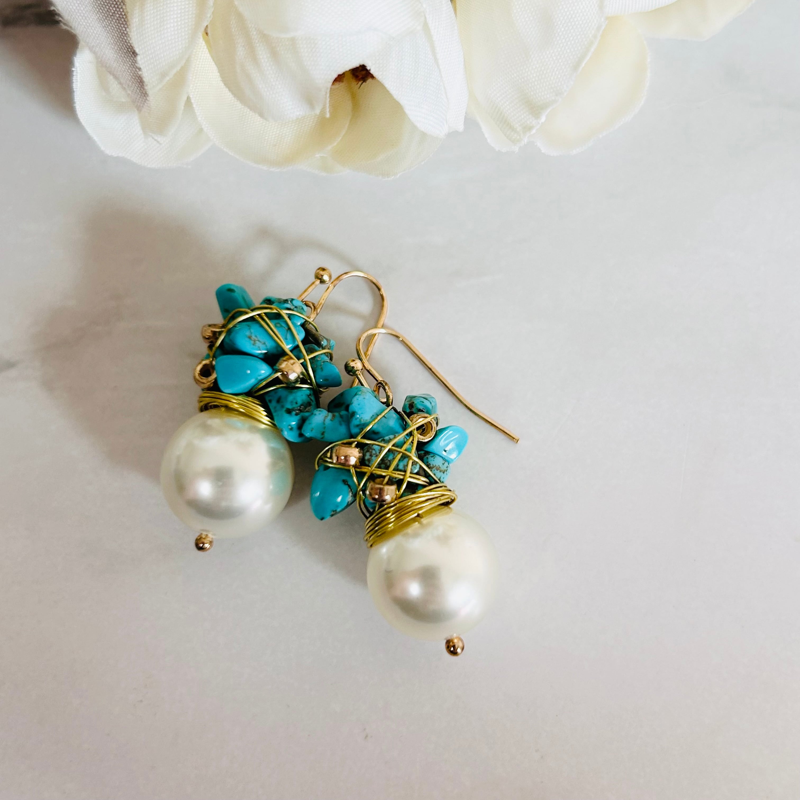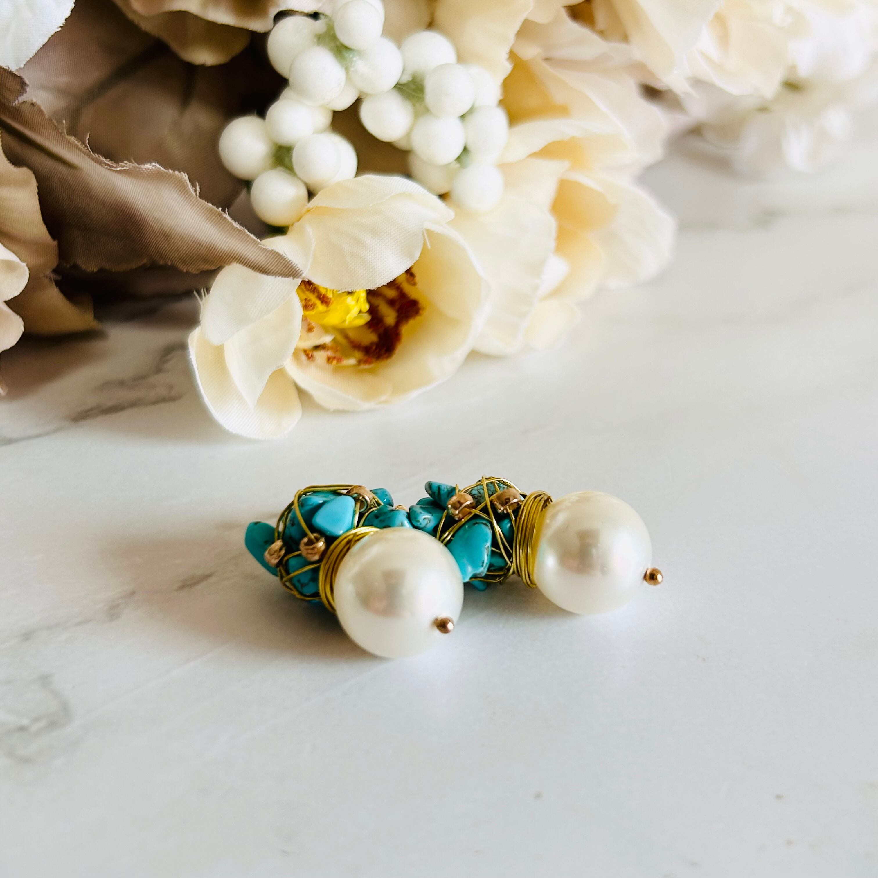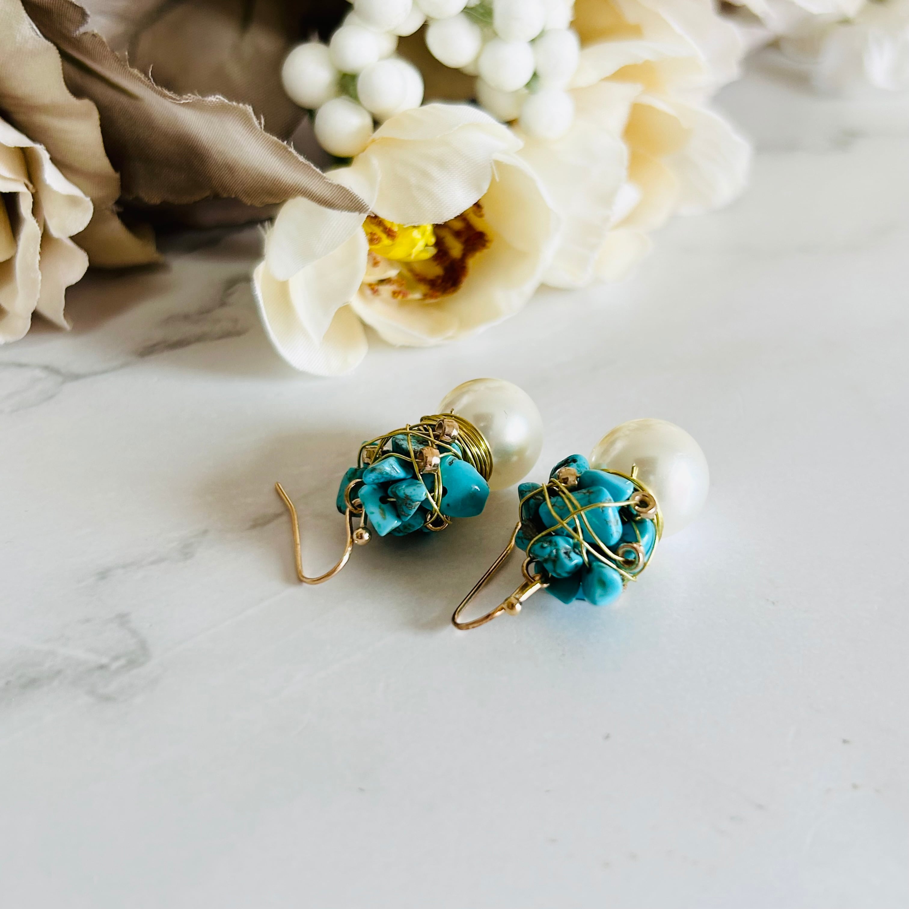 鮮やかなターコイズブルーのさざれ石を贅沢にあしらい、ころんとした大粒パールを添えた、涼しげで存在感のあるピアスです。