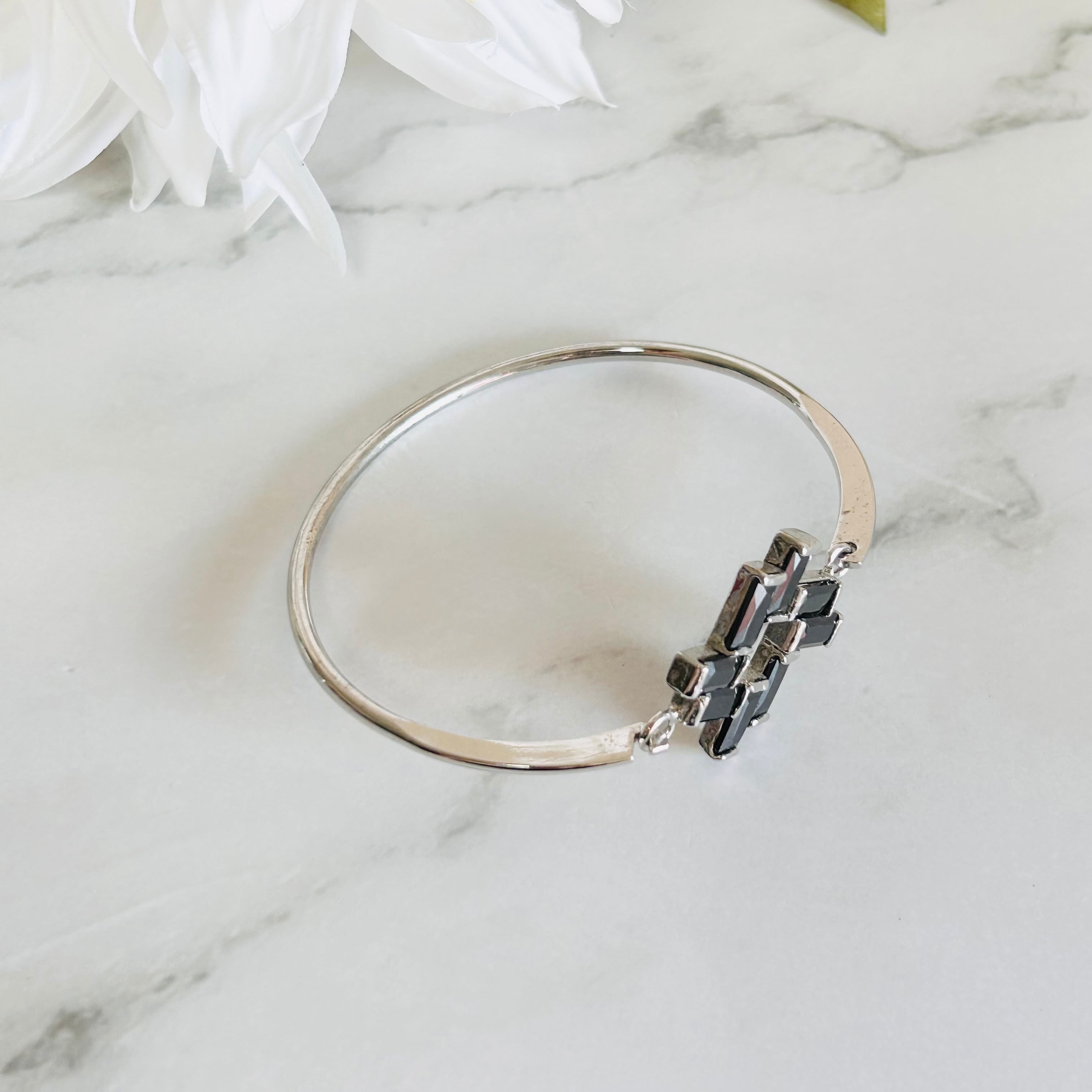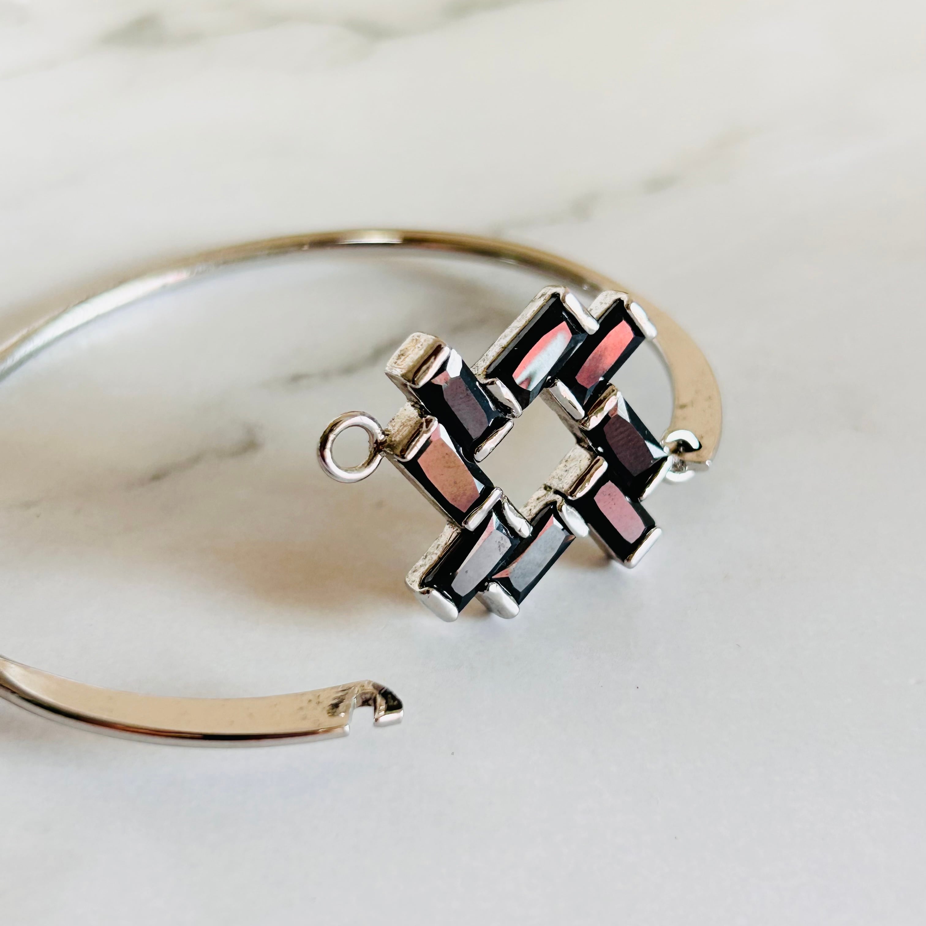 艶感のあるシルバーメタルに、ブラックのクリスタルパーツを幾何学的に組み合わせたデザインブレスレットです。