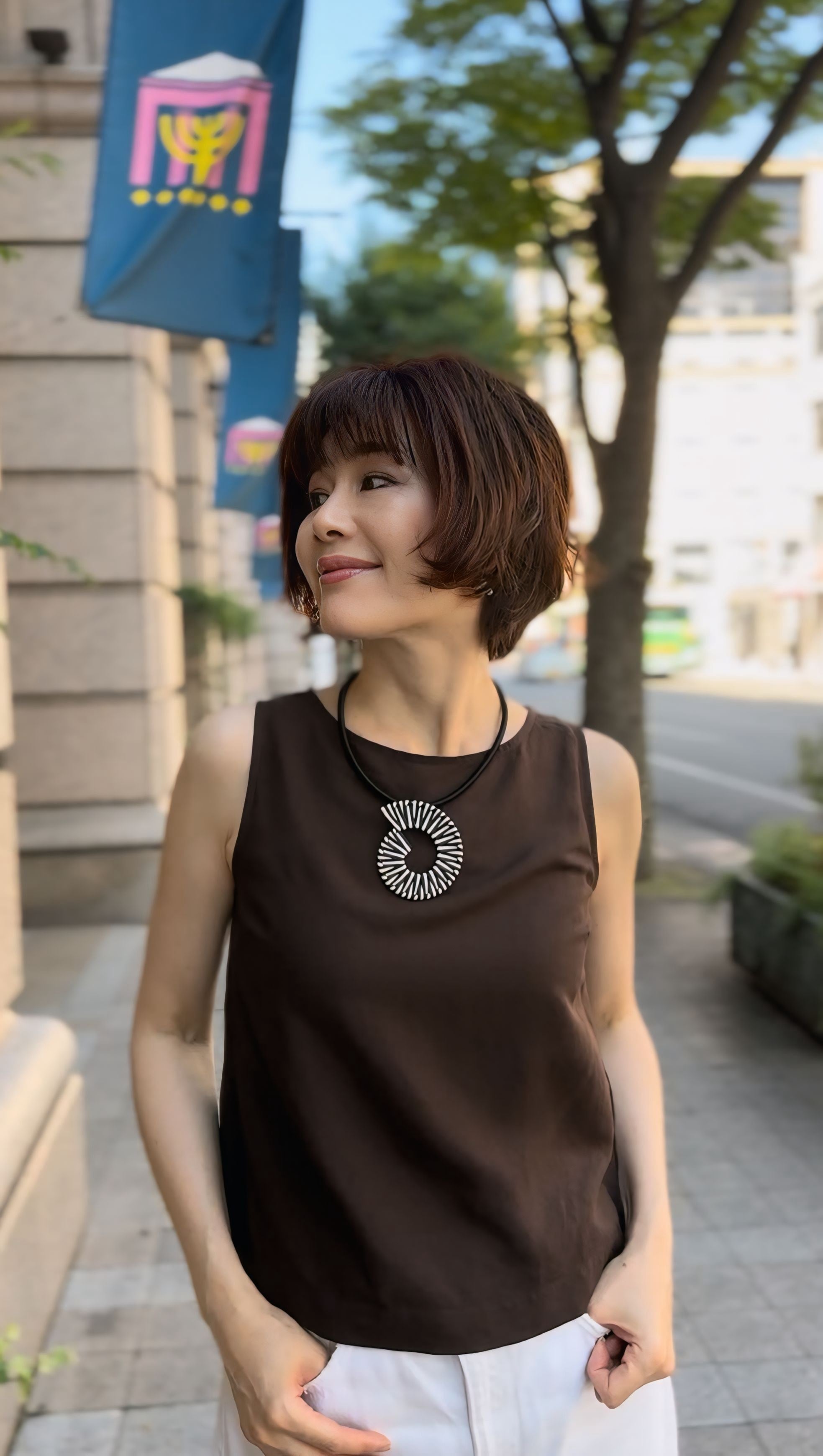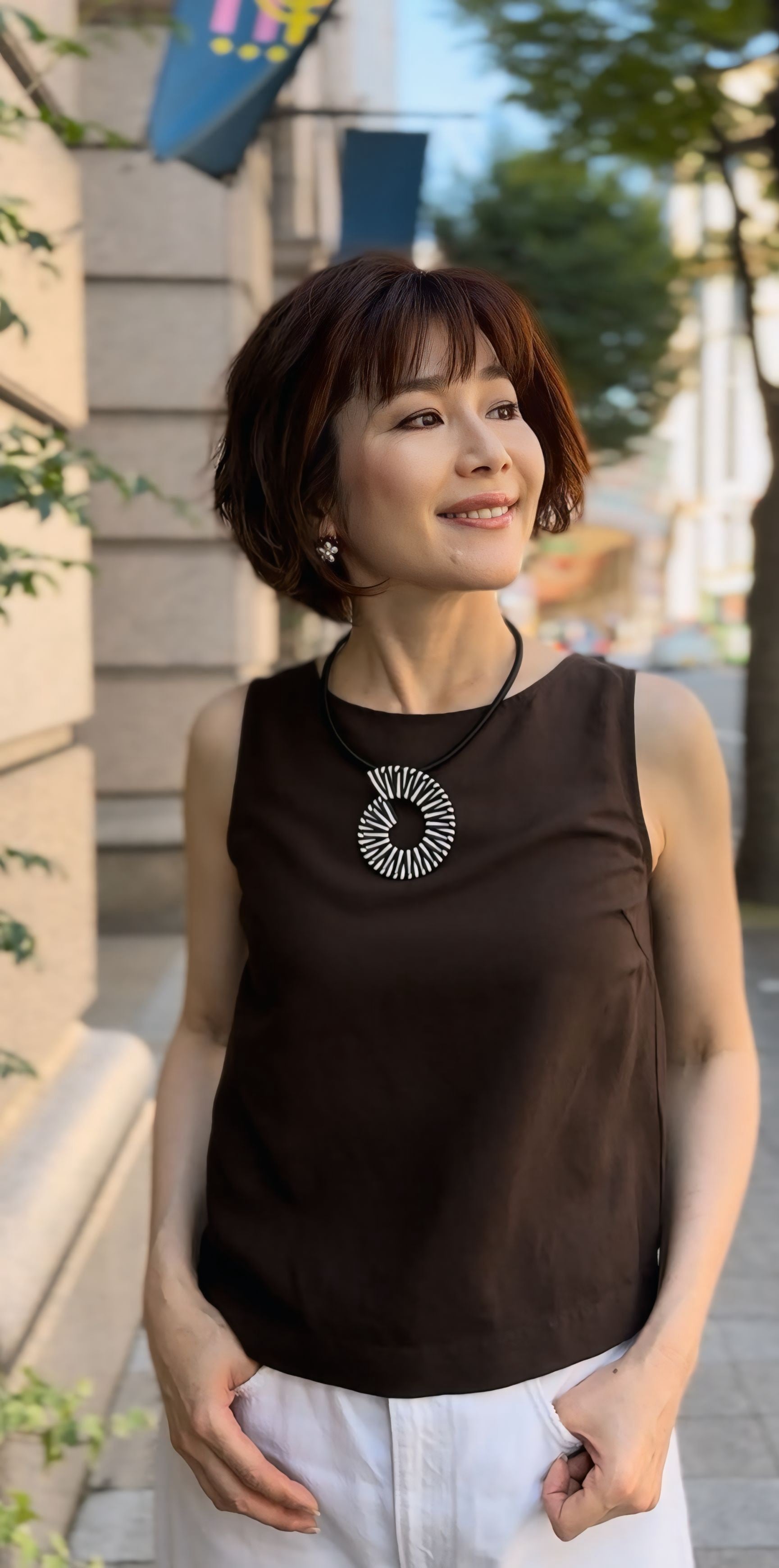 UネックのTシャツや、ハリ感のあるノースリーブブラウスなど、プレーンな夏服に合わせるだけでぐっと洗練された印象に!