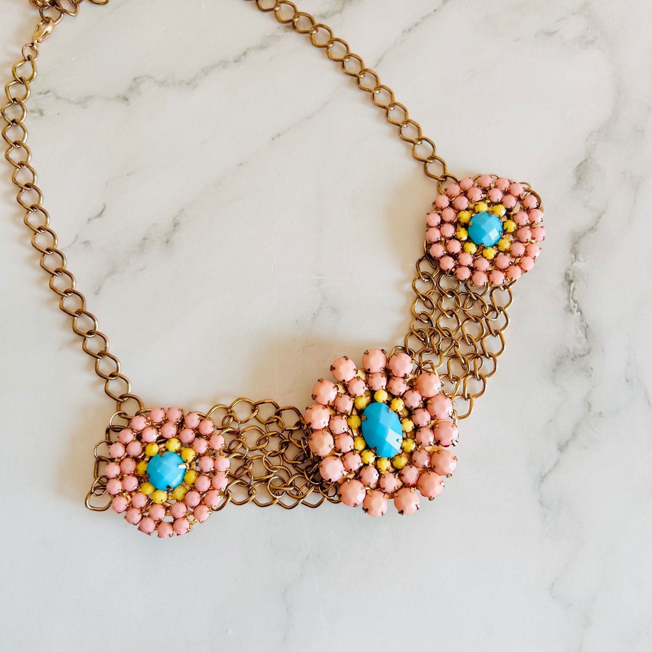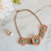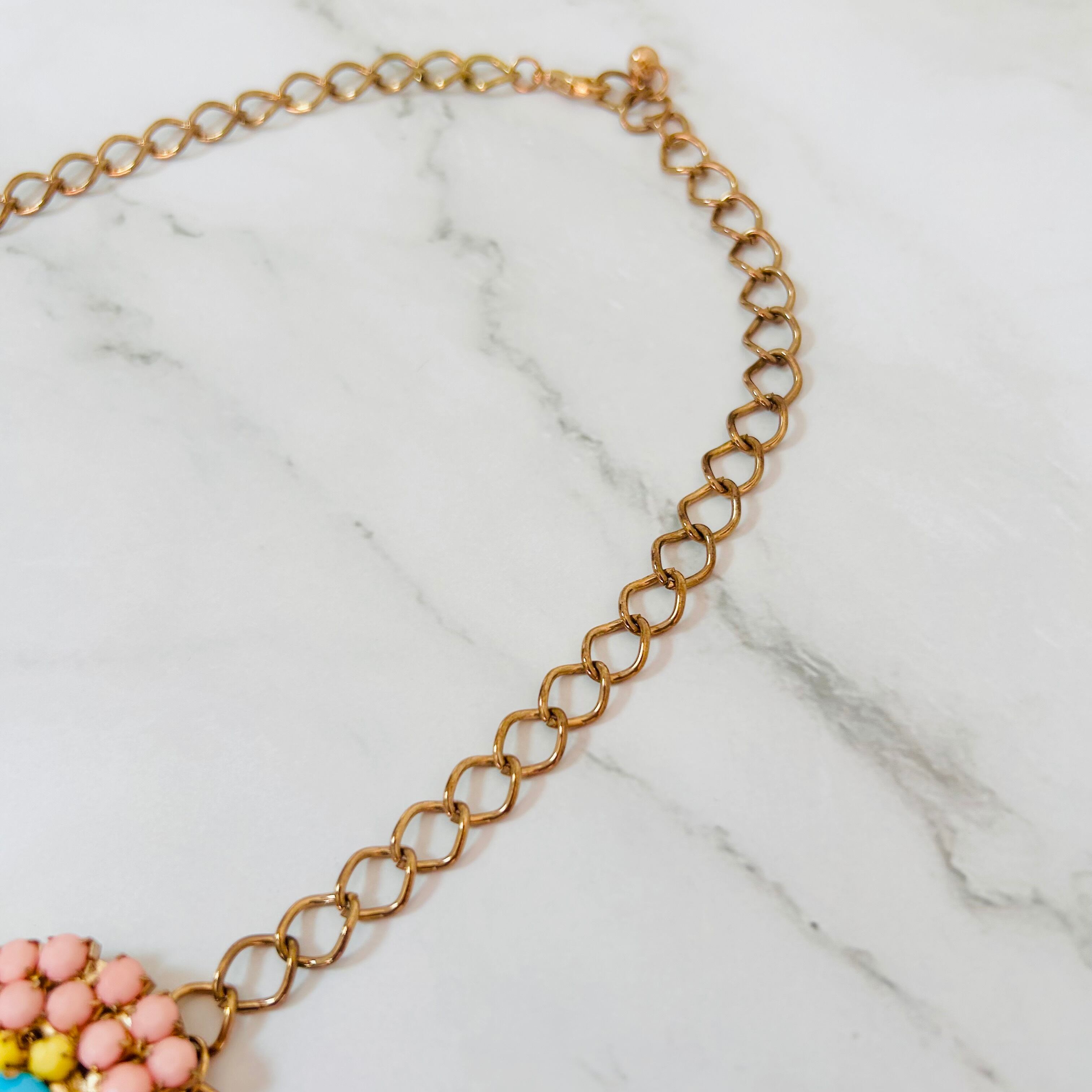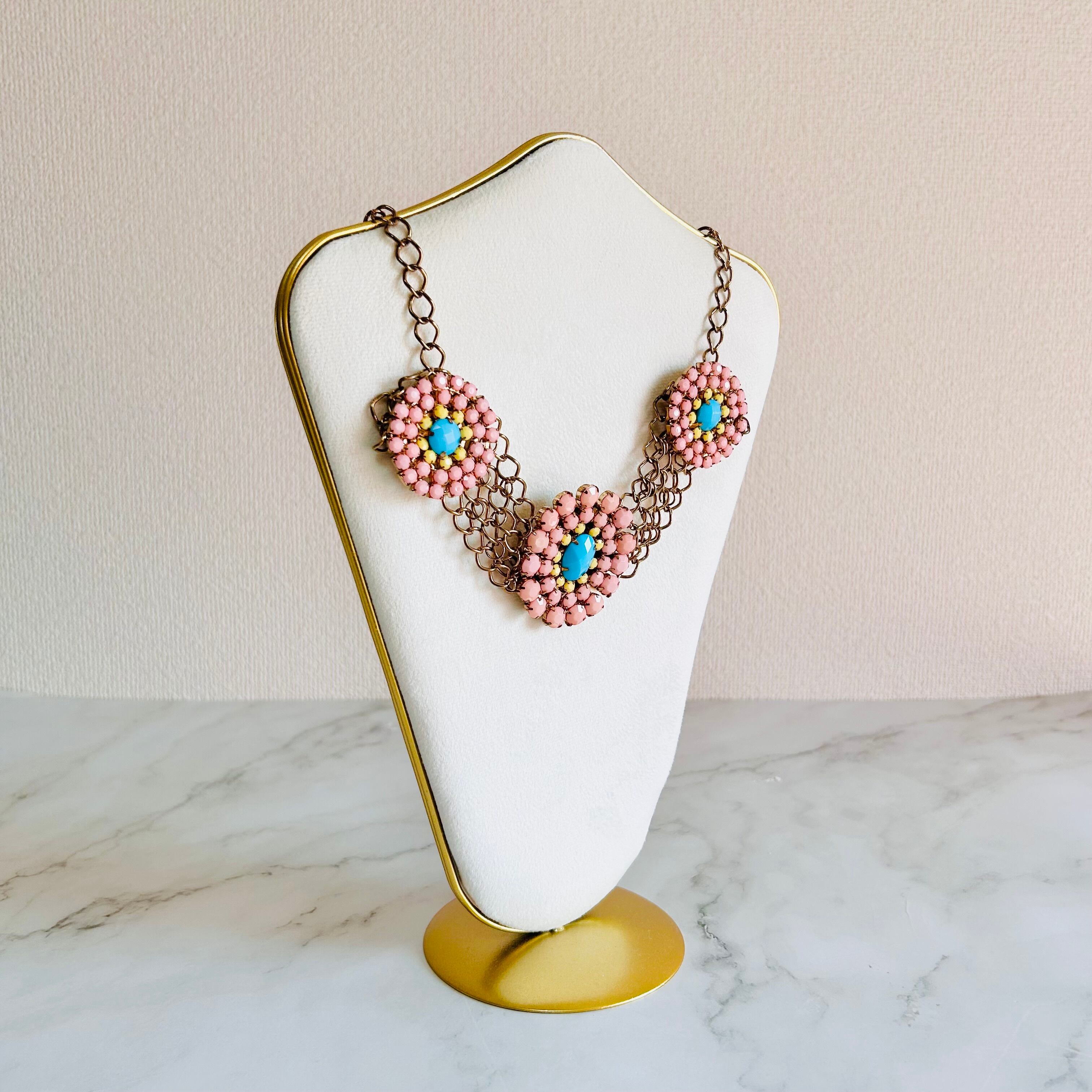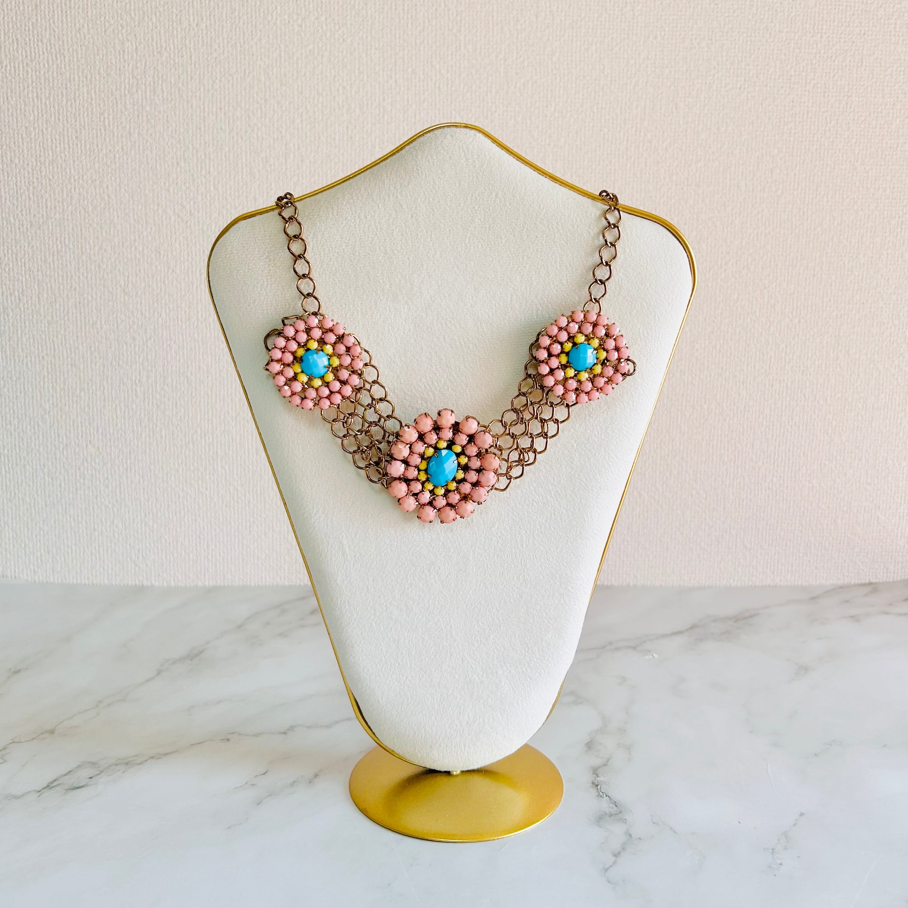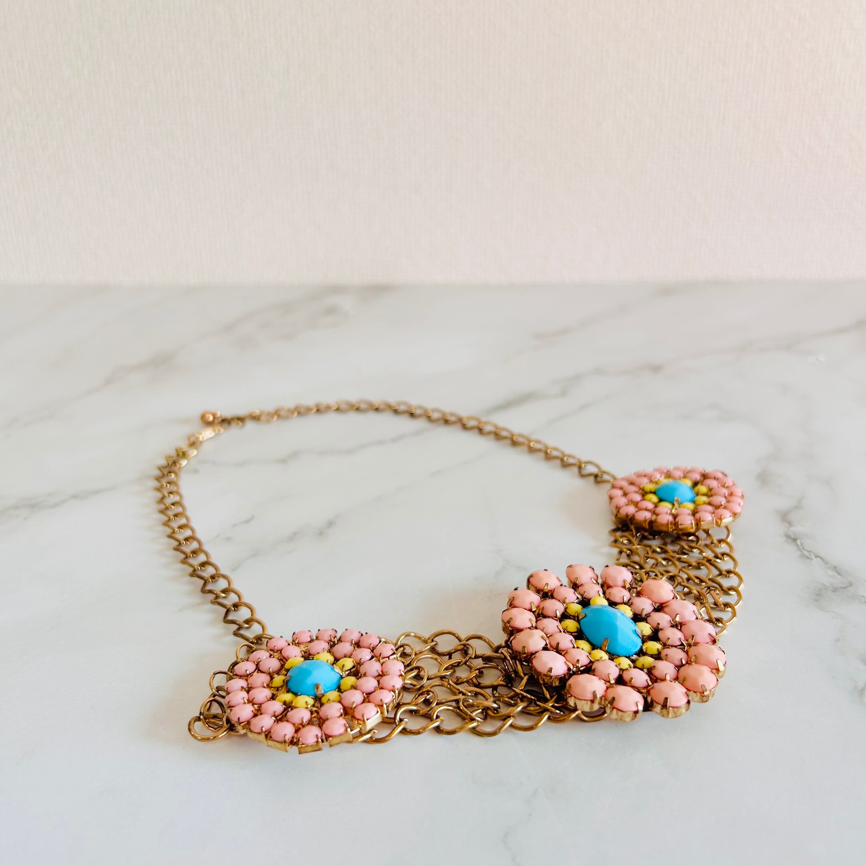 ピンク・ターコイズブルー・イエローのビジューを贅沢に組み合わせた、華やかなフラワーモチーフのネックレスです。
