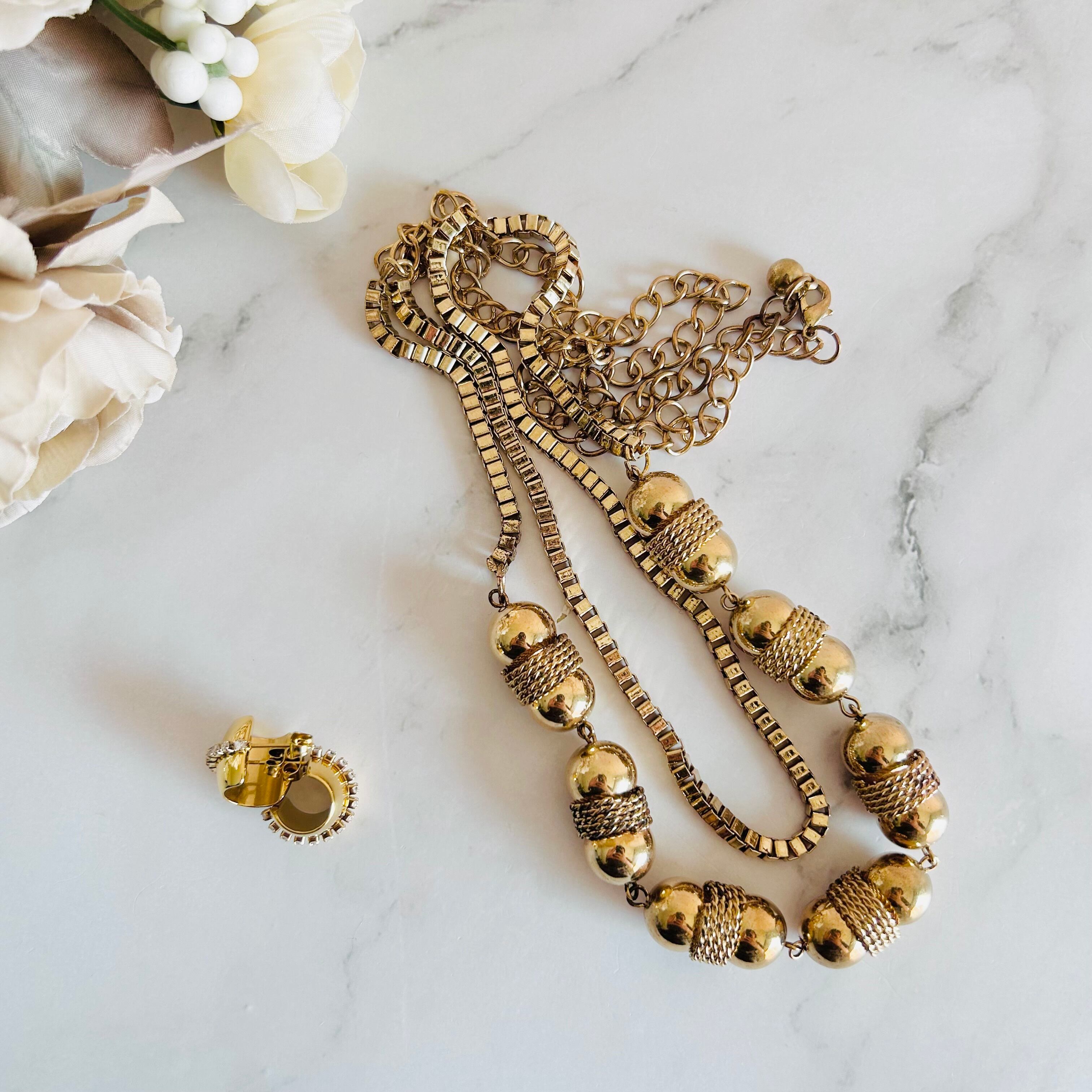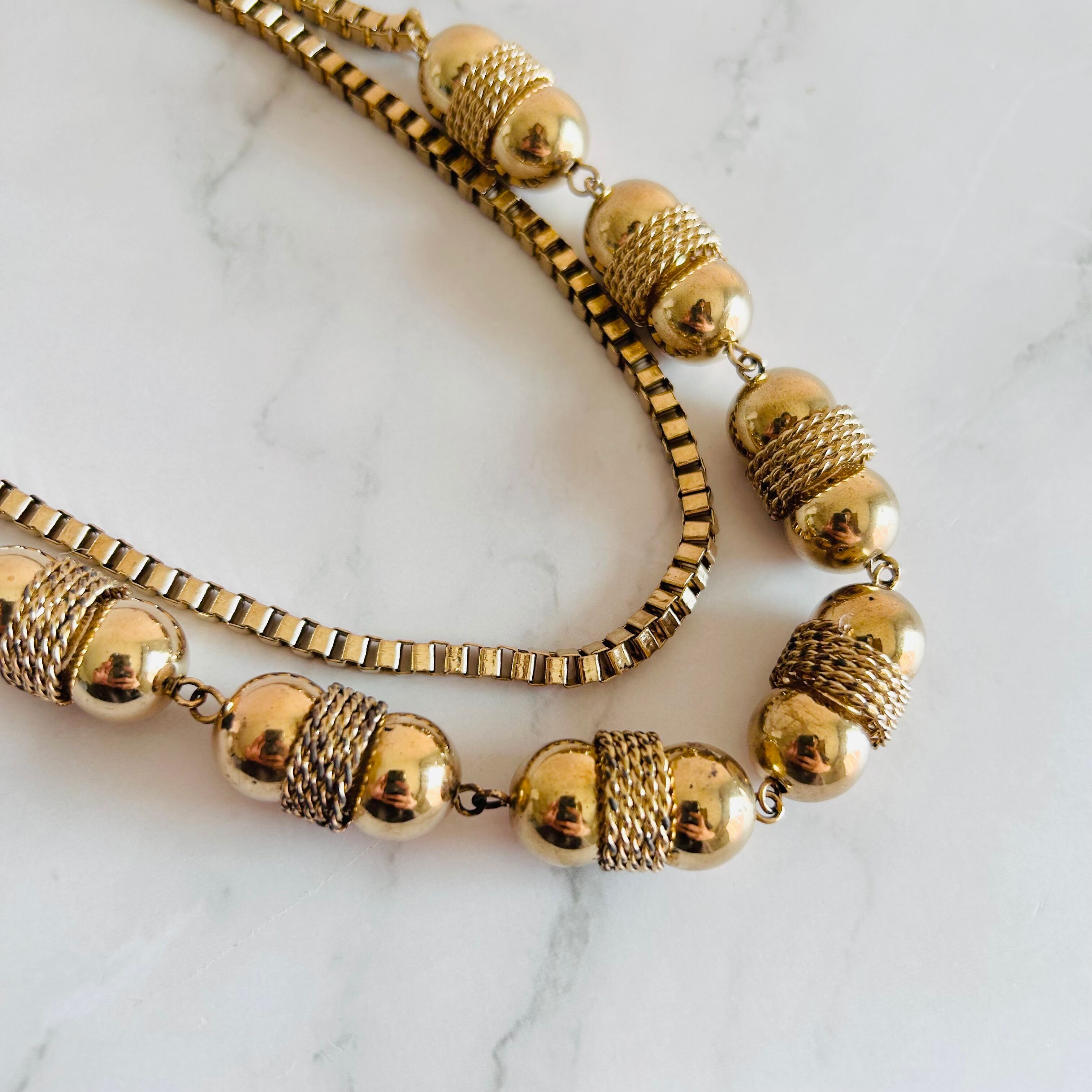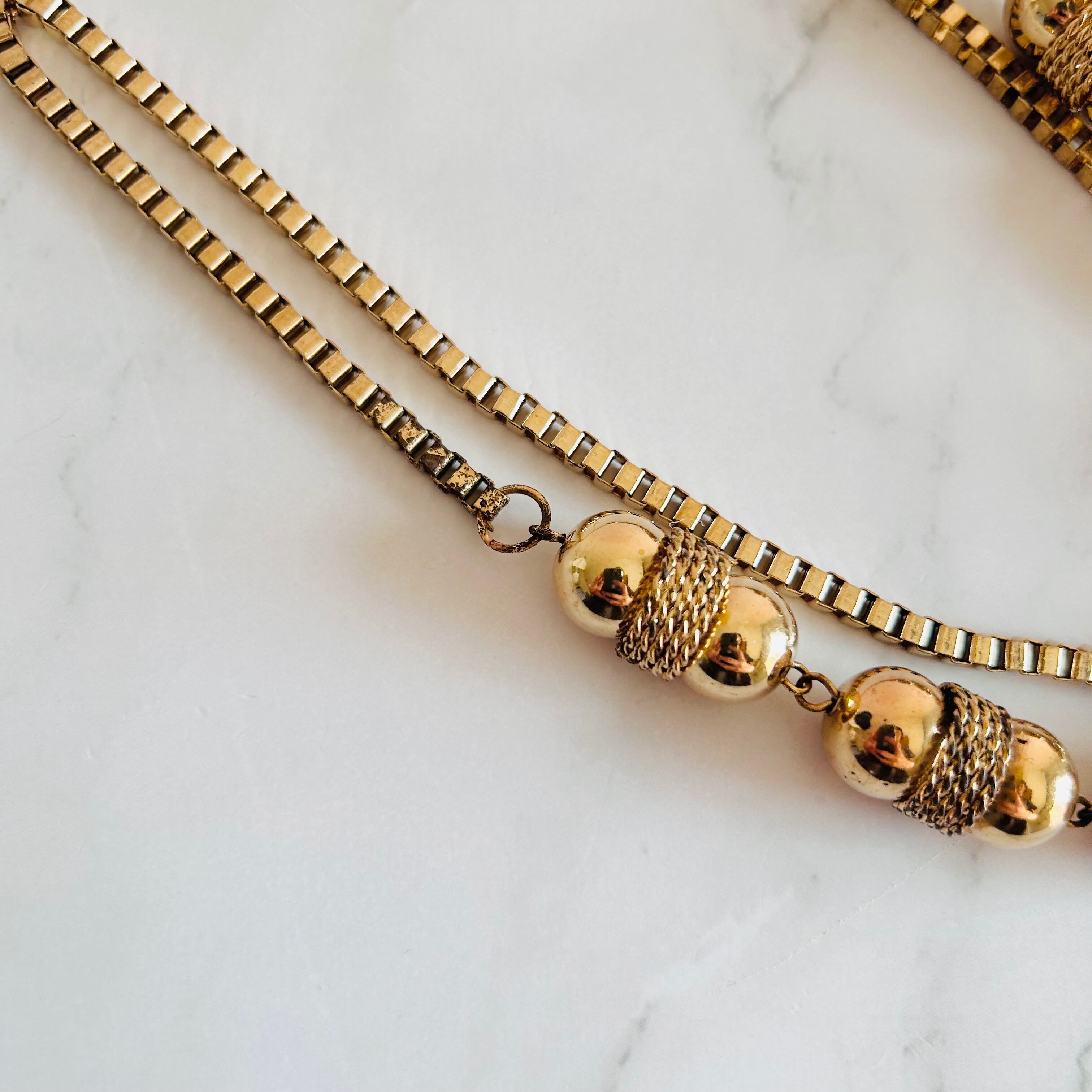 重厚感のある艶やかなゴールドパーツに、繊細なメッシュチェーンを組み合わせた印象的なロングネックレスです。