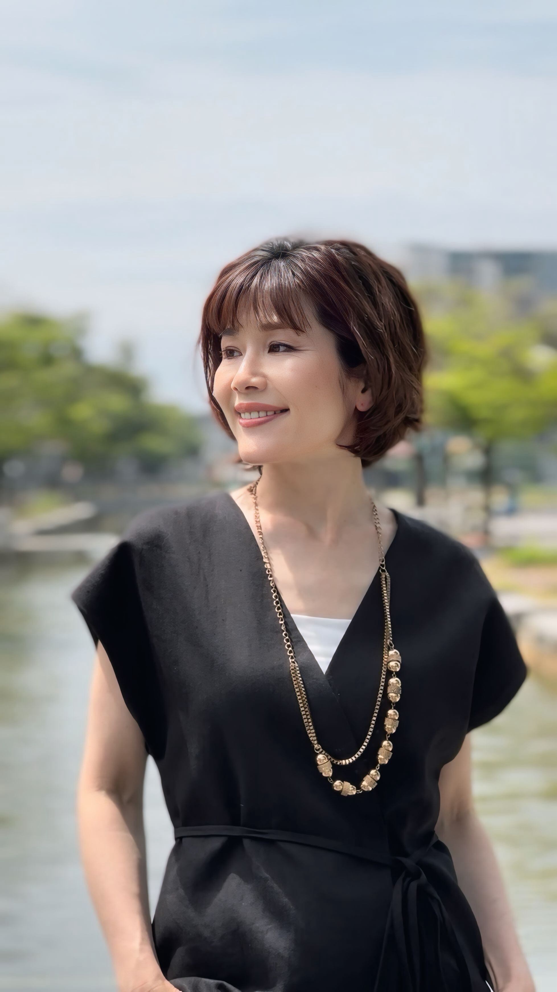 立体的なフォルムと輝きが首元に華やかさを添え、華やかな存在感と、どこかクラシカルな雰囲気が漂います。