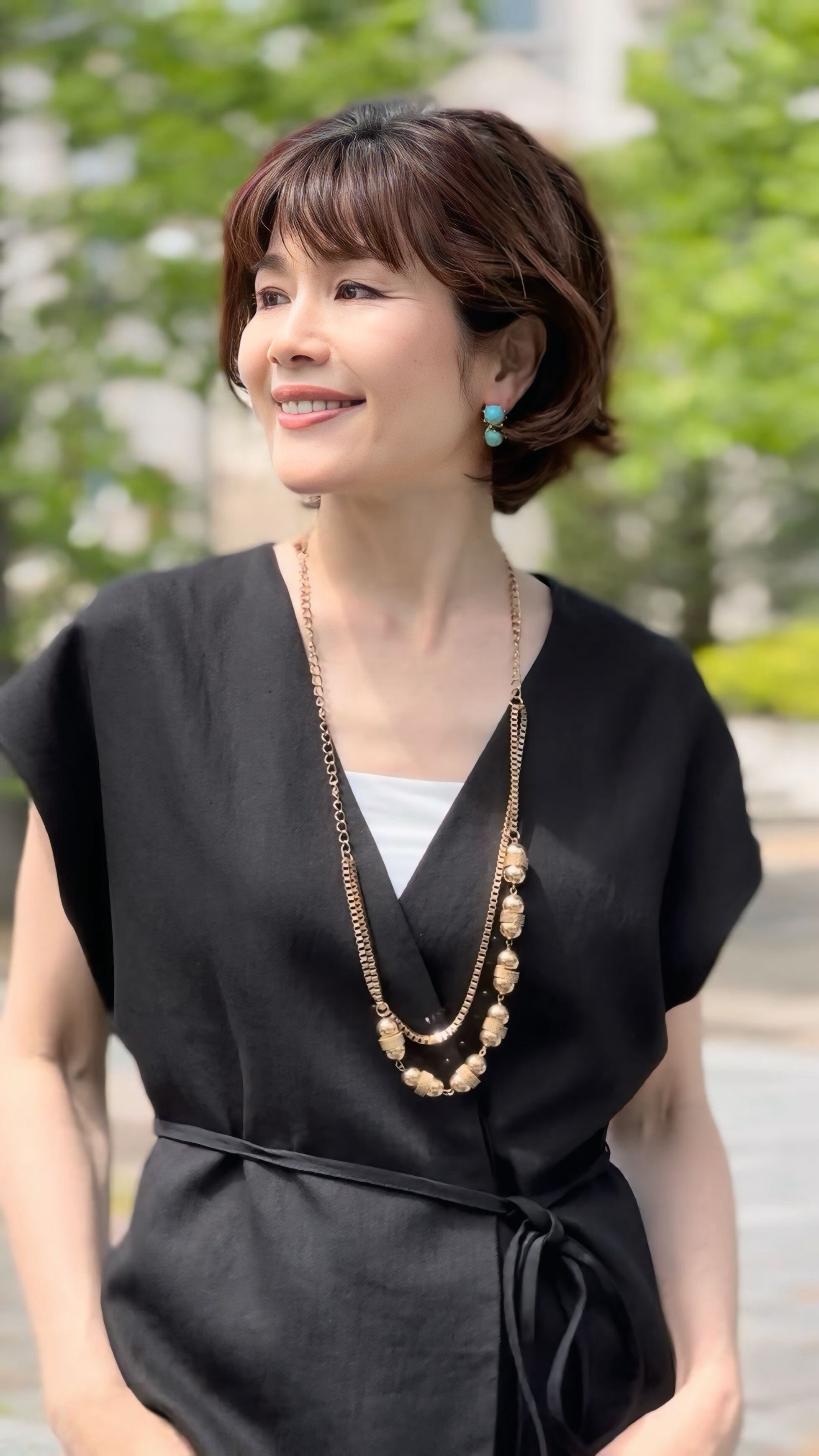 ゴールドの温かみと、メタルチェーンのシャープさが絶妙に調和し、シンプルな装いにも凛とした華やかさをプラス!