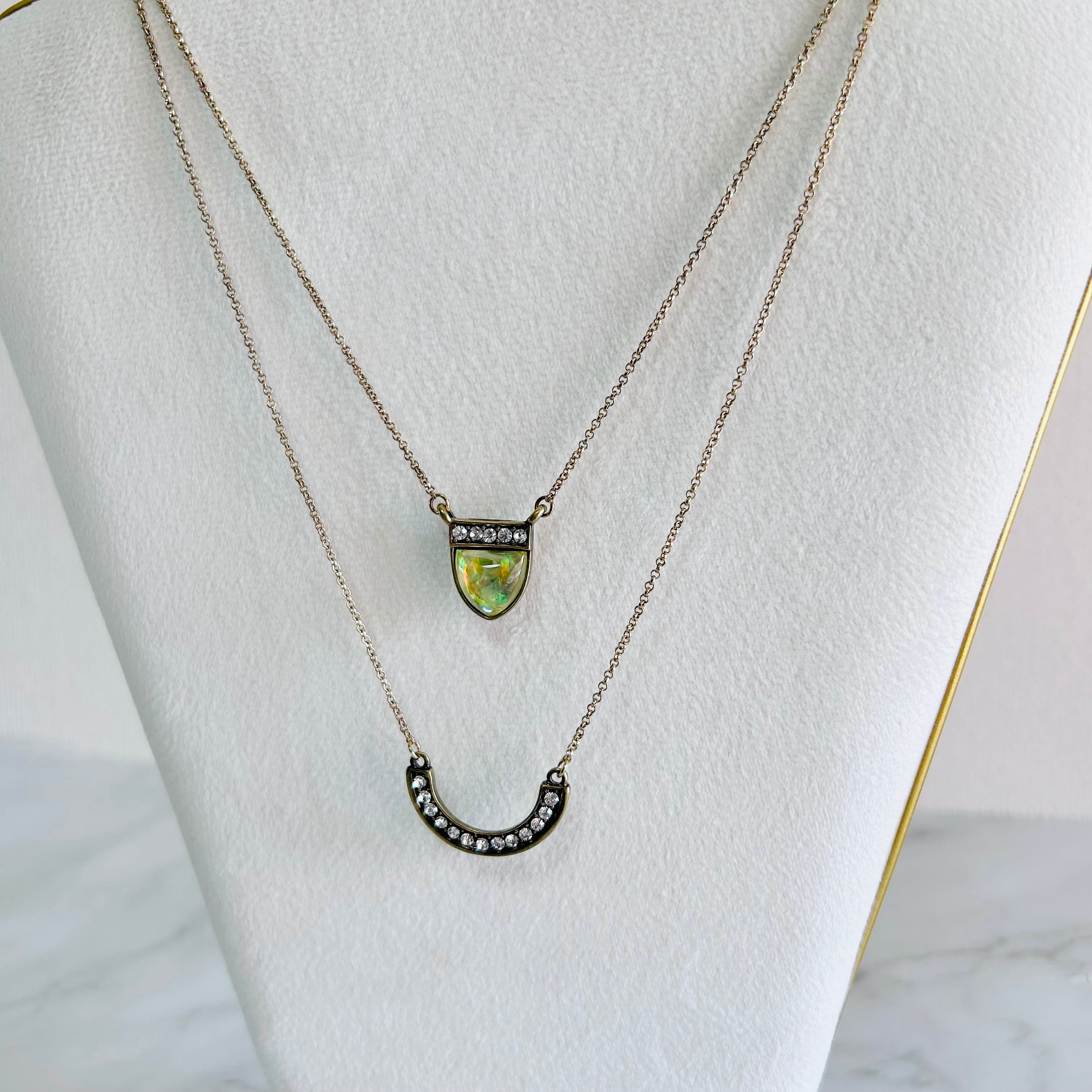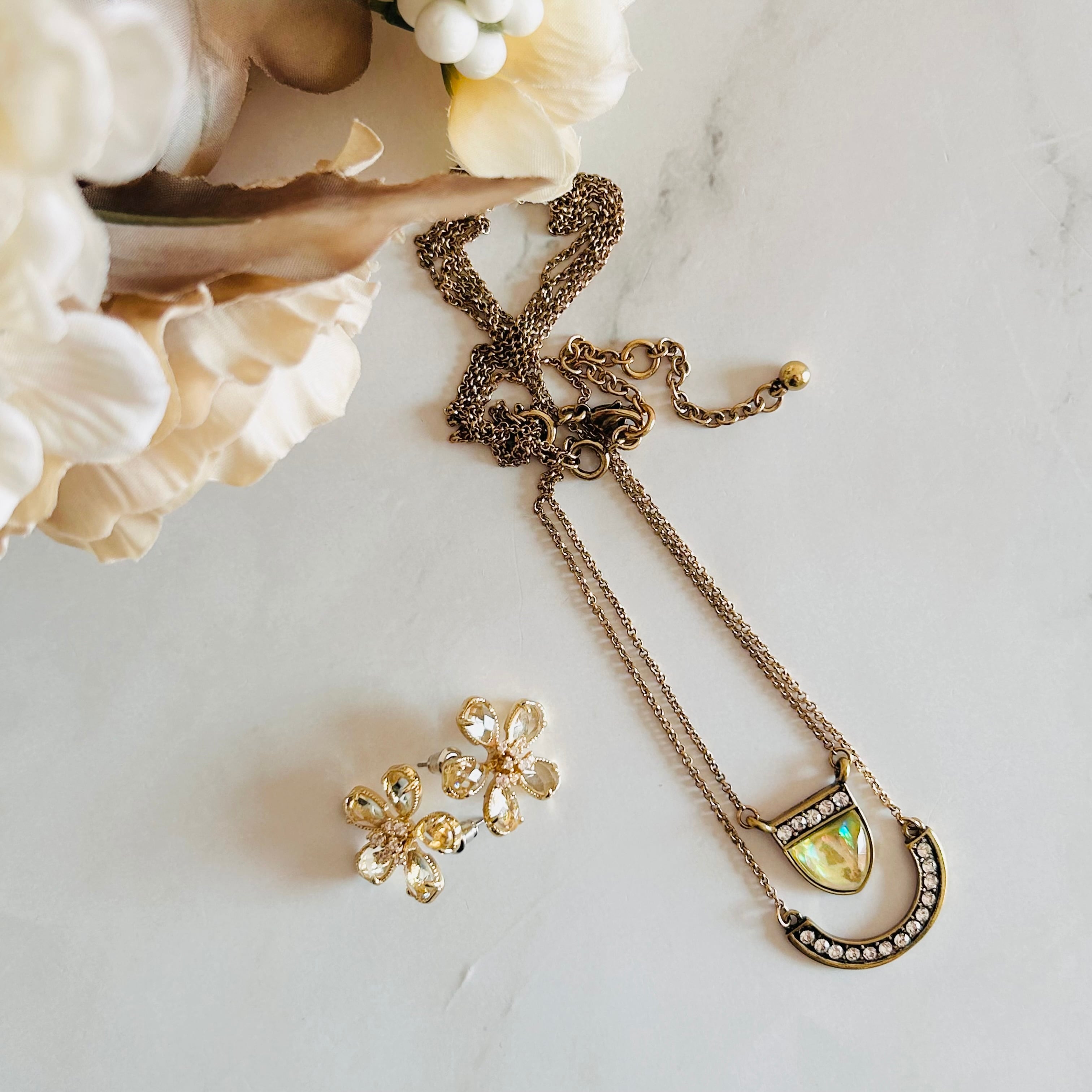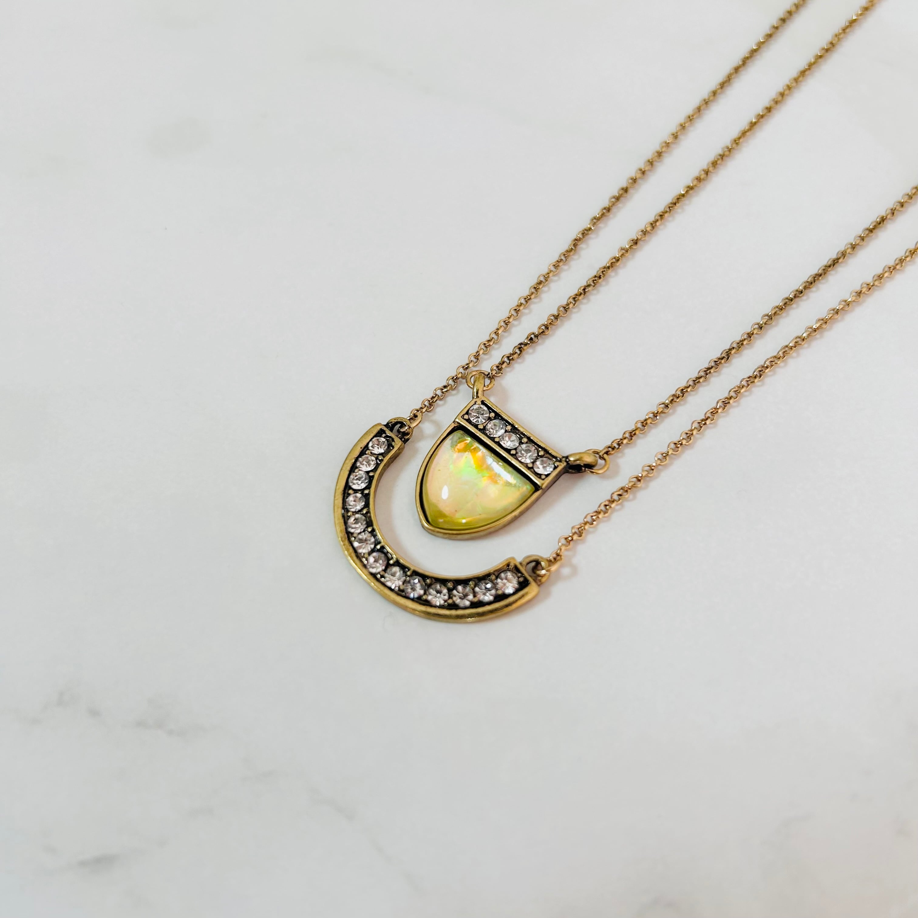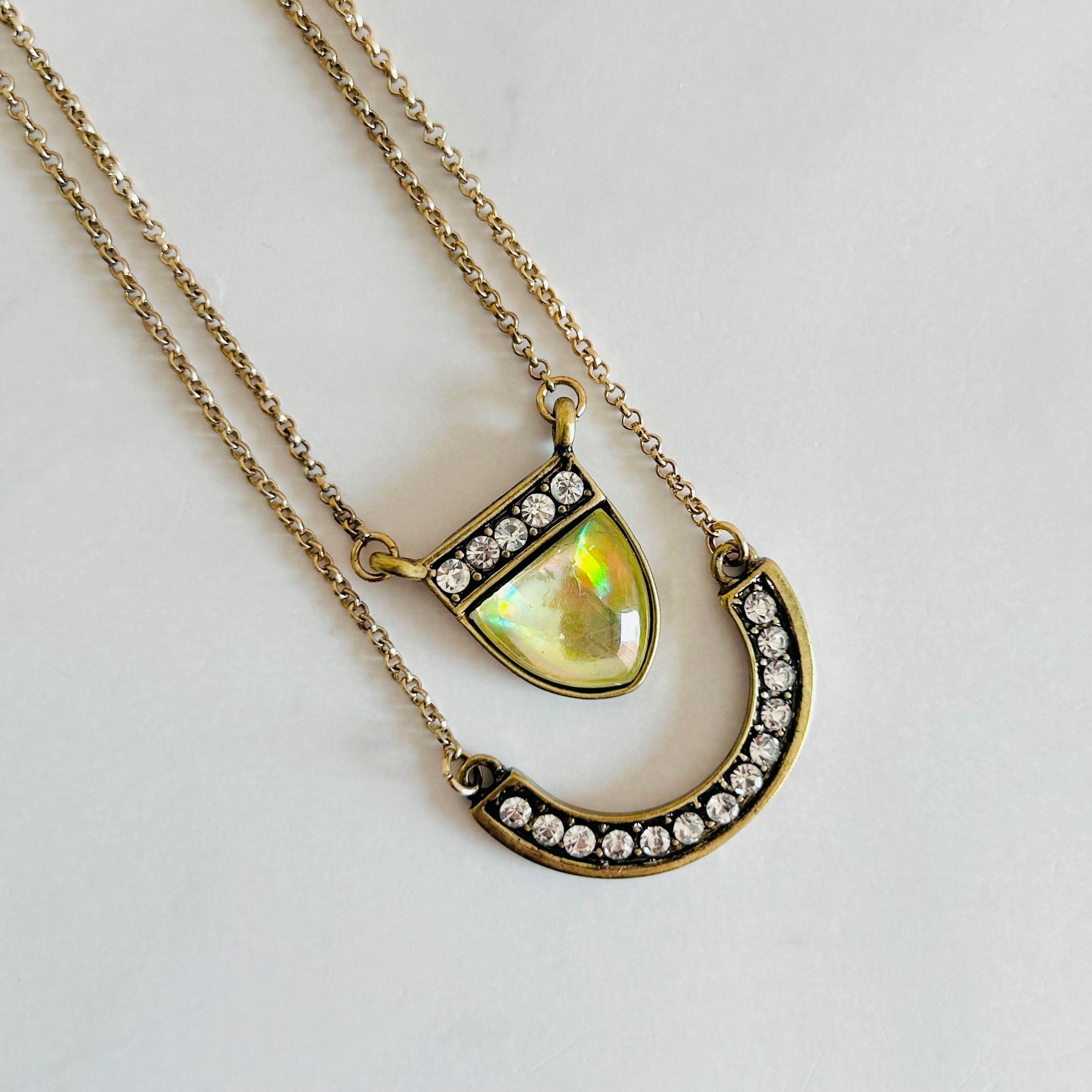 透明感のあるイエロー系オーロラカラーのビジューに、繊細なラインストーンが上品な輝きを添えるヴィンテージ調のロングネックレスです。