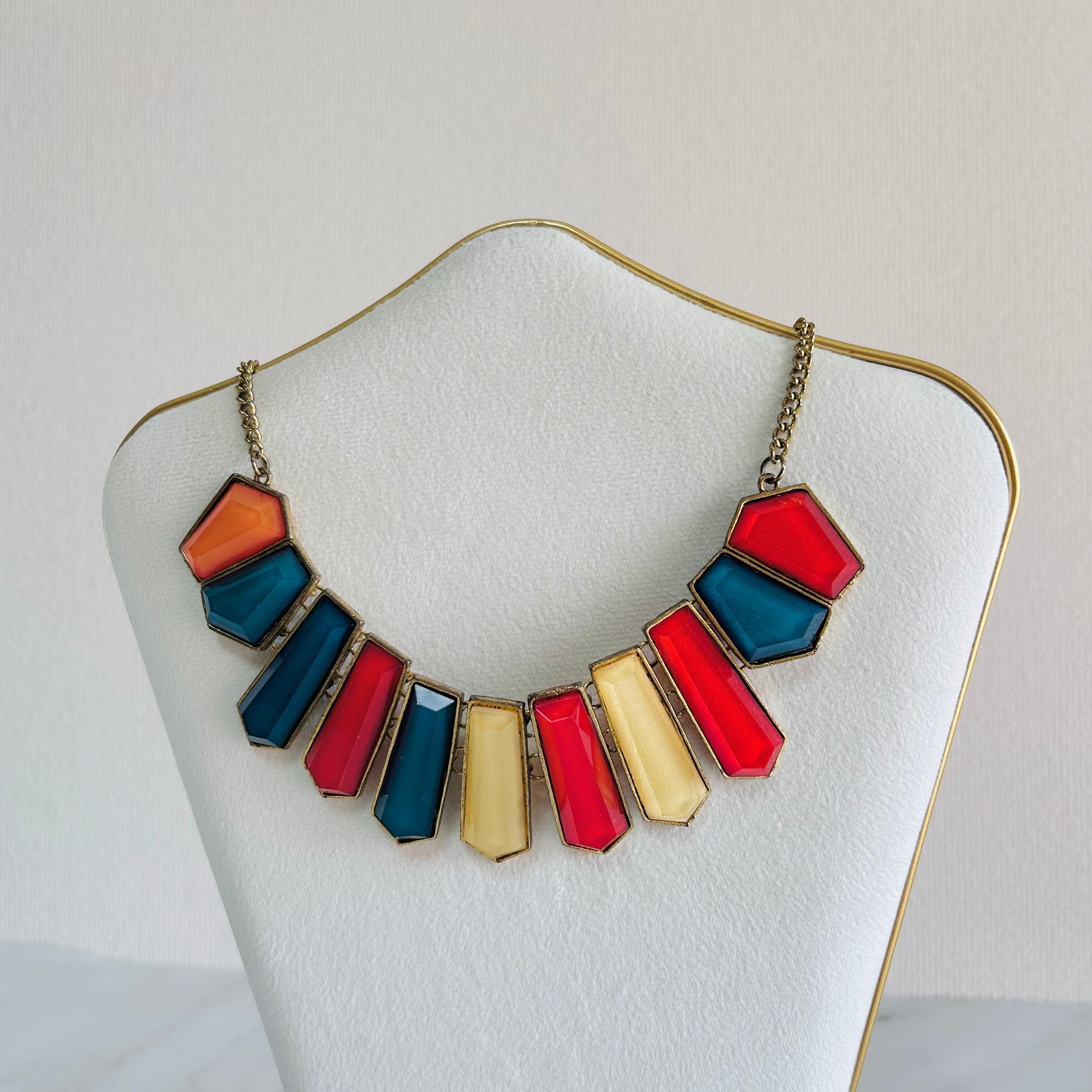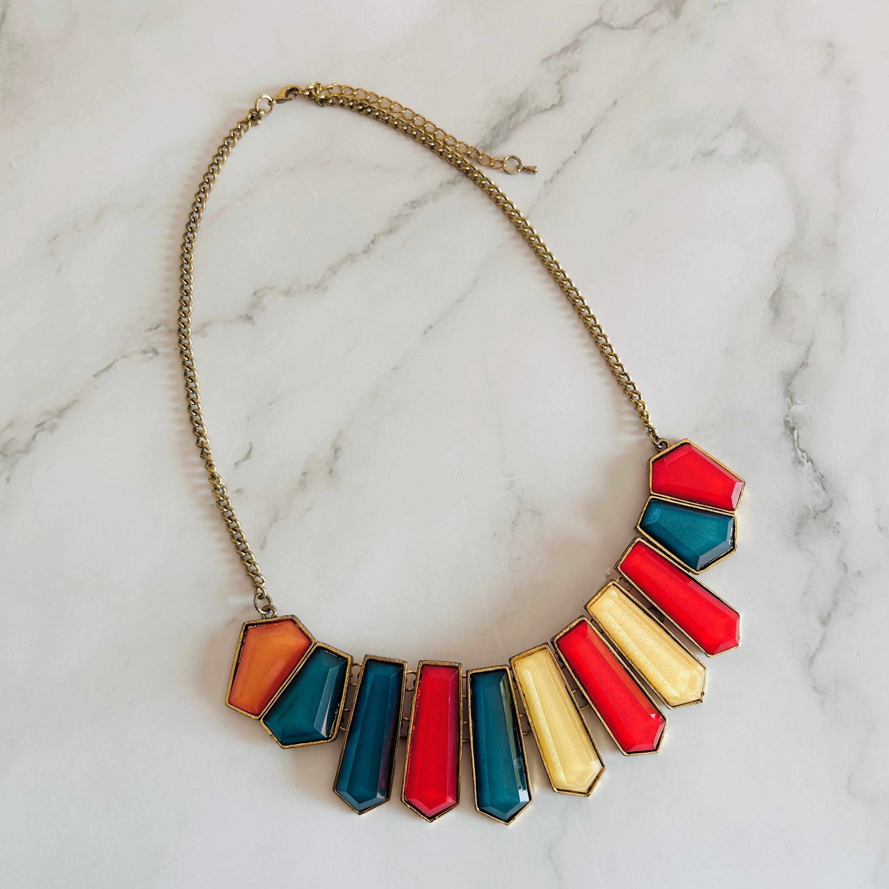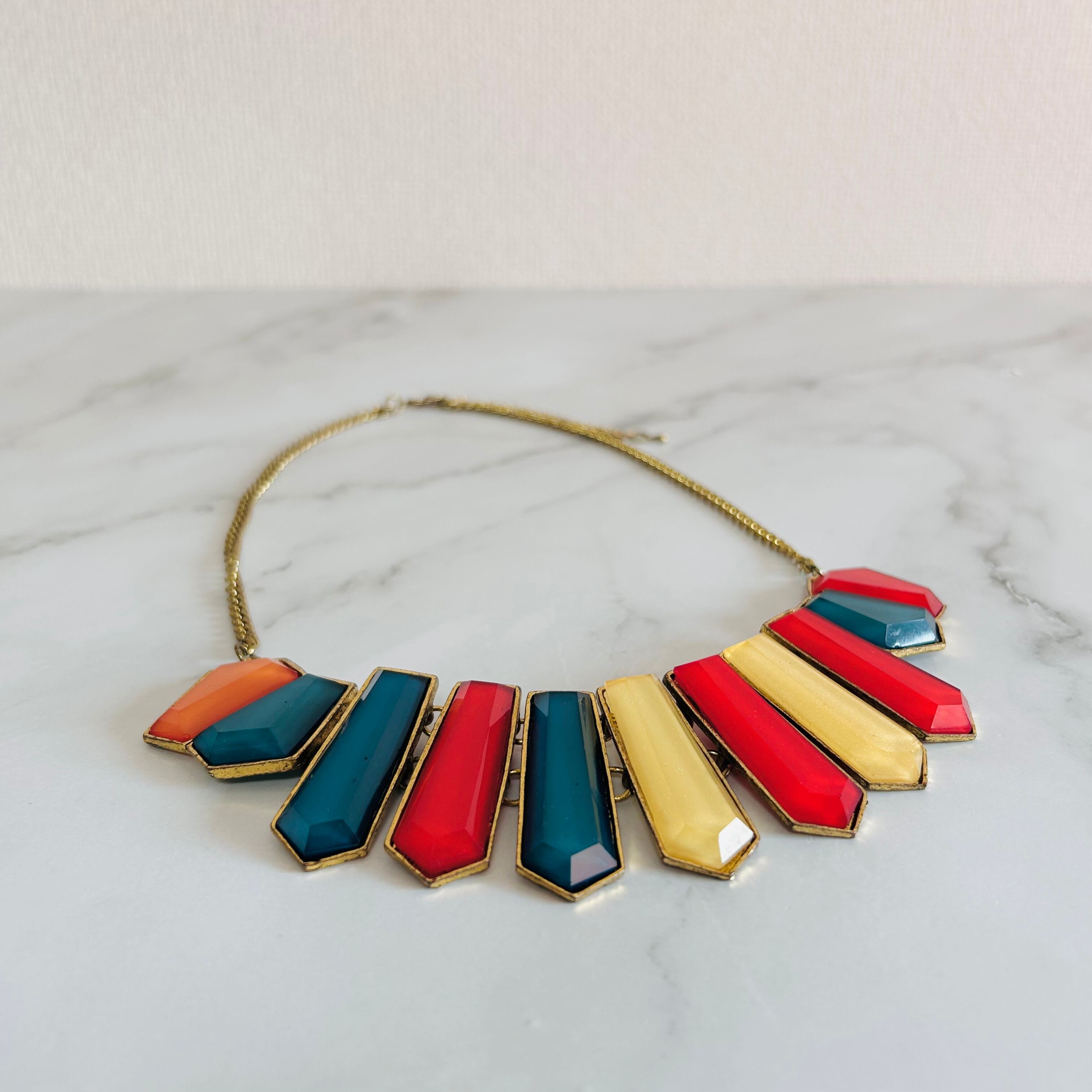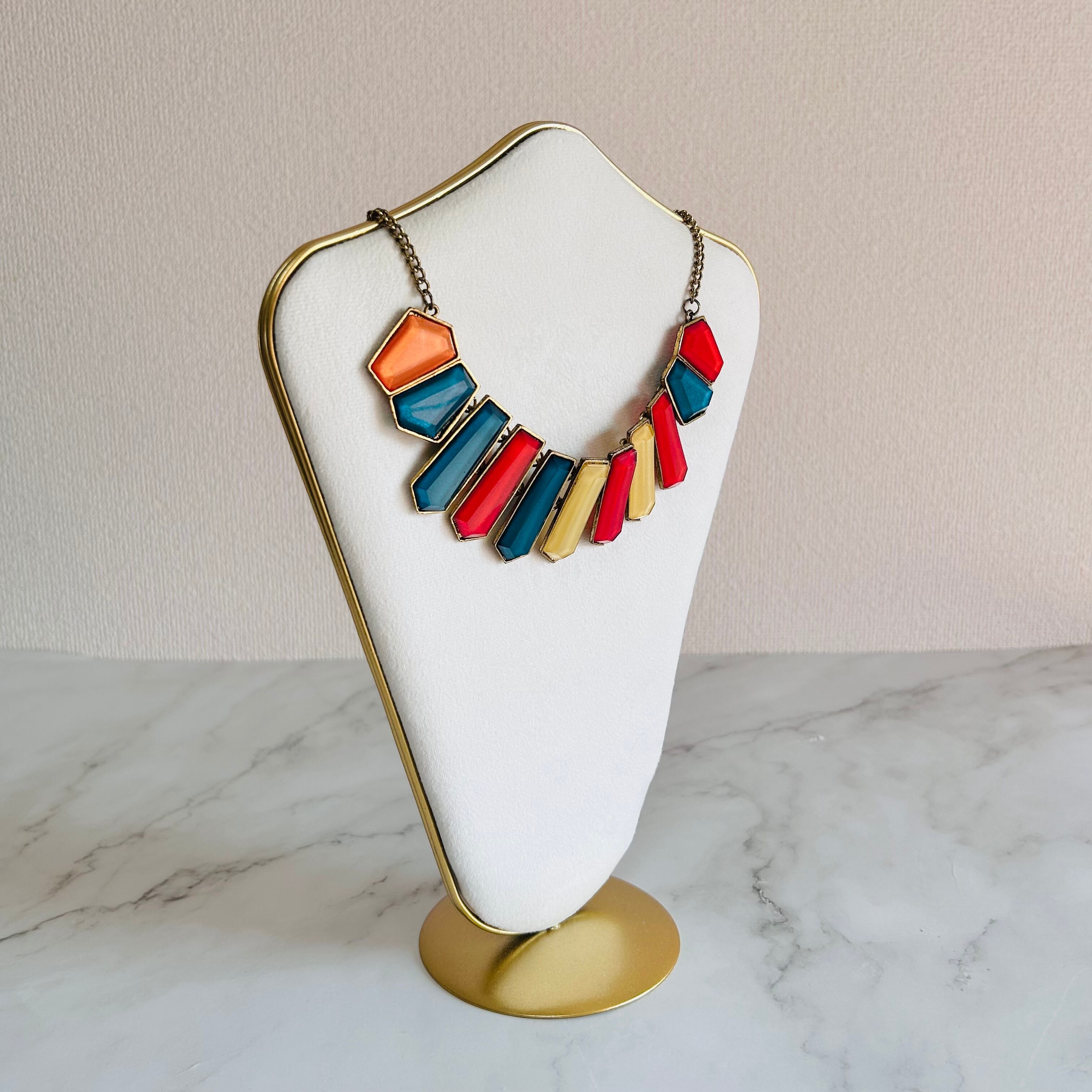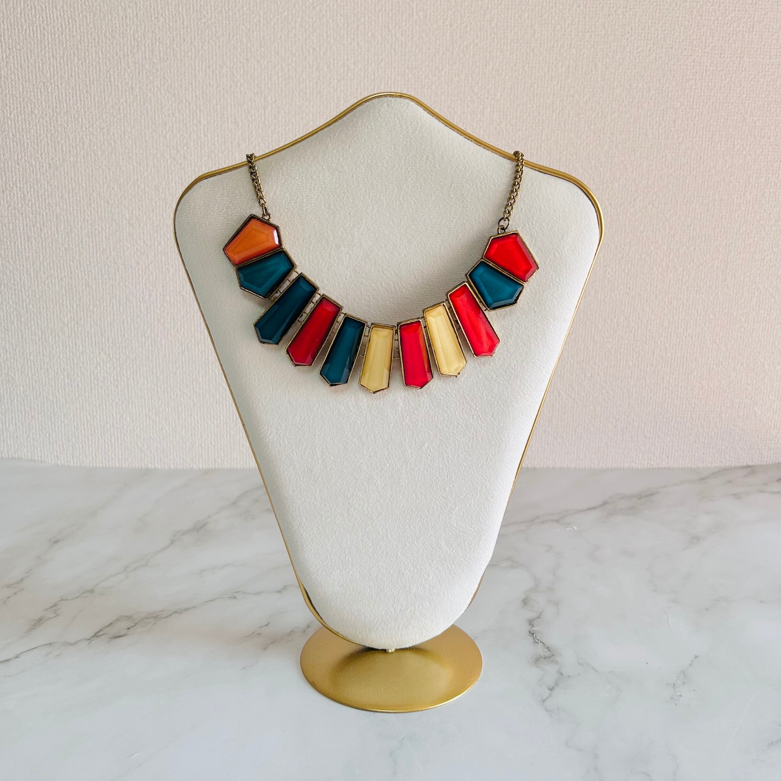 ヴィンテージゴールドのチェーンに、レッド・ブルーグリーン・イエロー・オレンジのプレートがリズミカルに並んだ、遊び心あふれるネックレスです。