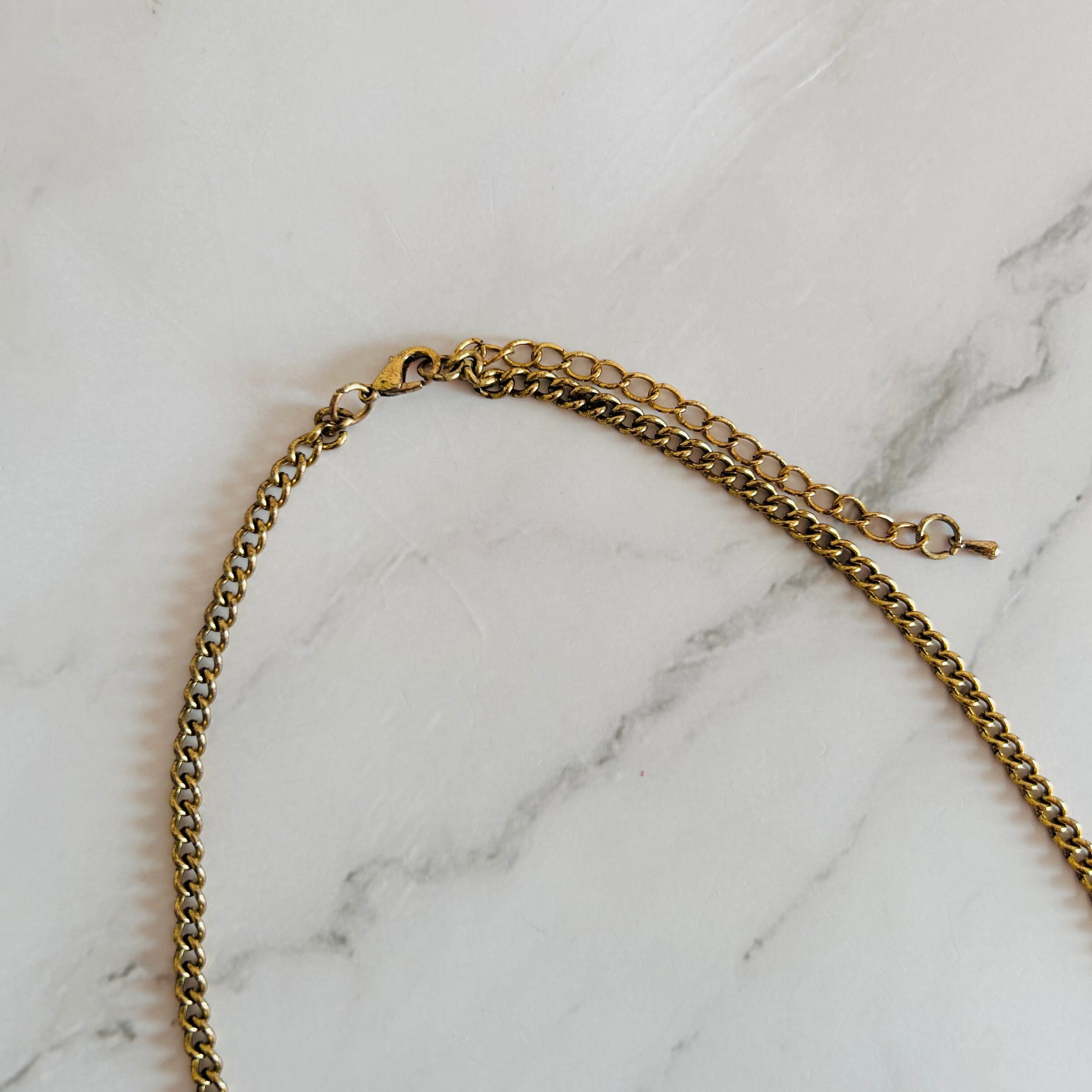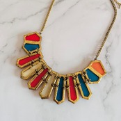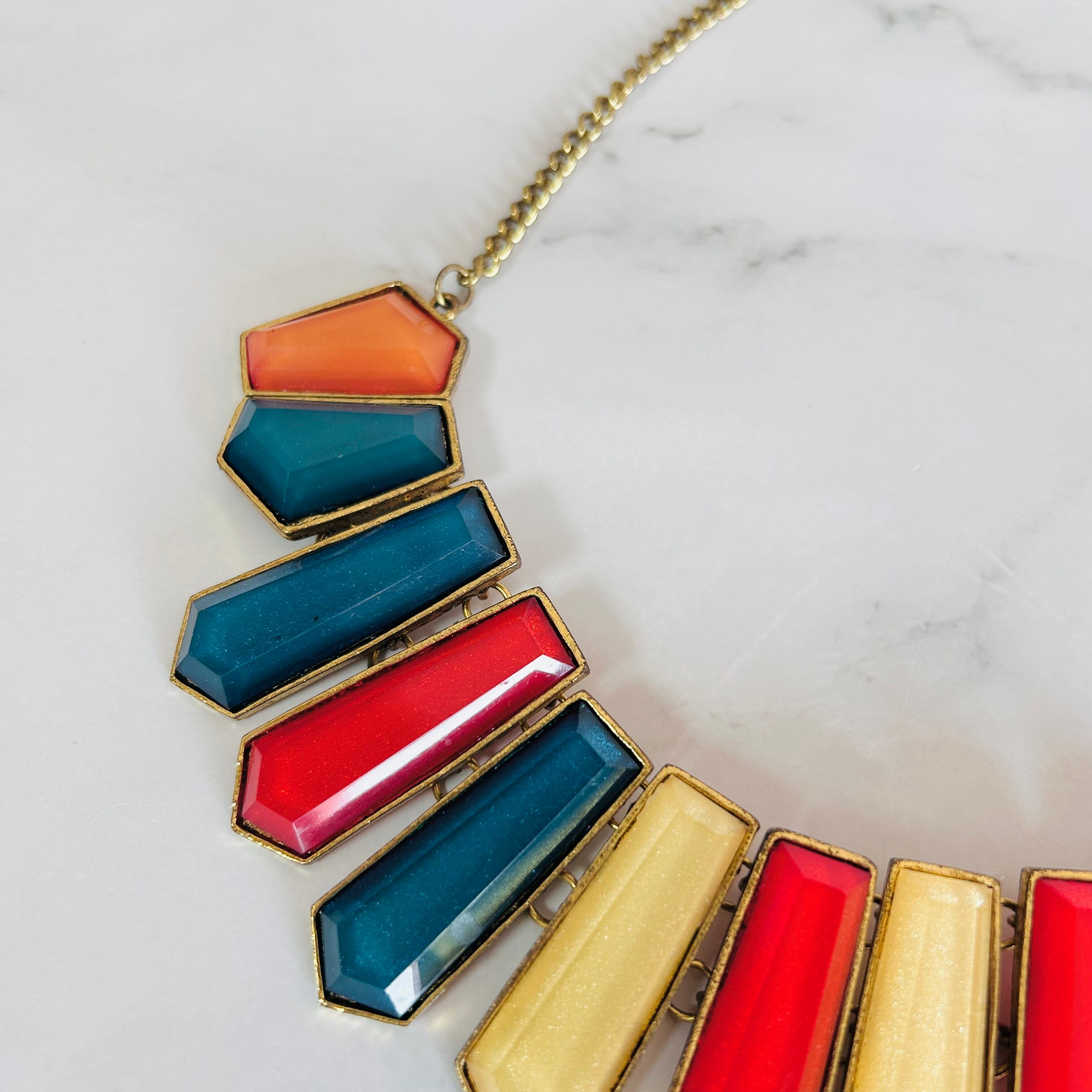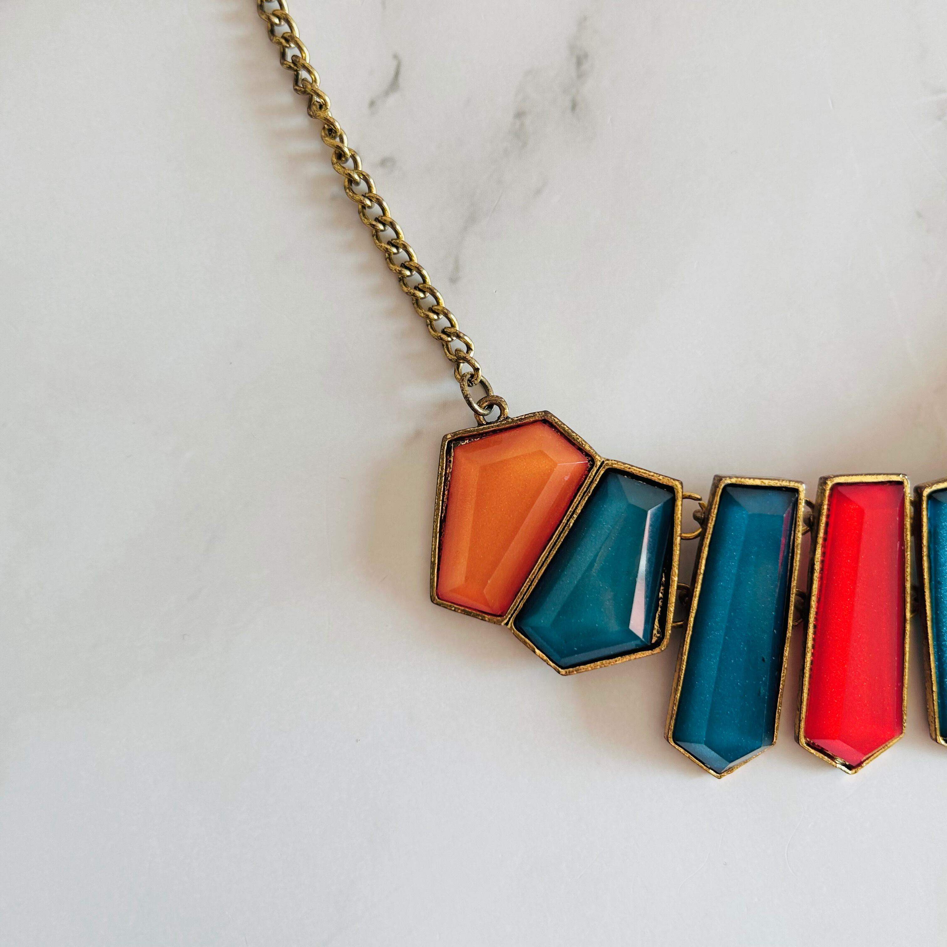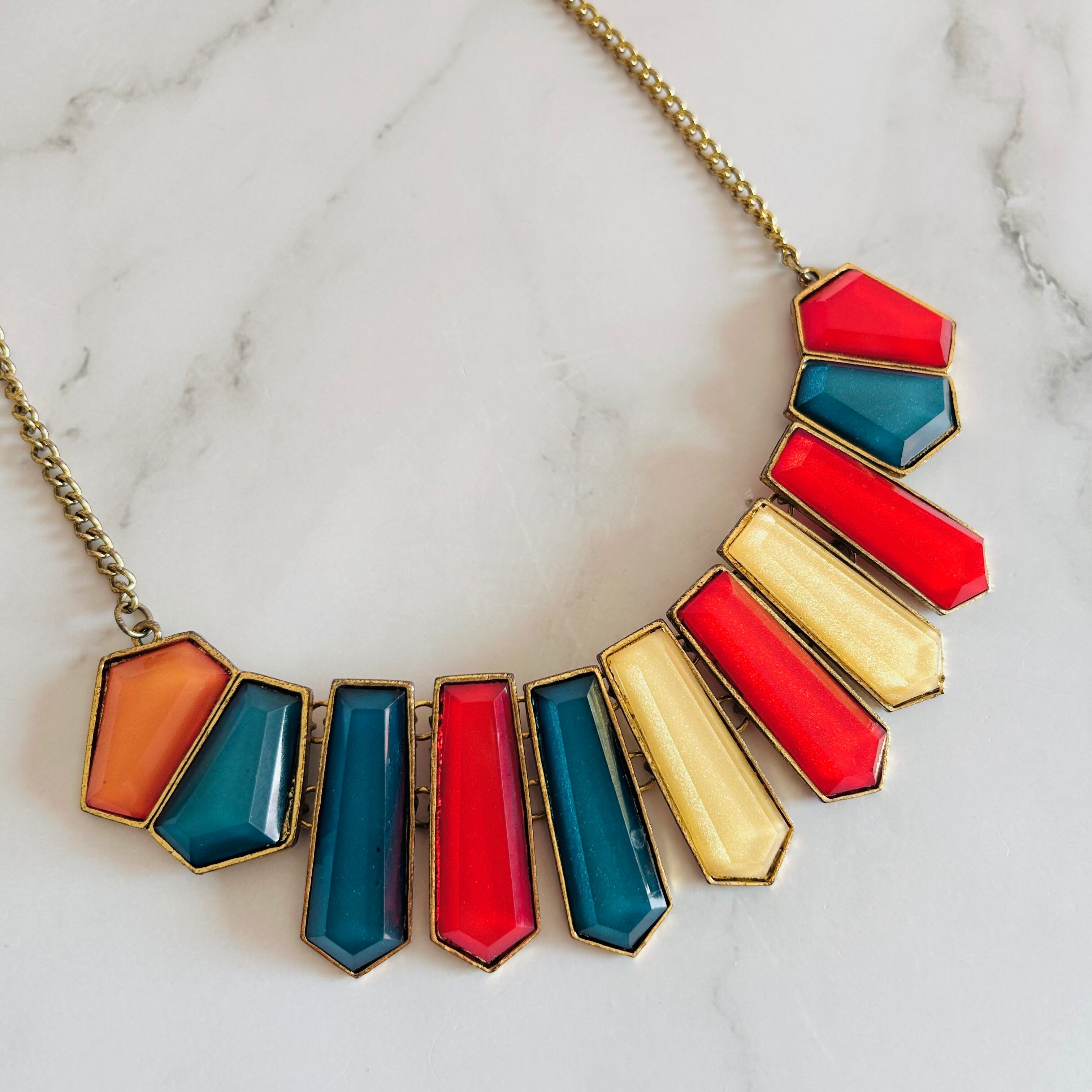 ヴィンテージゴールドのチェーンに、レッド・ブルーグリーン・イエロー・オレンジのプレートがリズミカルに並んだ、遊び心あふれるネックレスです。