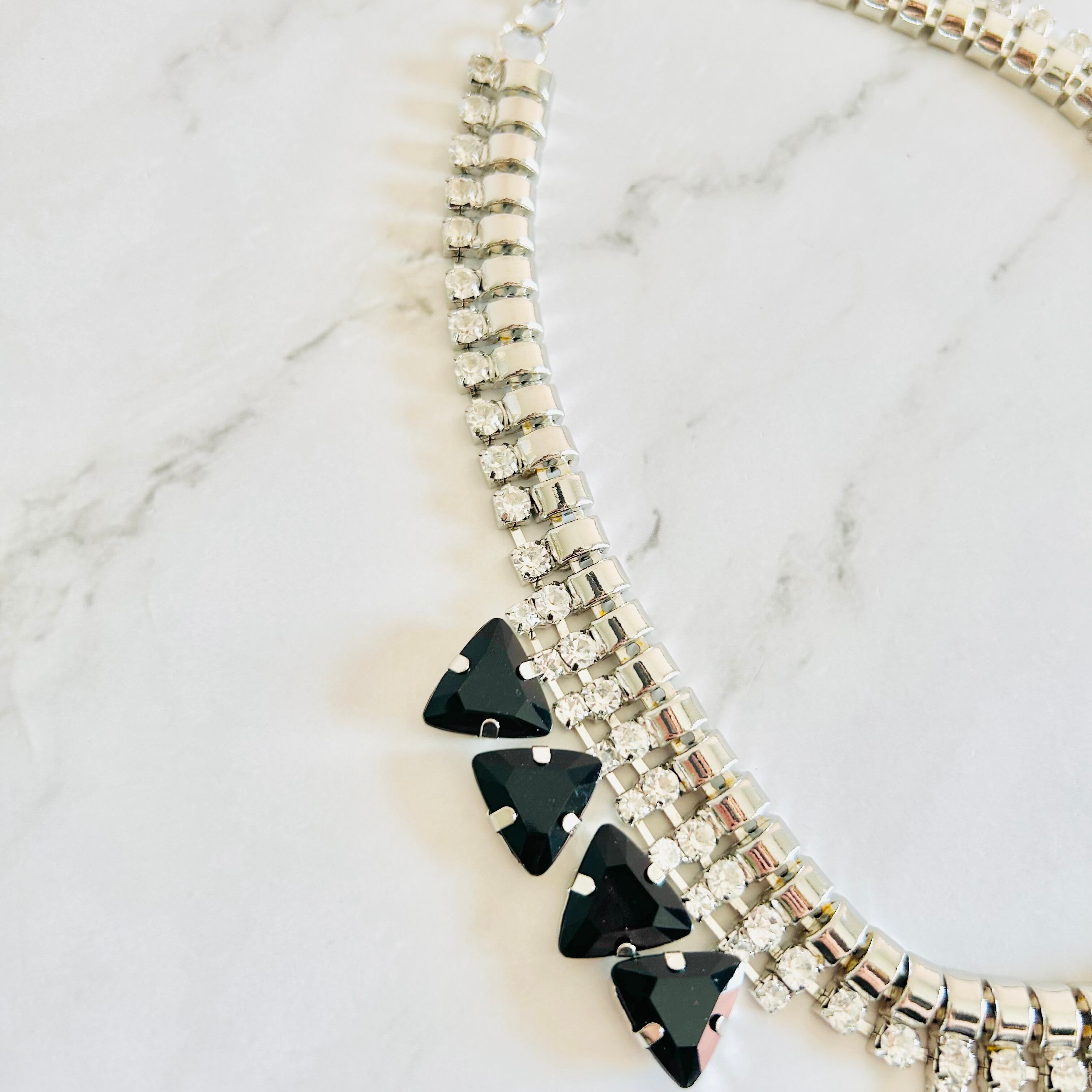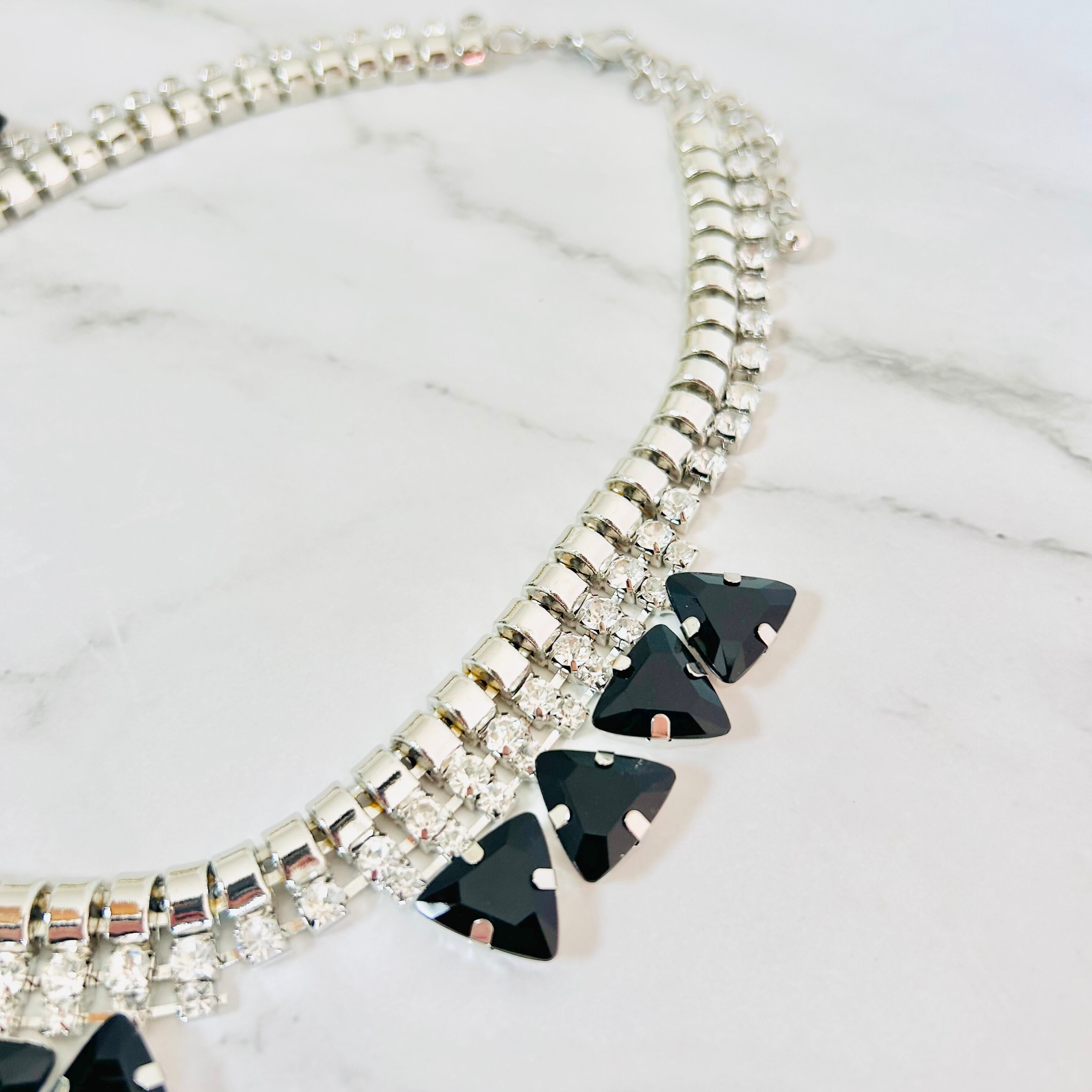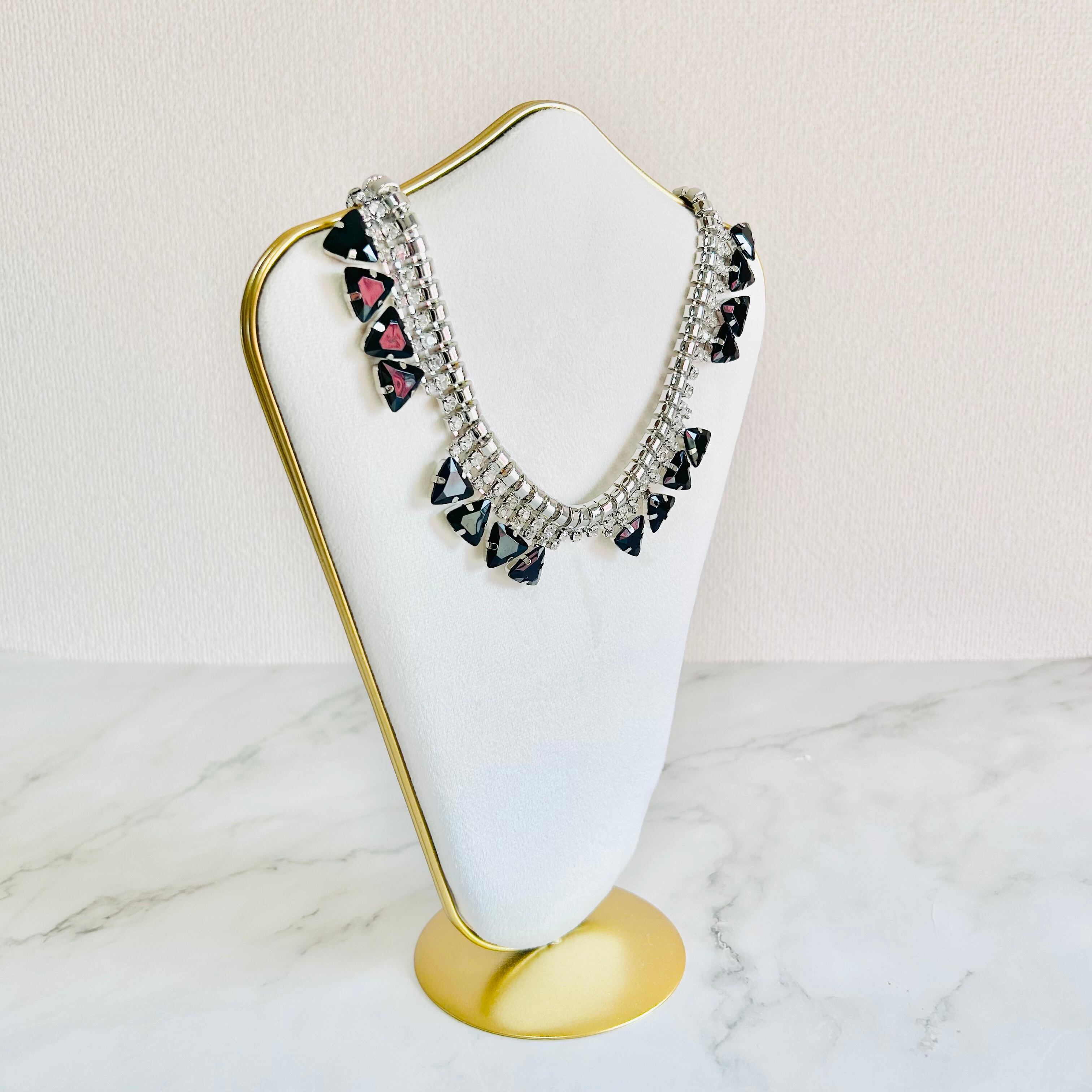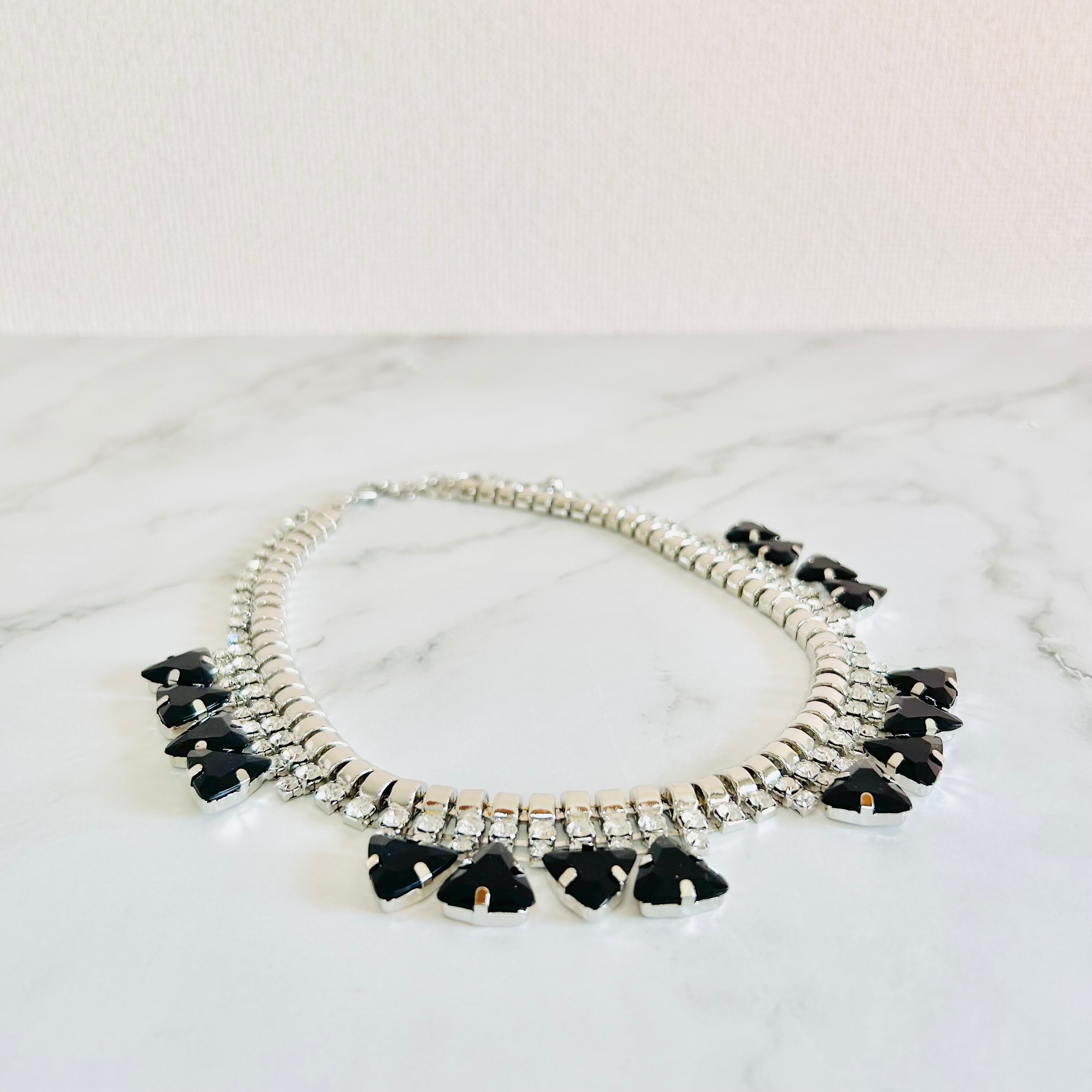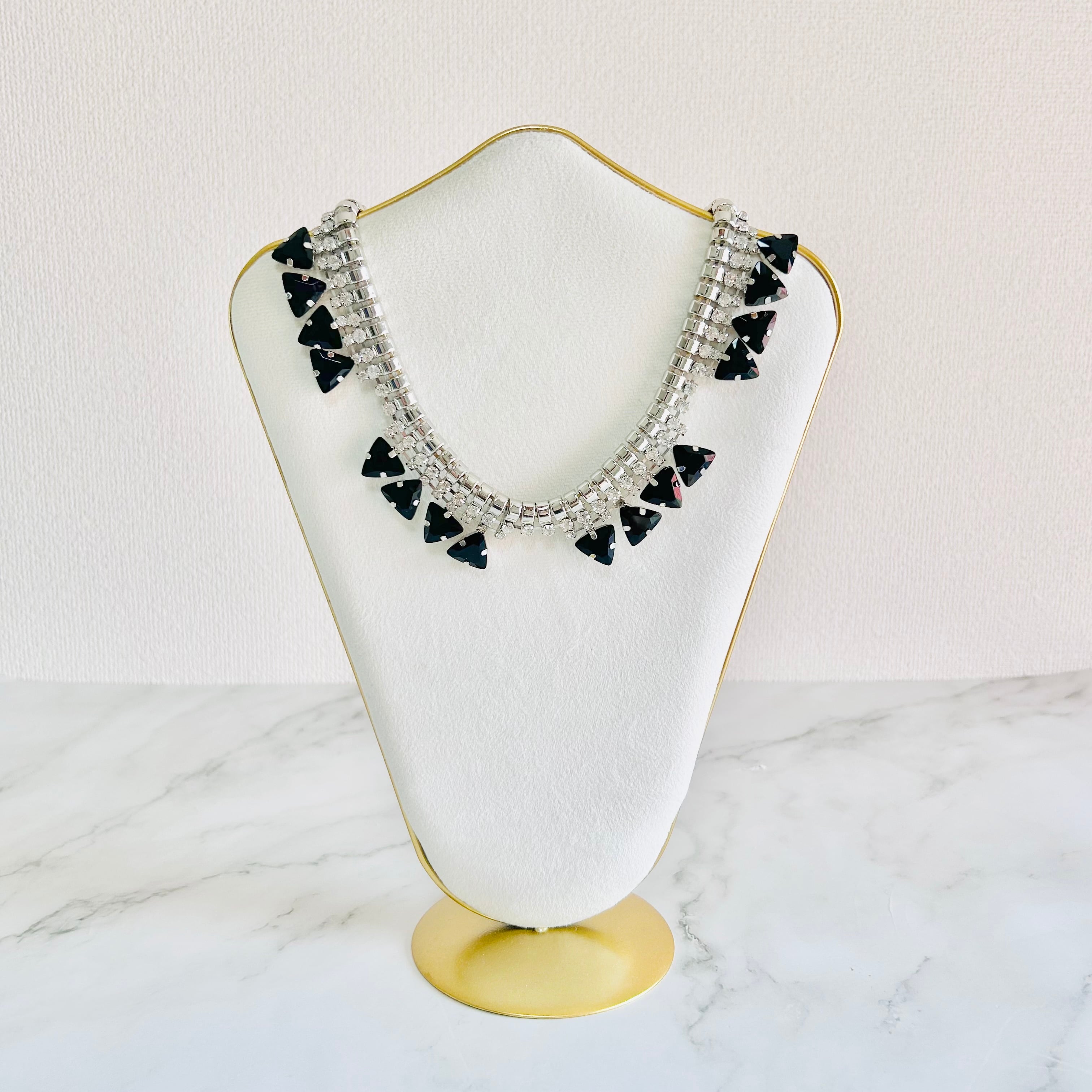 ブラックのトライアングルモチーフとラインストーンの華やかなコントラストが印象的な、シルバーベースのネックレスです。
