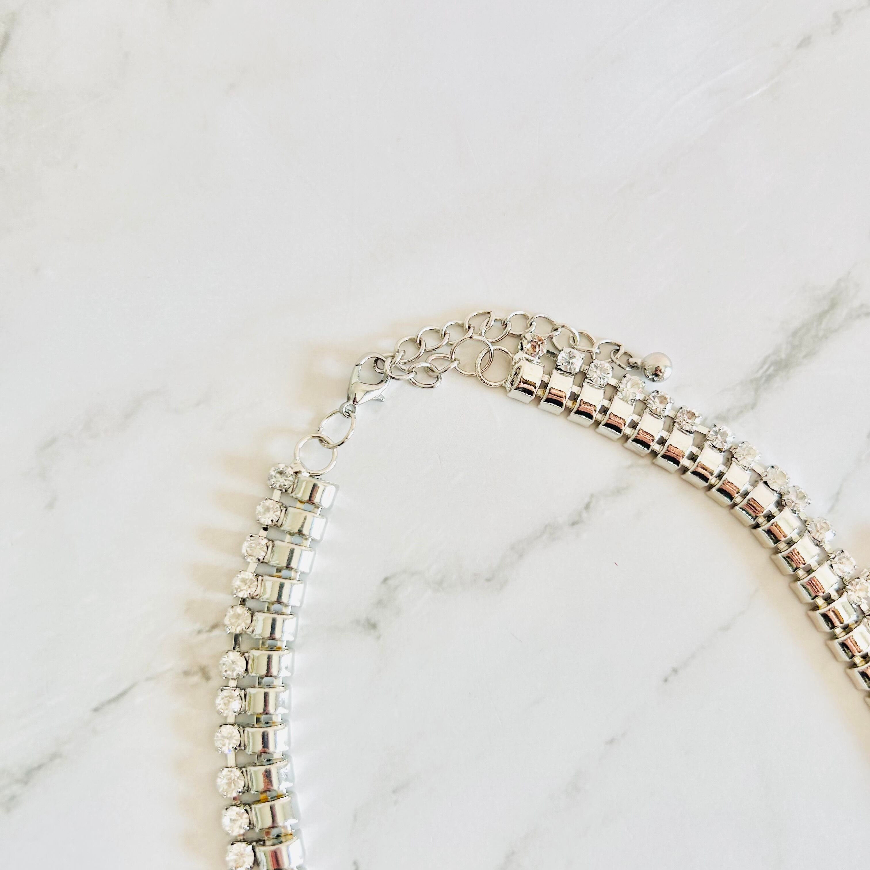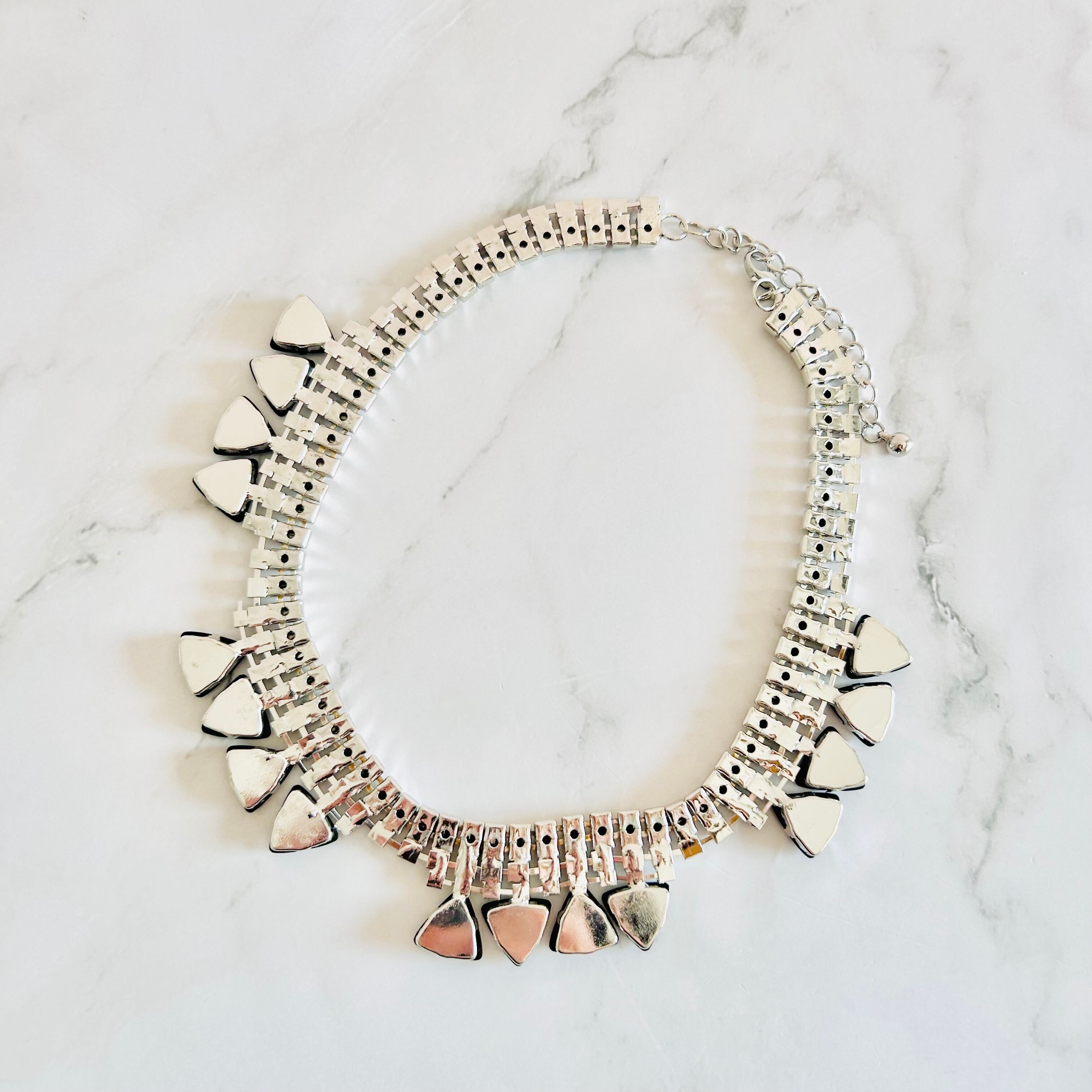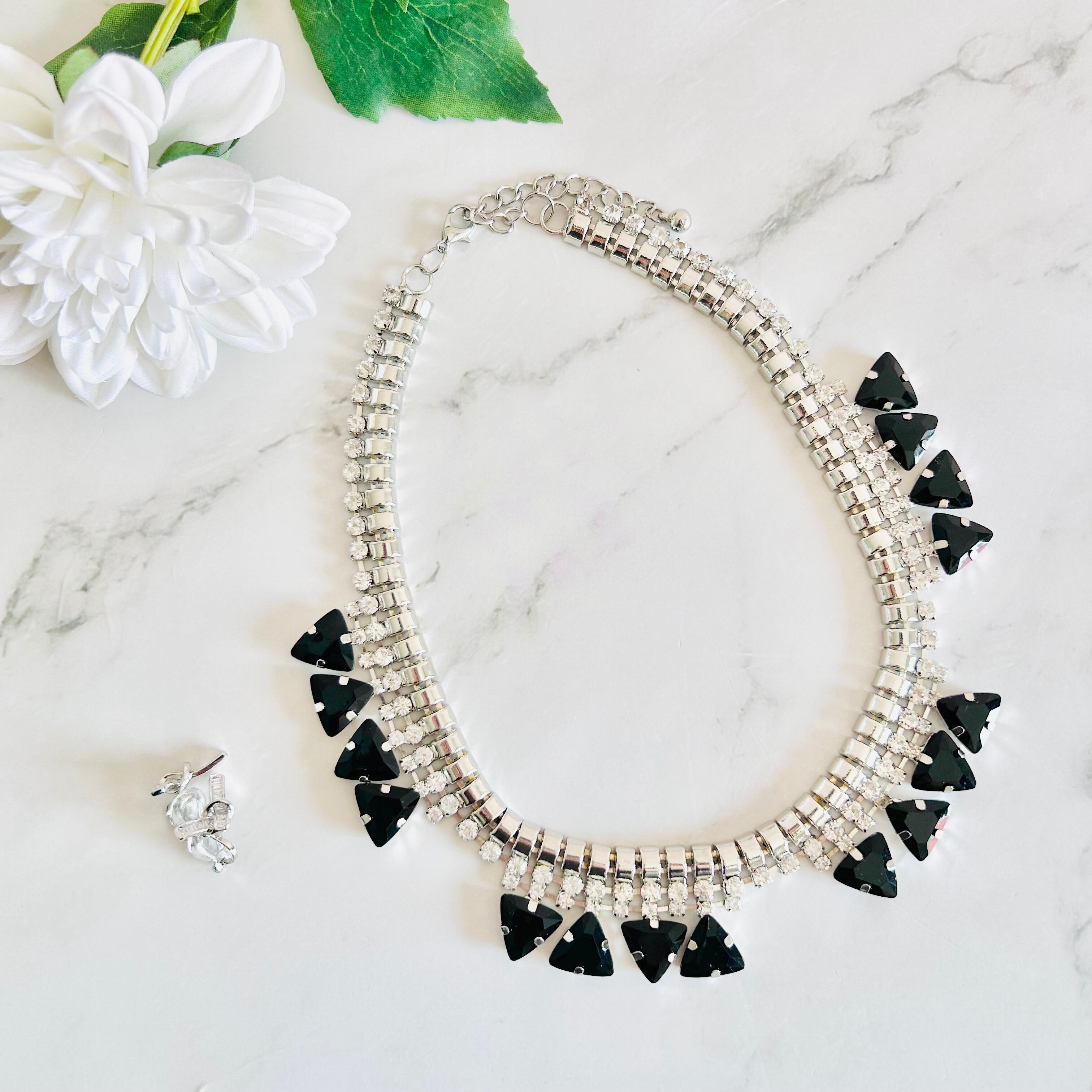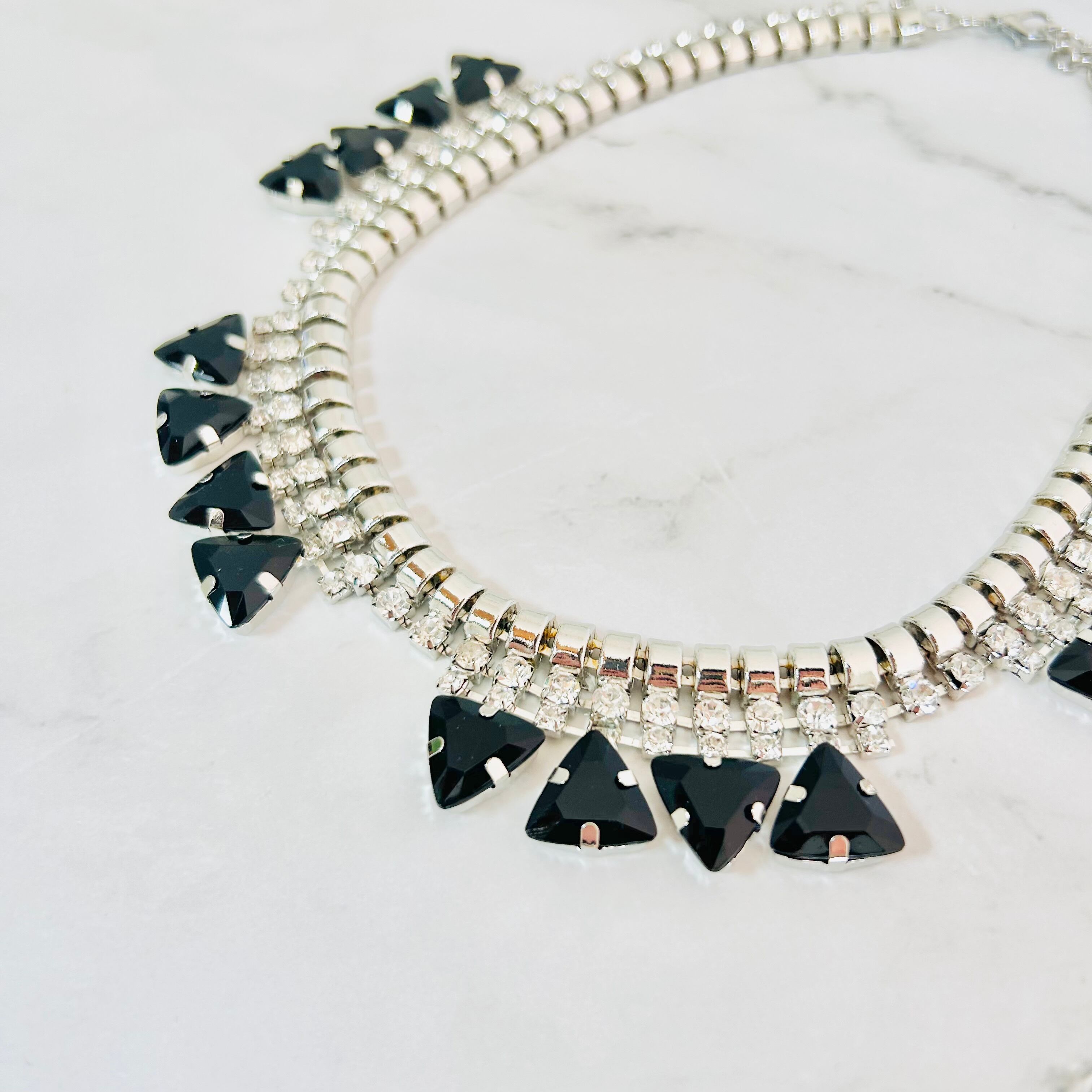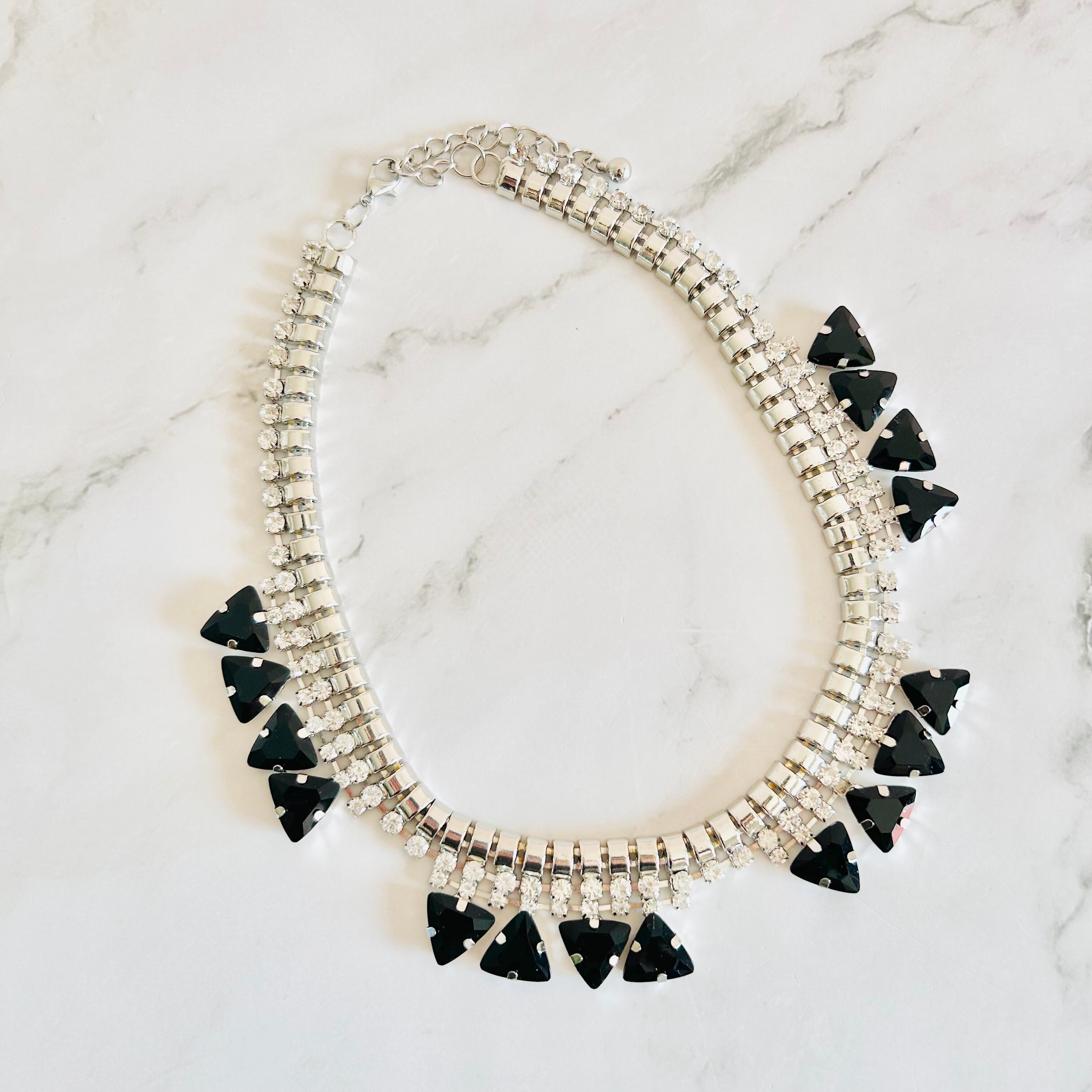 ブラックのトライアングルモチーフとラインストーンの華やかなコントラストが印象的な、シルバーベースのネックレスです。