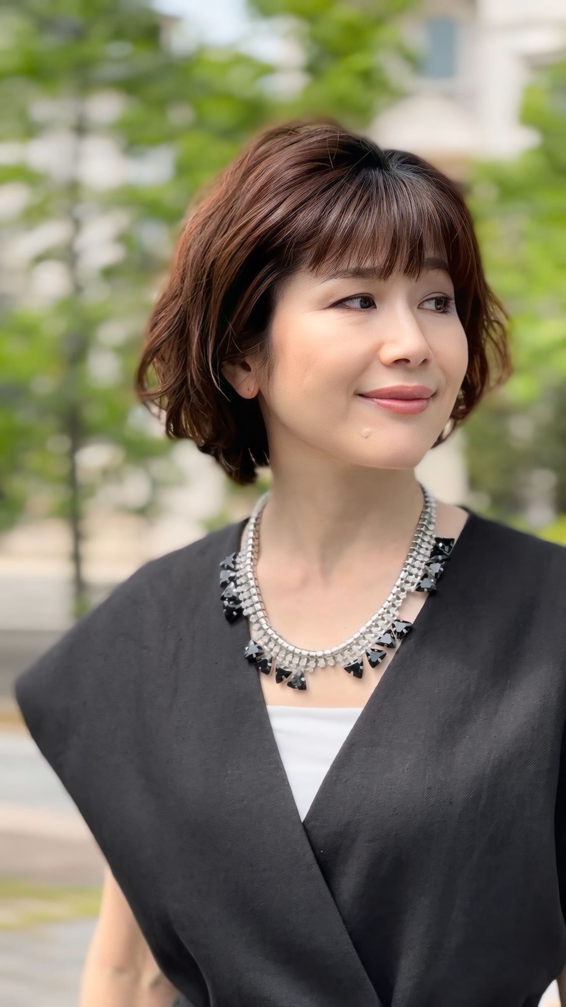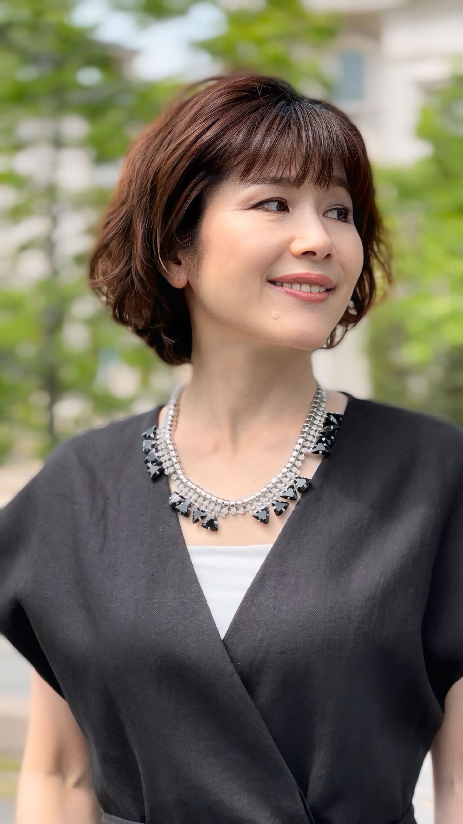 シンプルなノースリーブやTシャツの首元に添えるだけで、キリッと洗練された印象に!