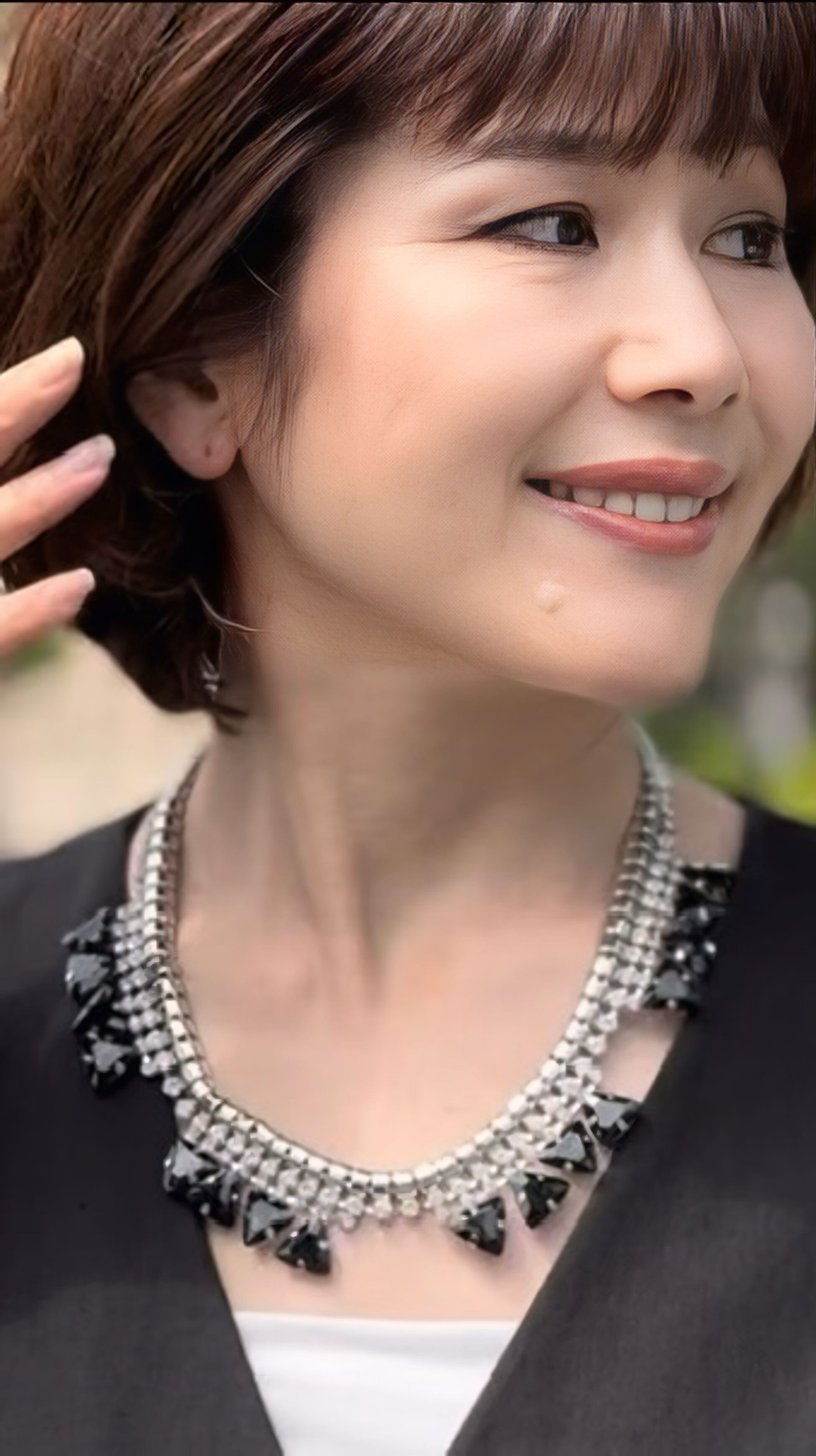 ブラックの三角パーツがリズミカルに連なり、間に敷き詰められたクリアストーンが光を集めて、お顔まわりにクールな輝きを添えます。
