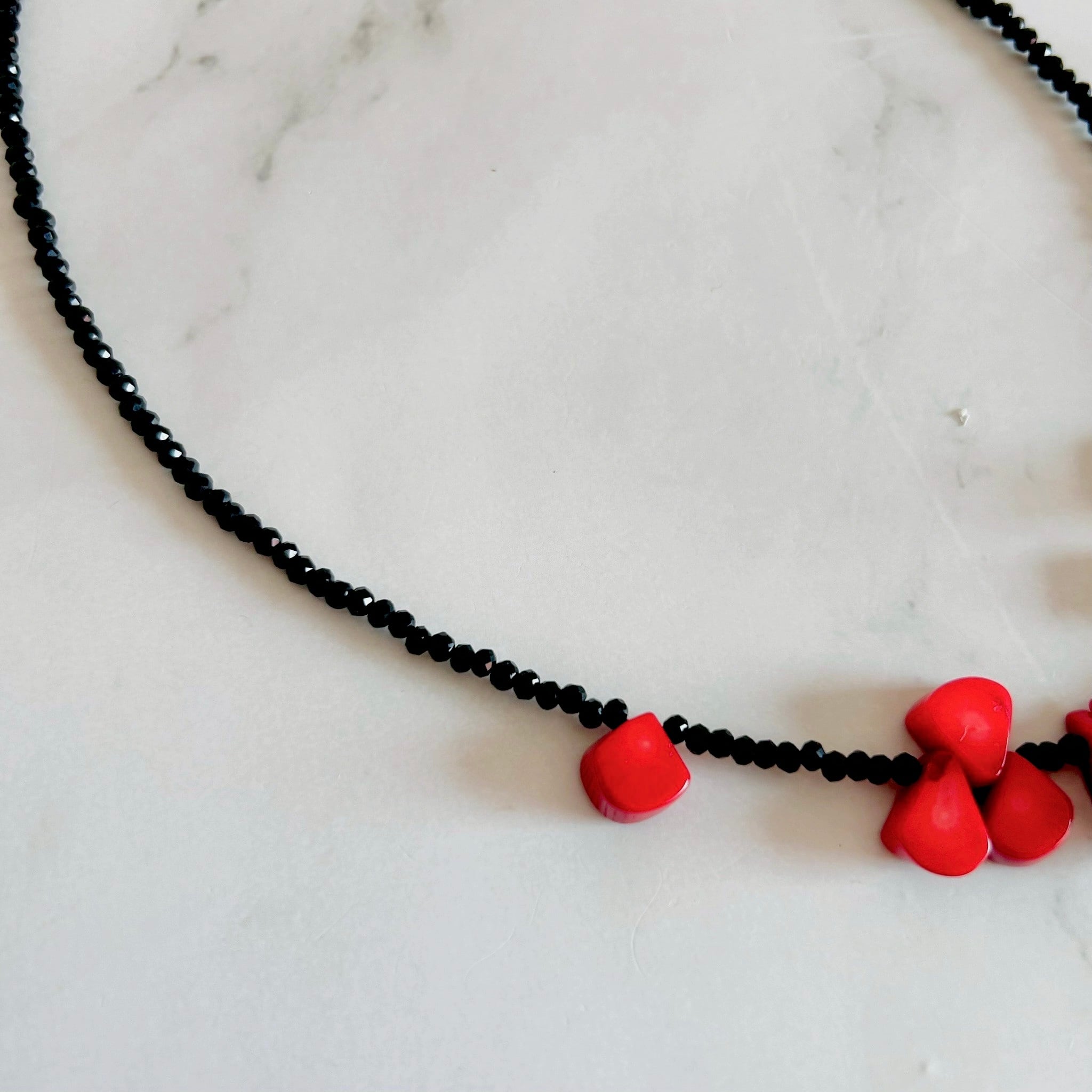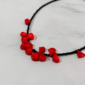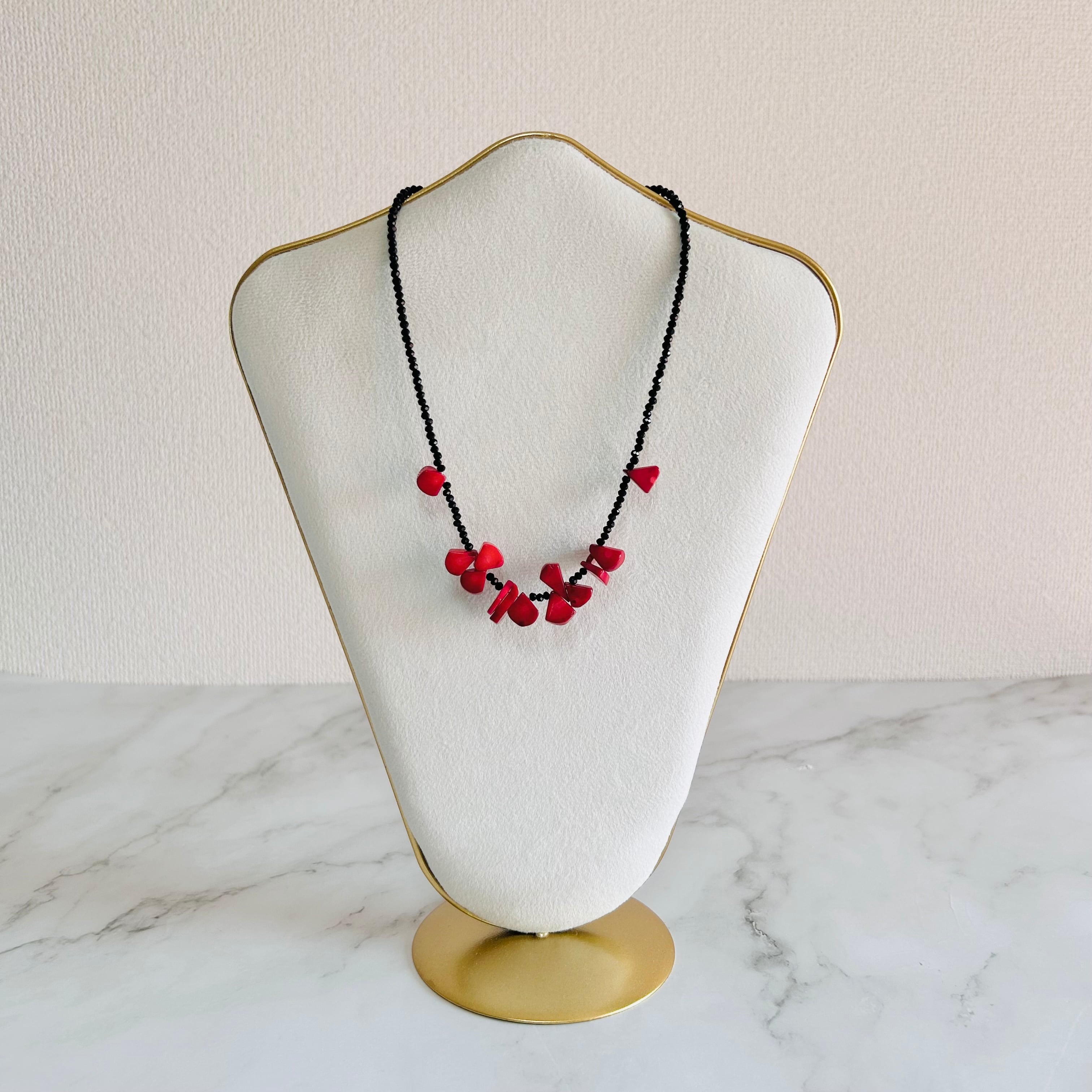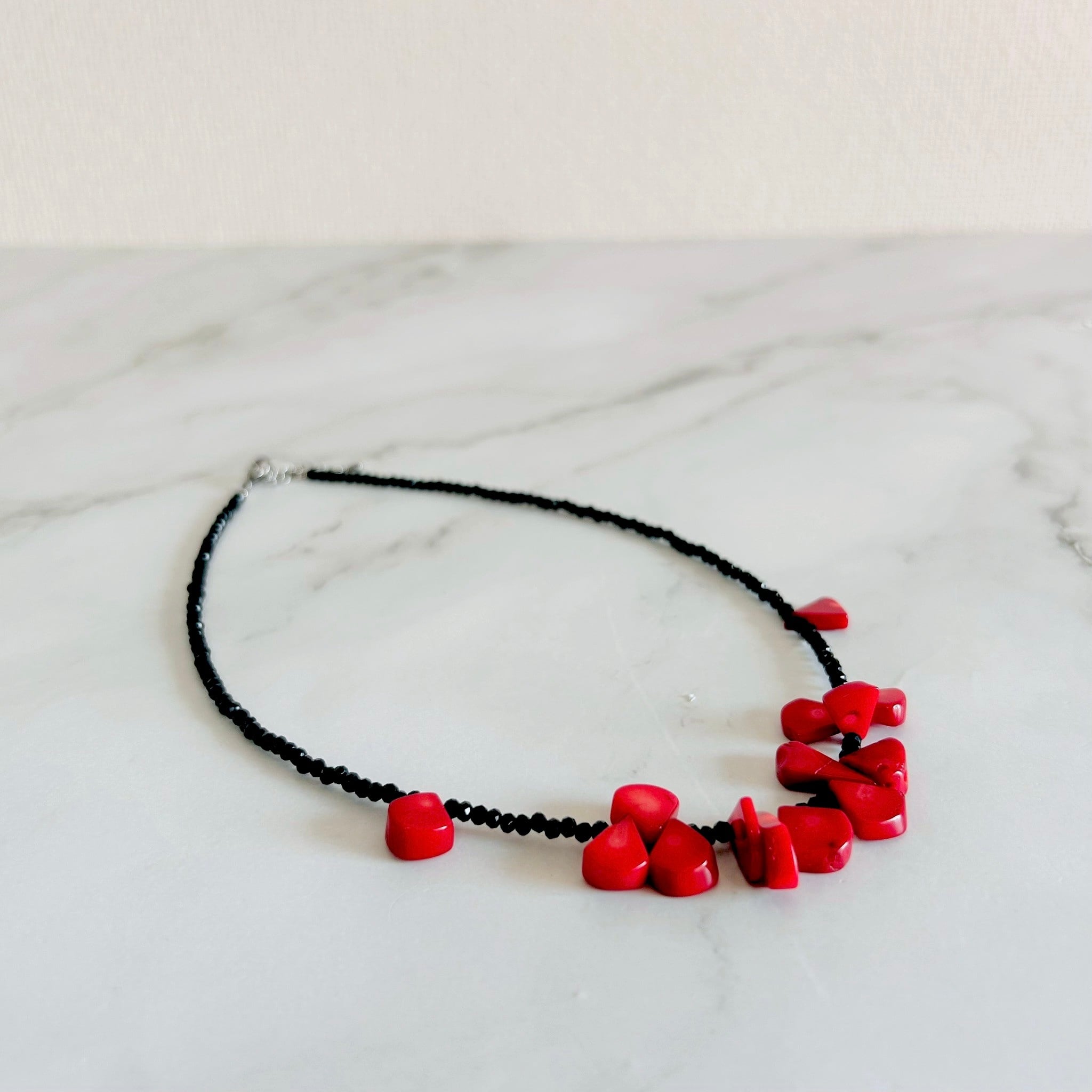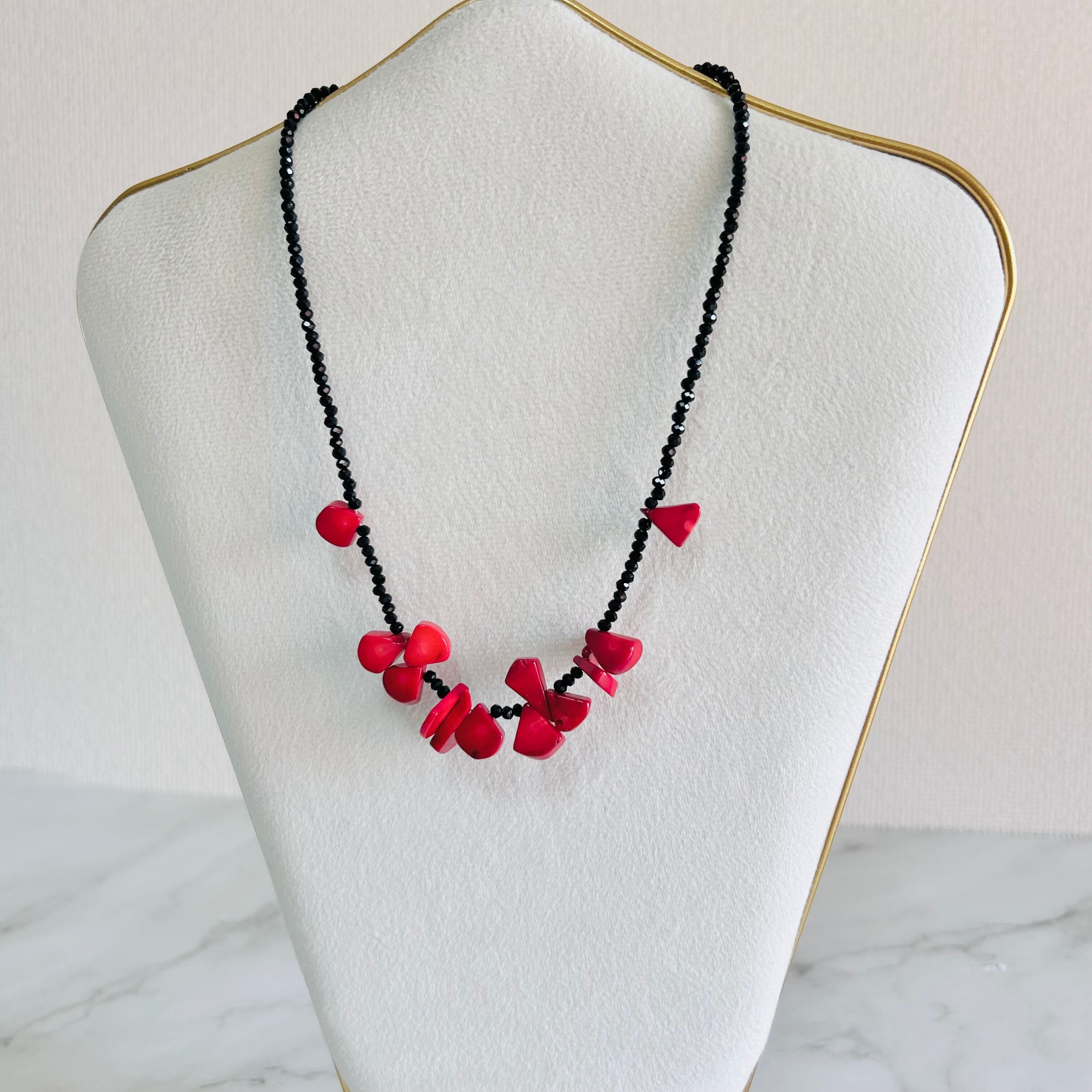 深い赤の珊瑚パーツと、艶感のあるブラックのチェコビーズを組み合わせたモダンで愛らしいショートネックレス。