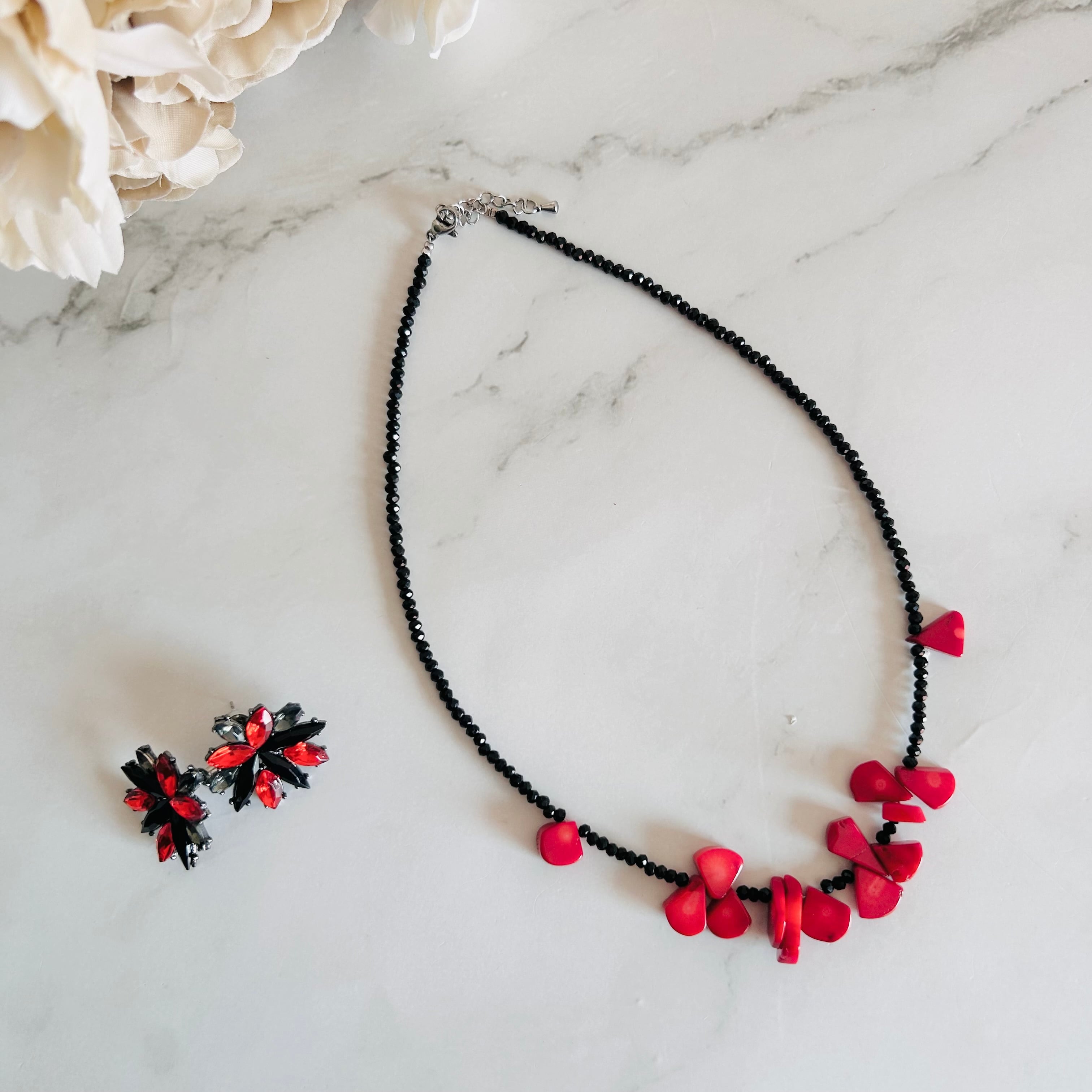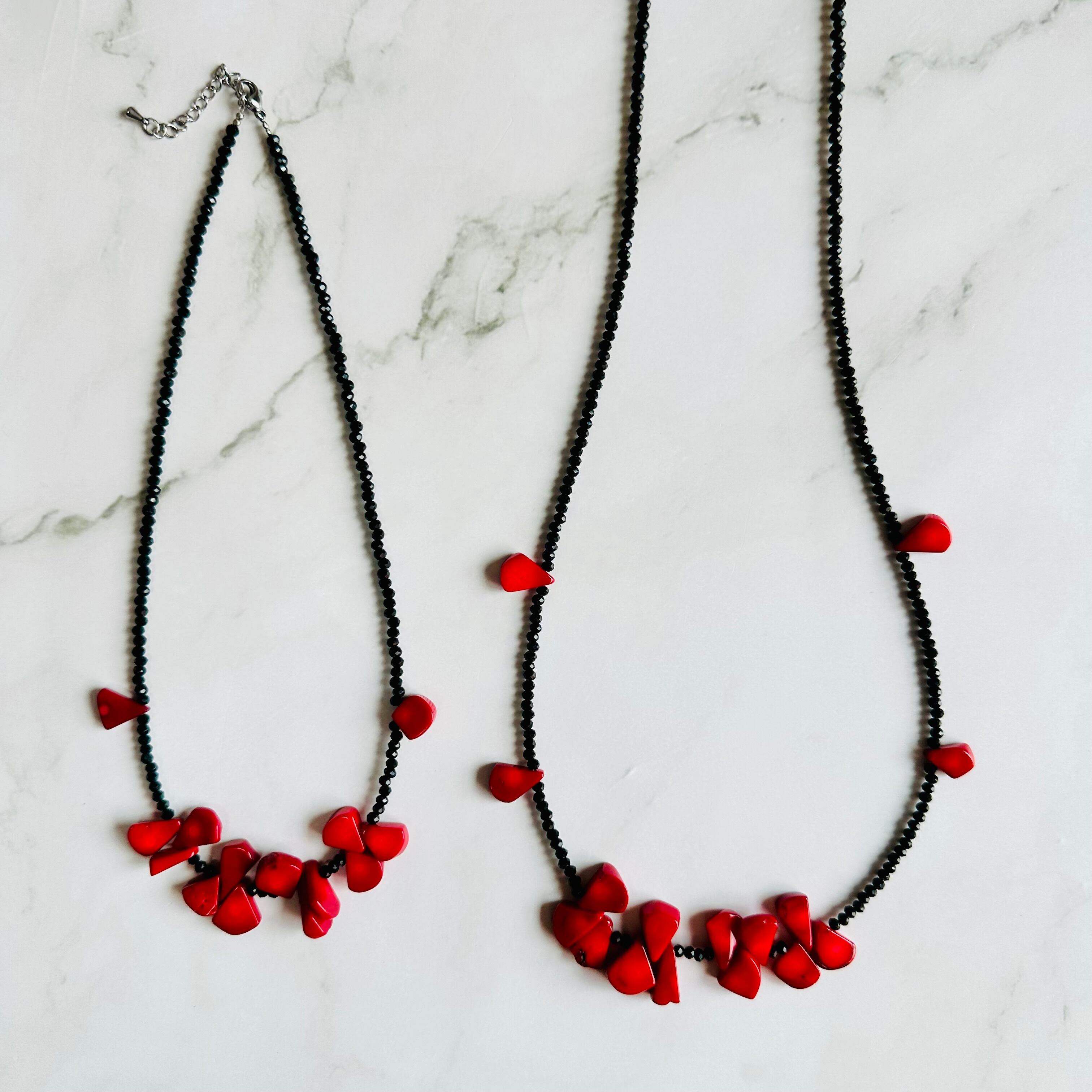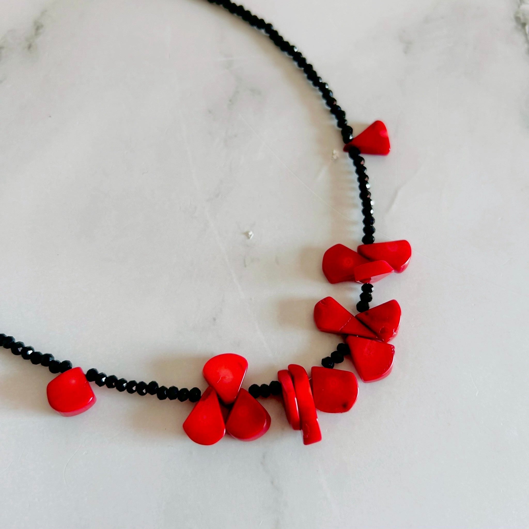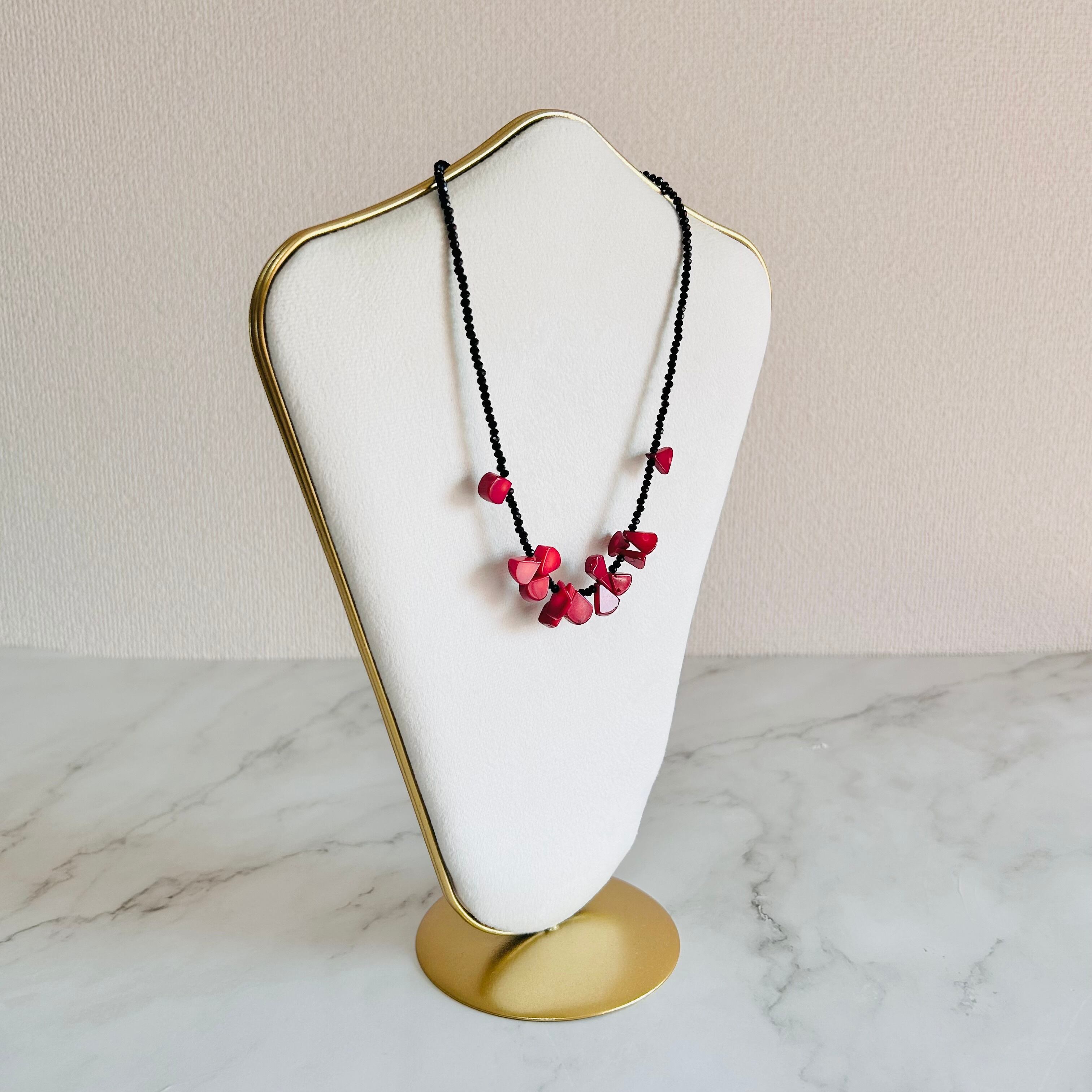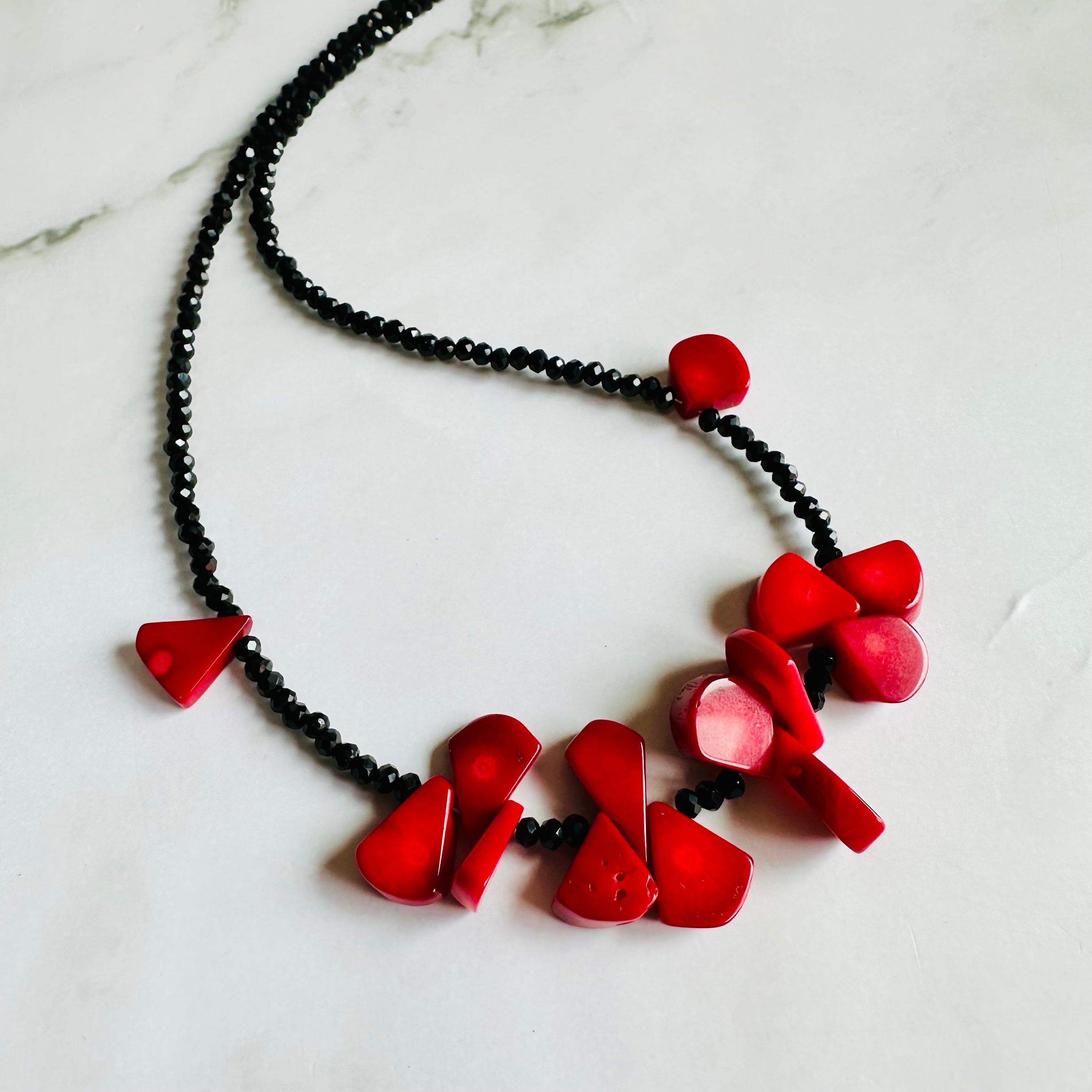 深い赤の珊瑚パーツと、艶感のあるブラックのチェコビーズを組み合わせたモダンで愛らしいショートネックレス。