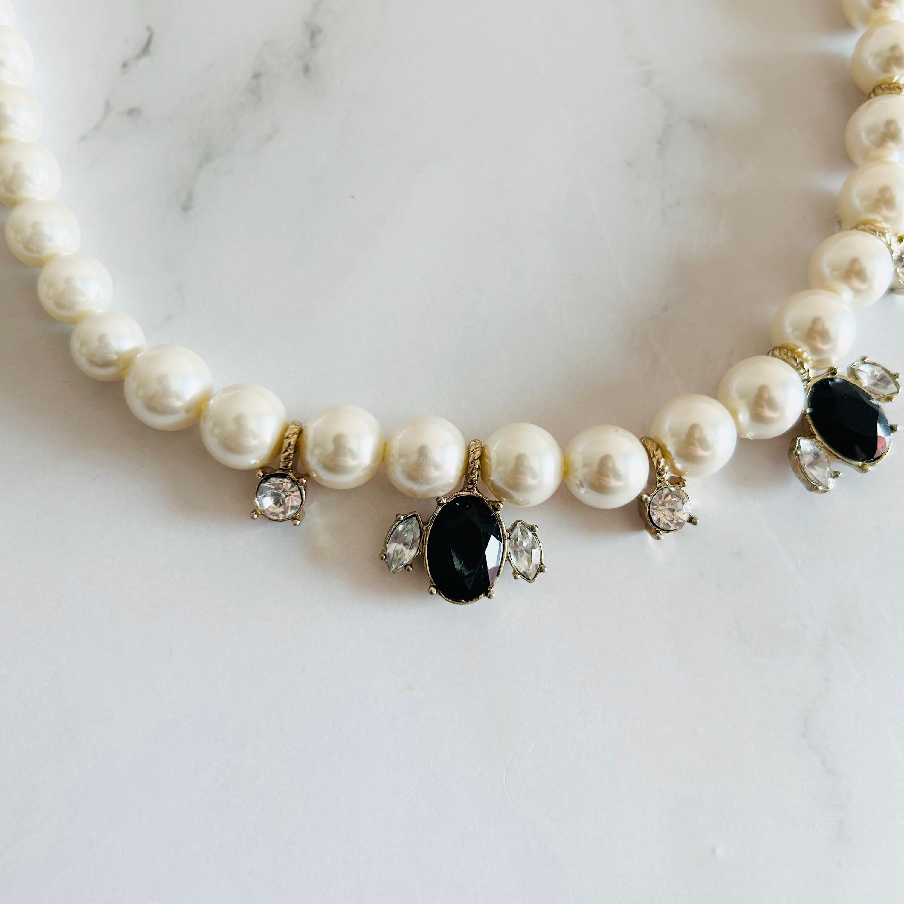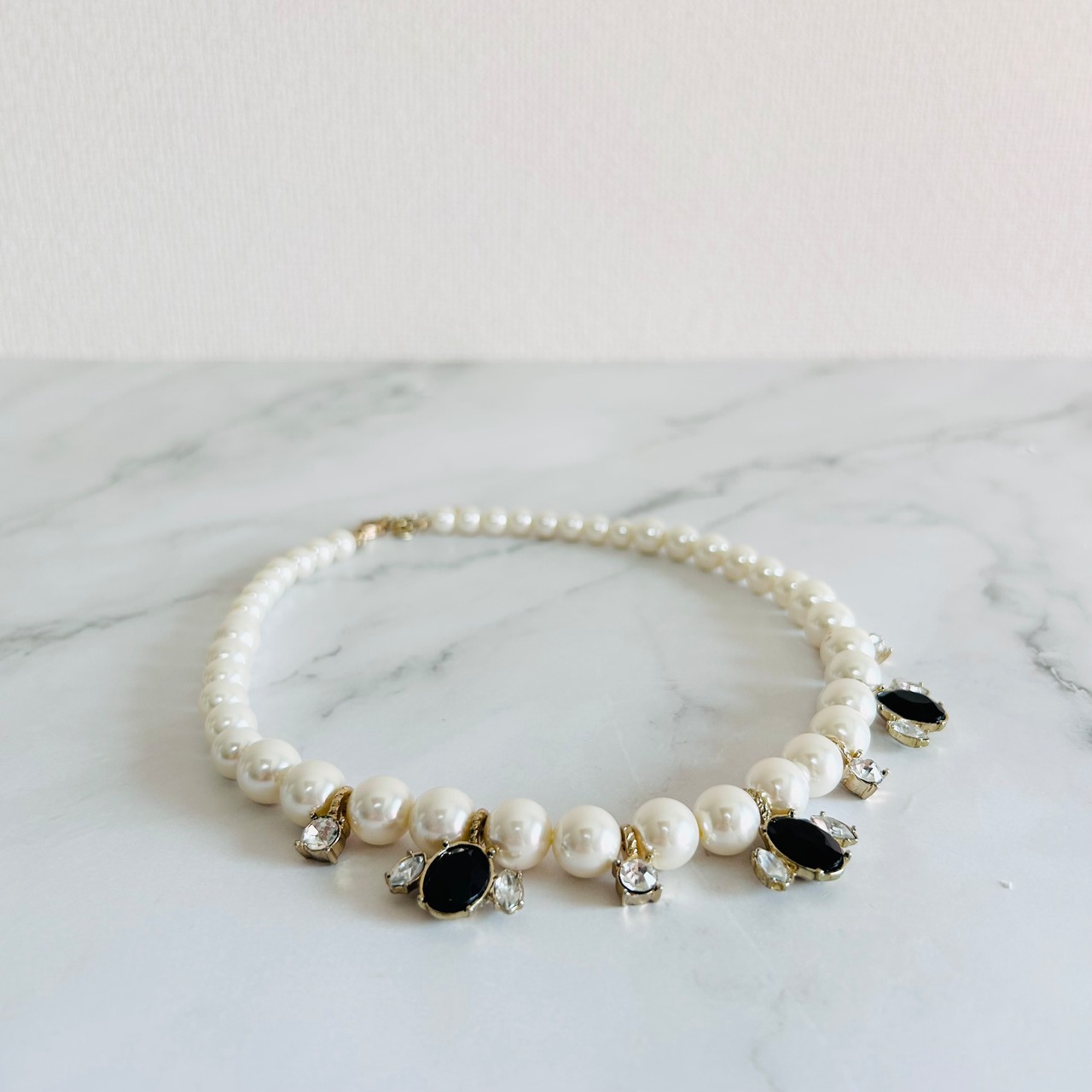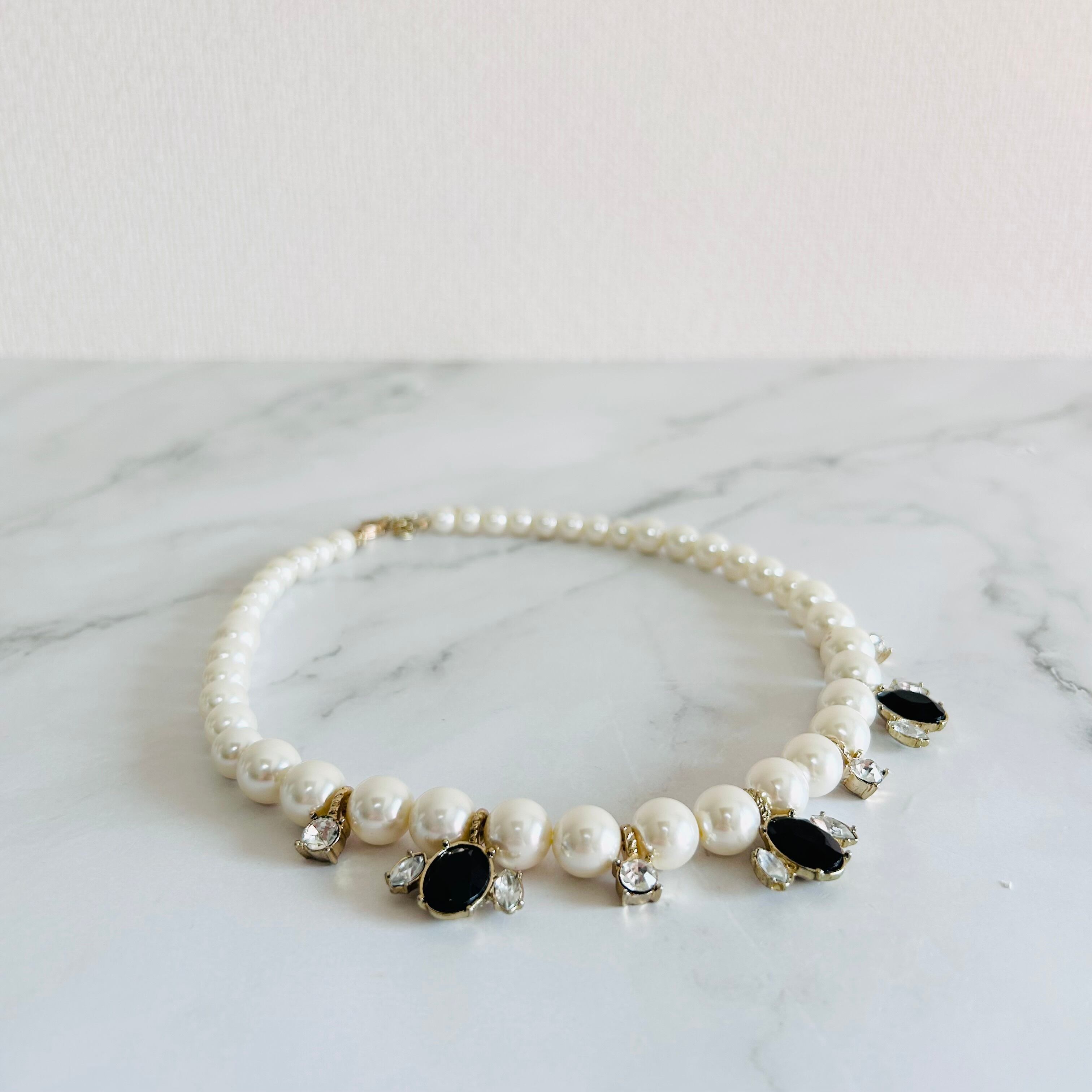 上品な光沢をたたえるパールビーズに、艶やかなブラックパーツとクリアビジューを組み合わせたエレガントなネックレスです。