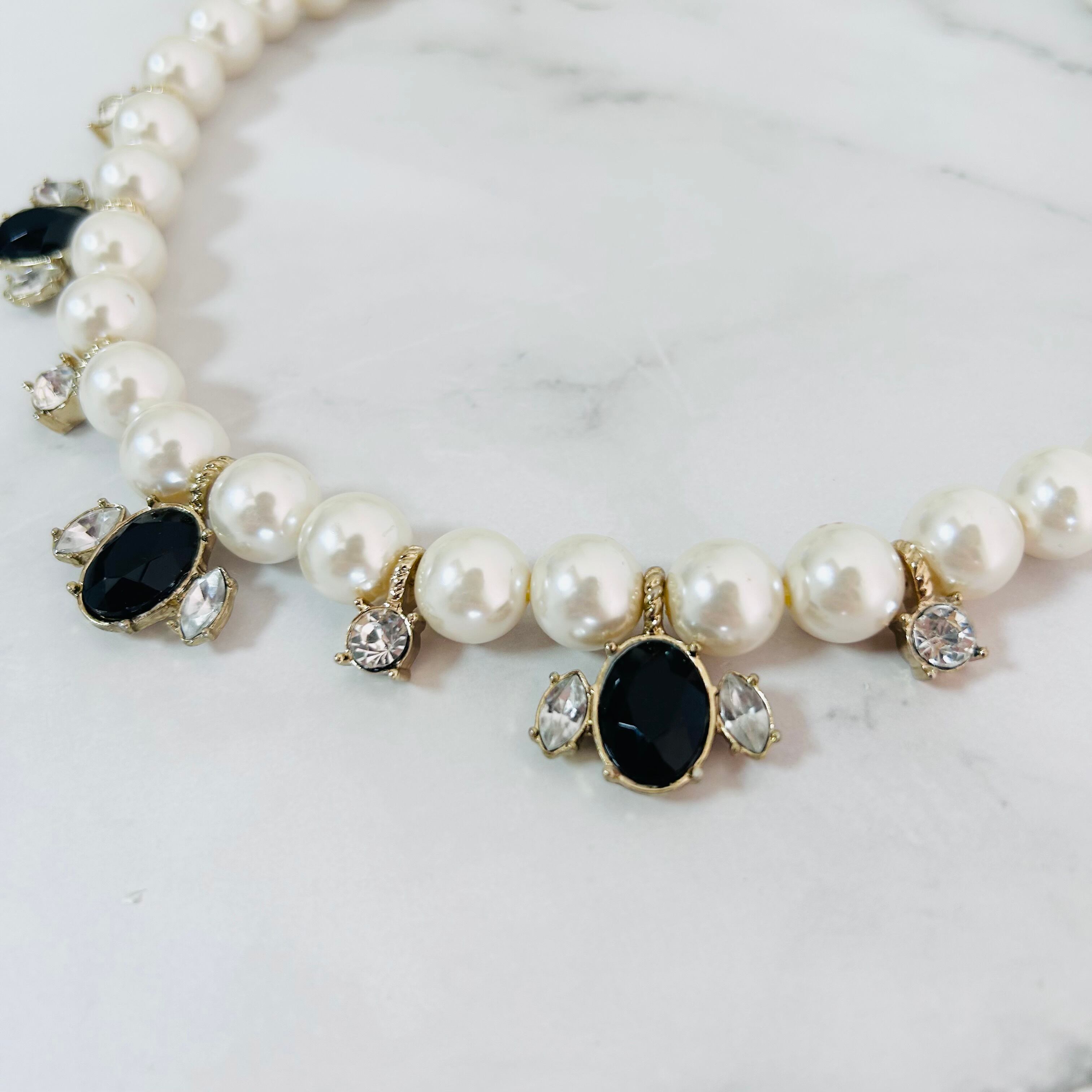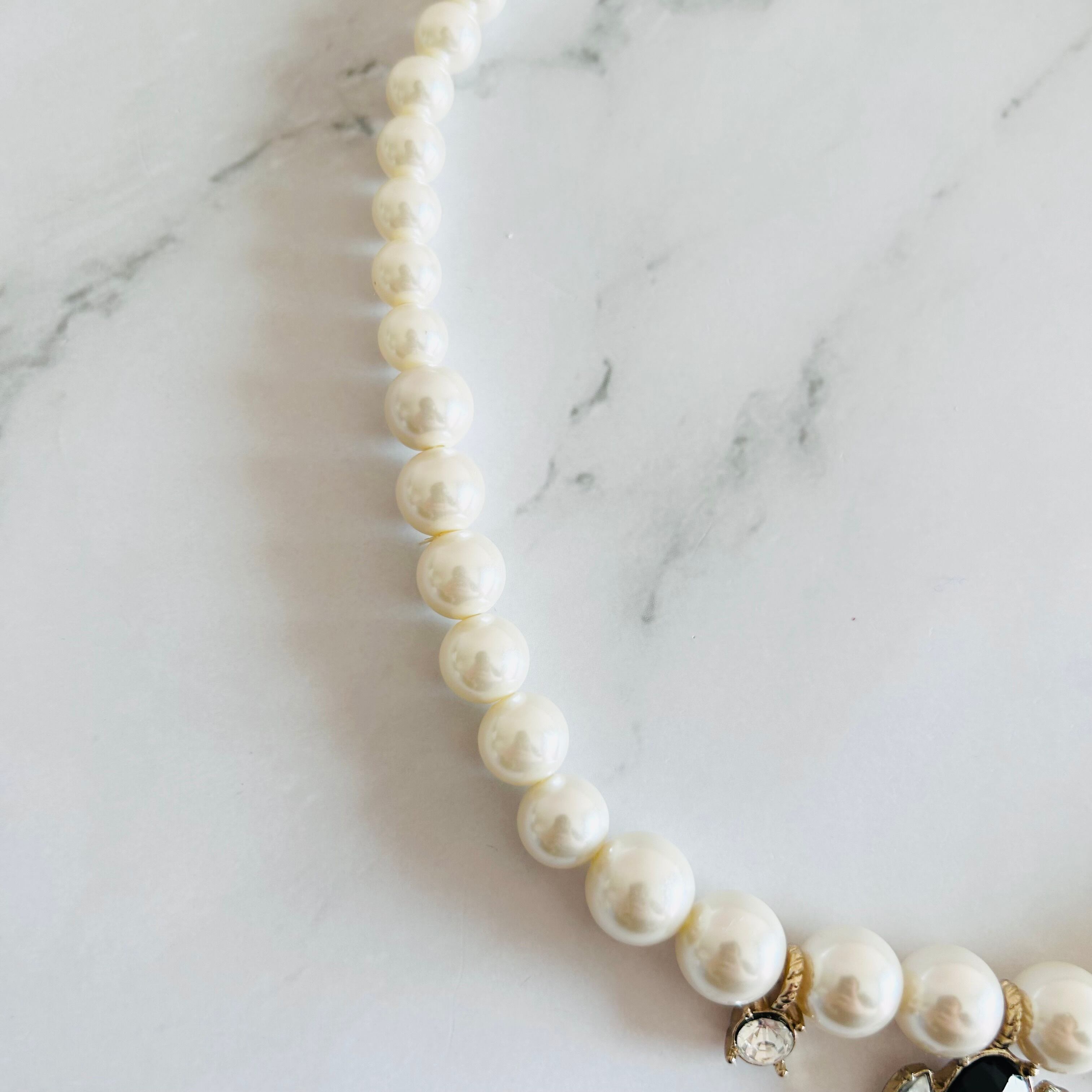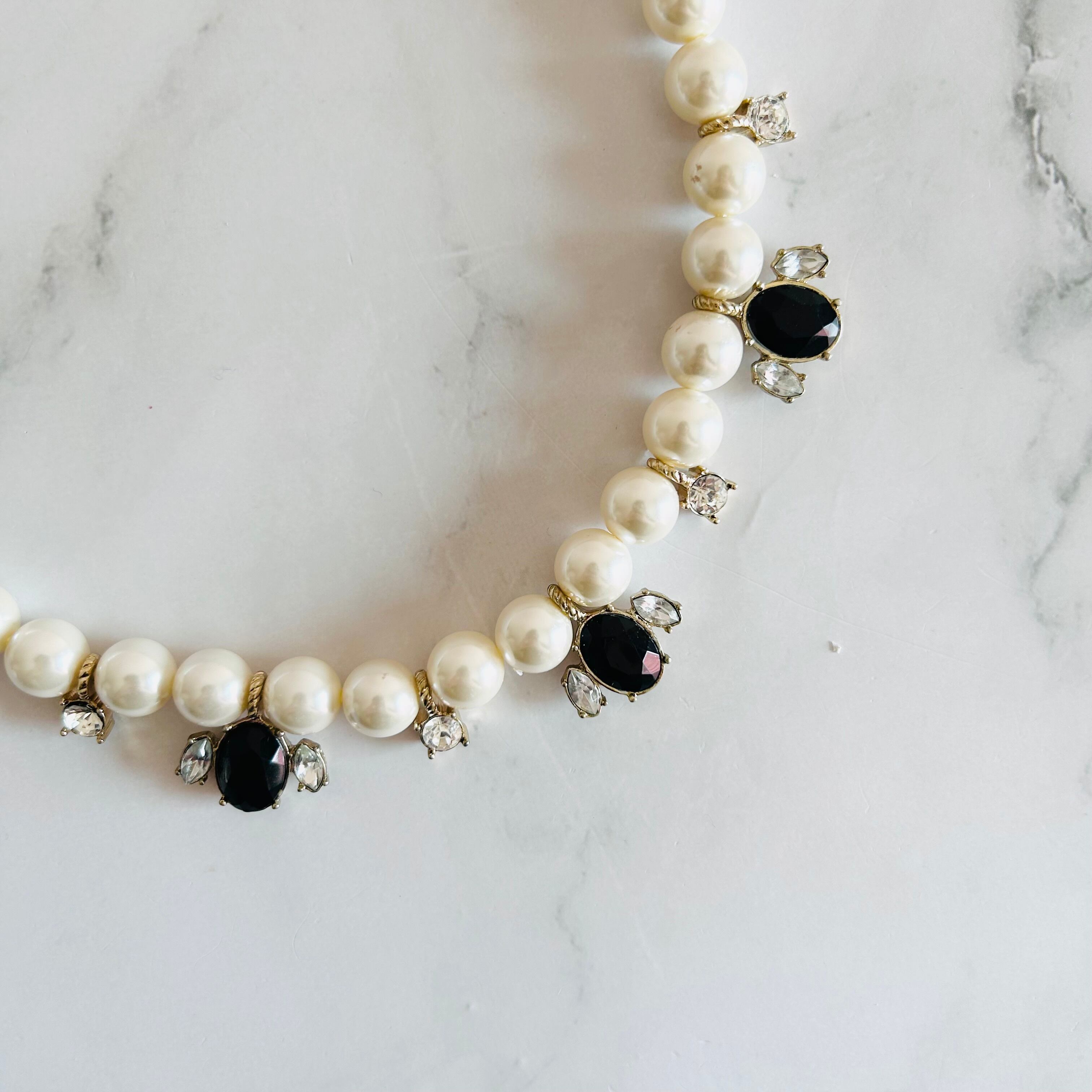 上品な光沢をたたえるパールビーズに、艶やかなブラックパーツとクリアビジューを組み合わせたエレガントなネックレスです。