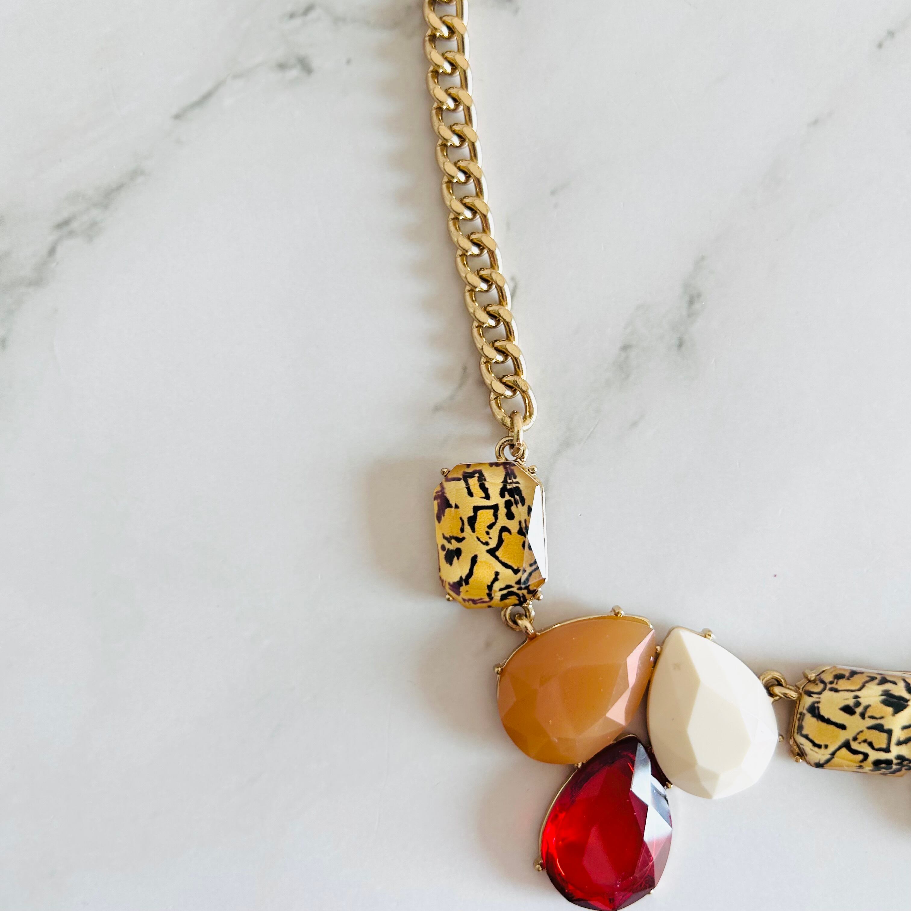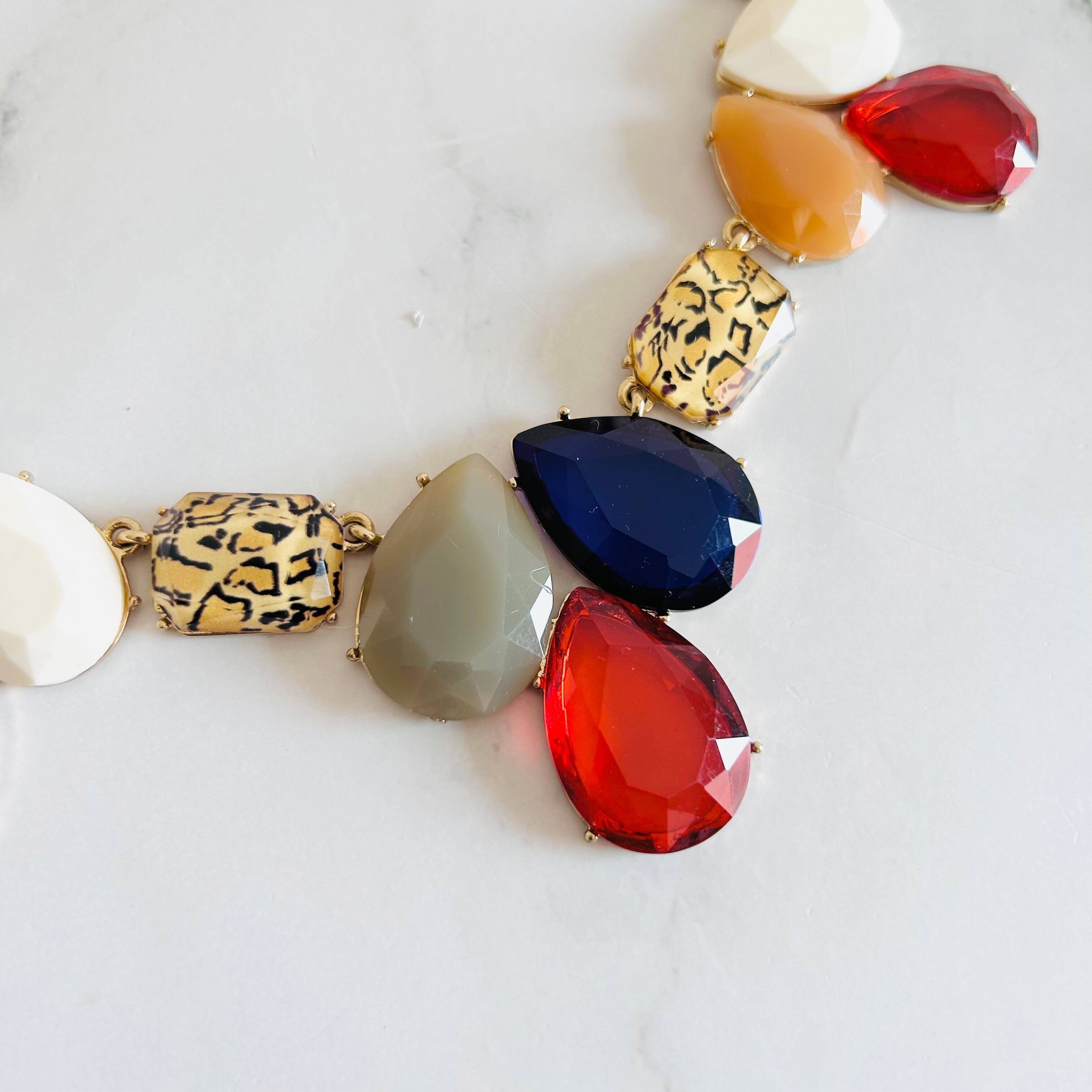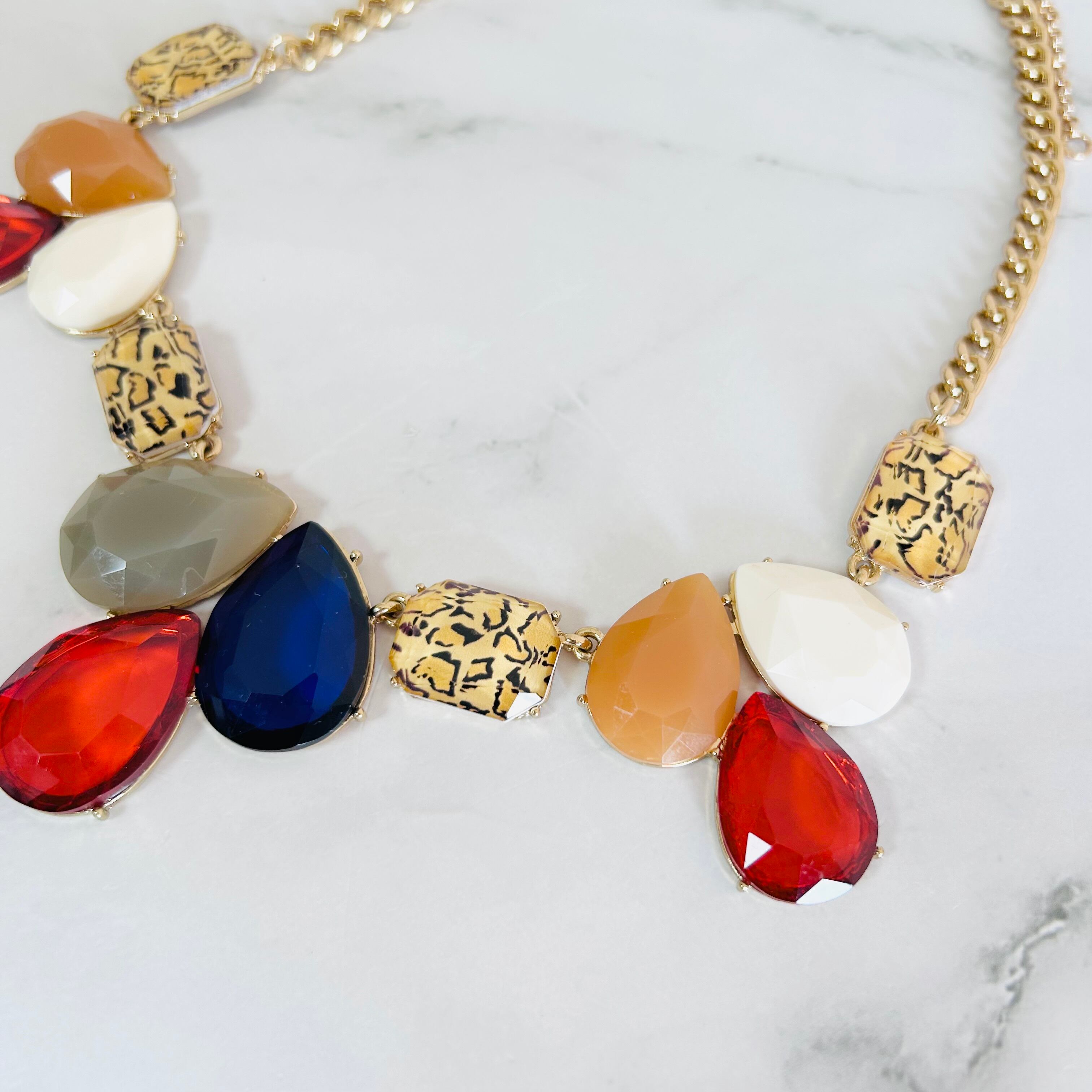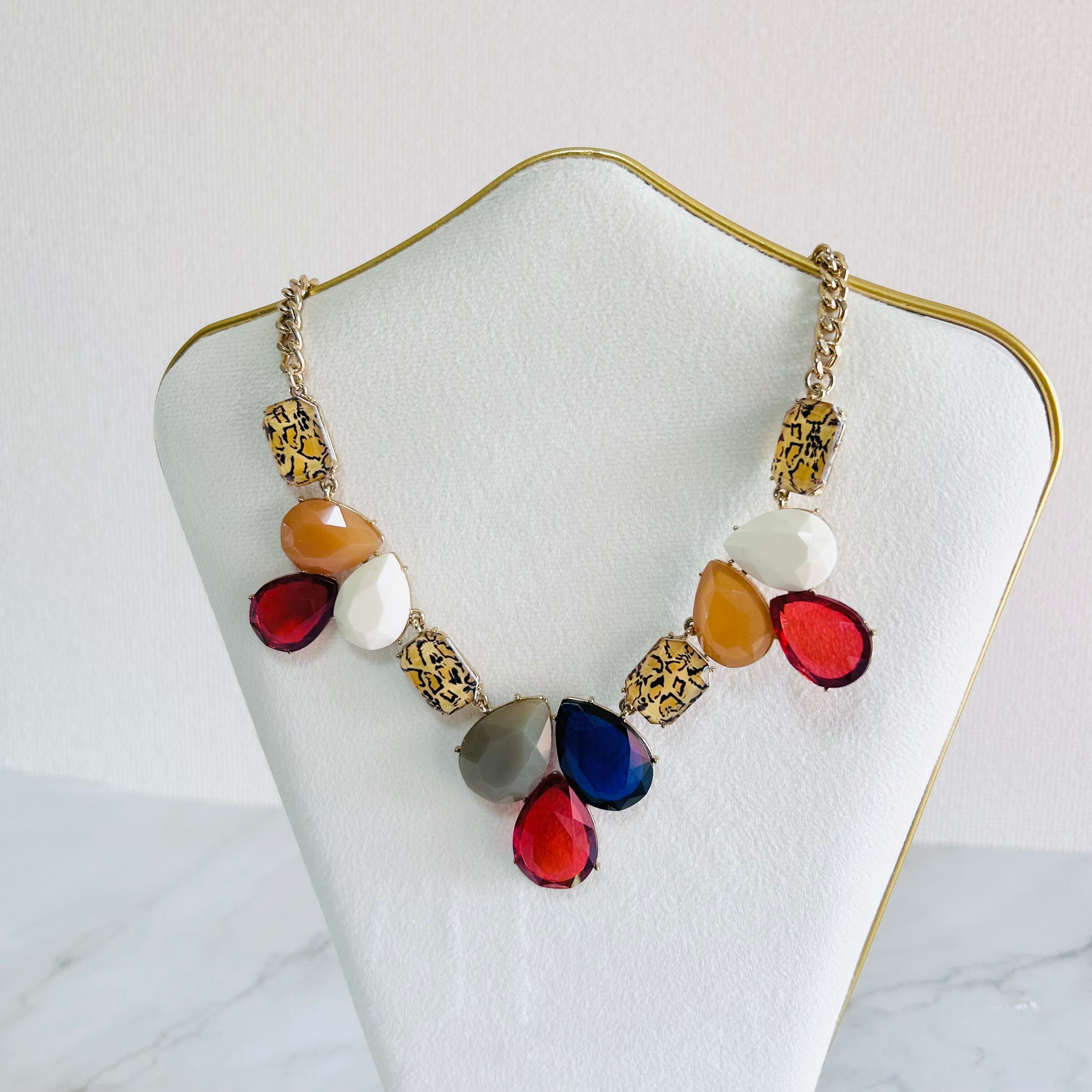 大ぶりのしずく型パーツと、レオパード調の柄のあるパーツを組み合わせた、カラフルでユニークなネックレスです。