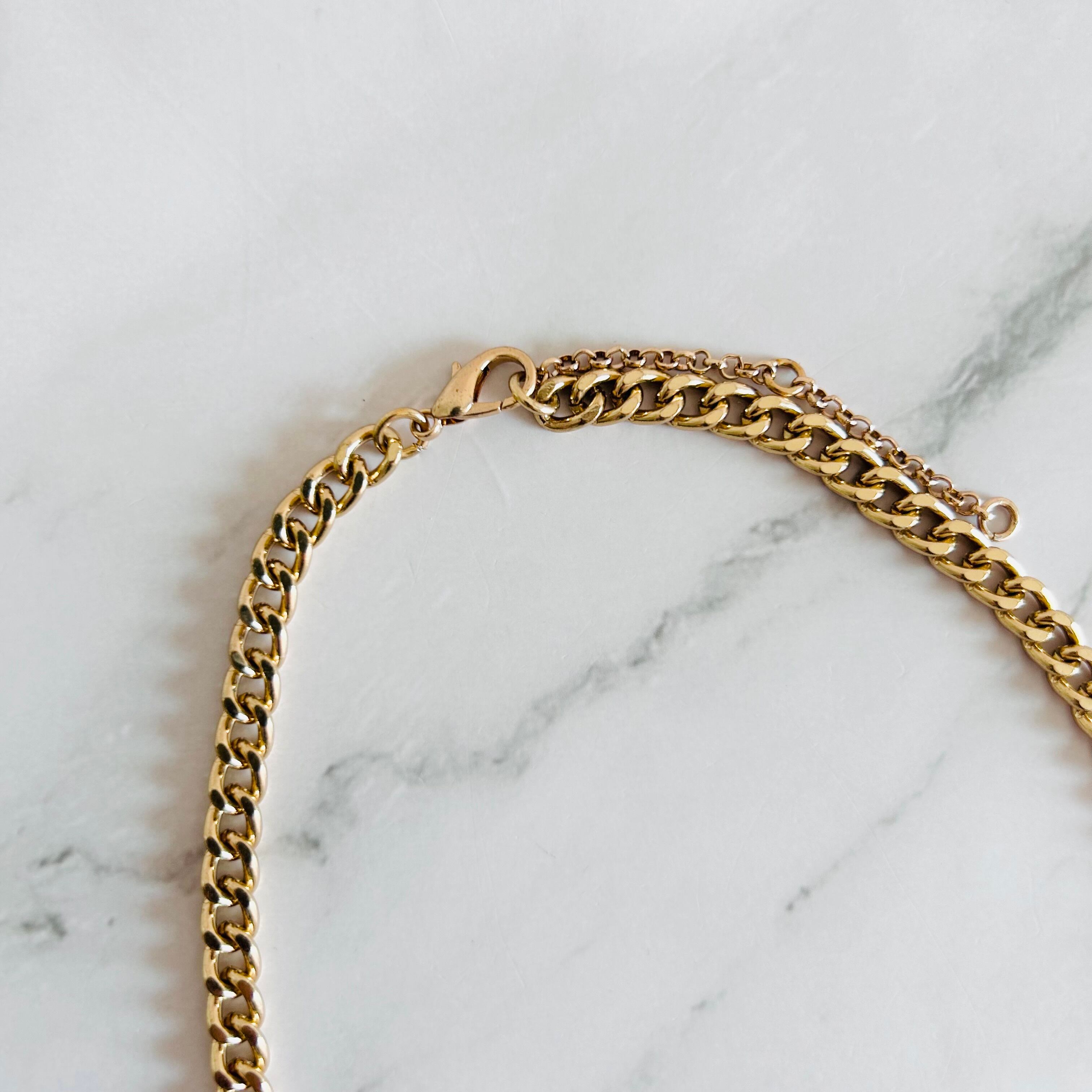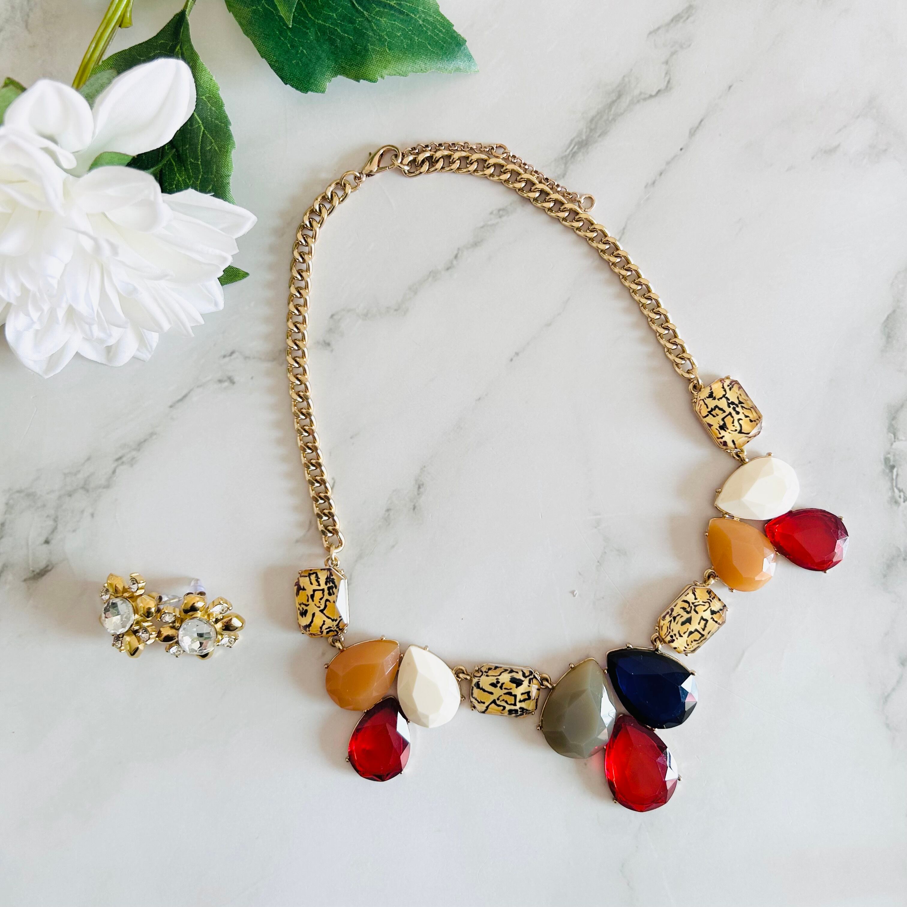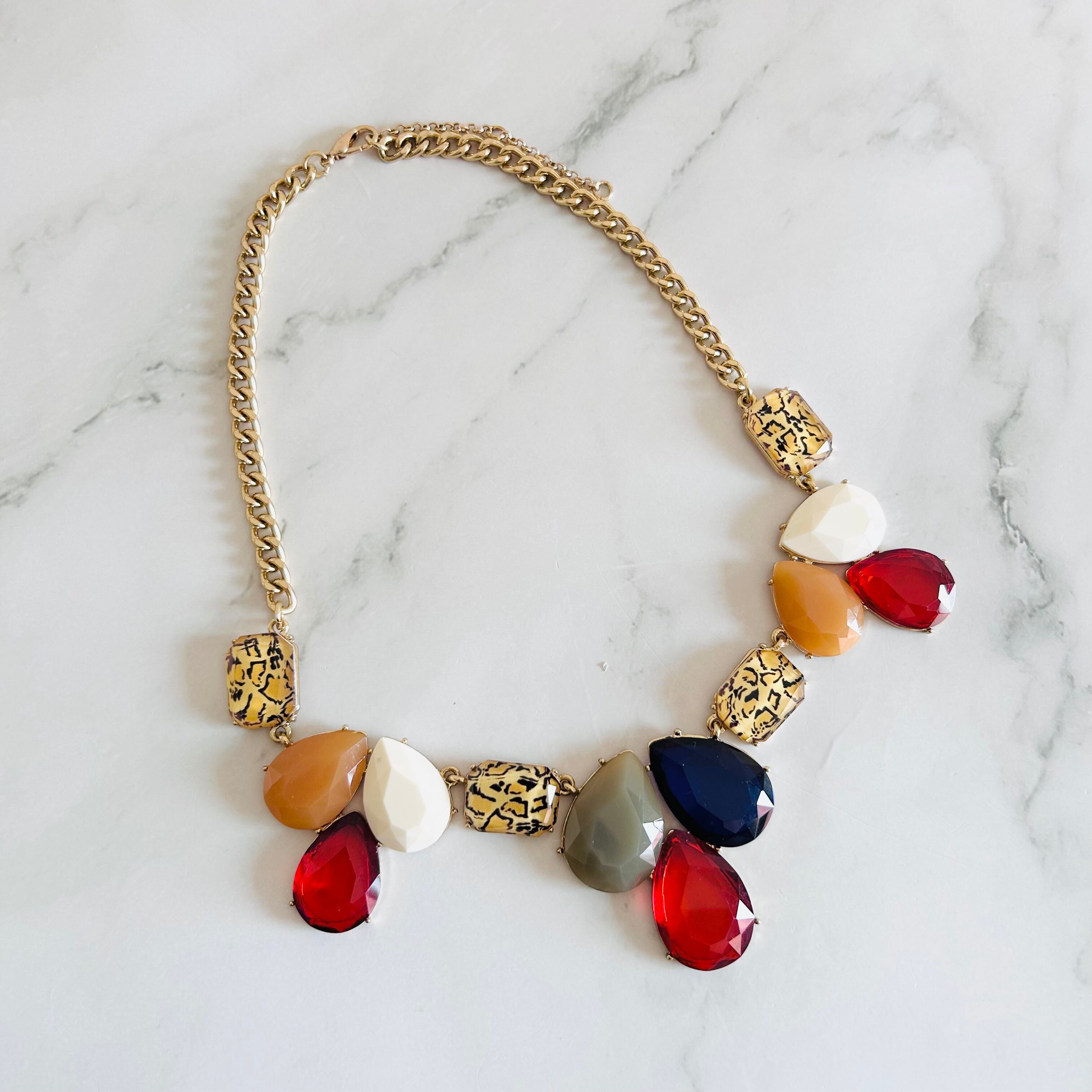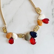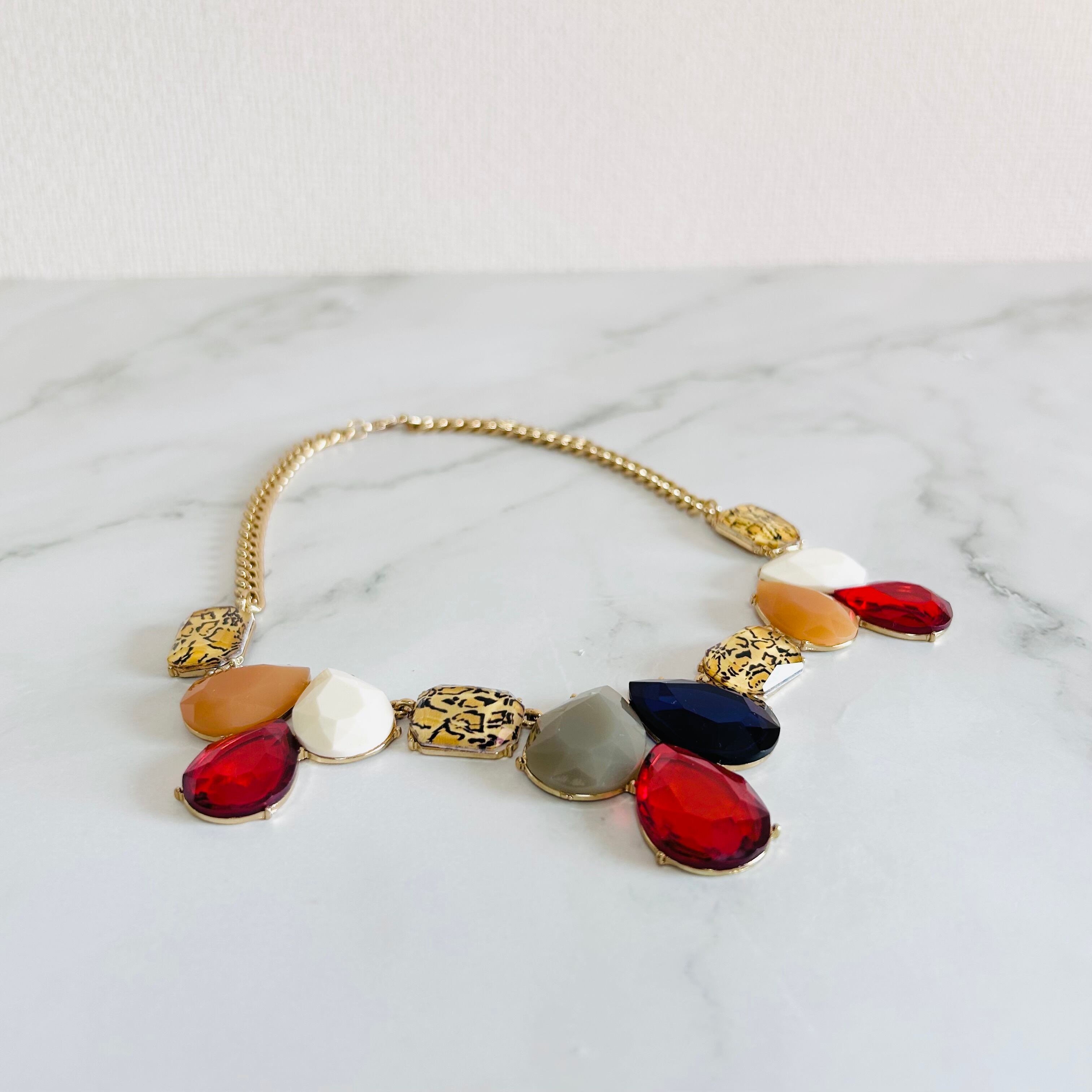 大ぶりのしずく型パーツと、レオパード調の柄のあるパーツを組み合わせた、カラフルでユニークなネックレスです。