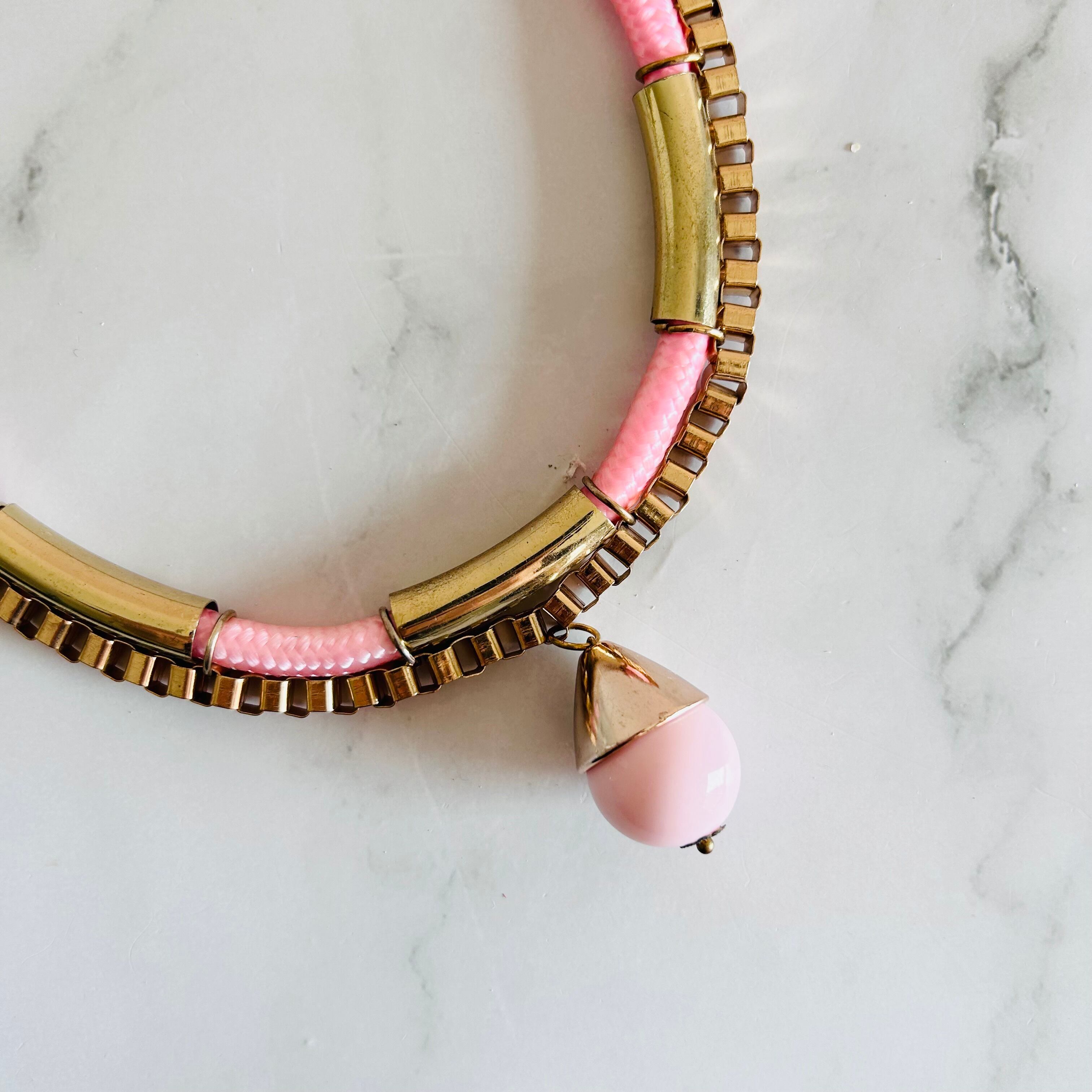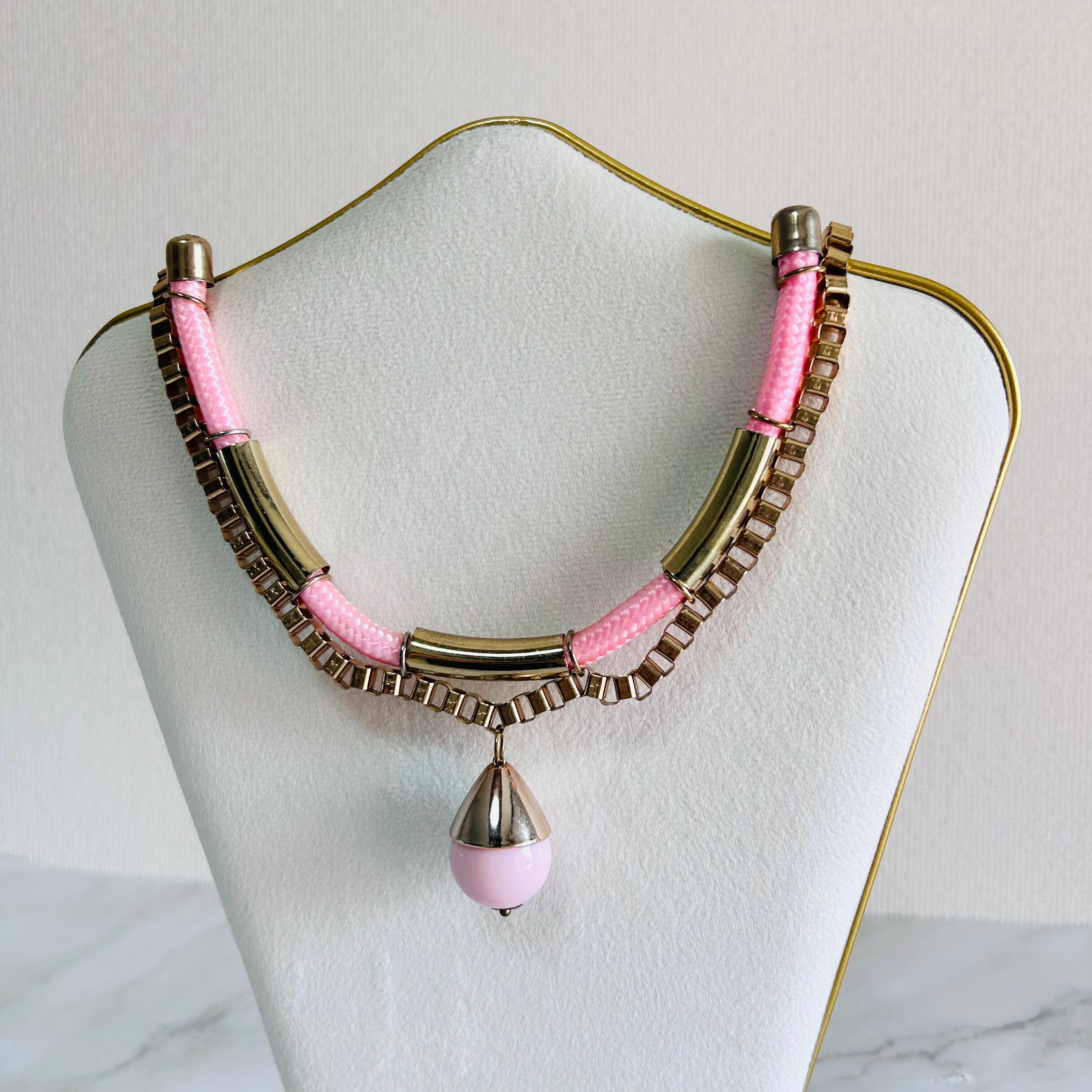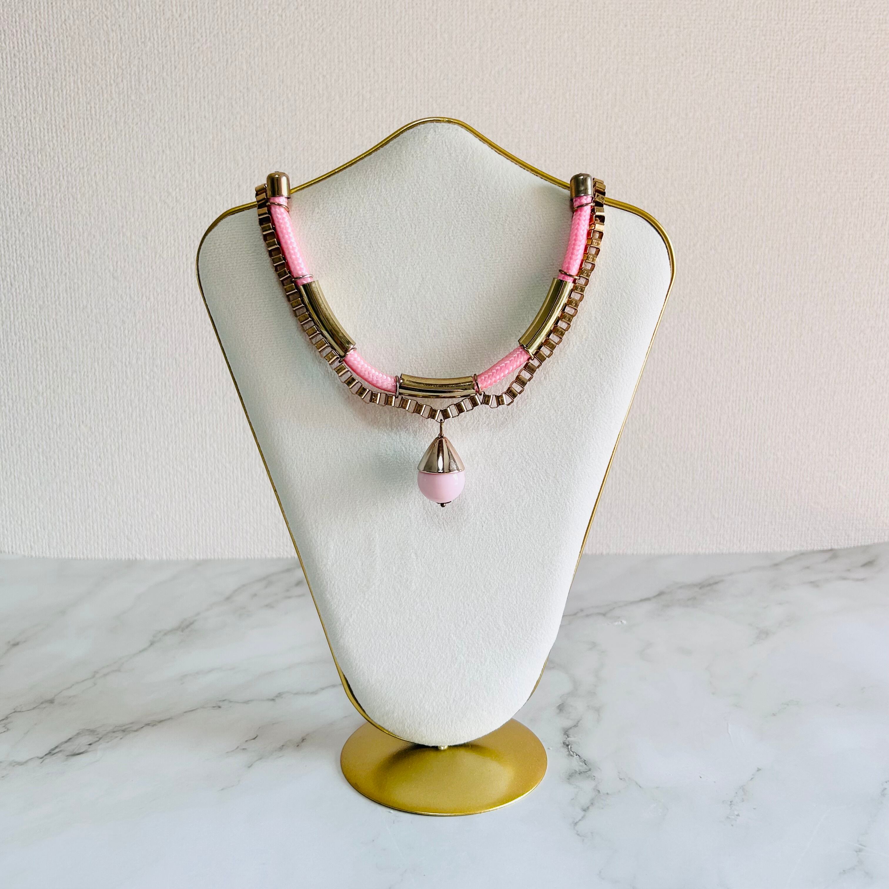 アンティークゴールドのチェーンに、つややかなピンクのコードを組み合わせトップにチャームをプラスした遊び心のあるデザイン、