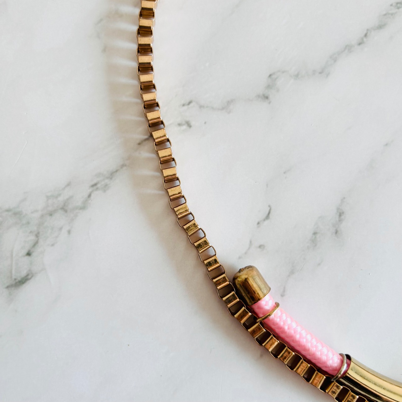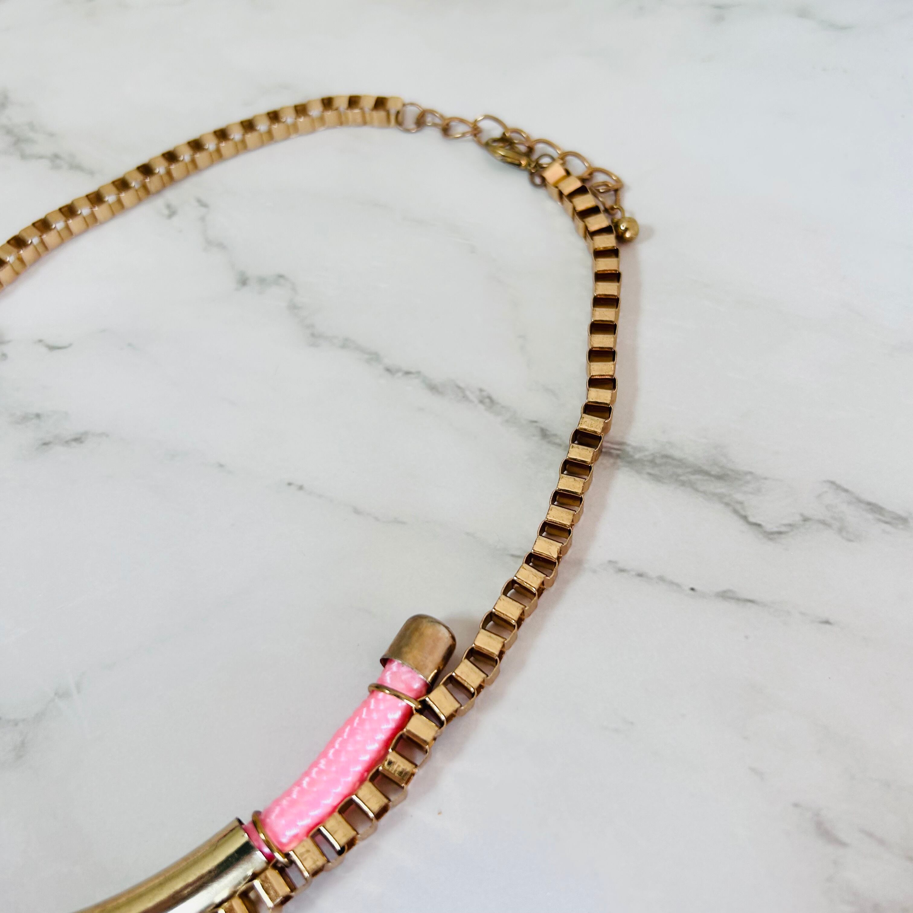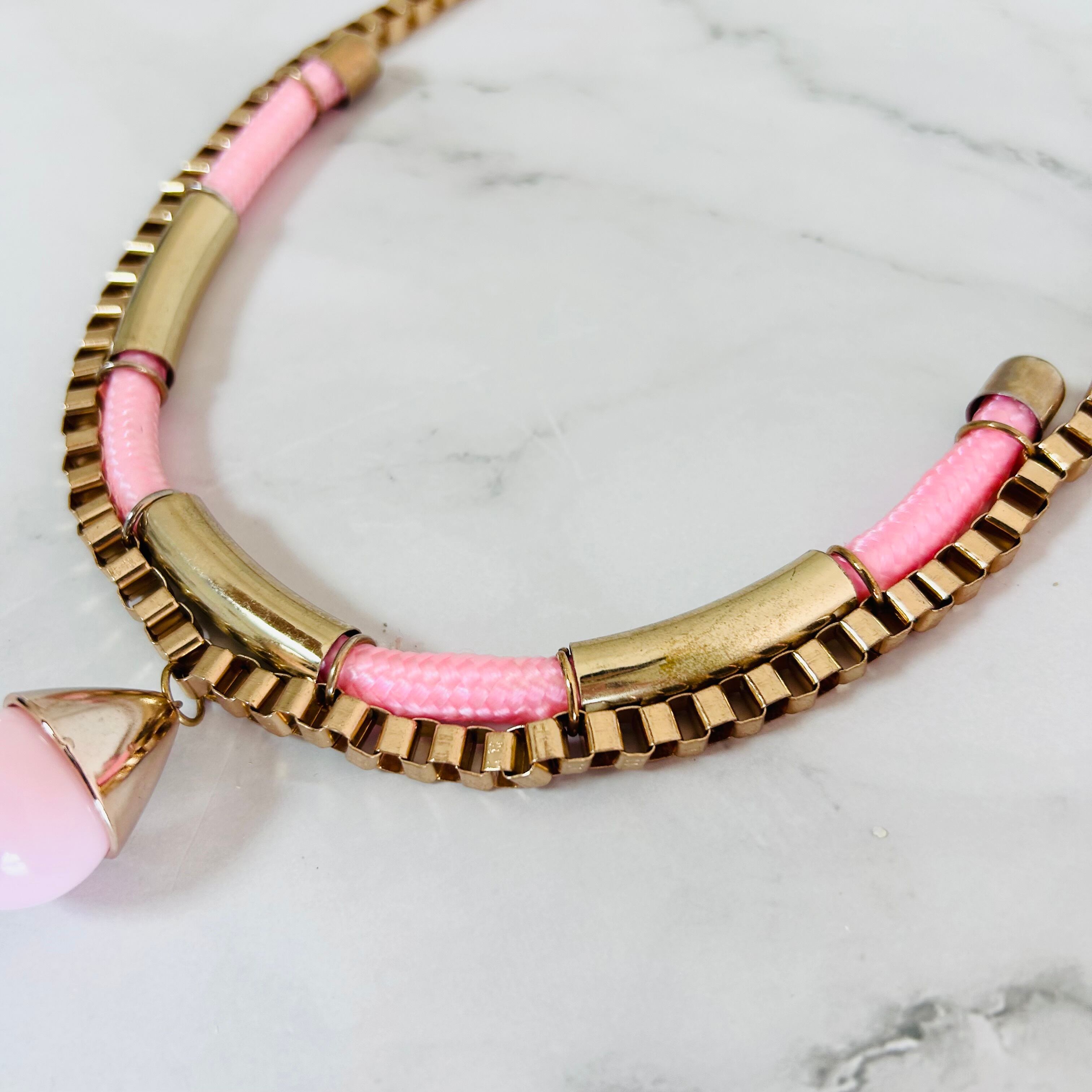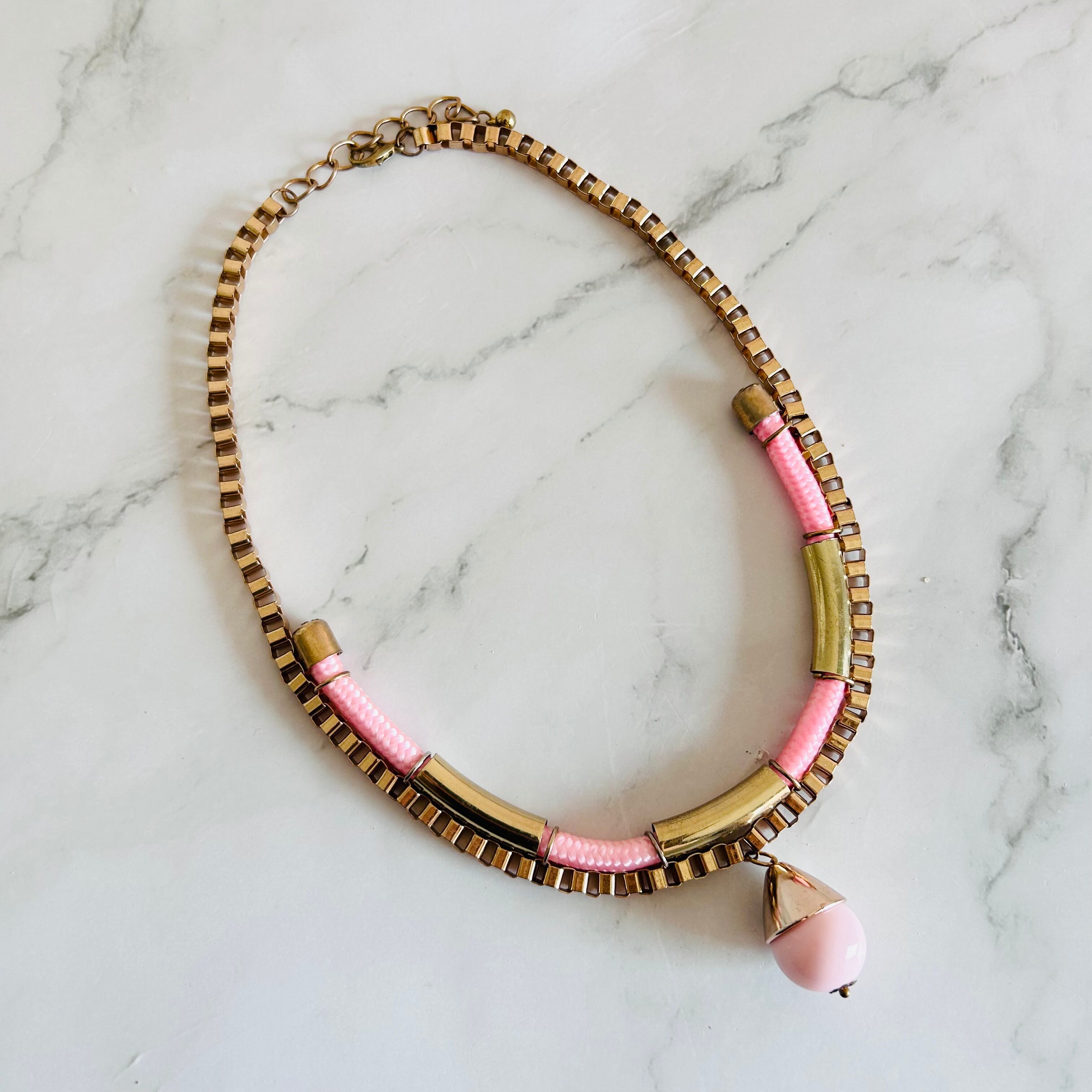 アンティークゴールドのチェーンに、つややかなピンクのコードを組み合わせトップにチャームをプラスした遊び心のあるデザイン、