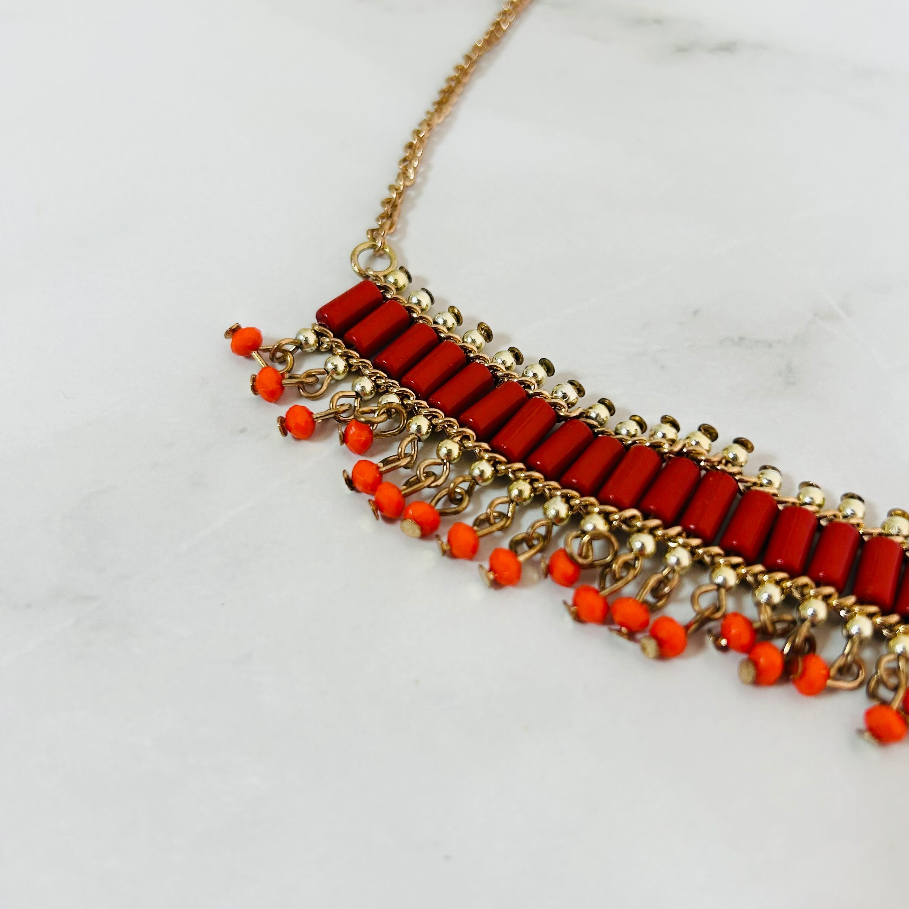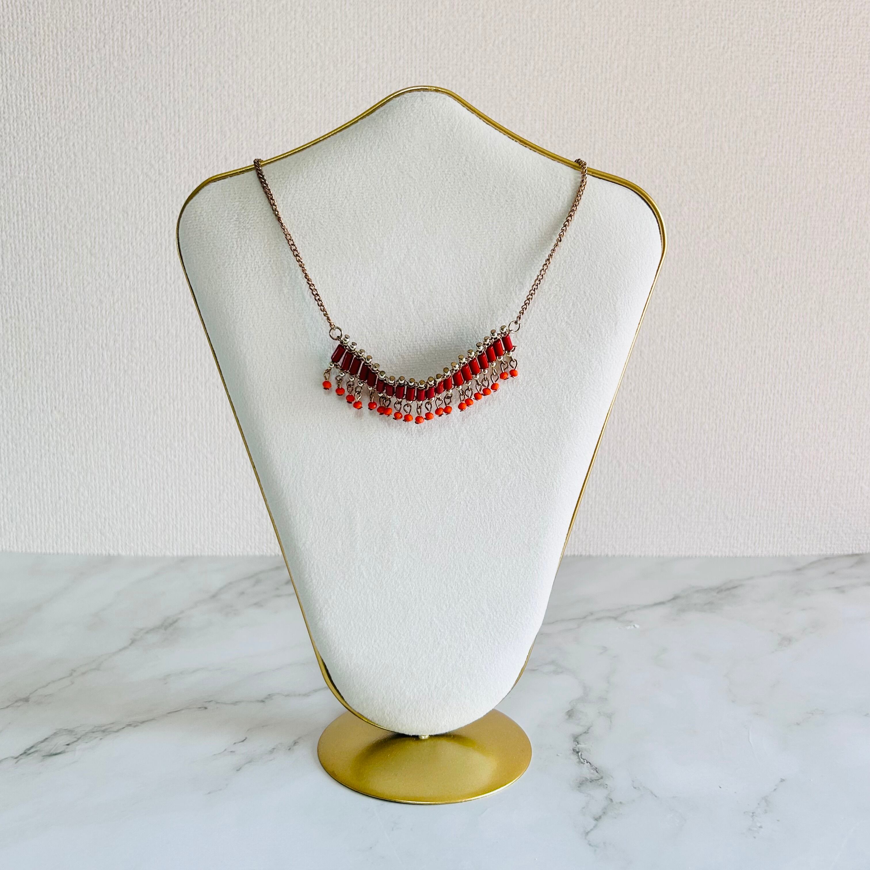 鮮やかな赤とオレンジのパーツがリズムよく並び、細やかに揺れるビーズが表情を添える、夏にぴったりのネックレスです。