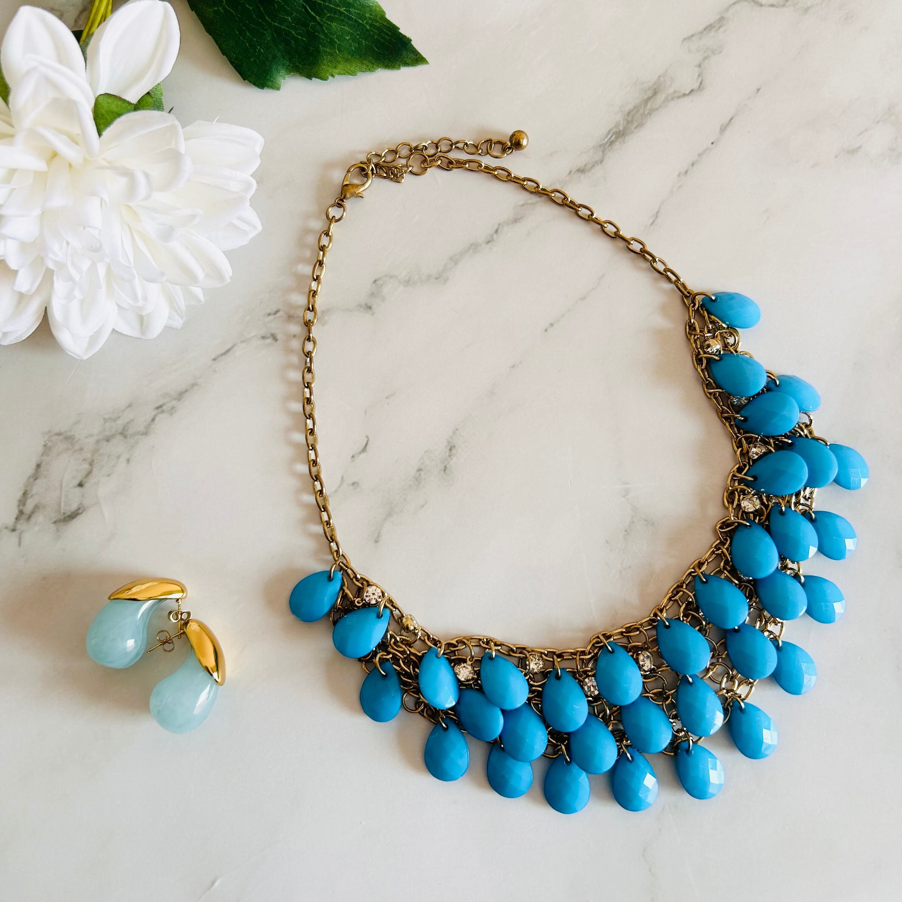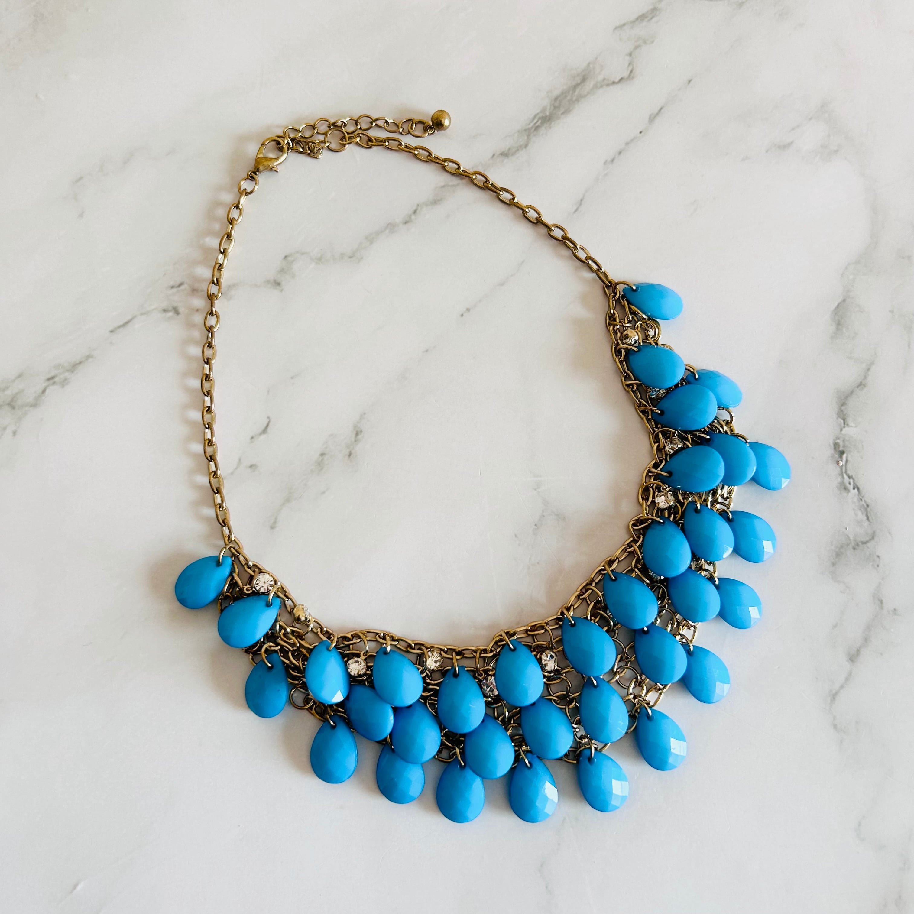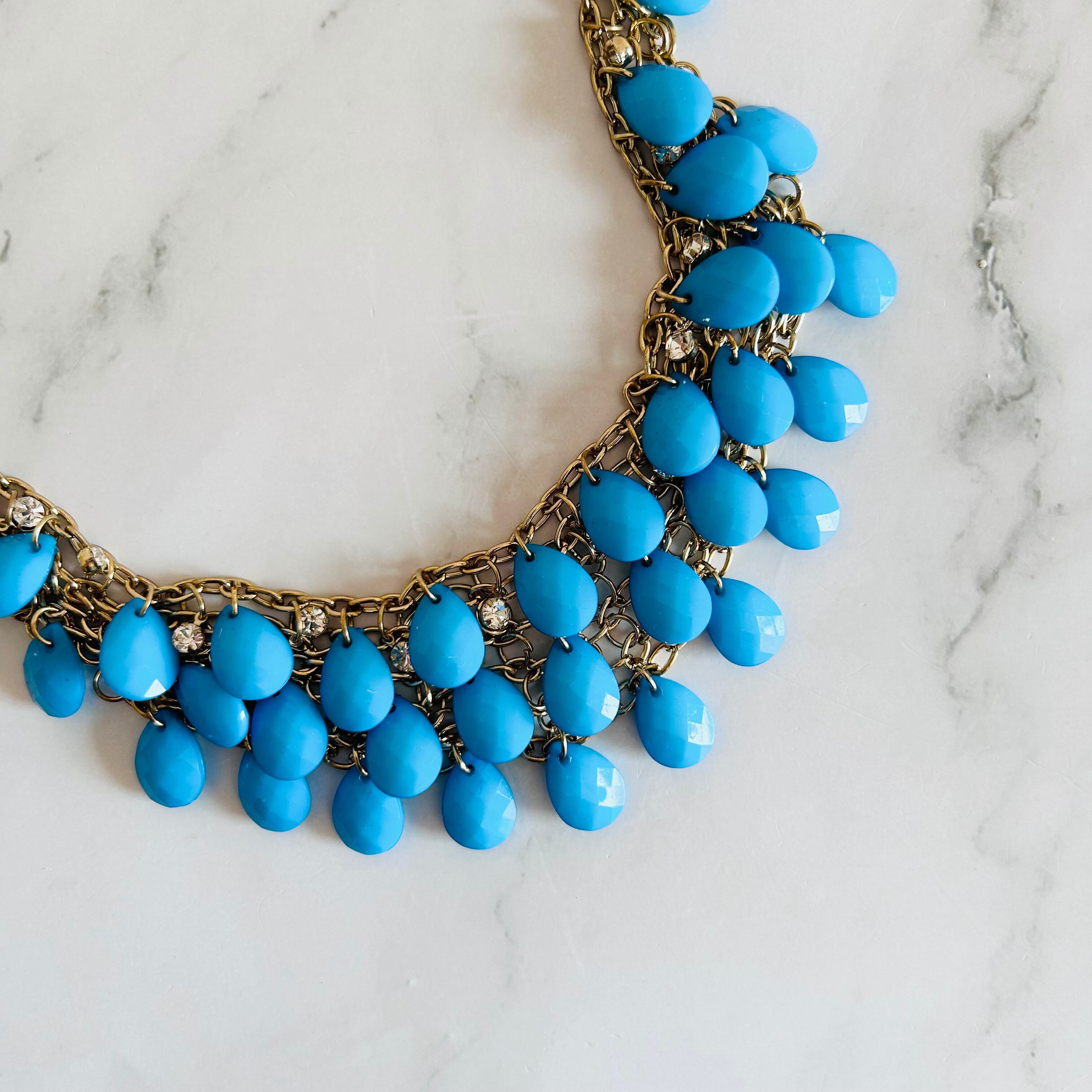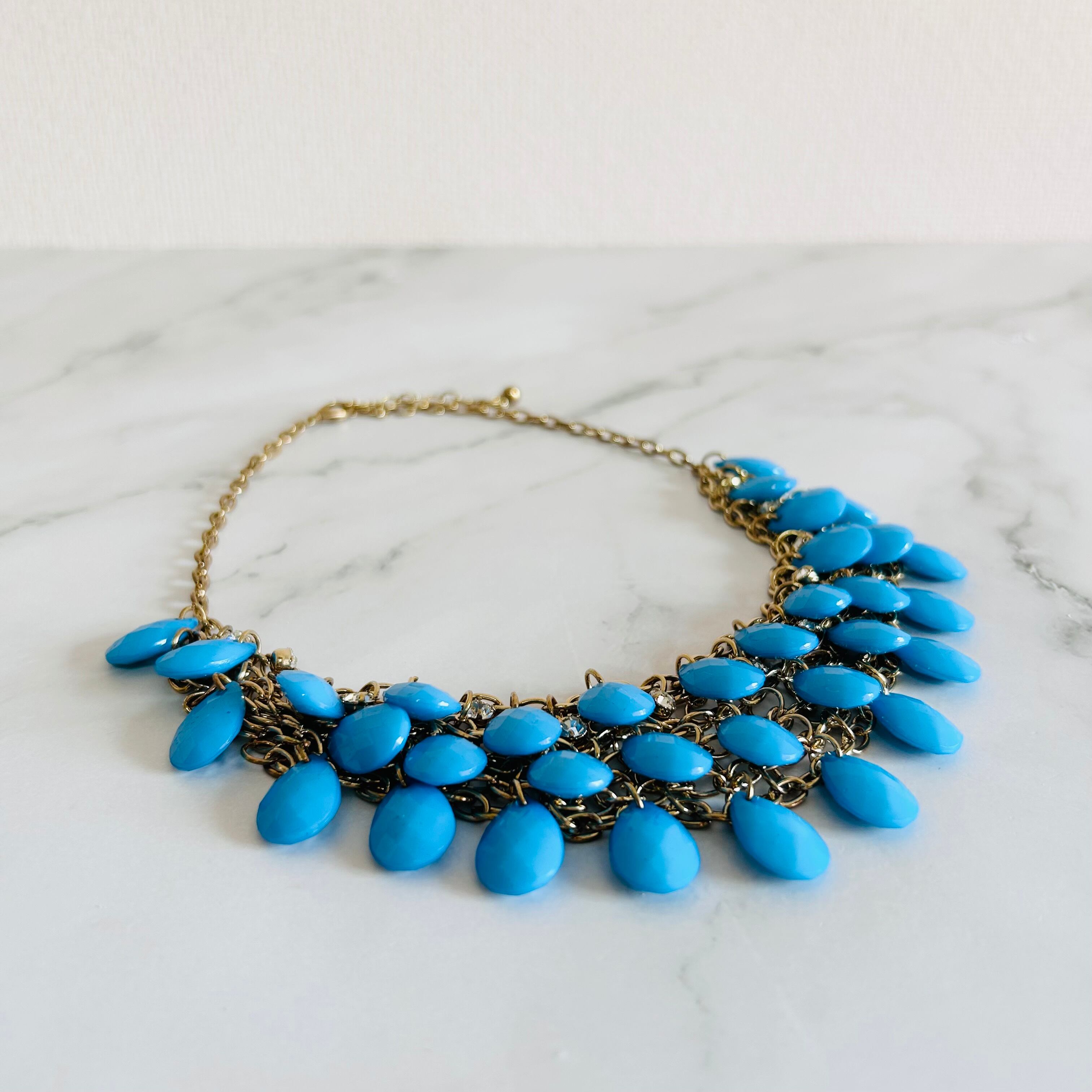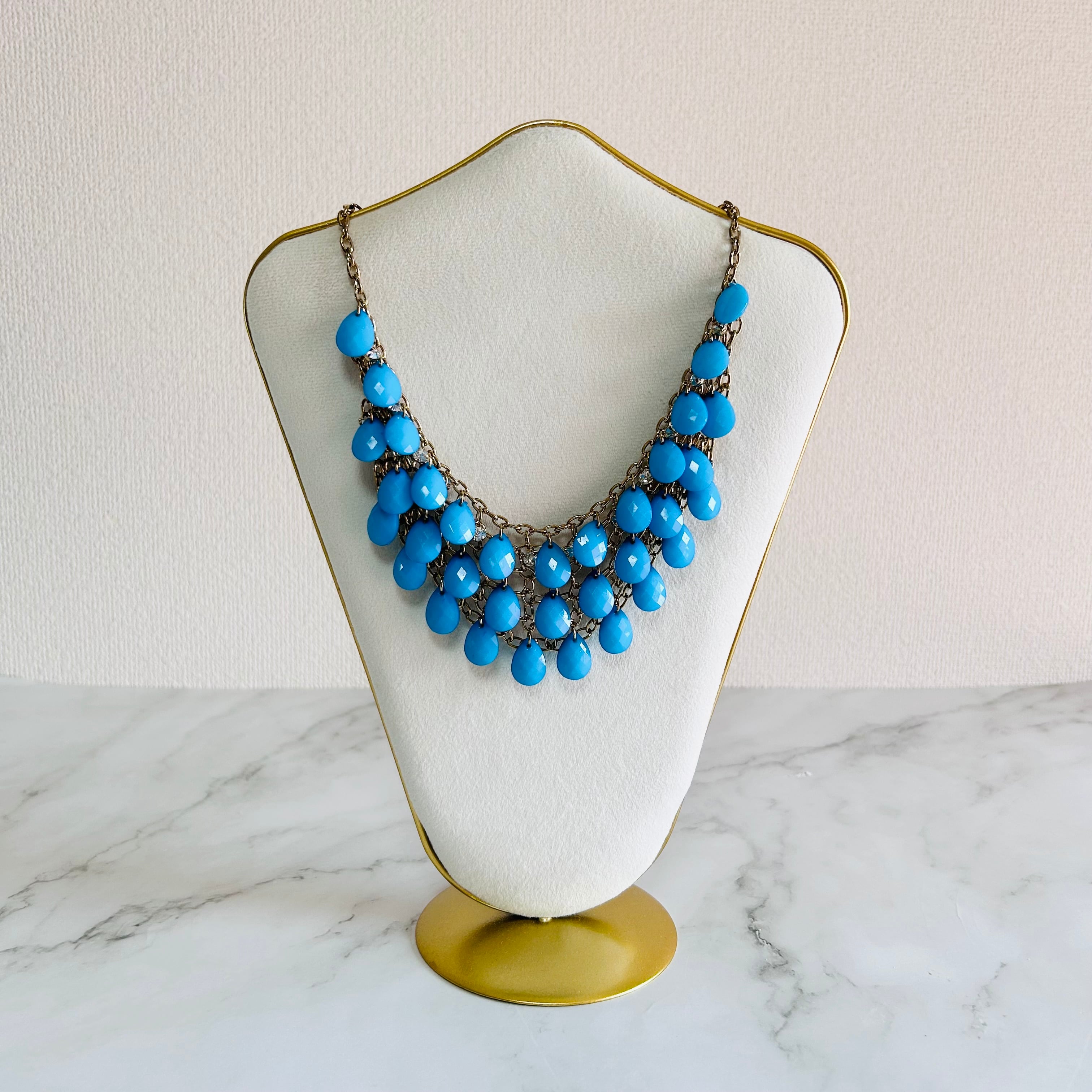 鮮やかなブルーのドロップビーズが贅沢に並んだ、ボリューム感たっぷりのサマーネックレスです。