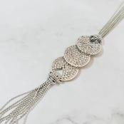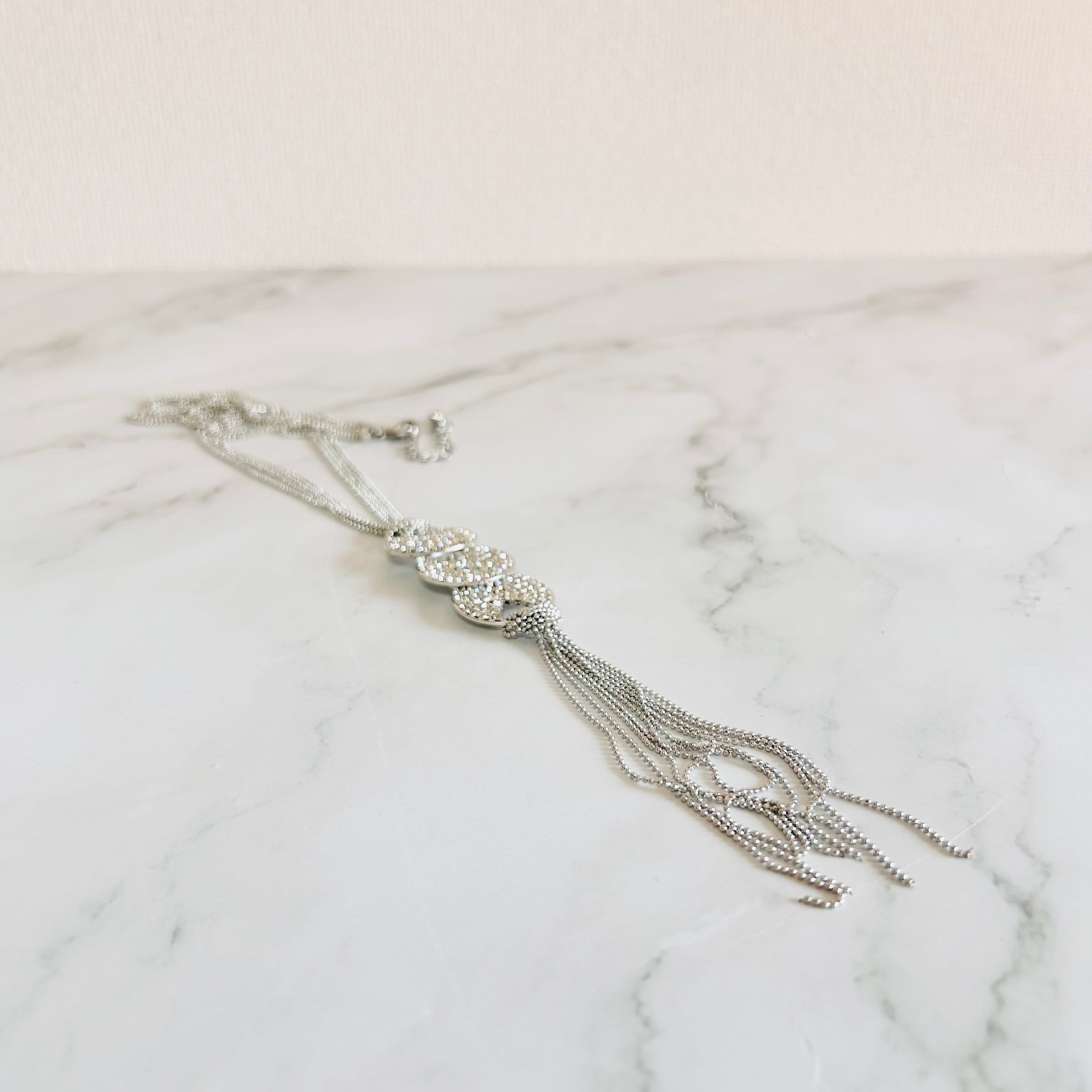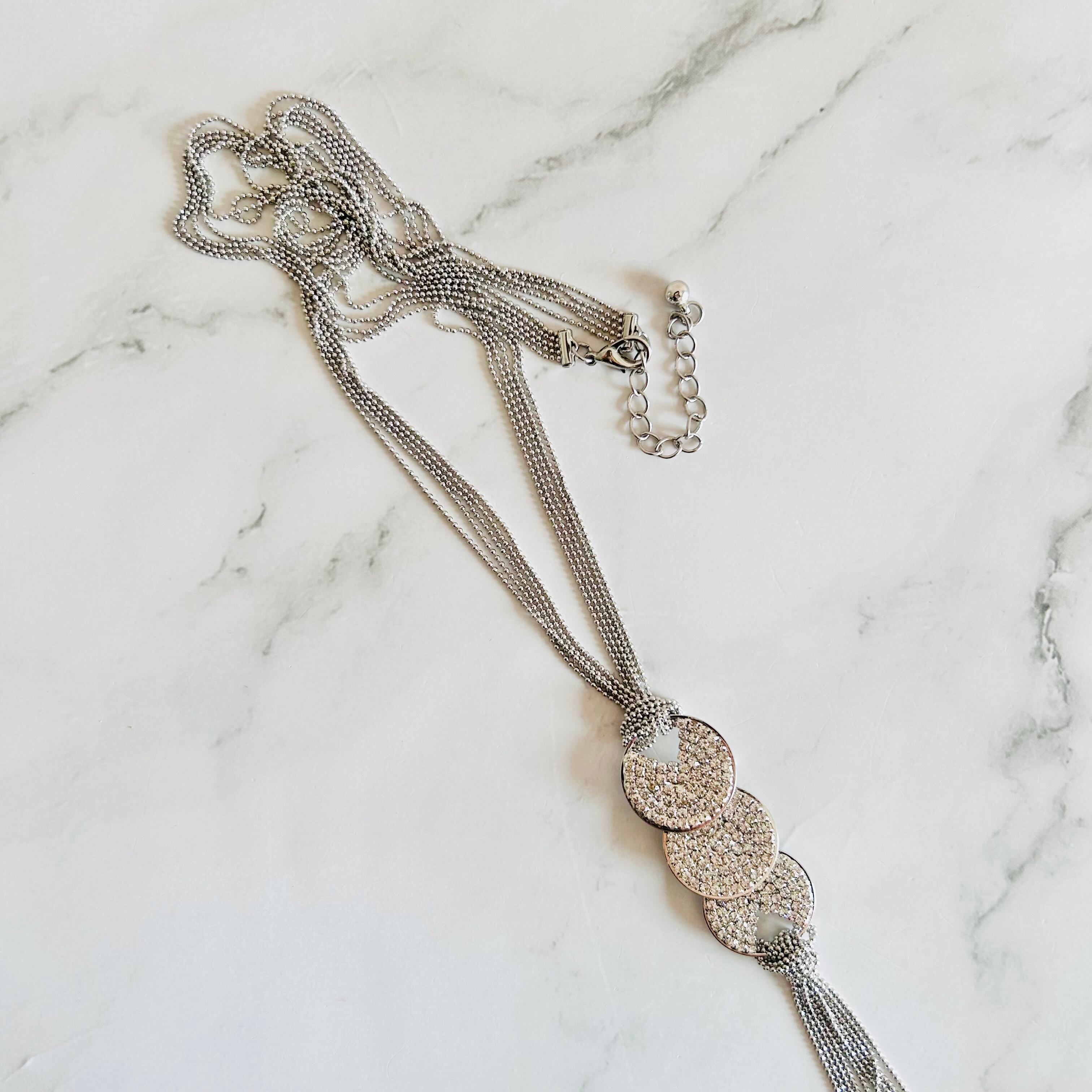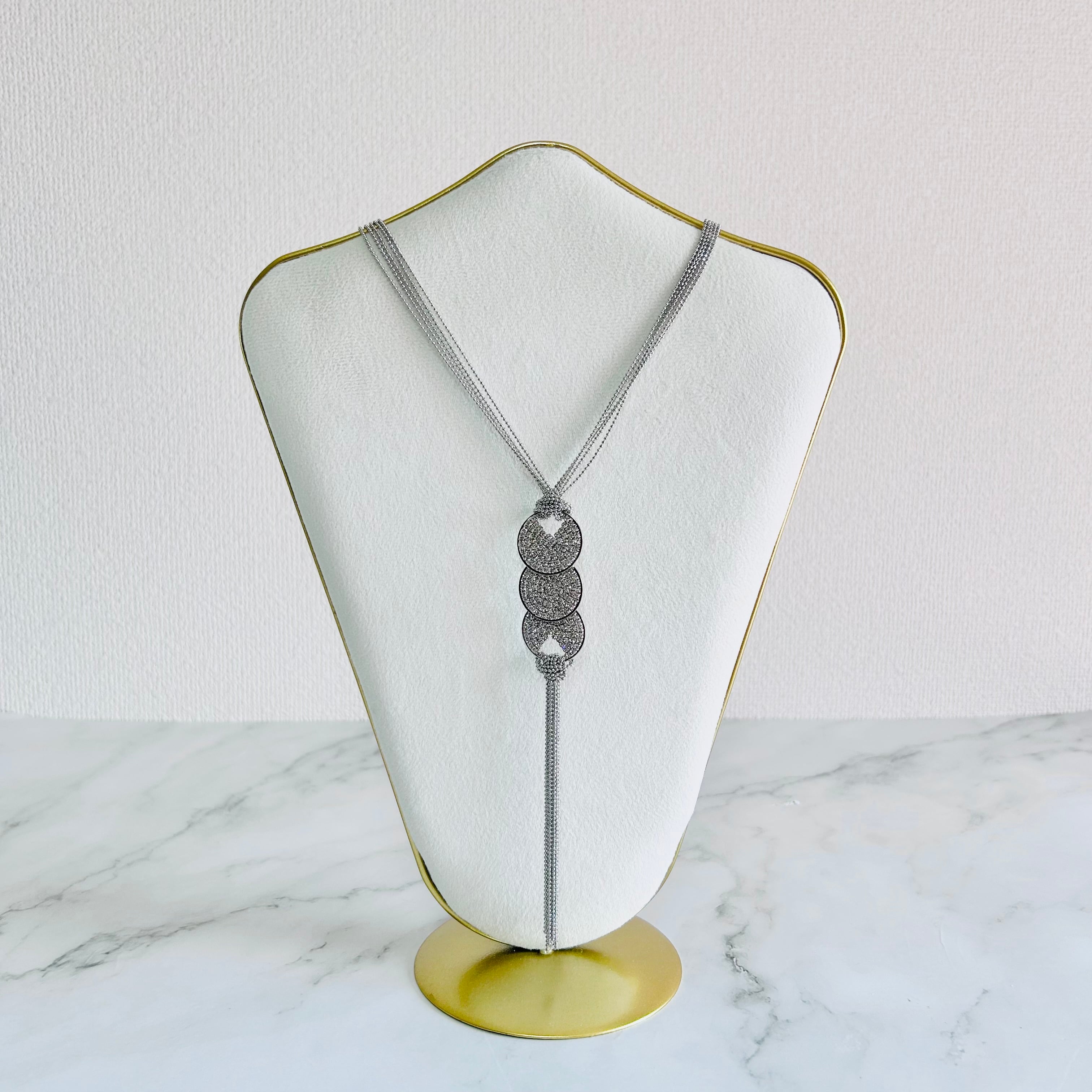 3つのラウンドモチーフに繊細なラインストーンを敷きつめ、軽やかに揺れる多連チェーンと組み合わせた、スタイリッシュなネックレスです。