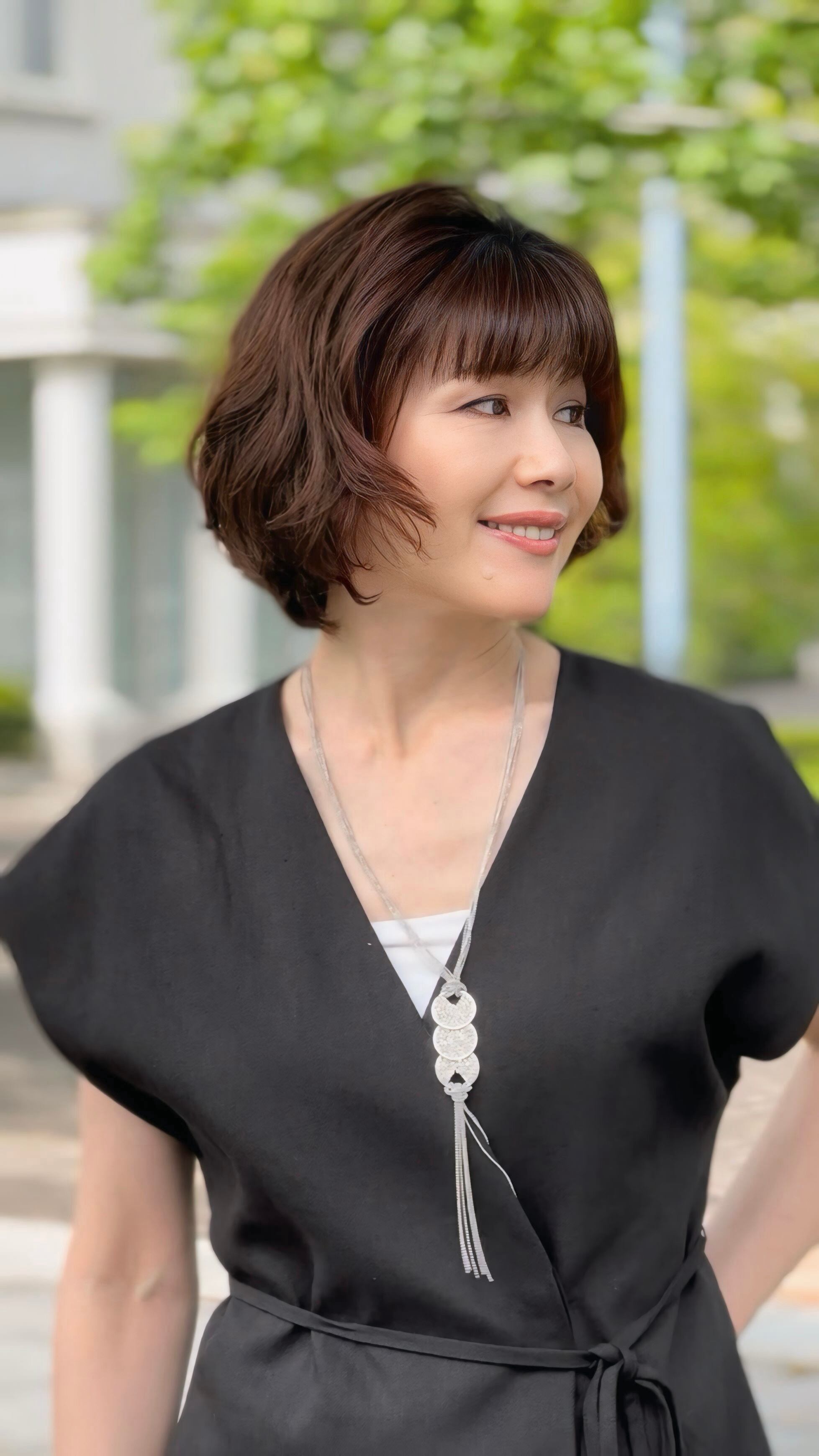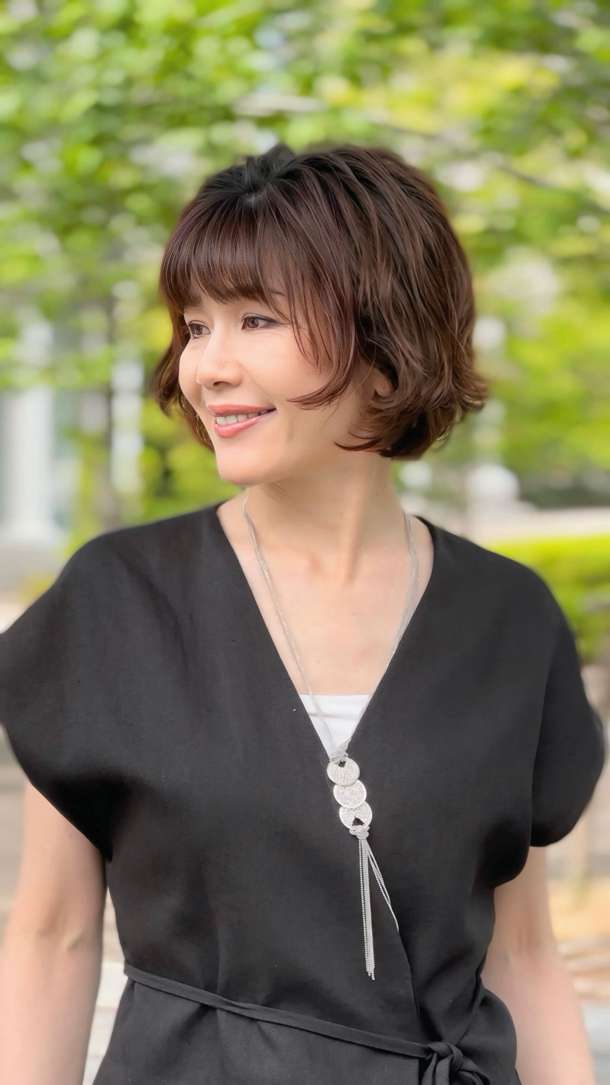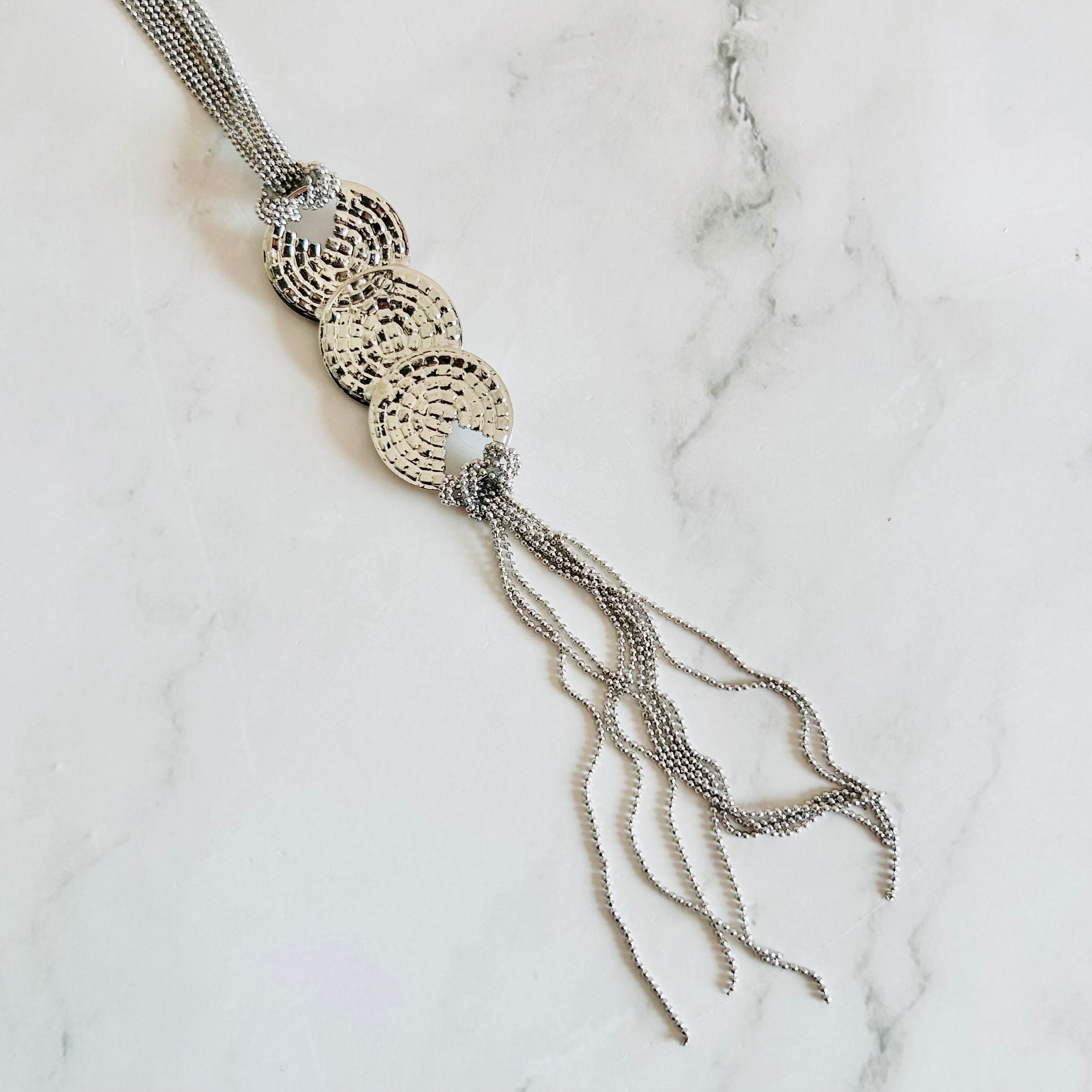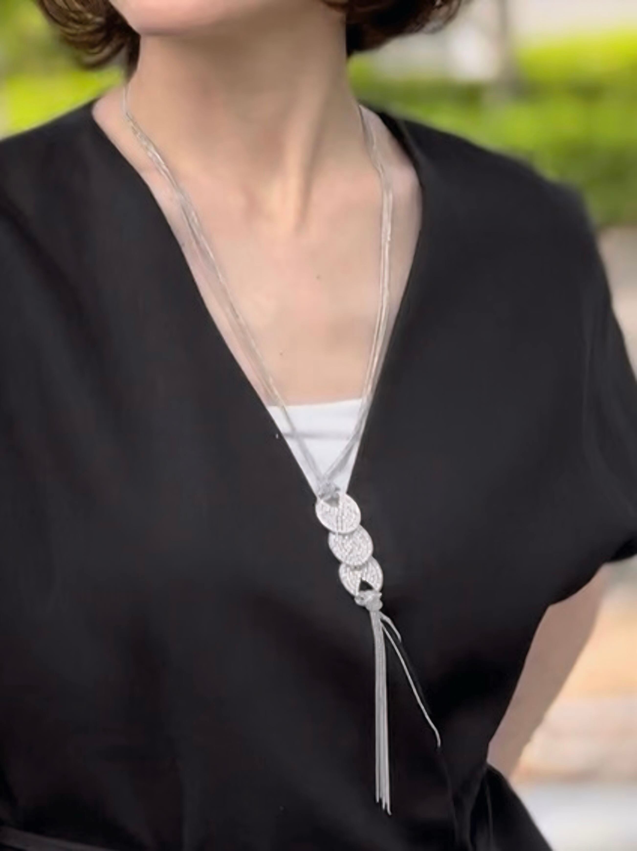 カジュアルにもフォーマルにも映える、軽やかさと華やかさを両立したロングネックレスです。