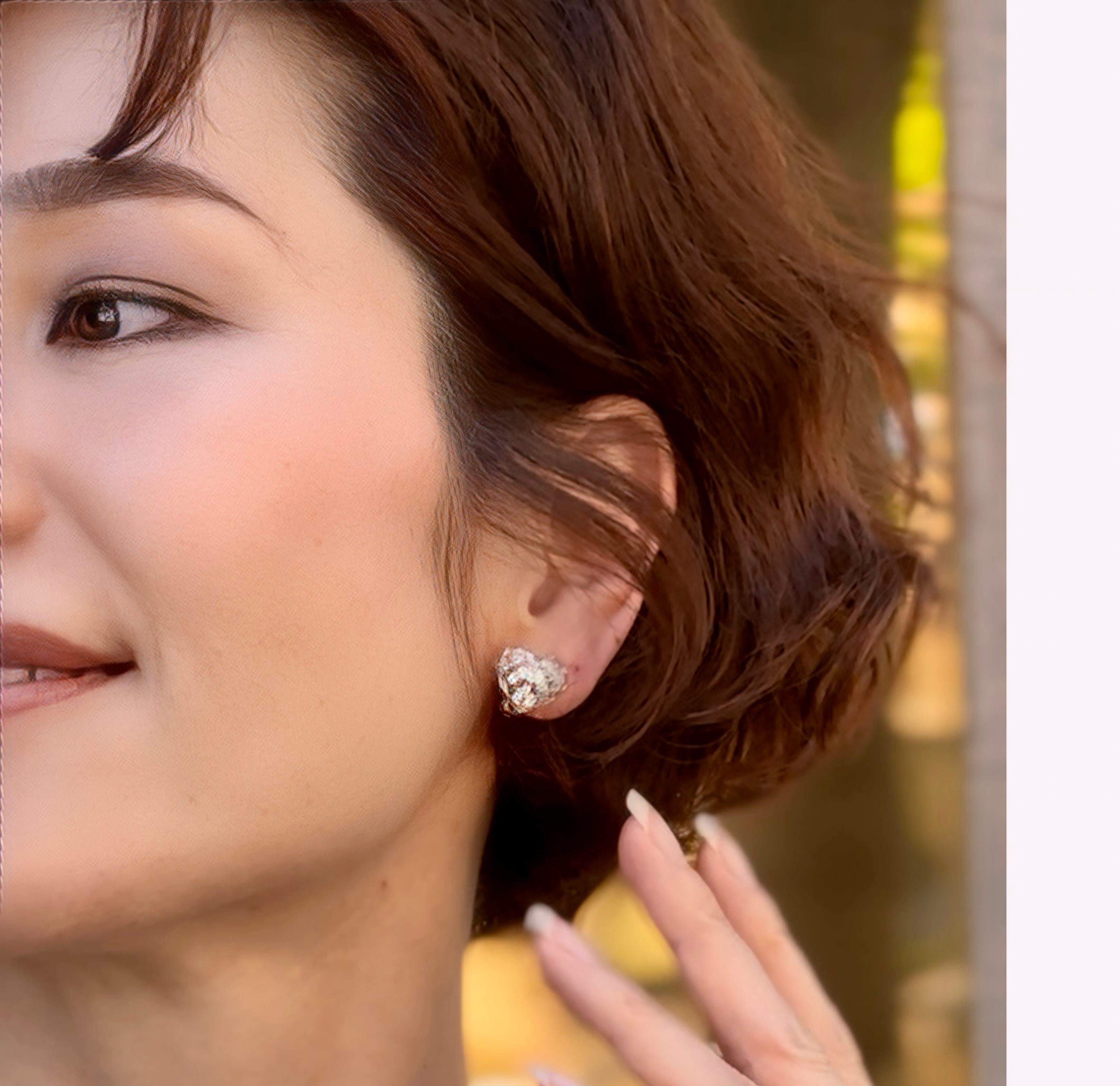 小さなジルコニアがまるで氷の結晶のように立体的に組み合わさり、角度によってさまざまな輝きを生み出します。