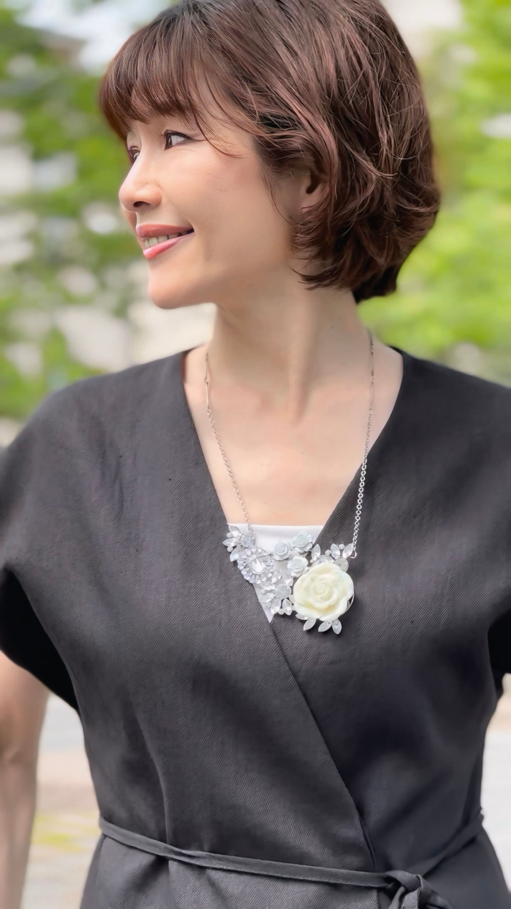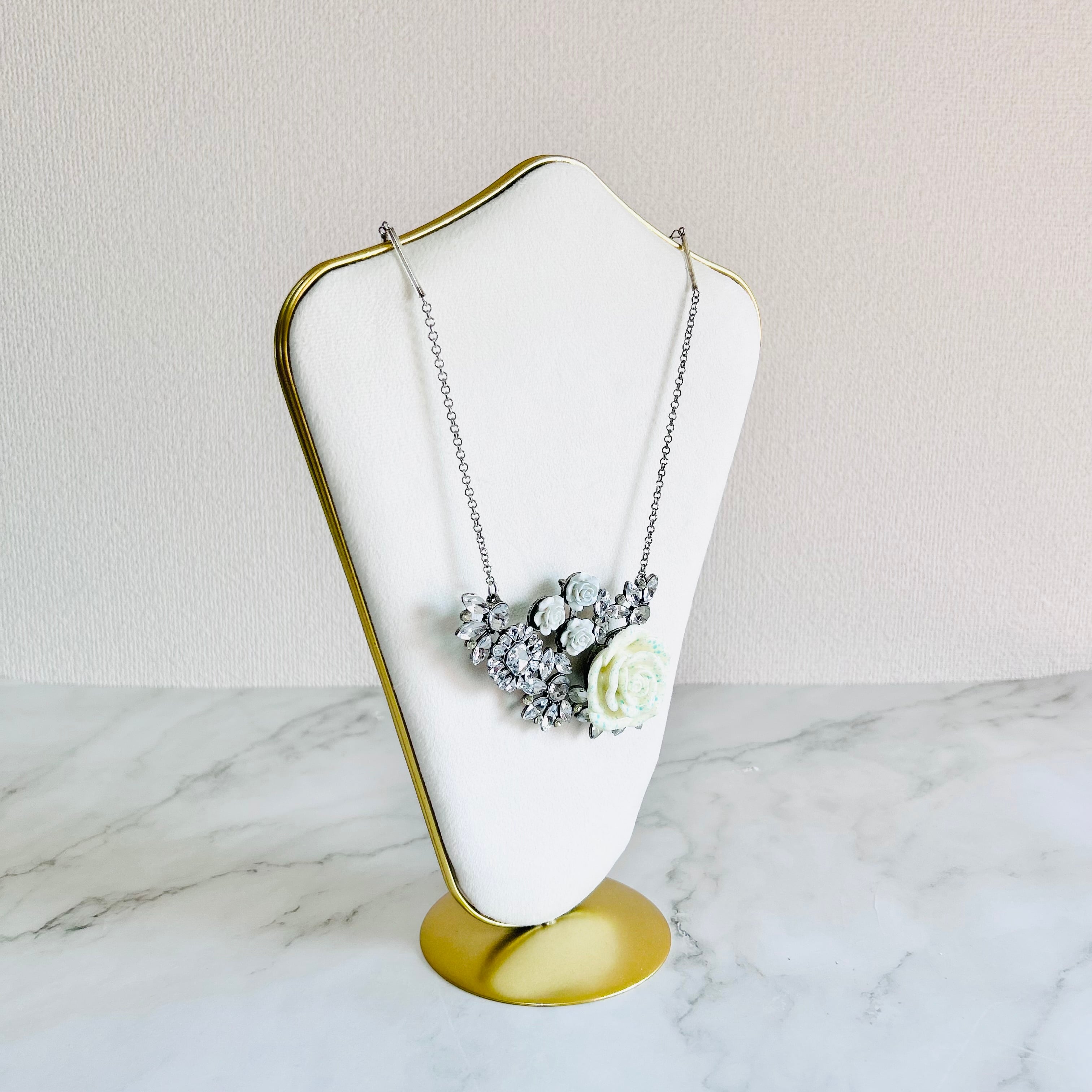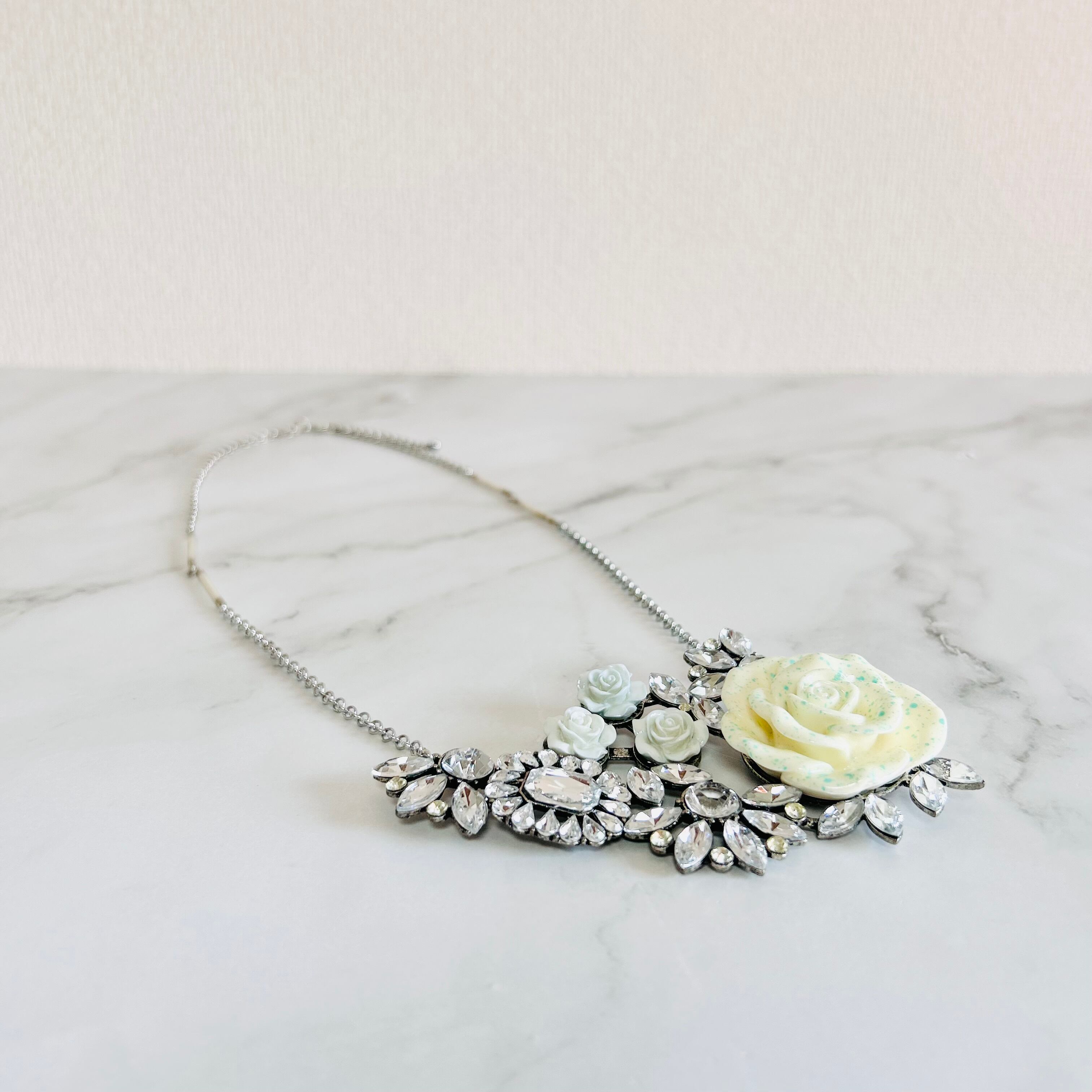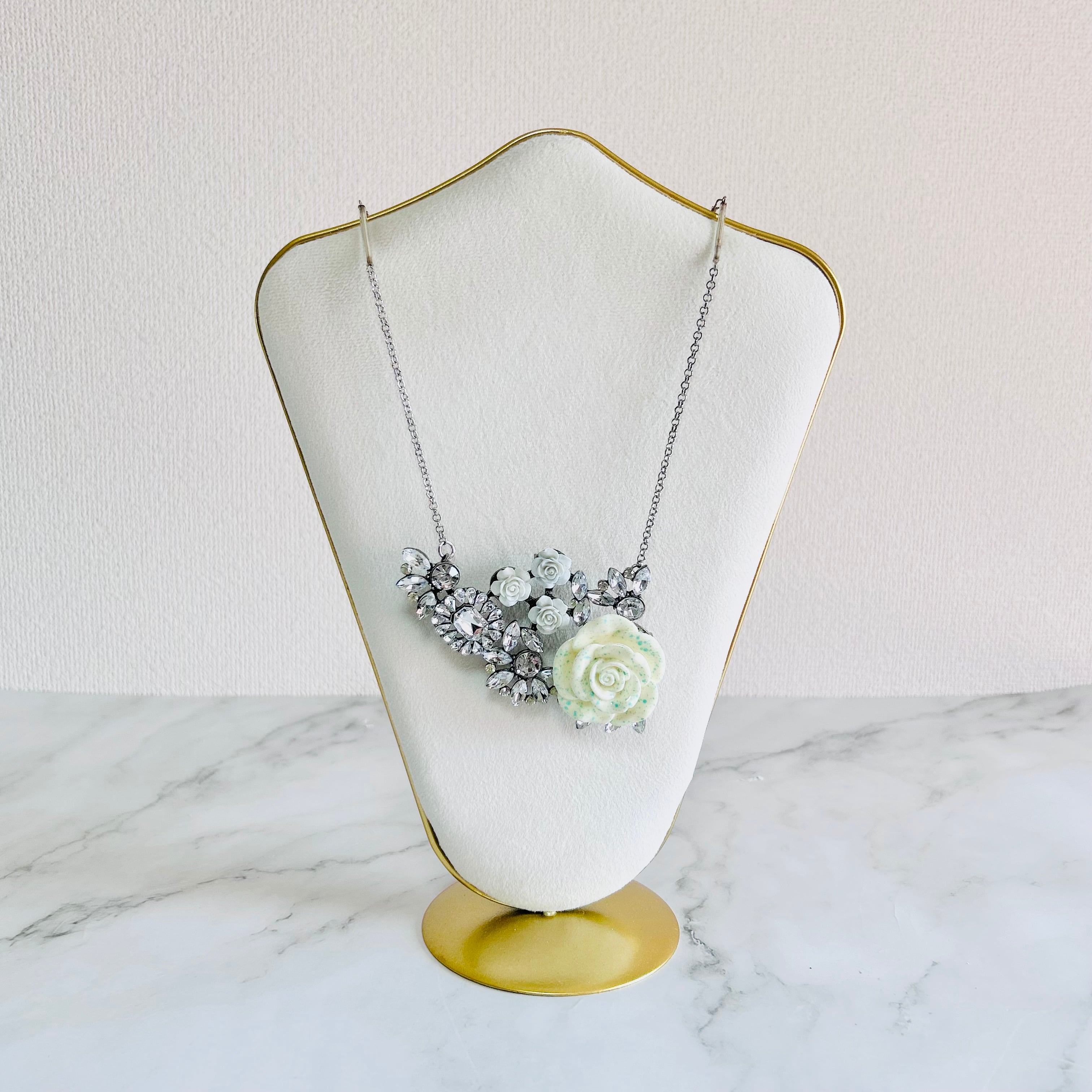 まるでお花を集めたブーケのように、白と淡いグリーンのローズモチーフにビジューを添えた華やかなネックレスです。