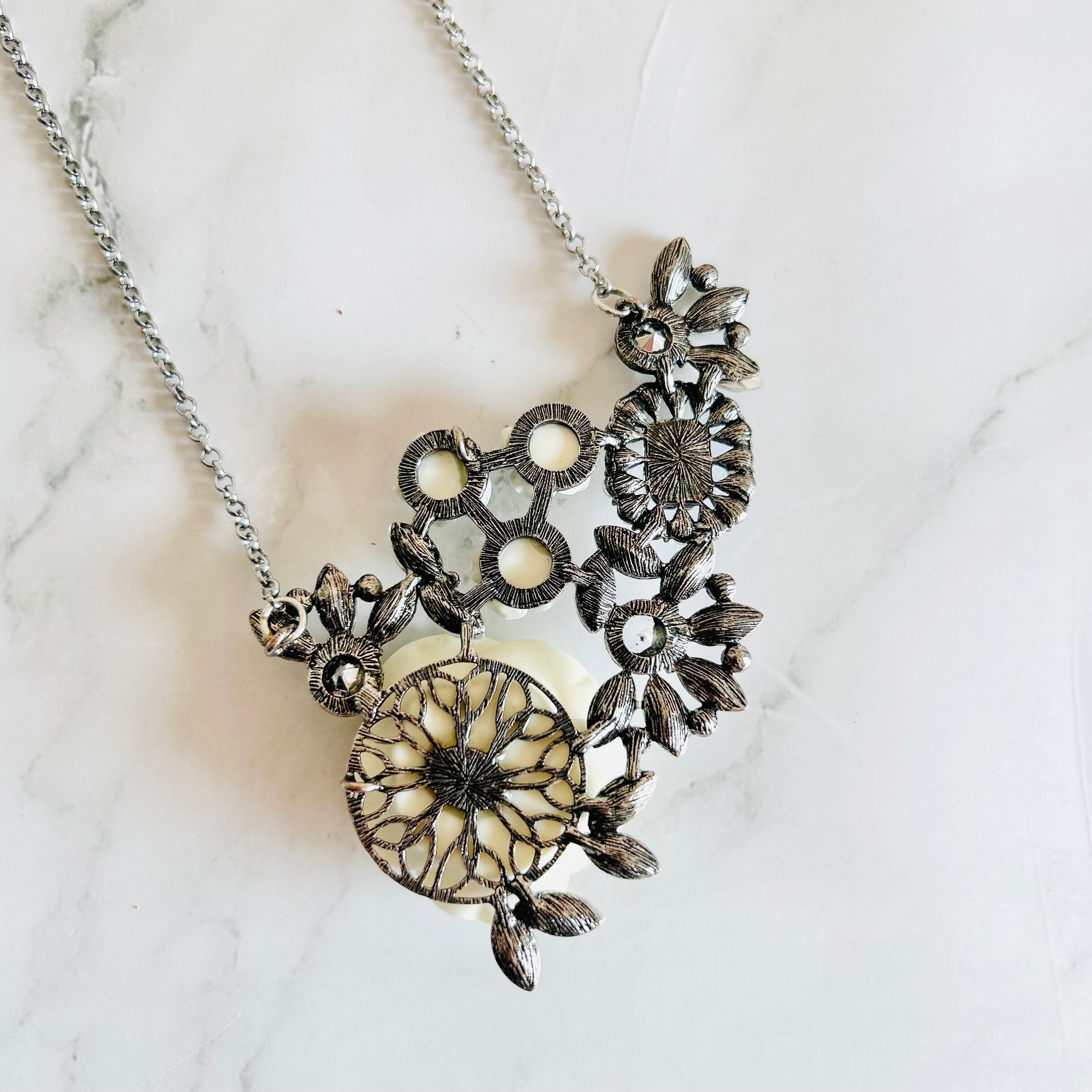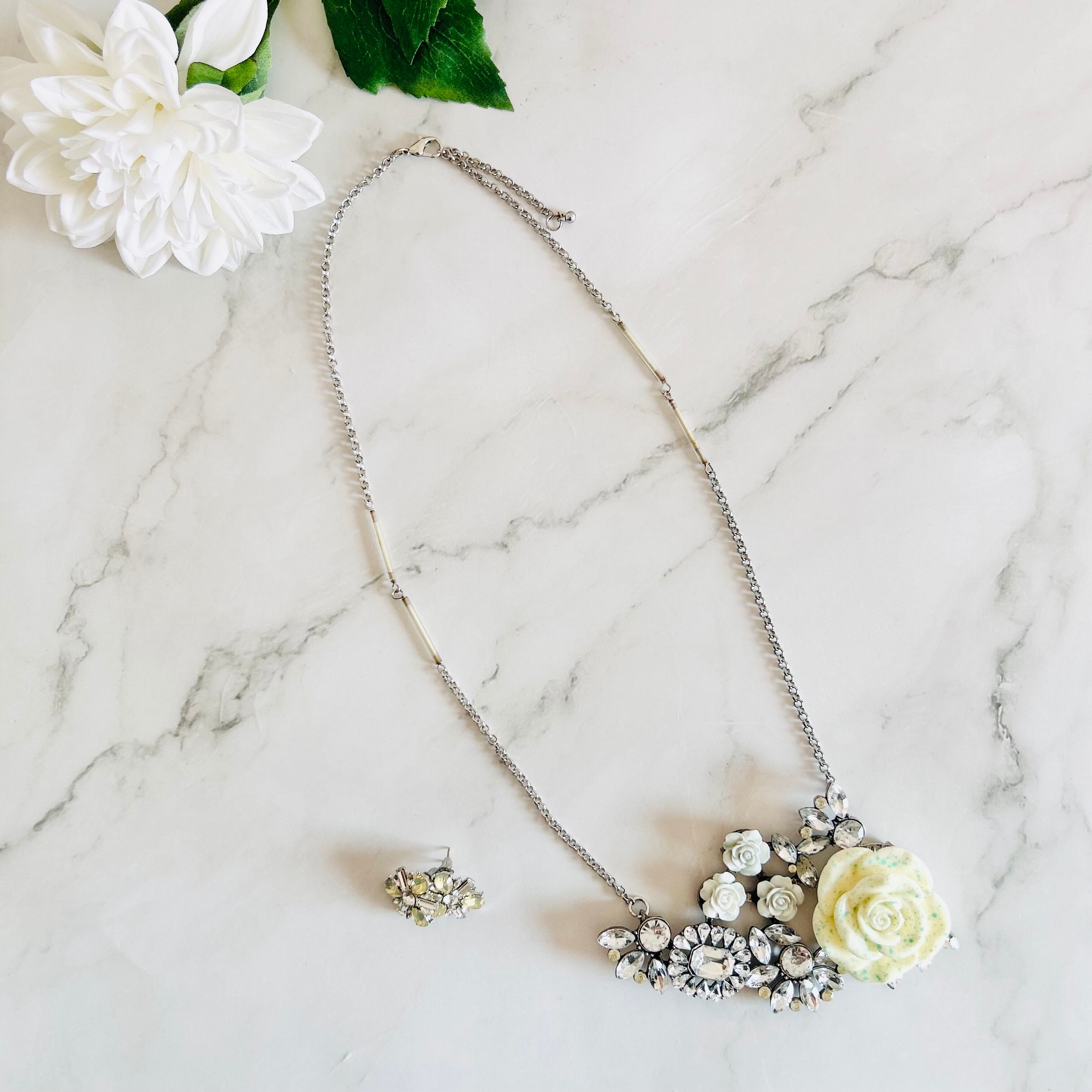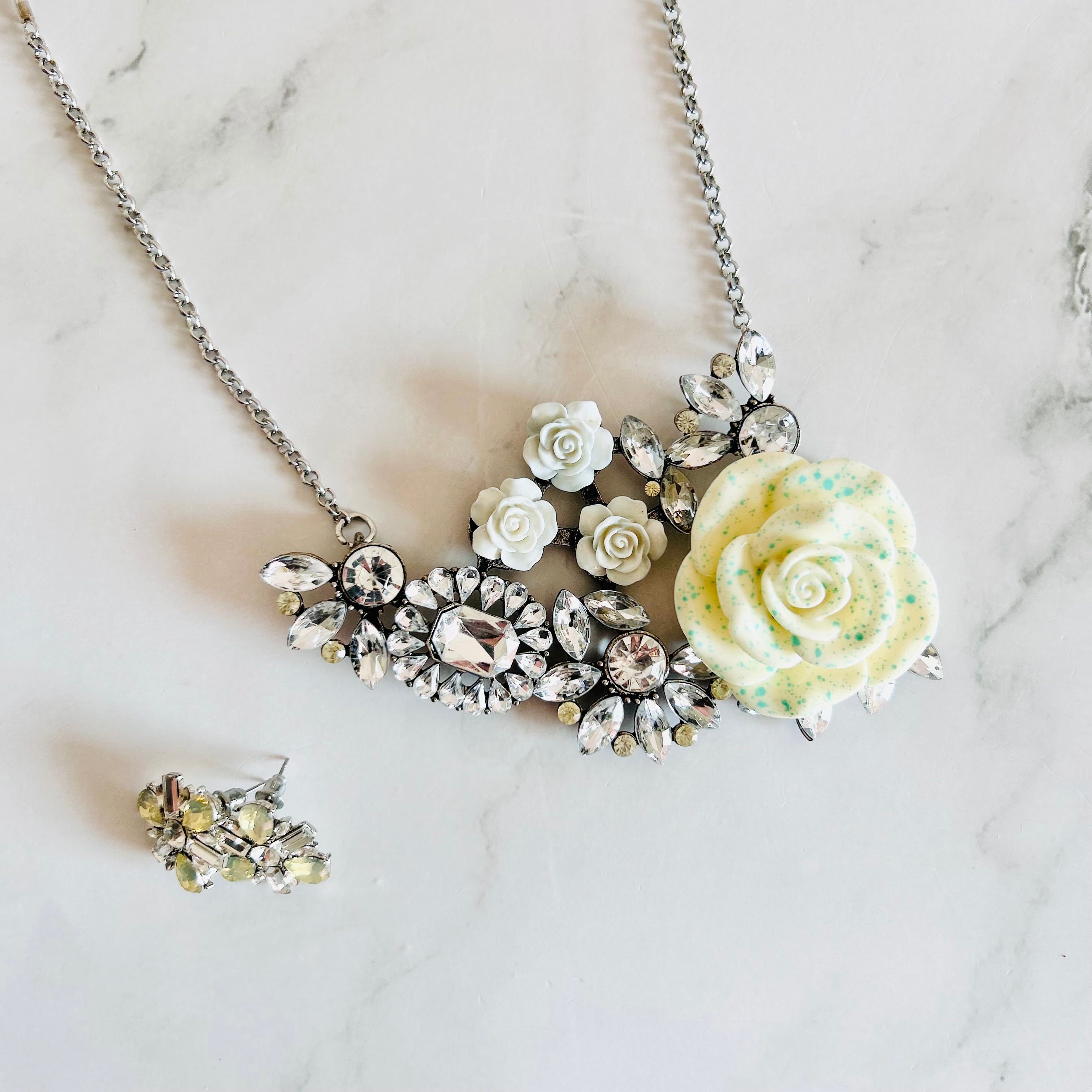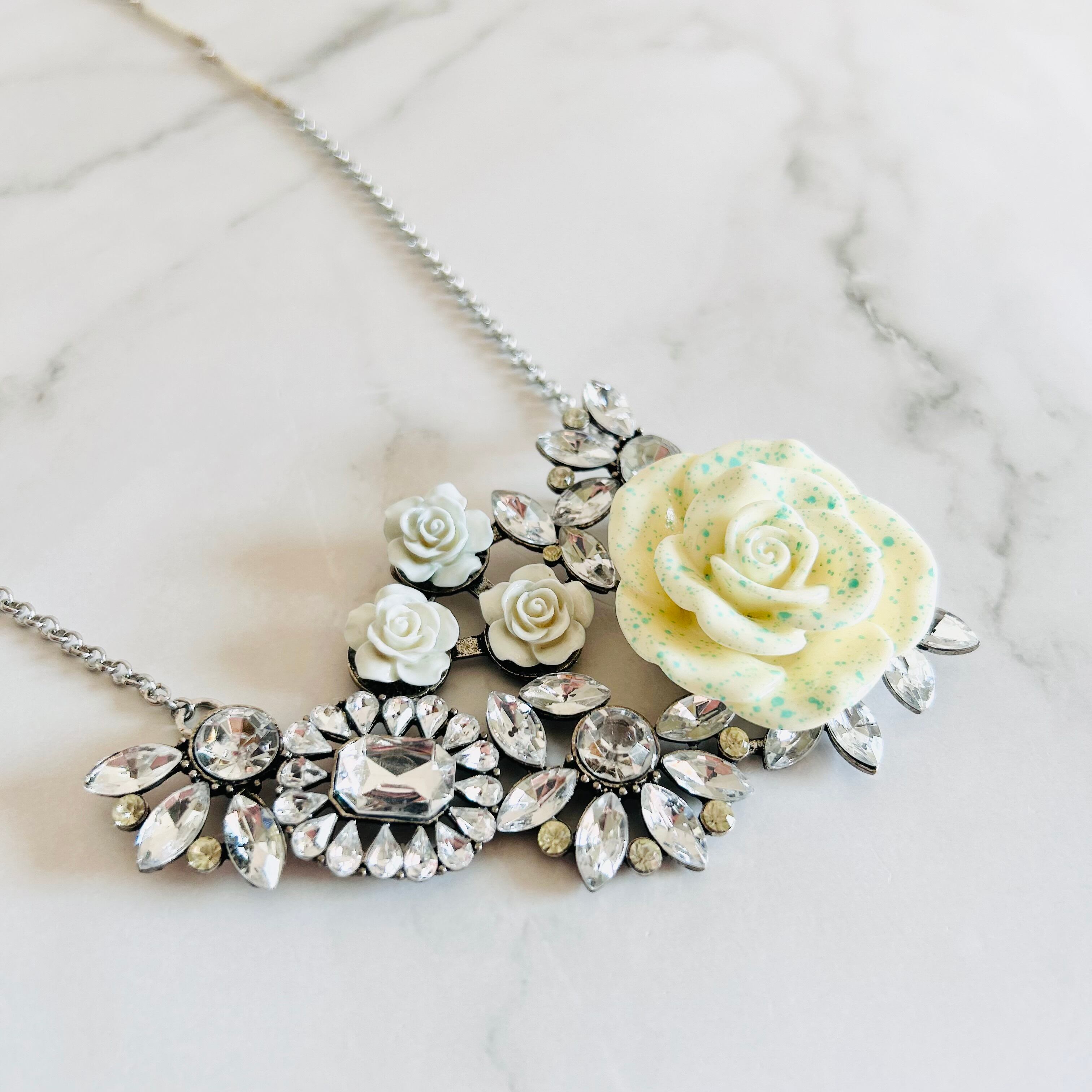 まるでお花を集めたブーケのように、白と淡いグリーンのローズモチーフにビジューを添えた華やかなネックレスです。