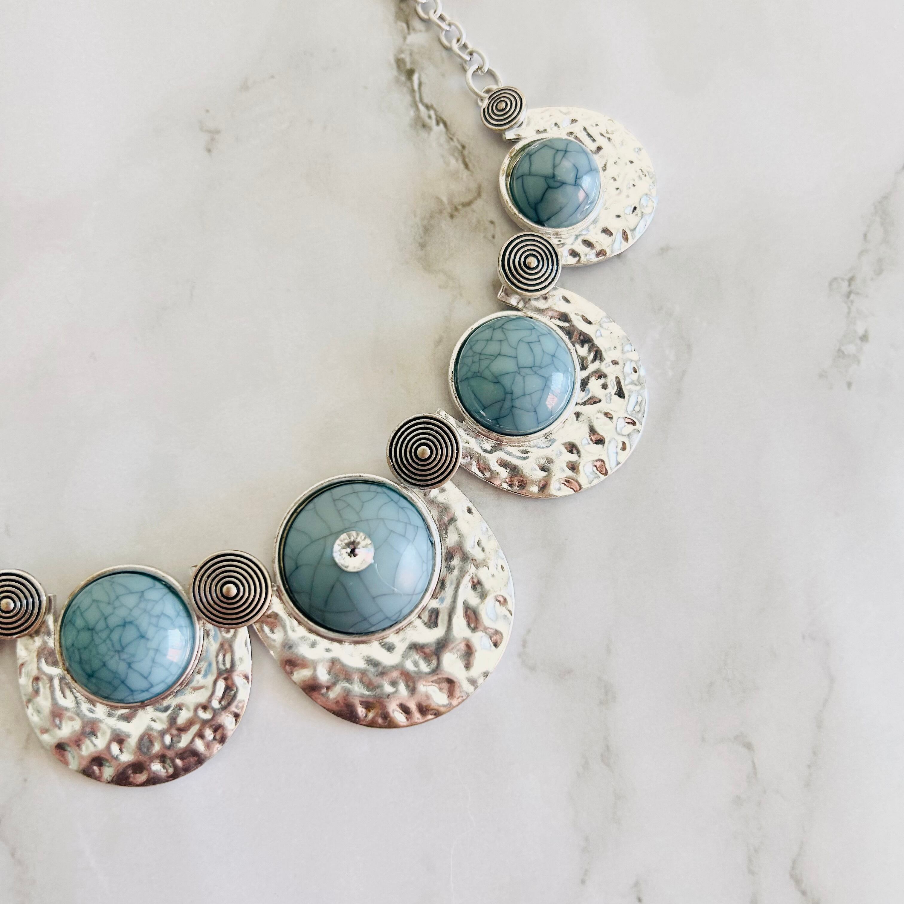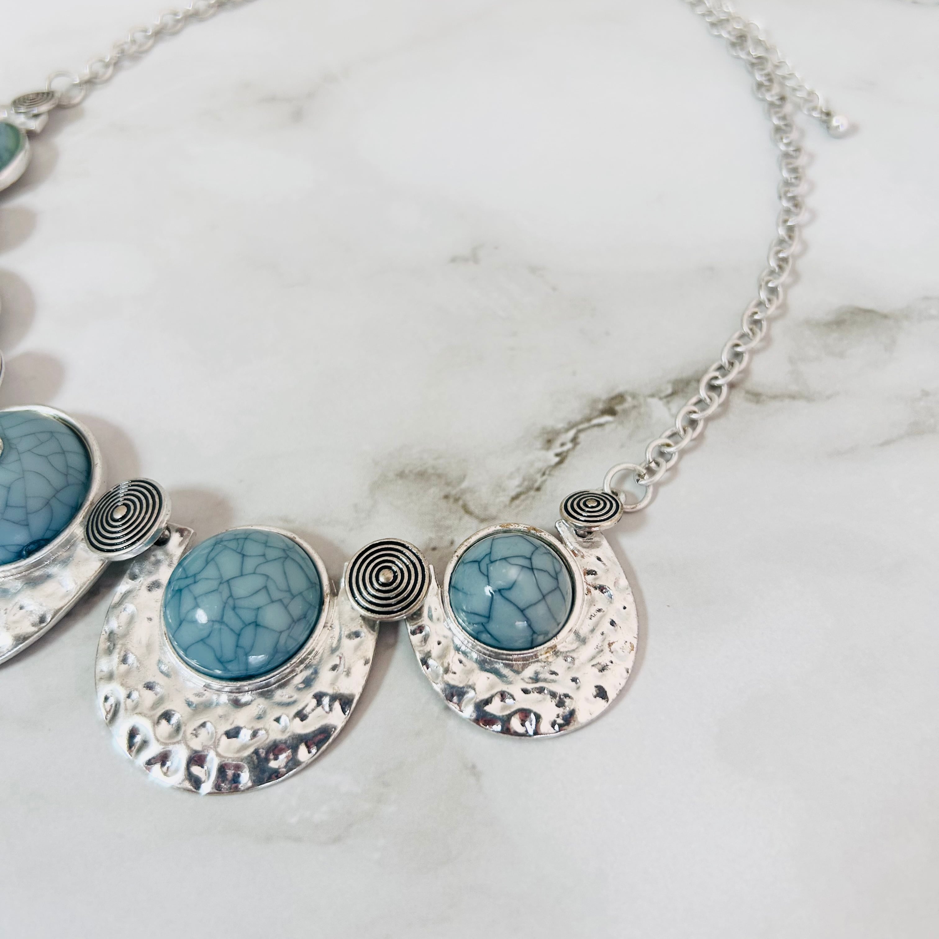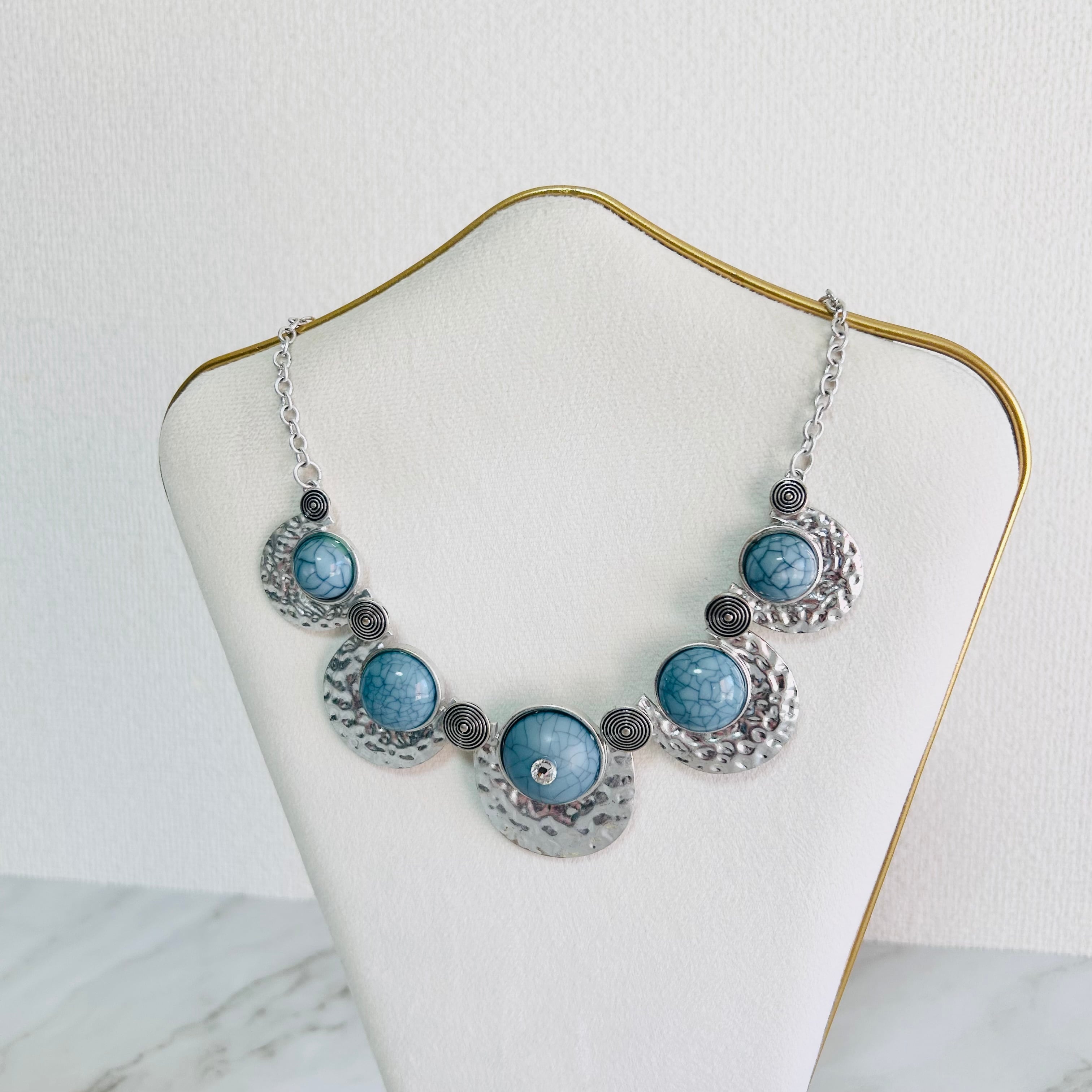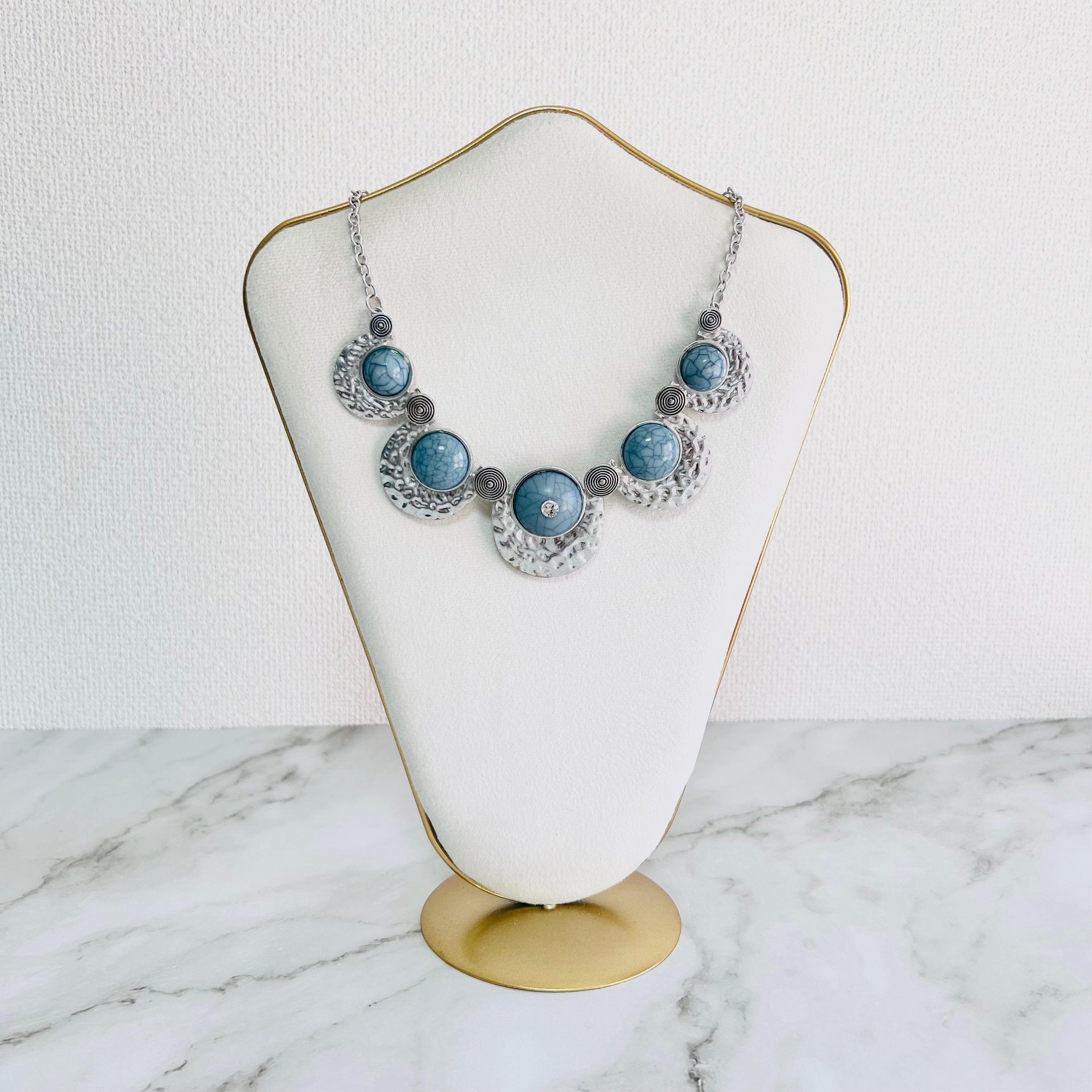 上品なブルーのストーン調アクリルパーツが印象的な、存在感たっぷりのデザインネックレスです。