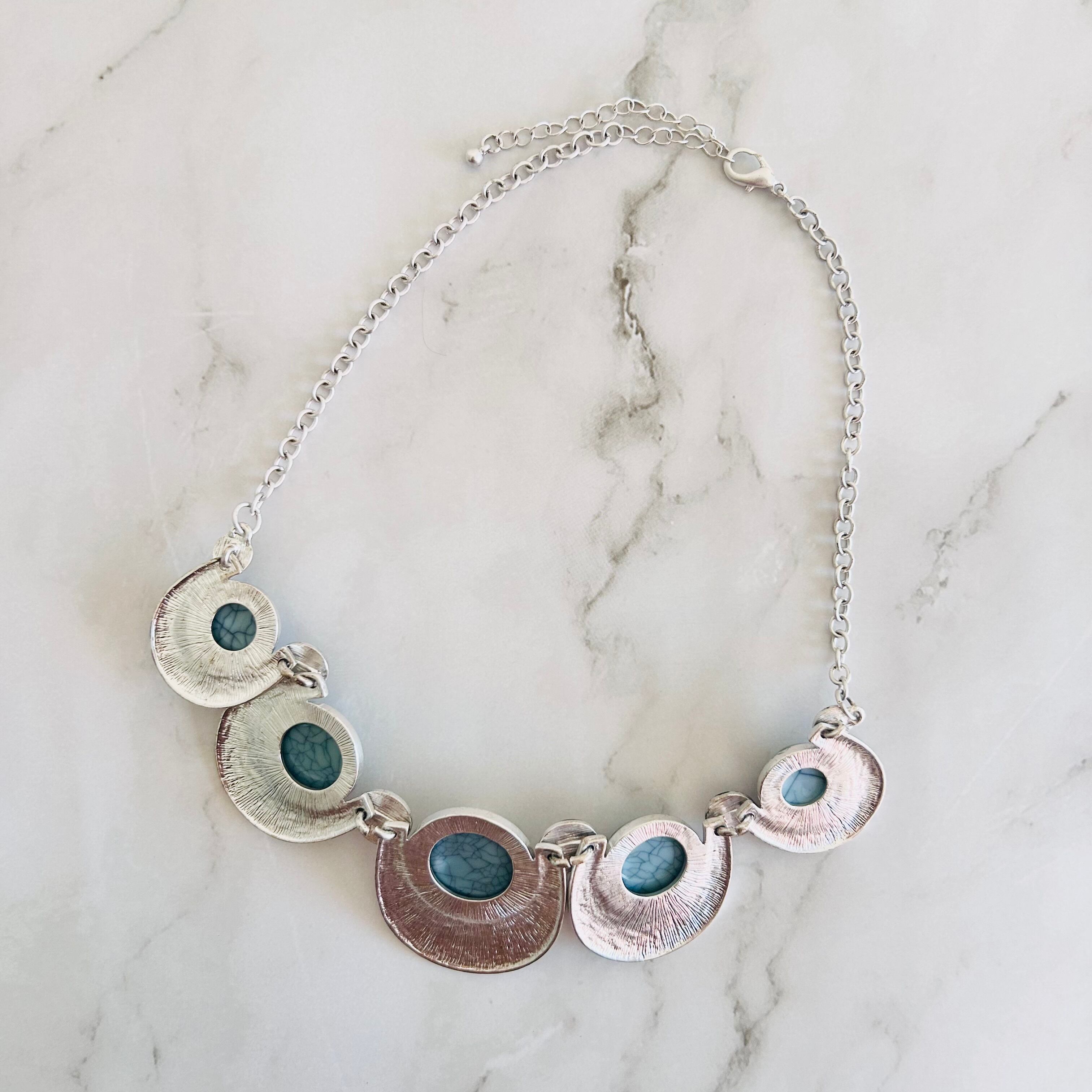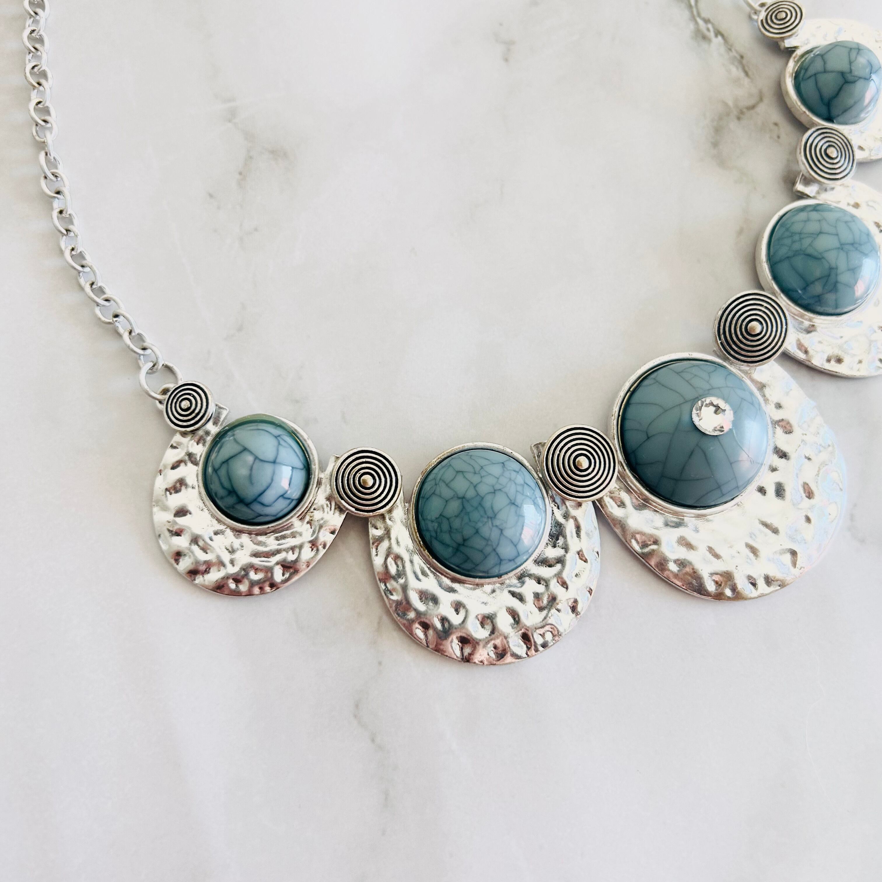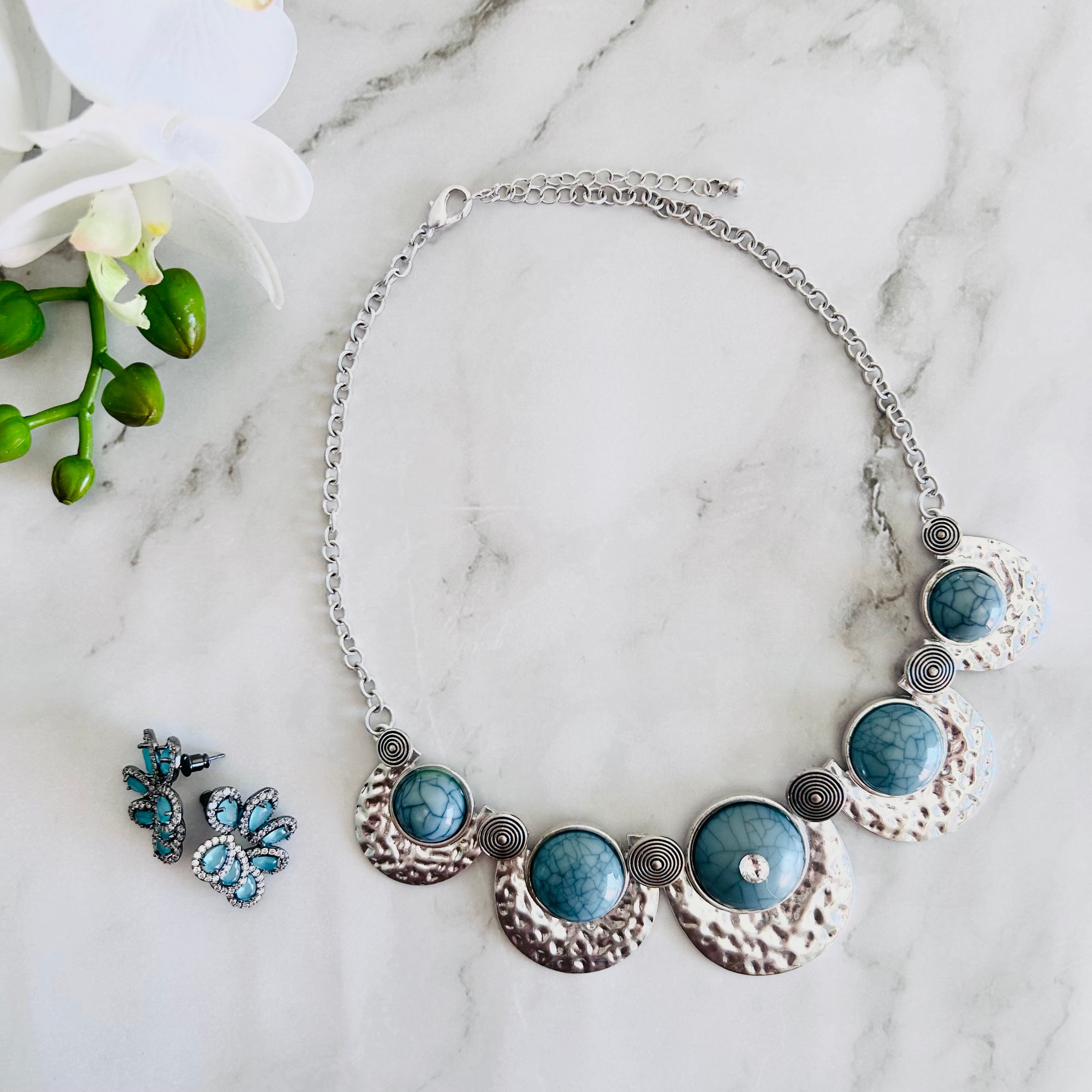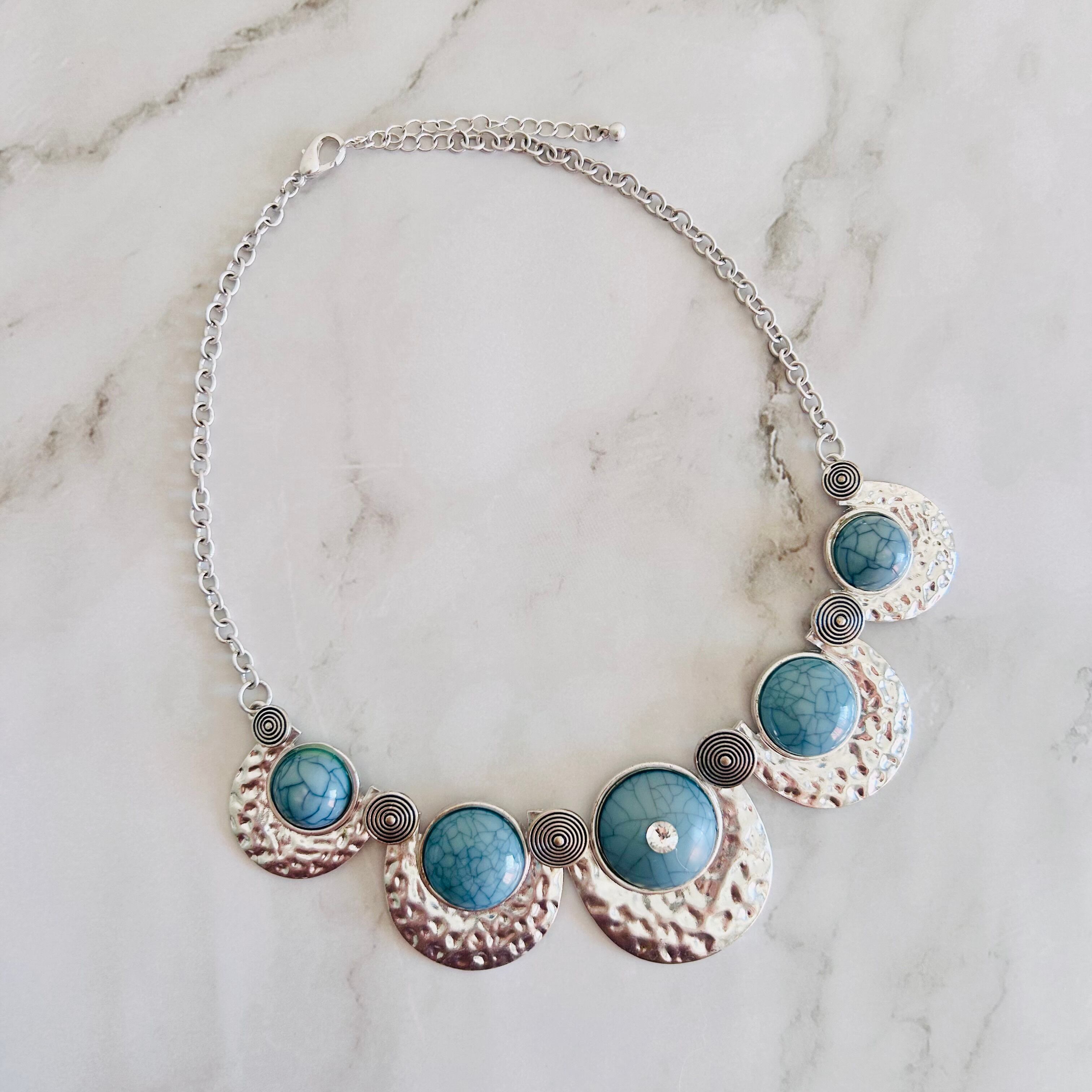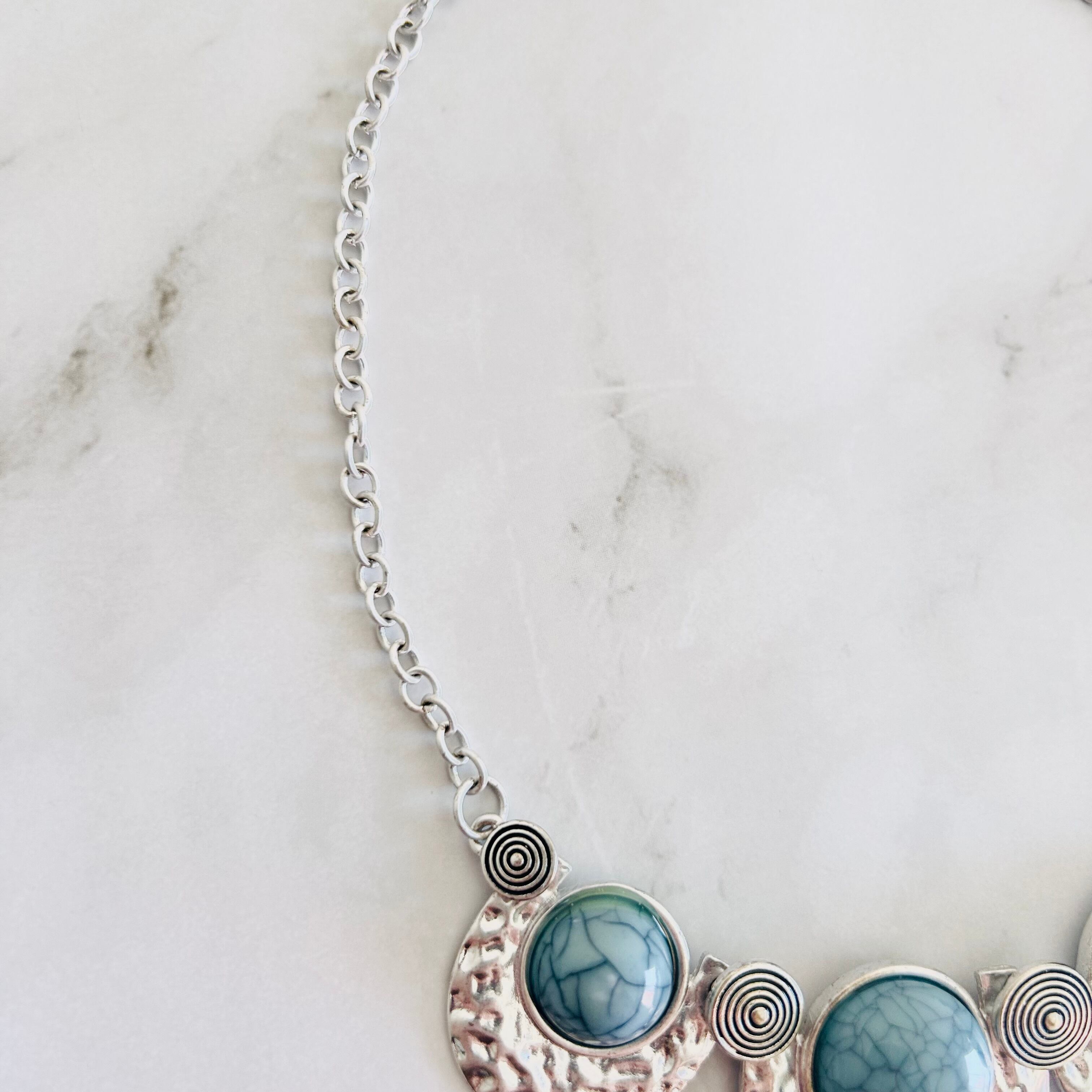 上品なブルーのストーン調アクリルパーツが印象的な、存在感たっぷりのデザインネックレスです。