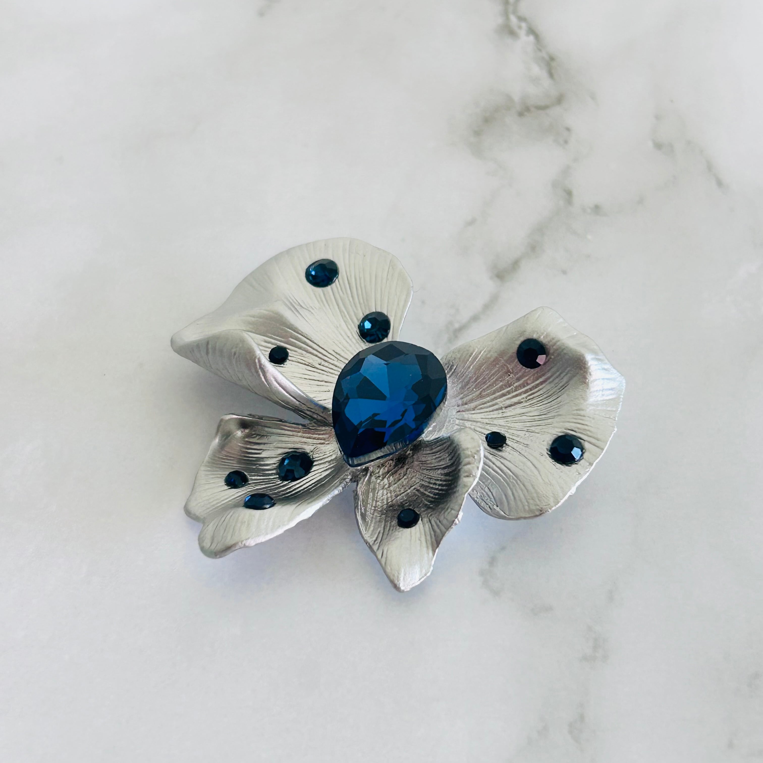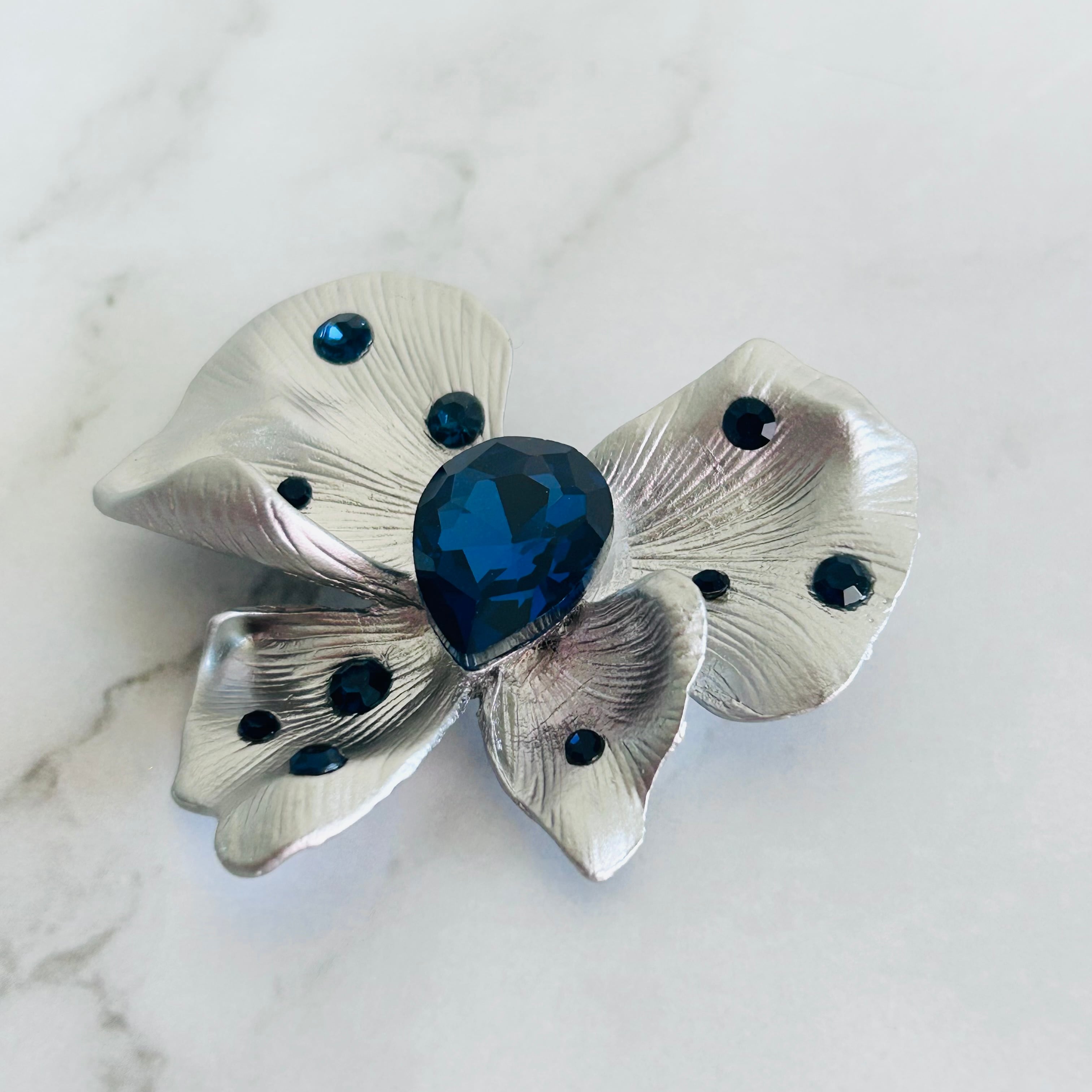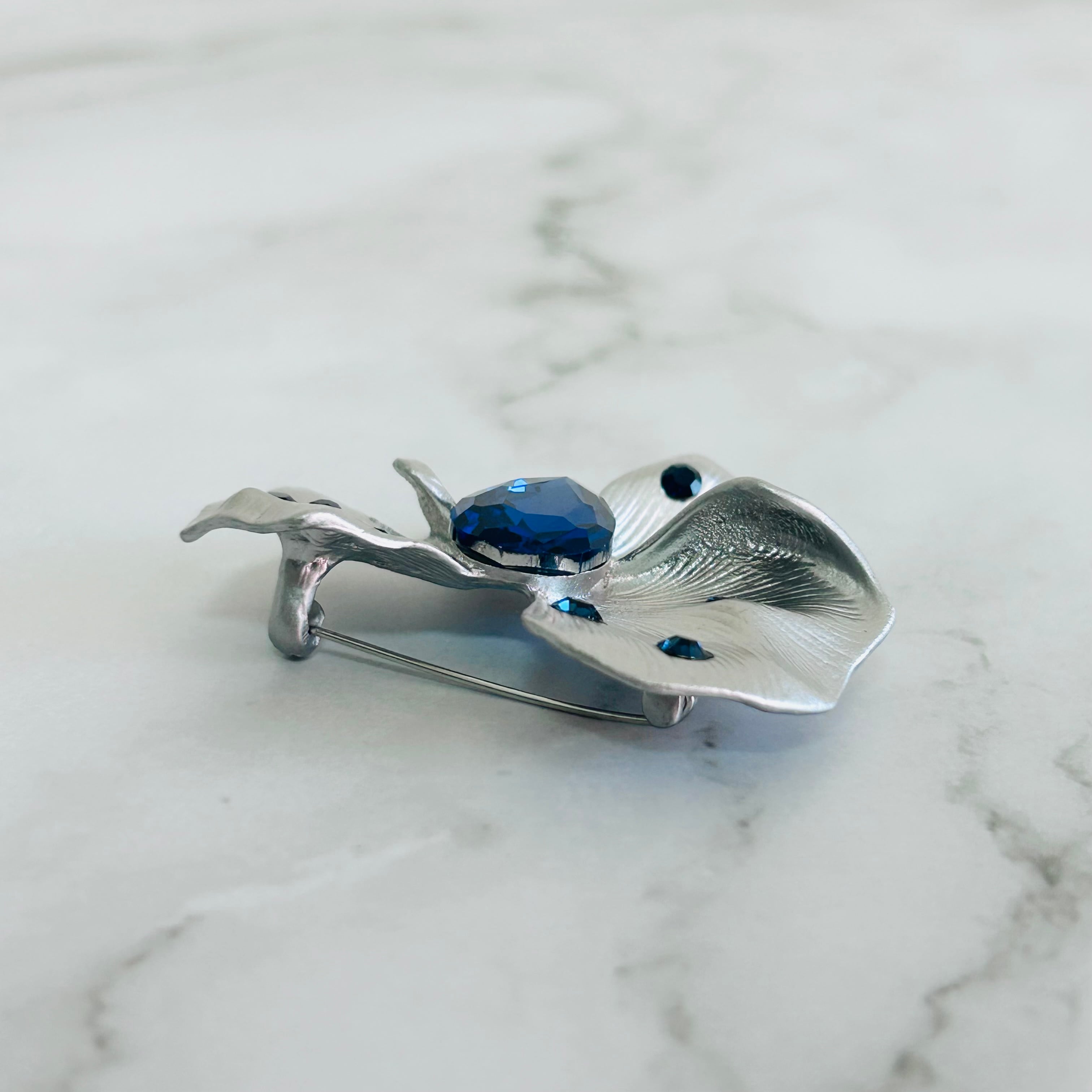 マットシルバーの花びらに、深く輝くネイビーブルーのストーンをあしらった、大人のためのエレガントなブローチです。