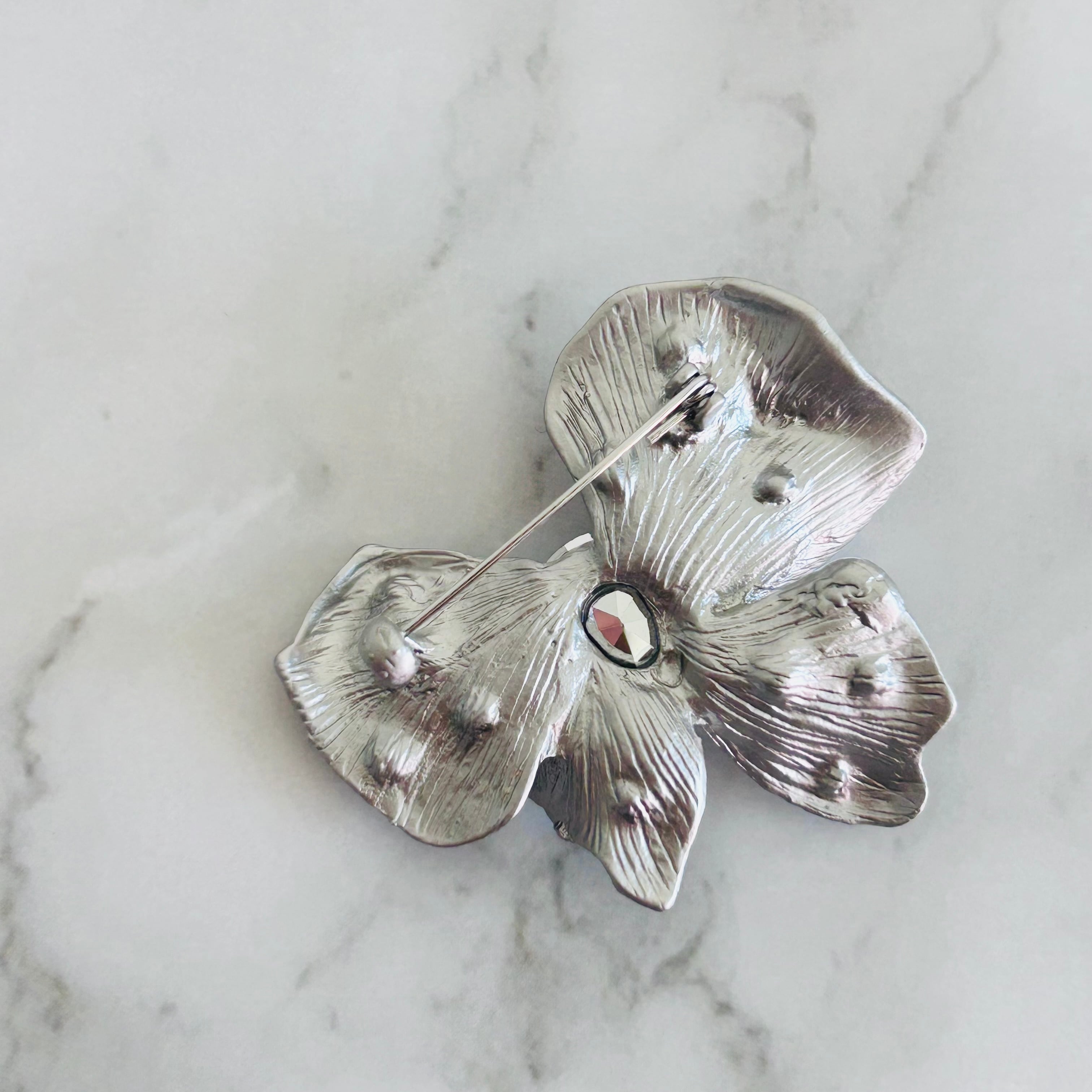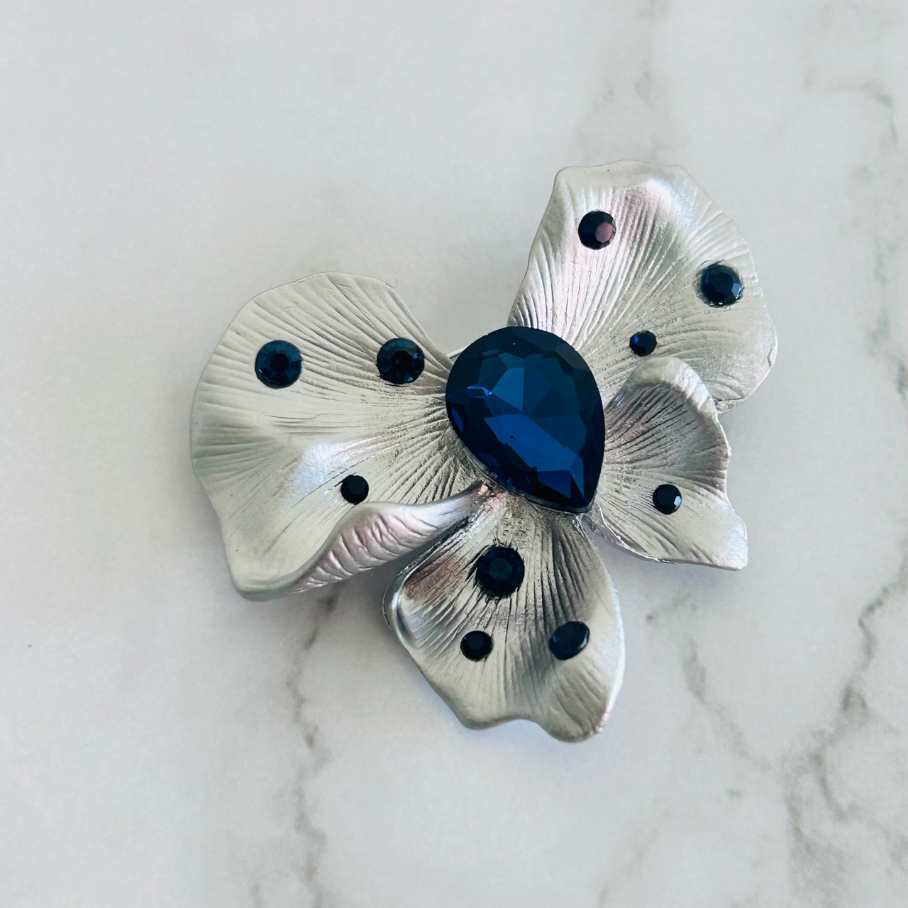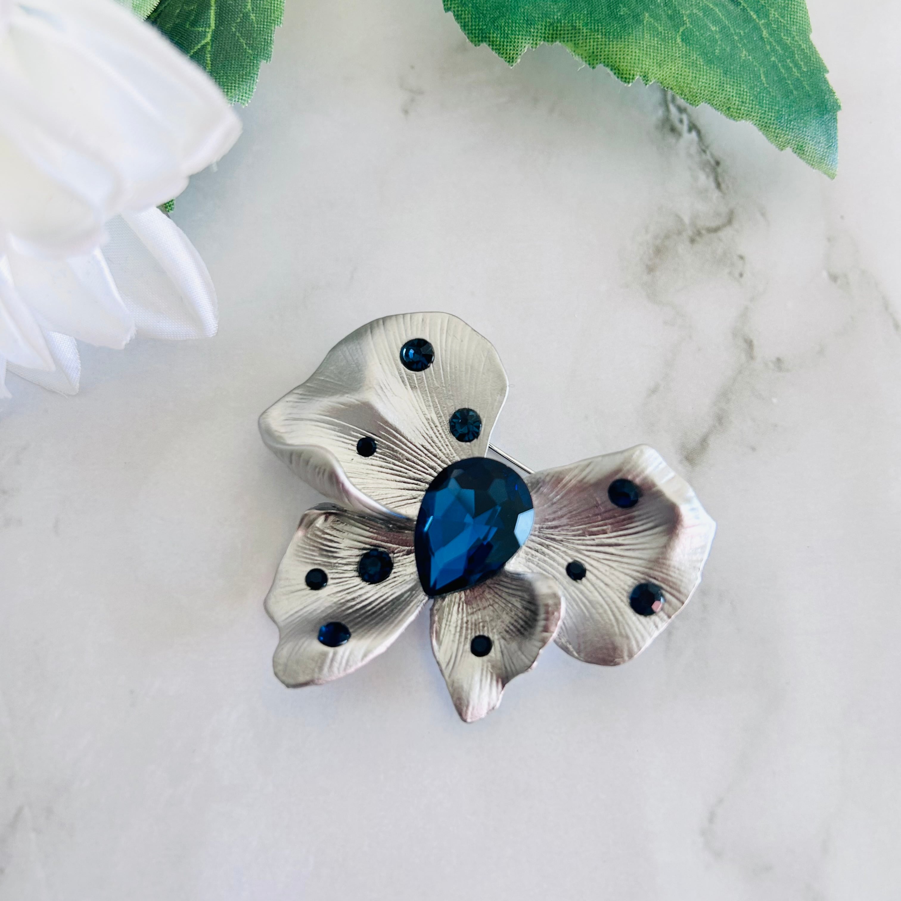 マットシルバーの花びらに、深く輝くネイビーブルーのストーンをあしらった、大人のためのエレガントなブローチです。