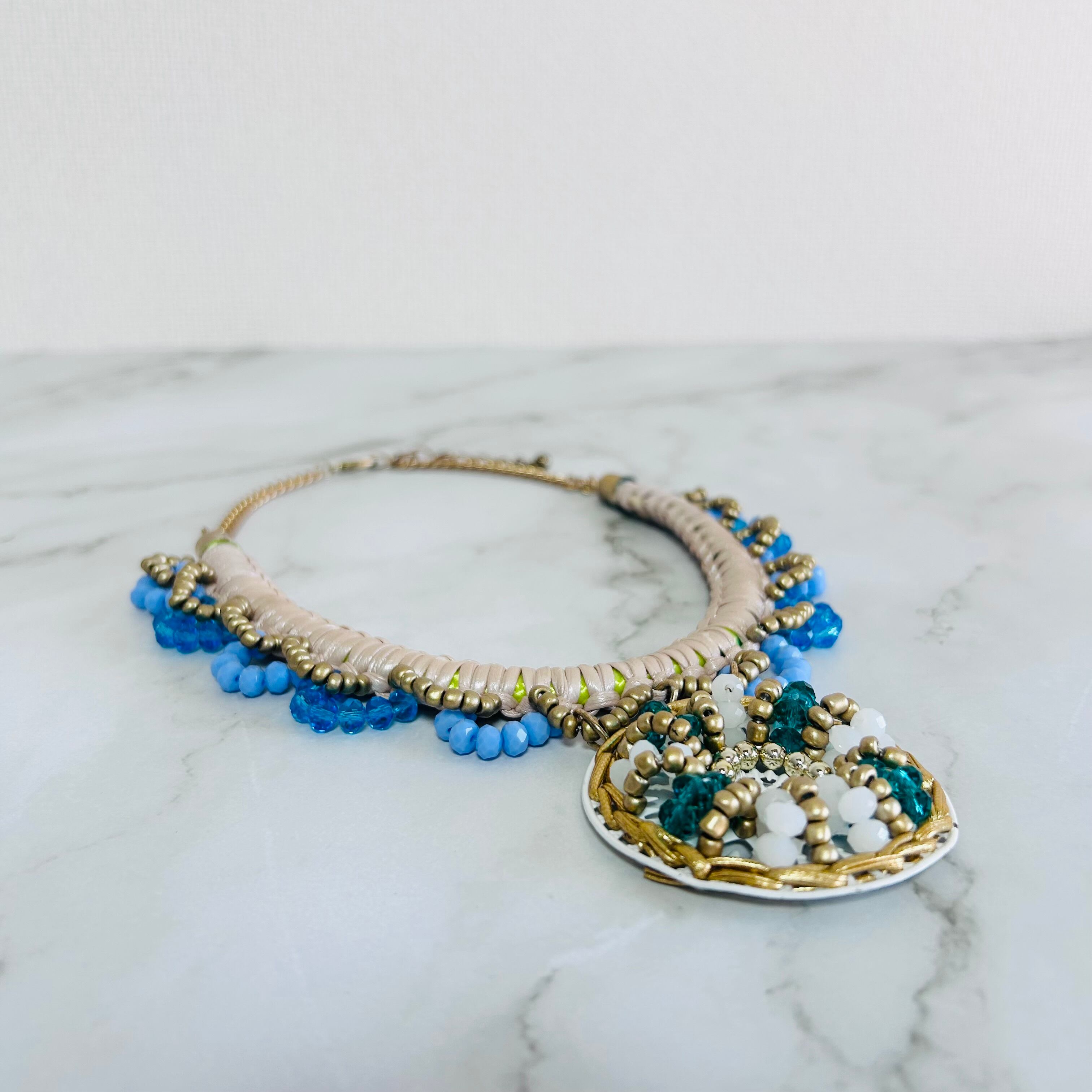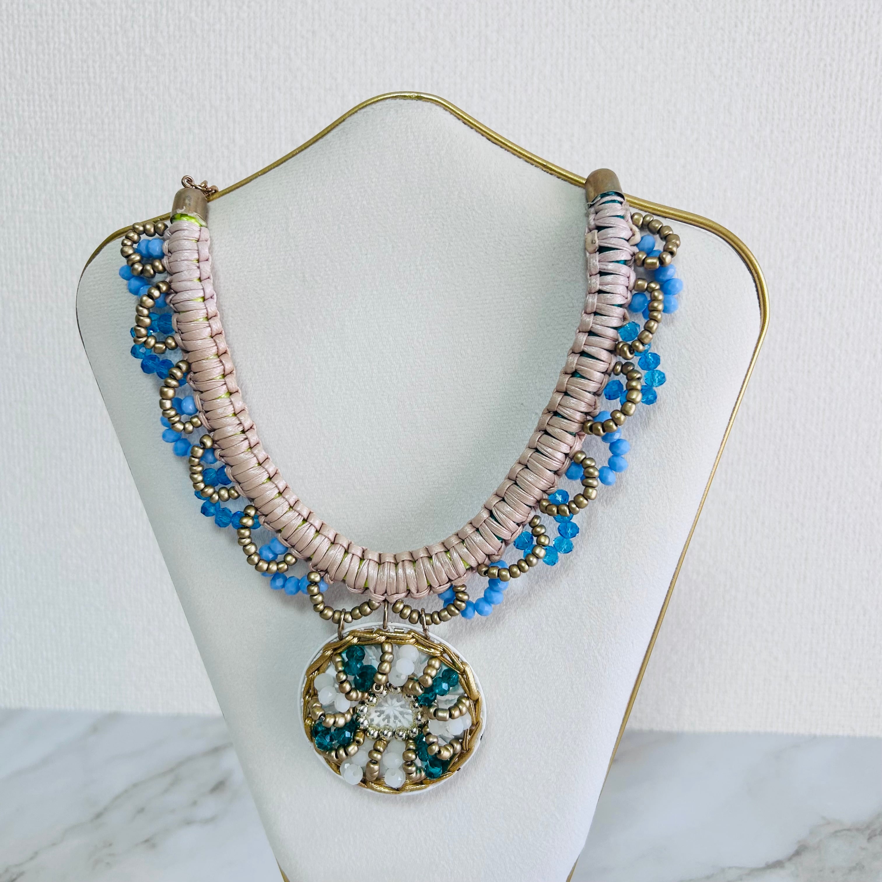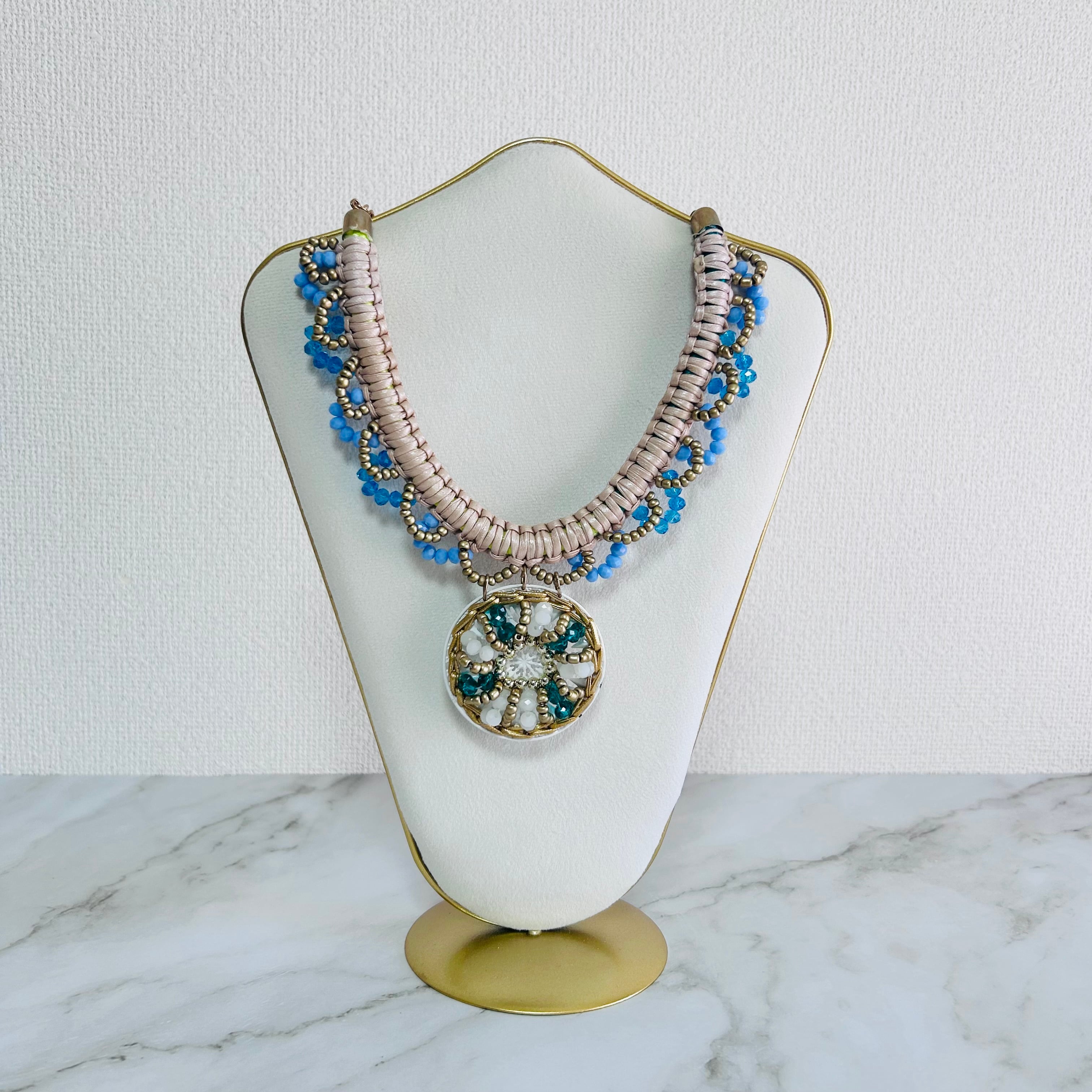 淡いベージュのコードに、ゴールドとブルーのビーズをふんだんに編み込んだボリュームネックレスです。