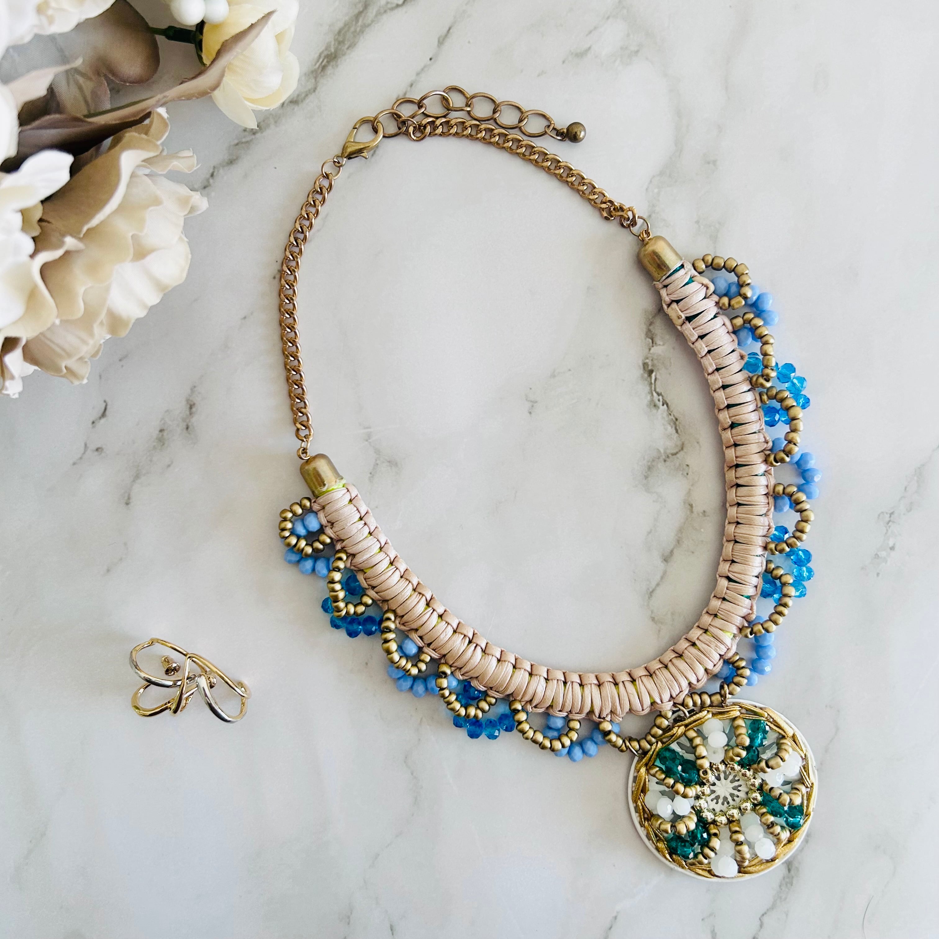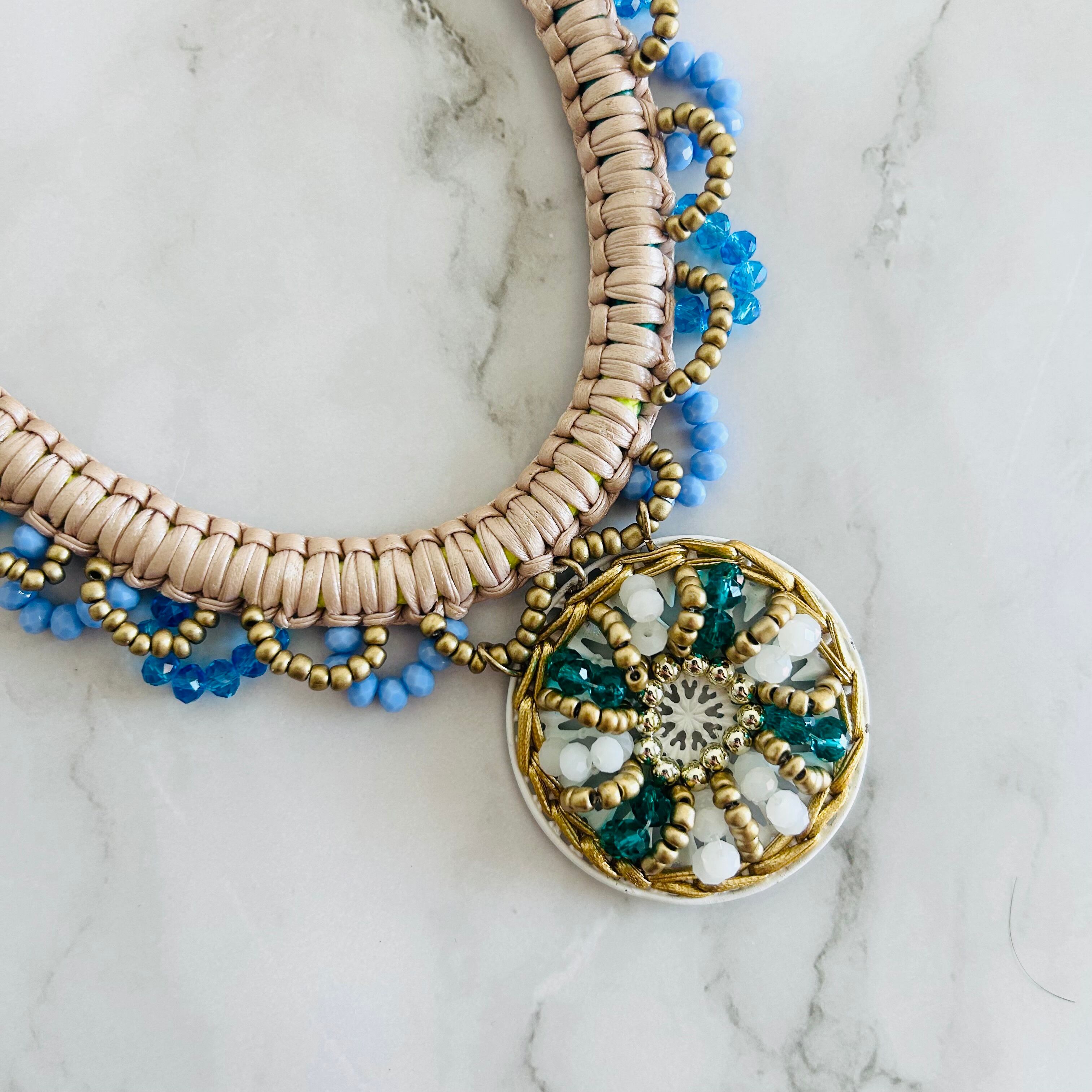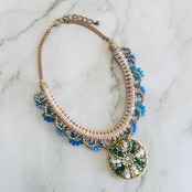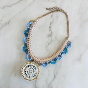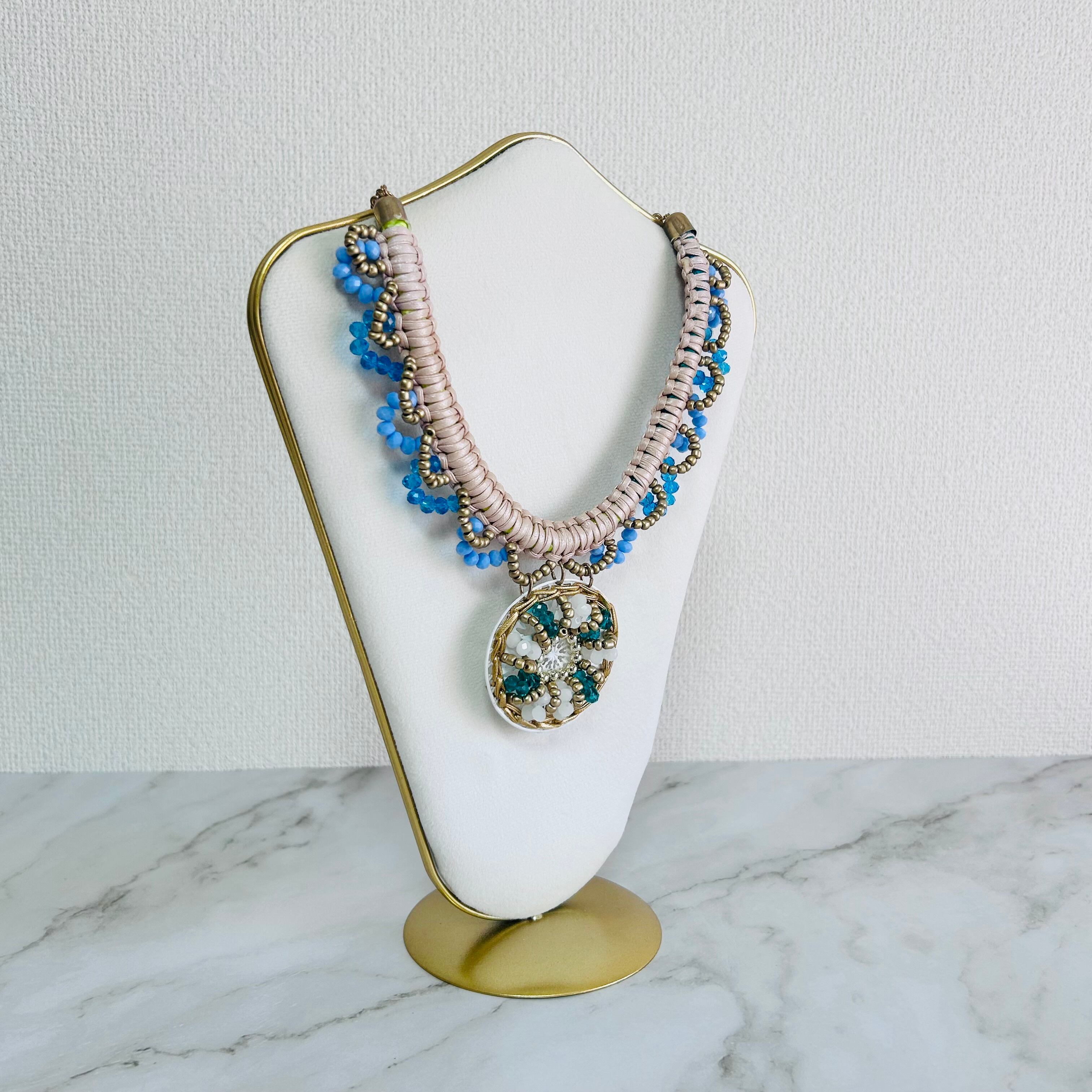 淡いベージュのコードに、ゴールドとブルーのビーズをふんだんに編み込んだボリュームネックレスです。