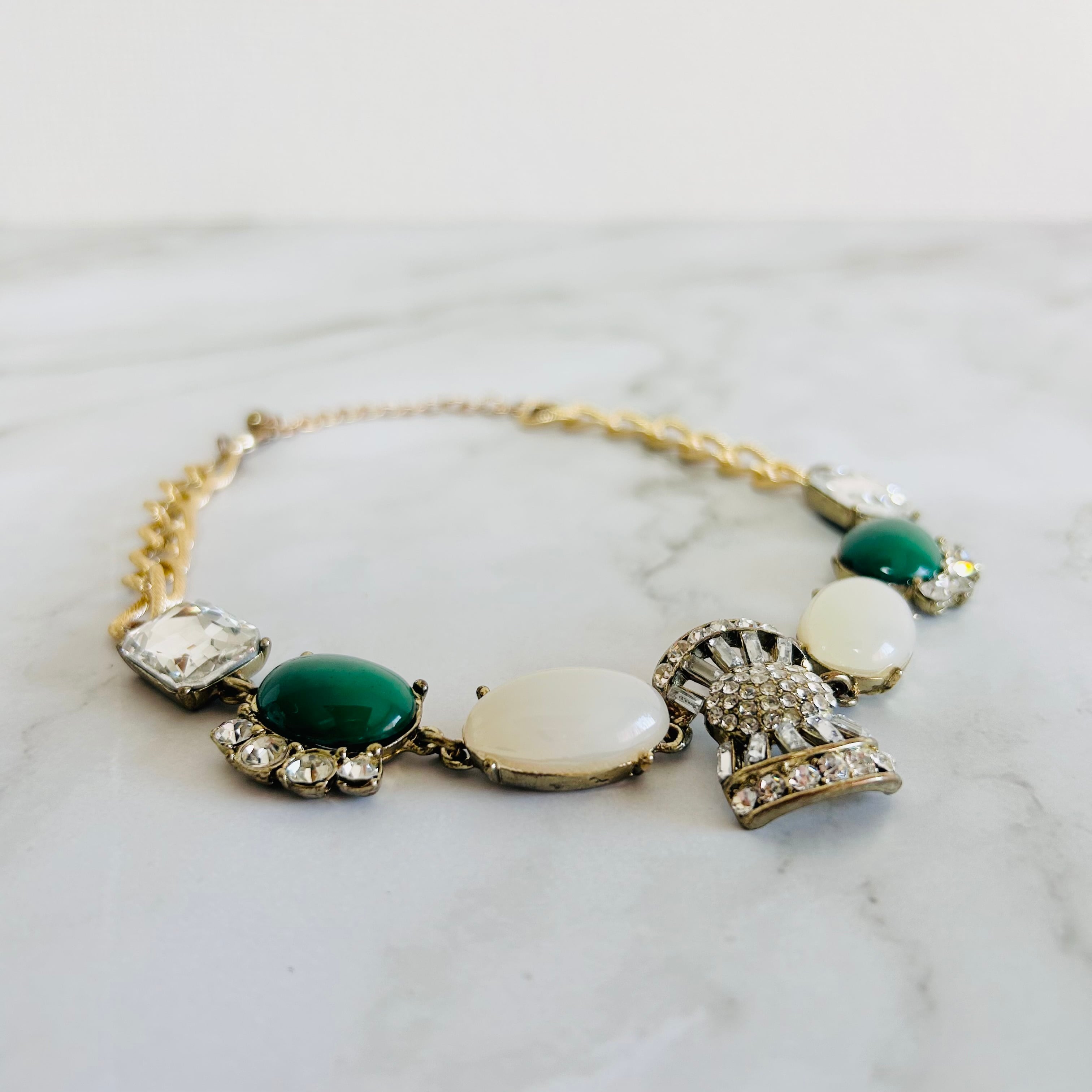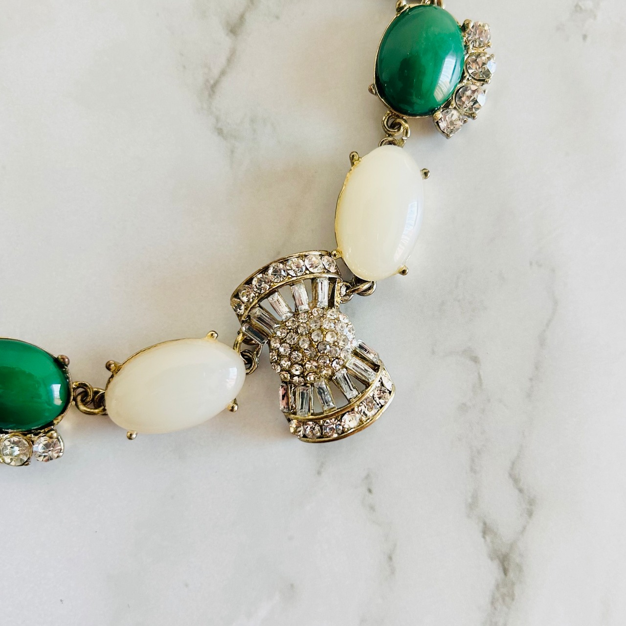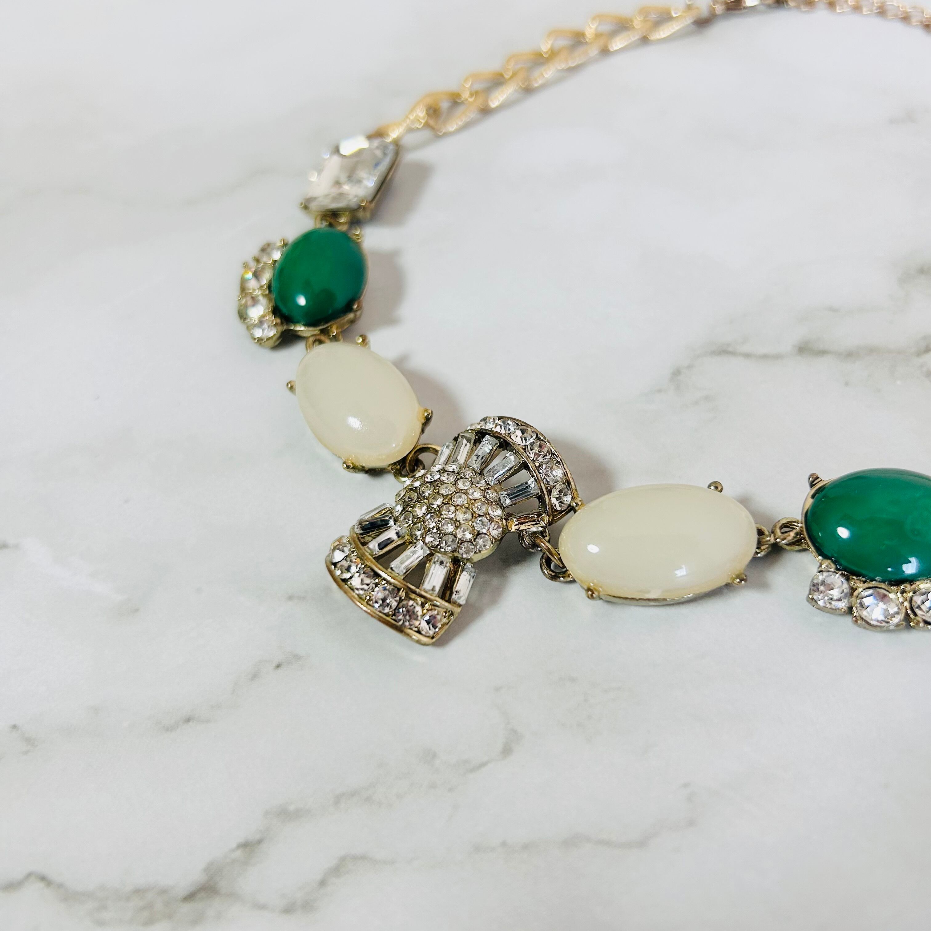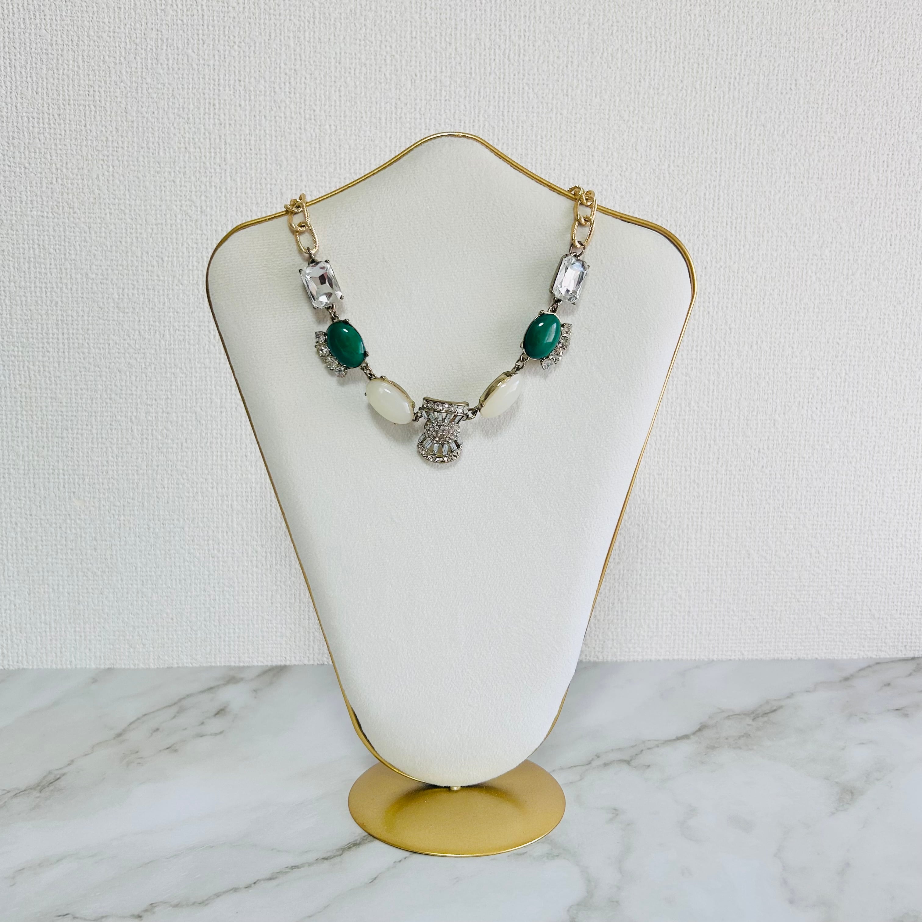 深みのあるグリーンとミルクホワイトの楕円パーツ、そしてきらめくクリスタルを絶妙なバランスで配置したクラシカルなネックレスです。