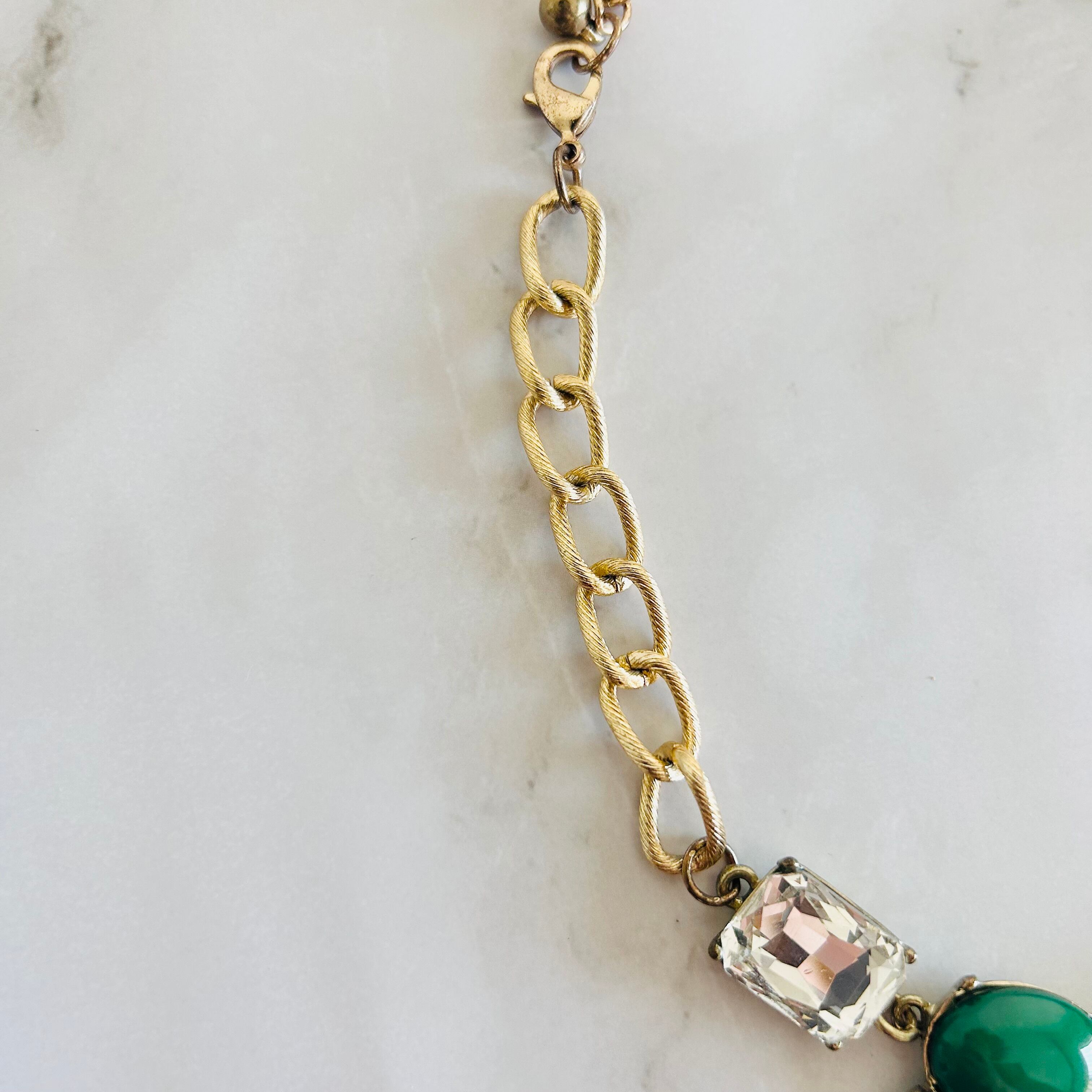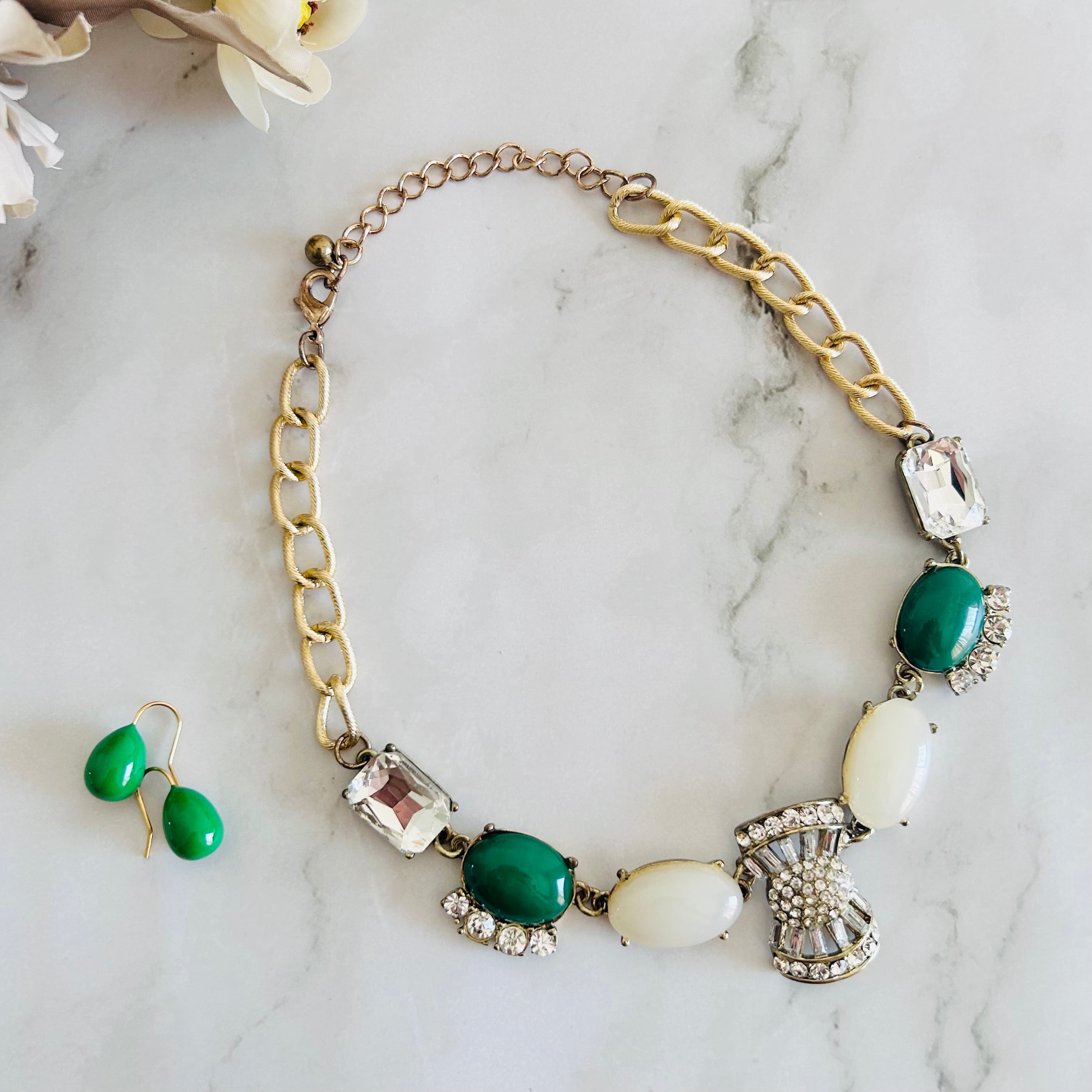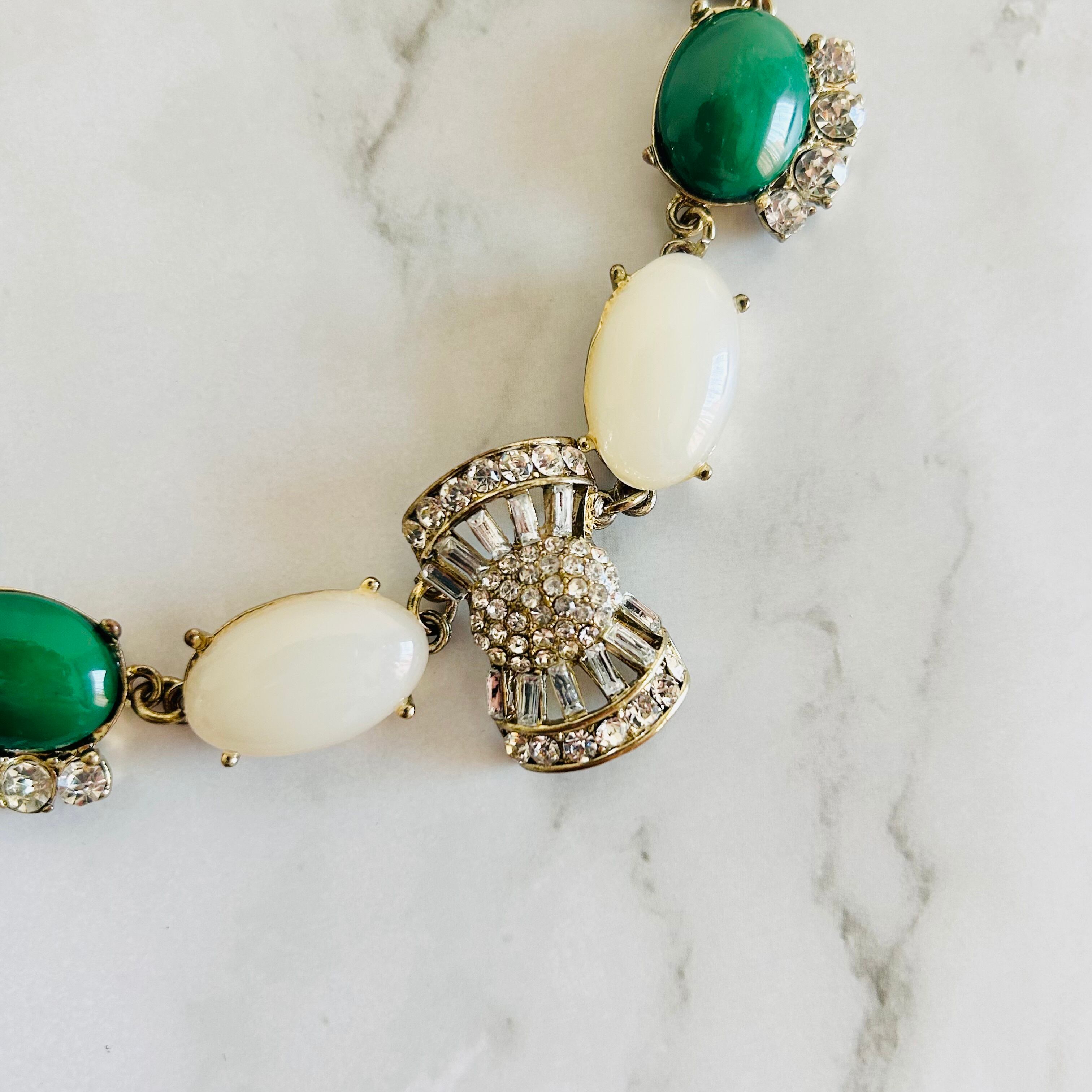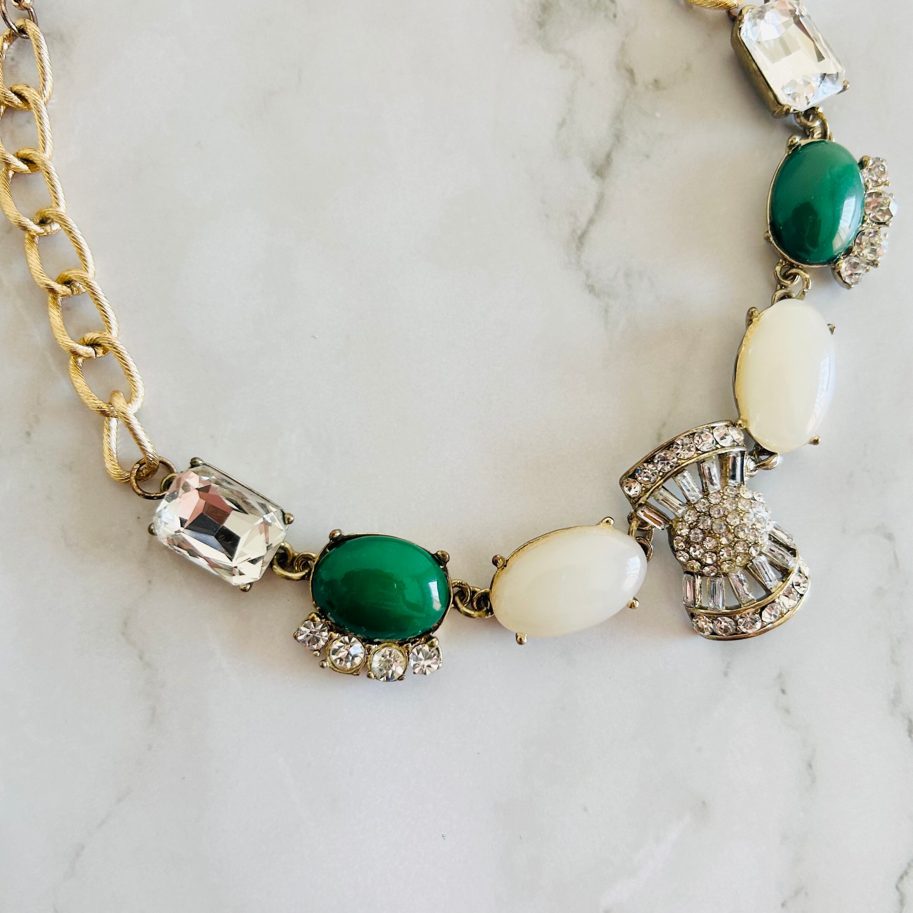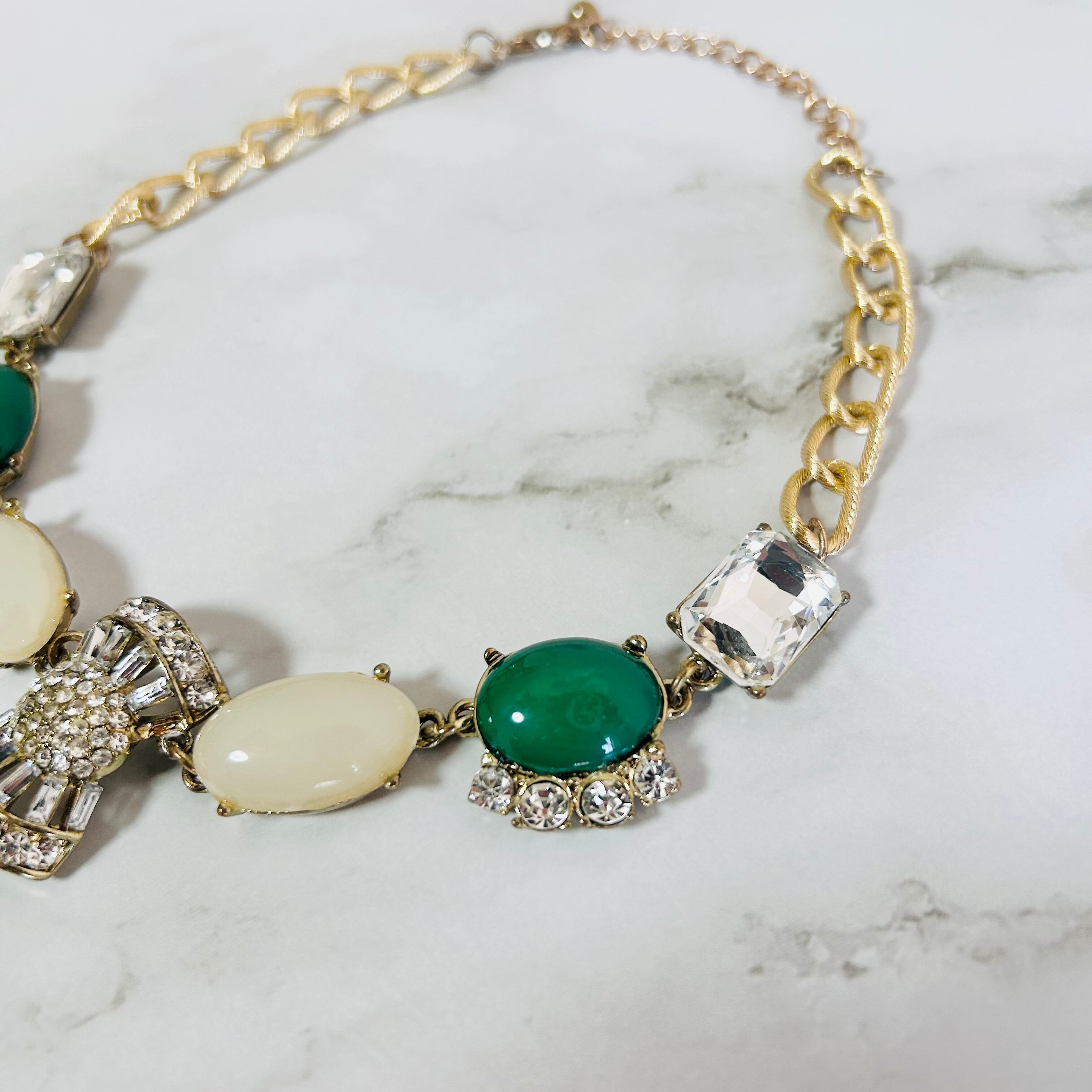 深みのあるグリーンとミルクホワイトの楕円パーツ、そしてきらめくクリスタルを絶妙なバランスで配置したクラシカルなネックレスです。