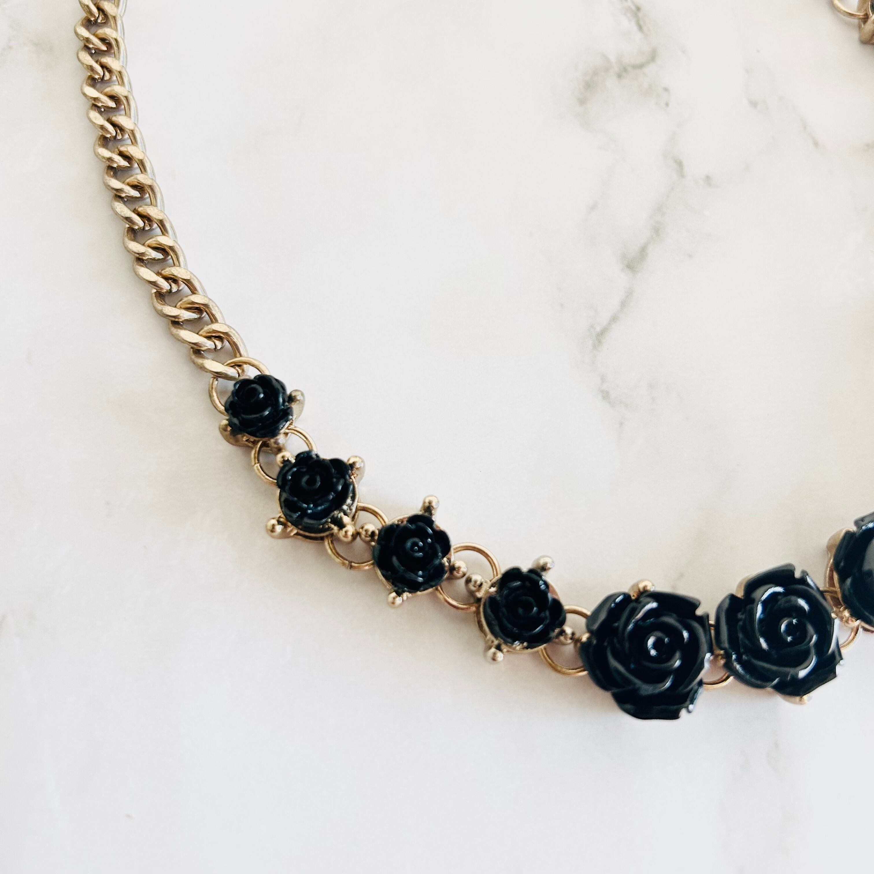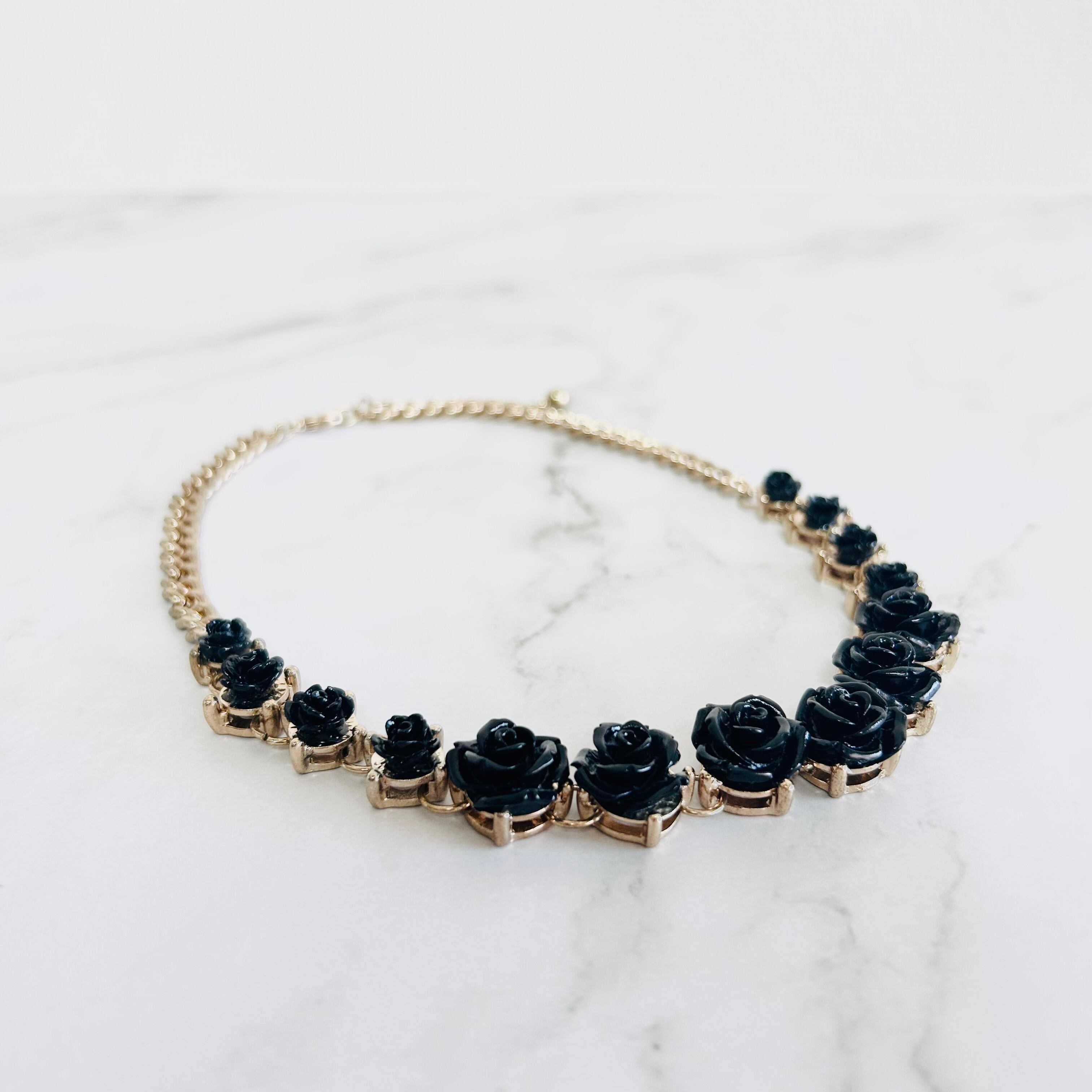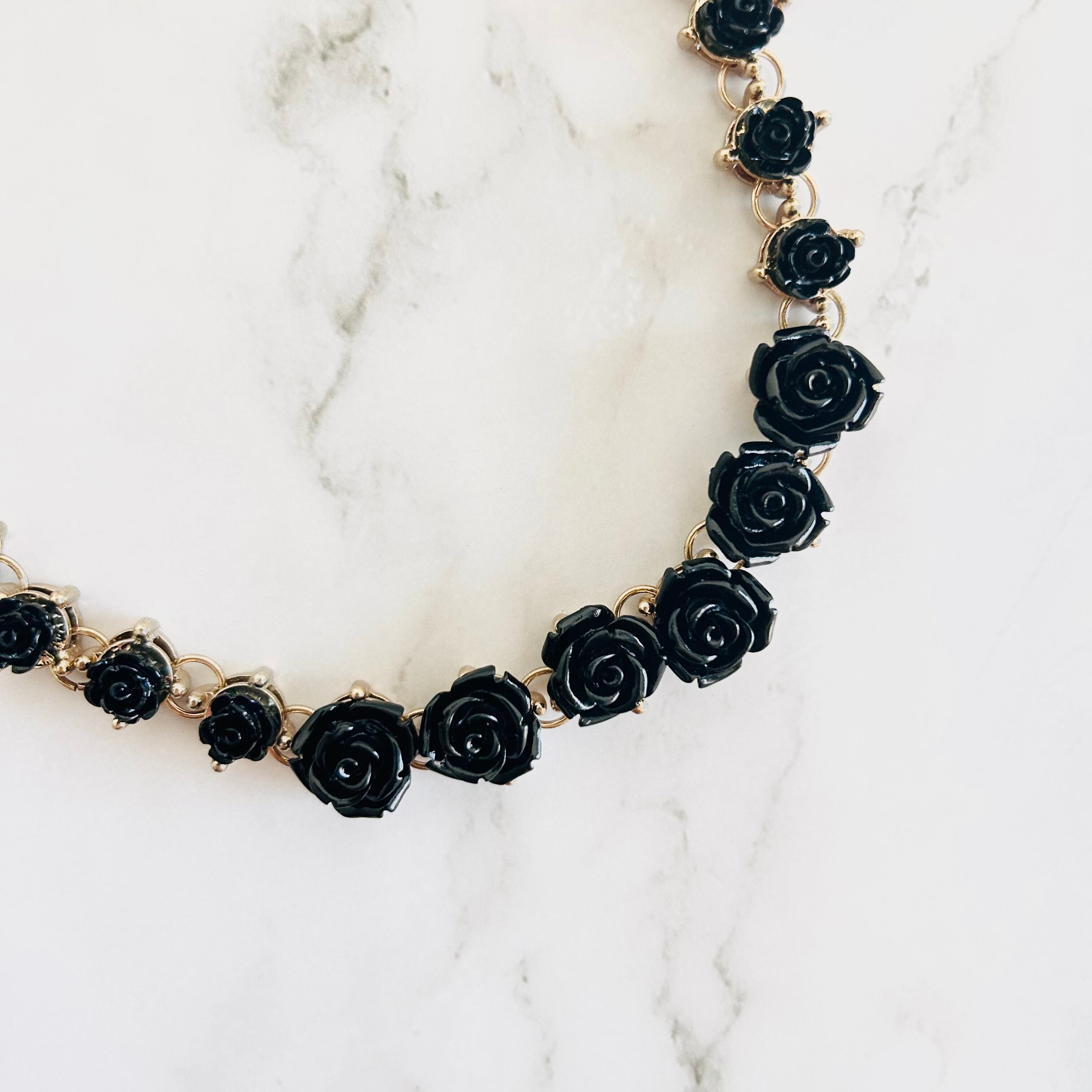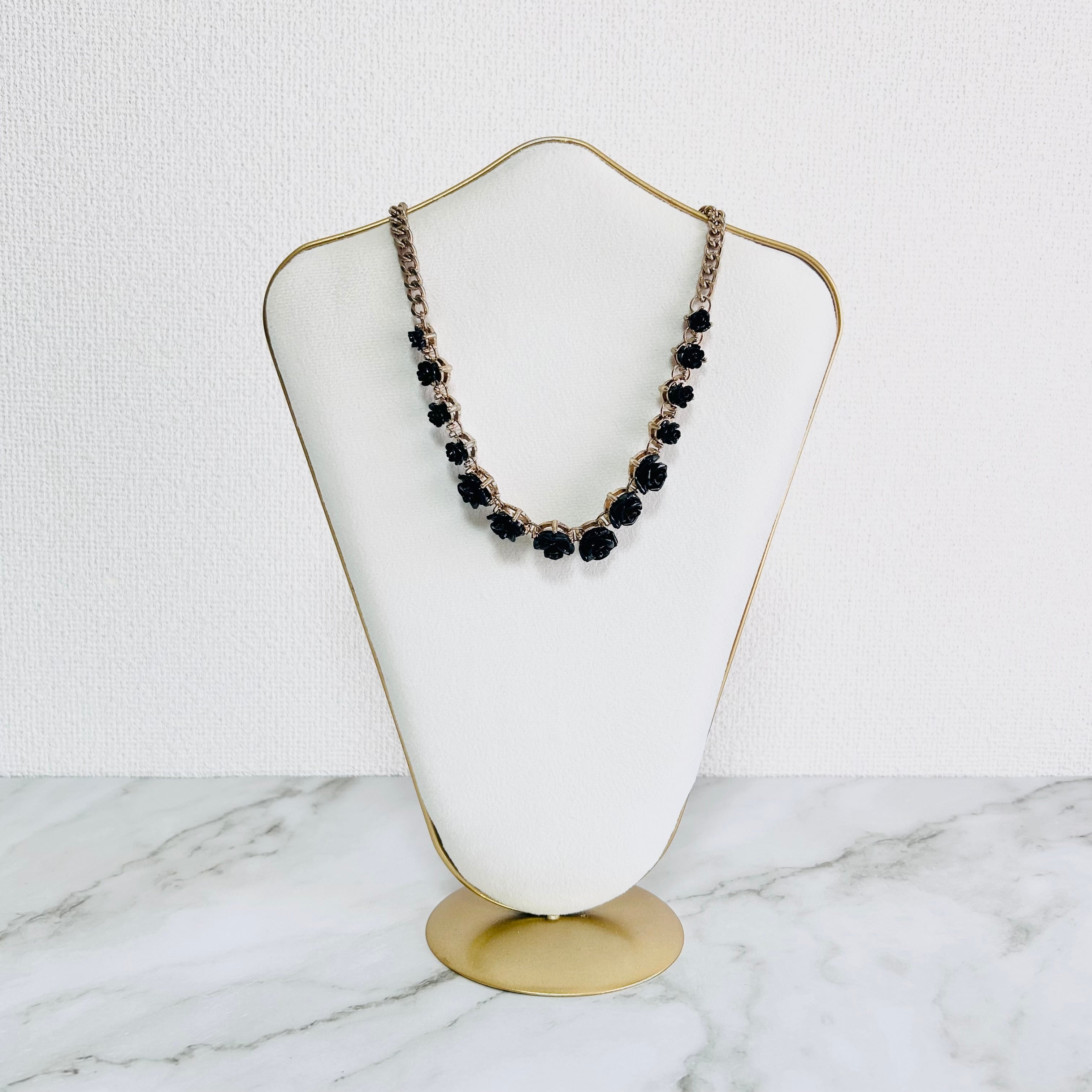 艶やかなブラックのローズモチーフが並ぶ、印象的なデザインのネックレスです。