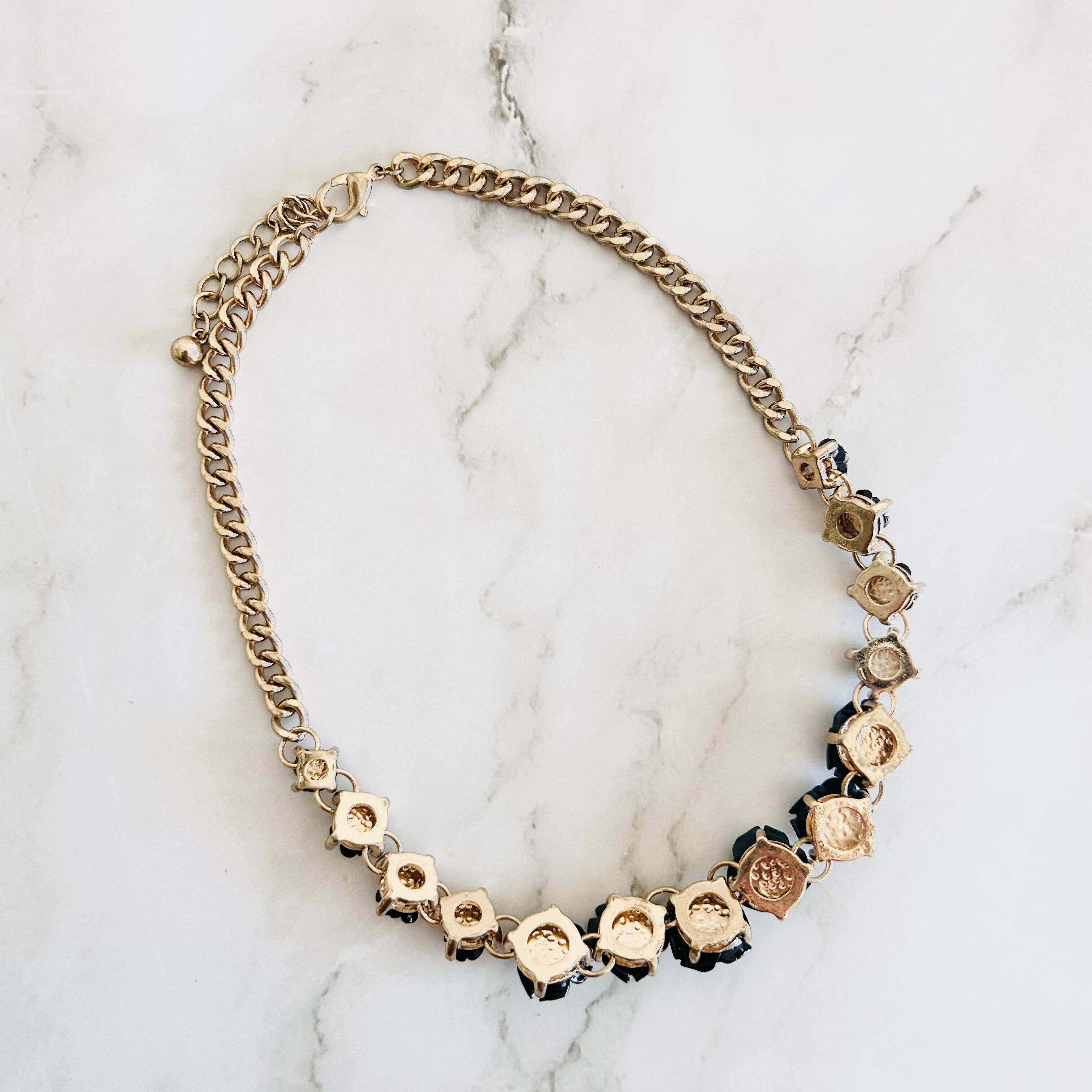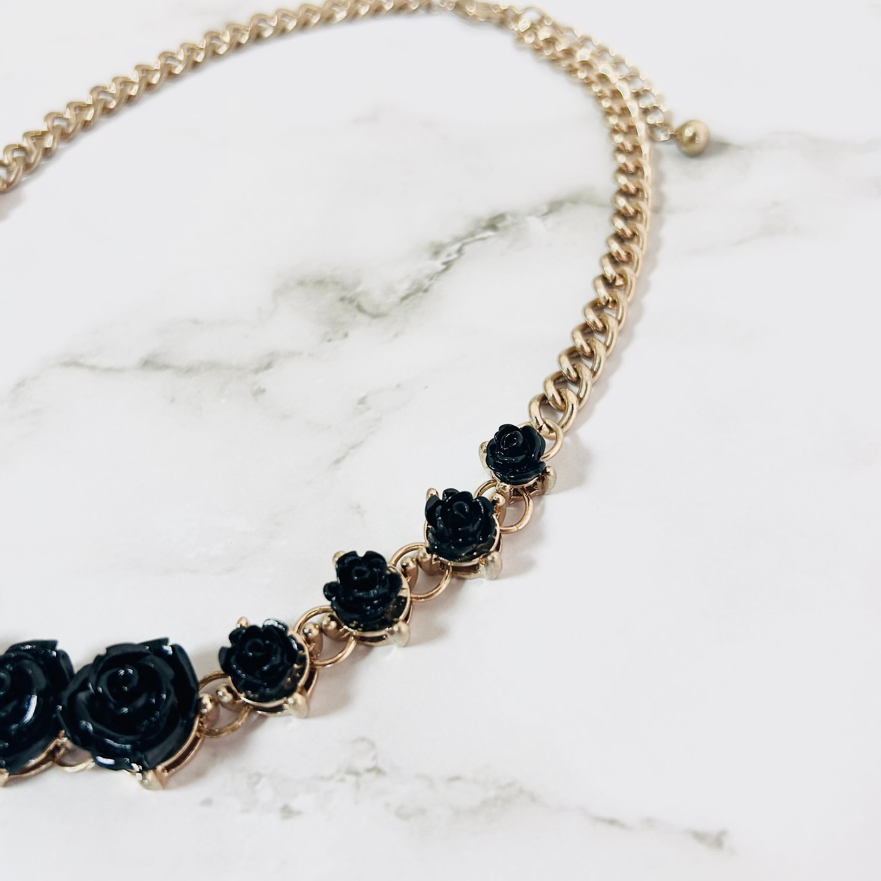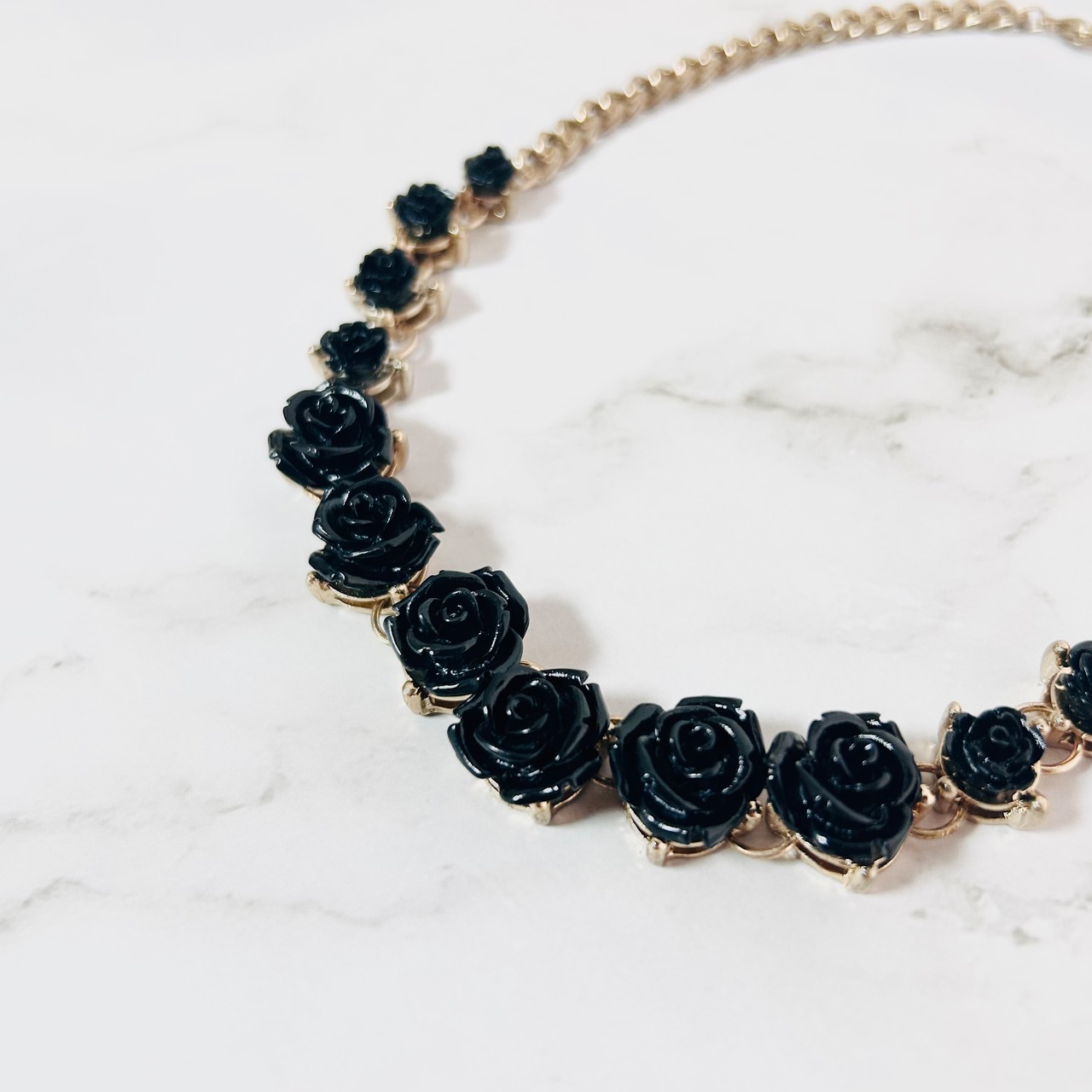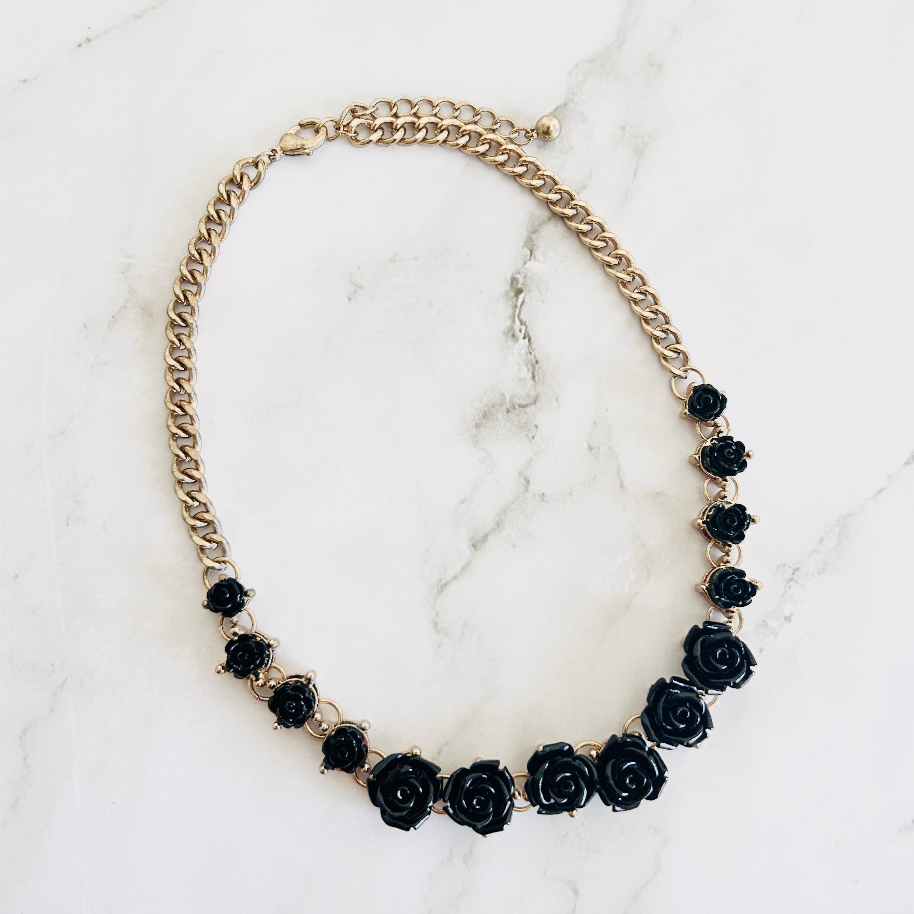 艶やかなブラックのローズモチーフが並ぶ、印象的なデザインのネックレスです。