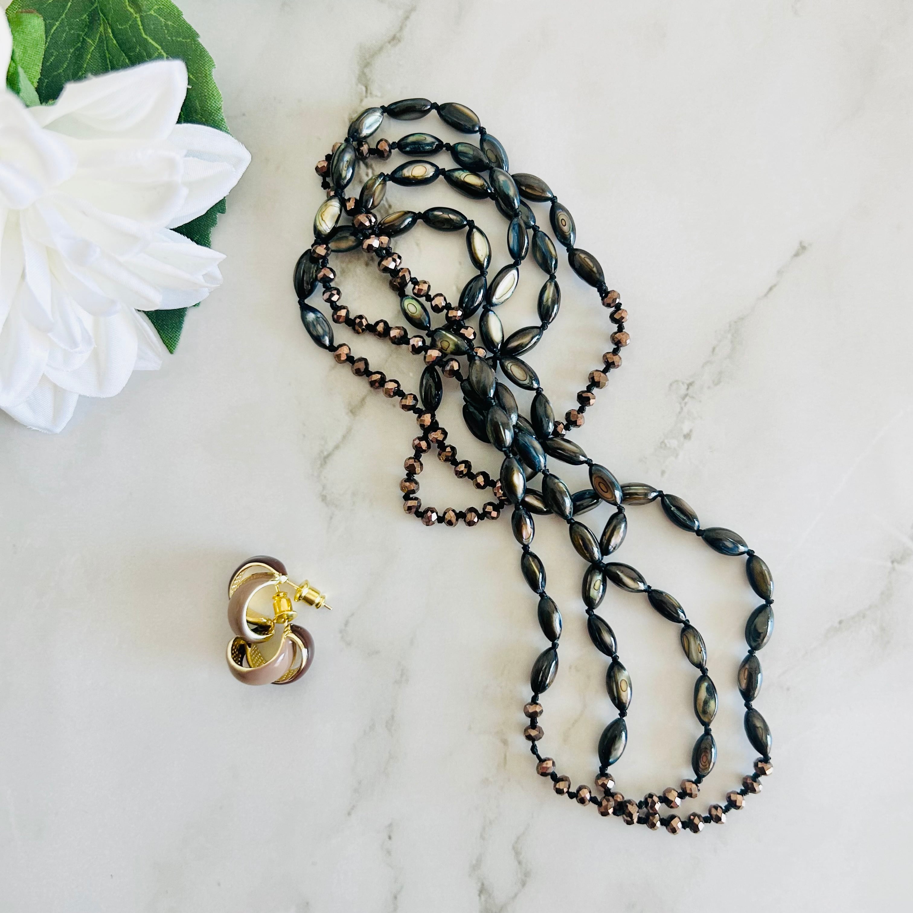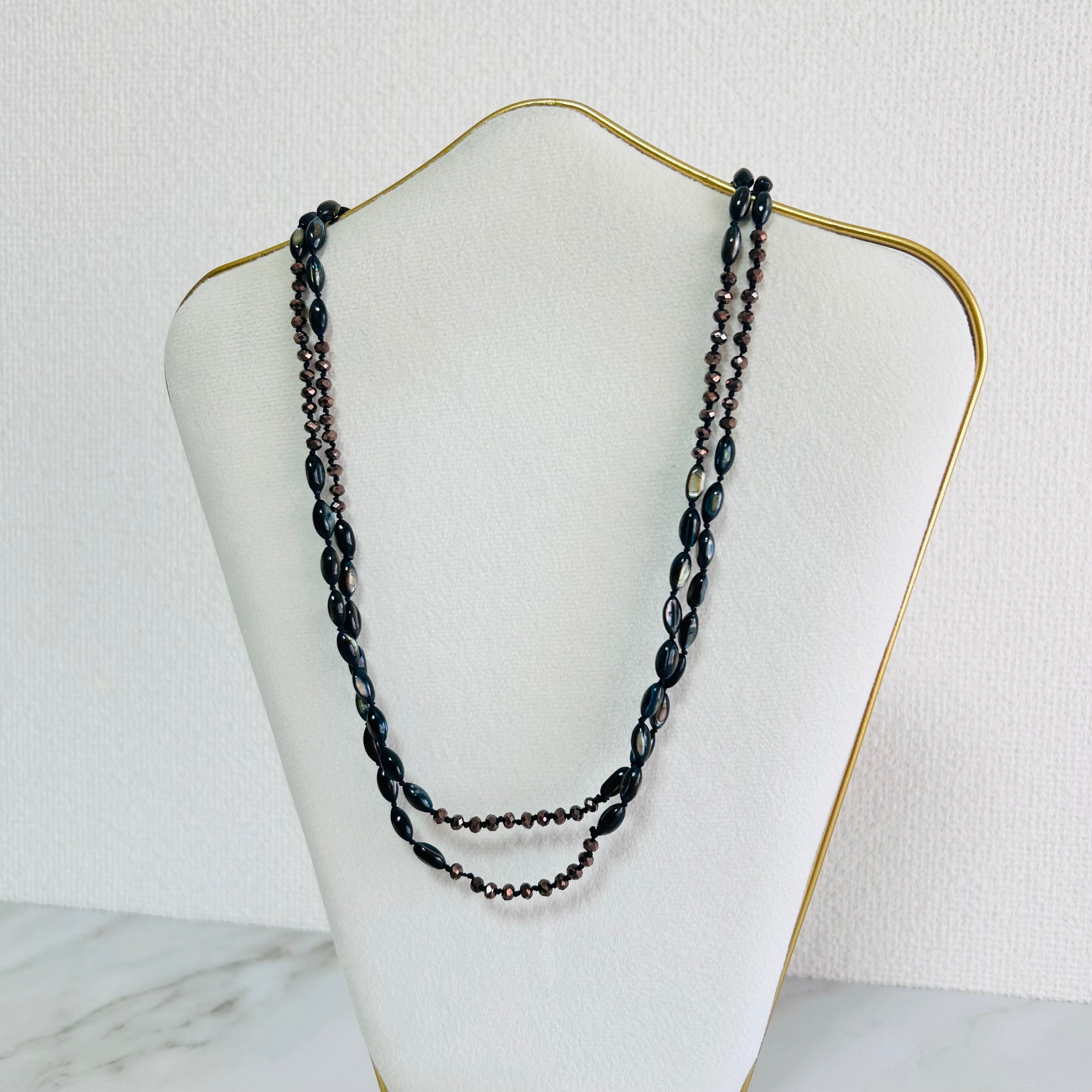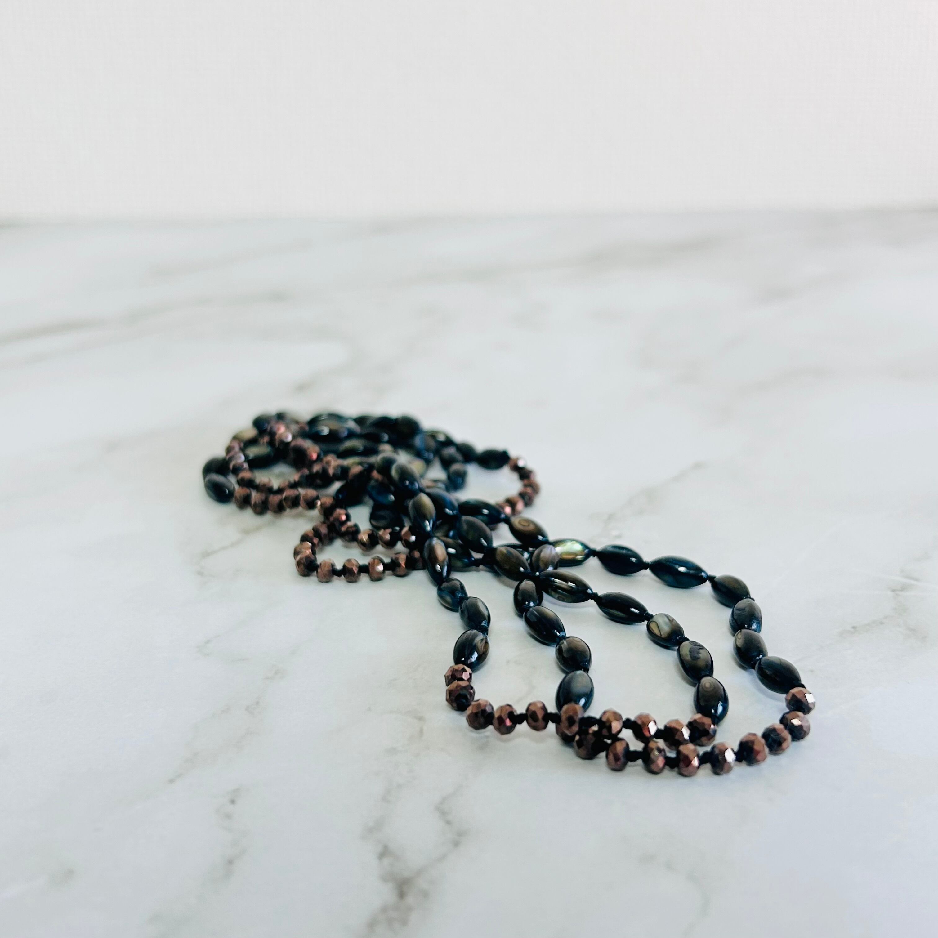 美しい艶のあるシェルと、深みのあるブロンズカラーのチェコビーズが連なる、ロングタイプのネックレスです。