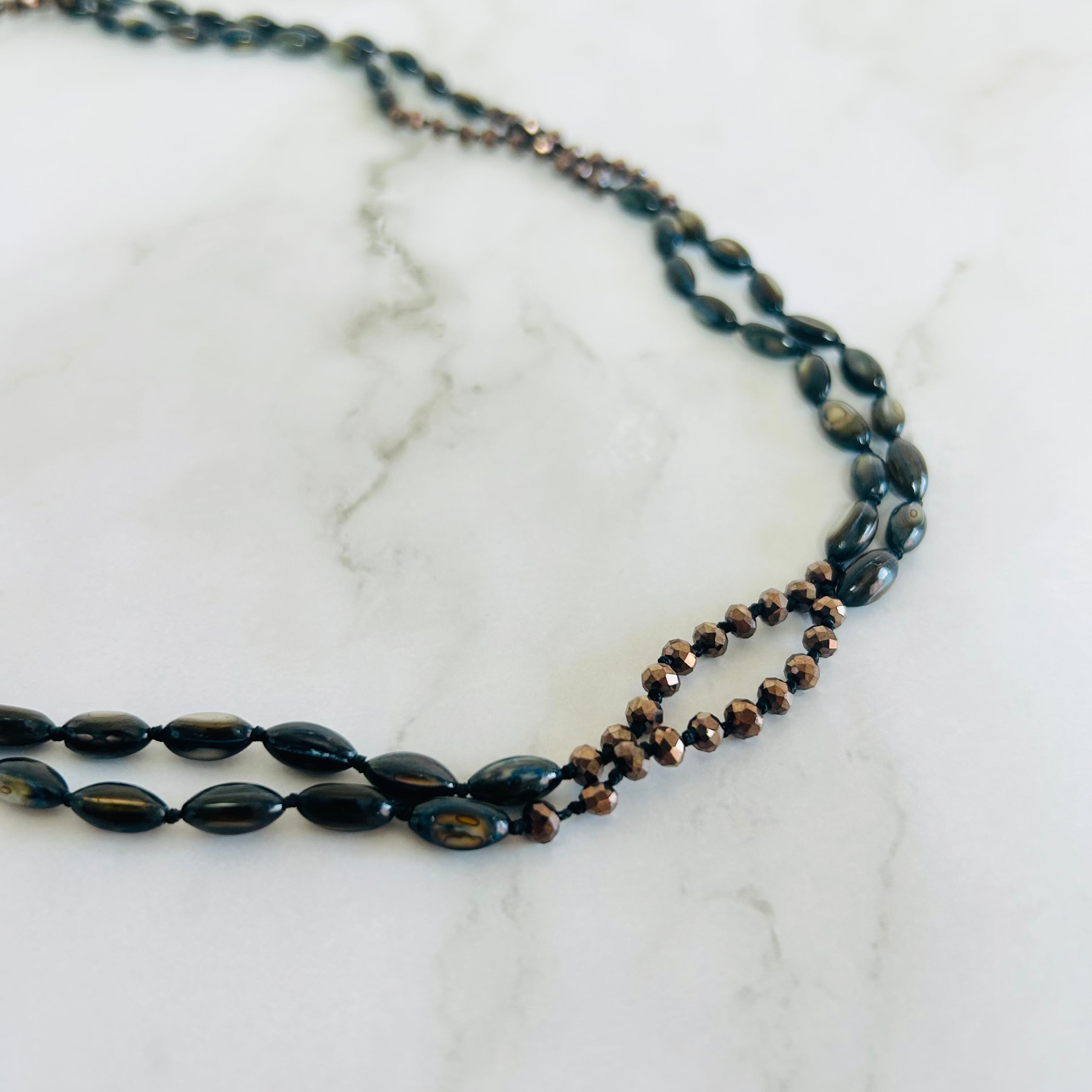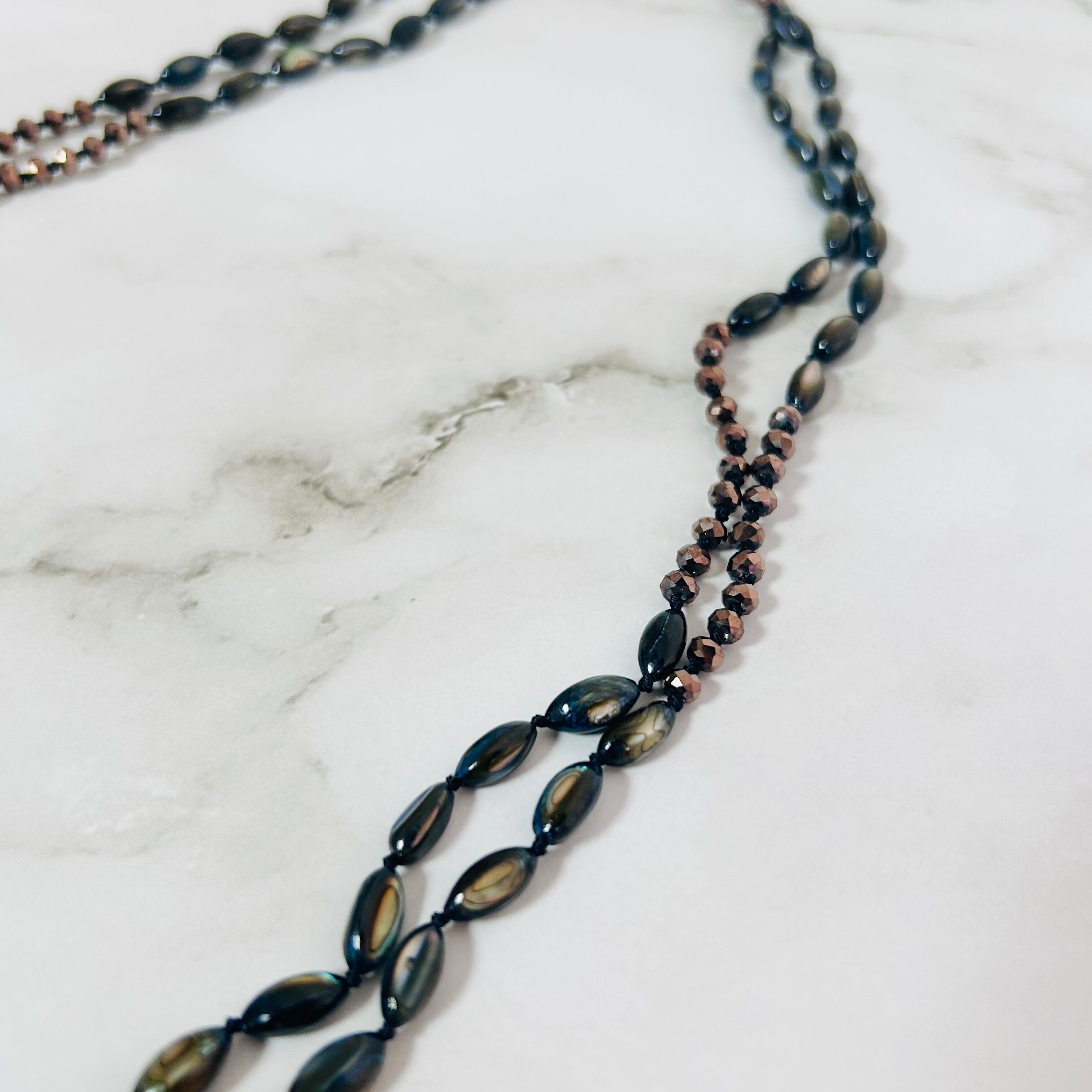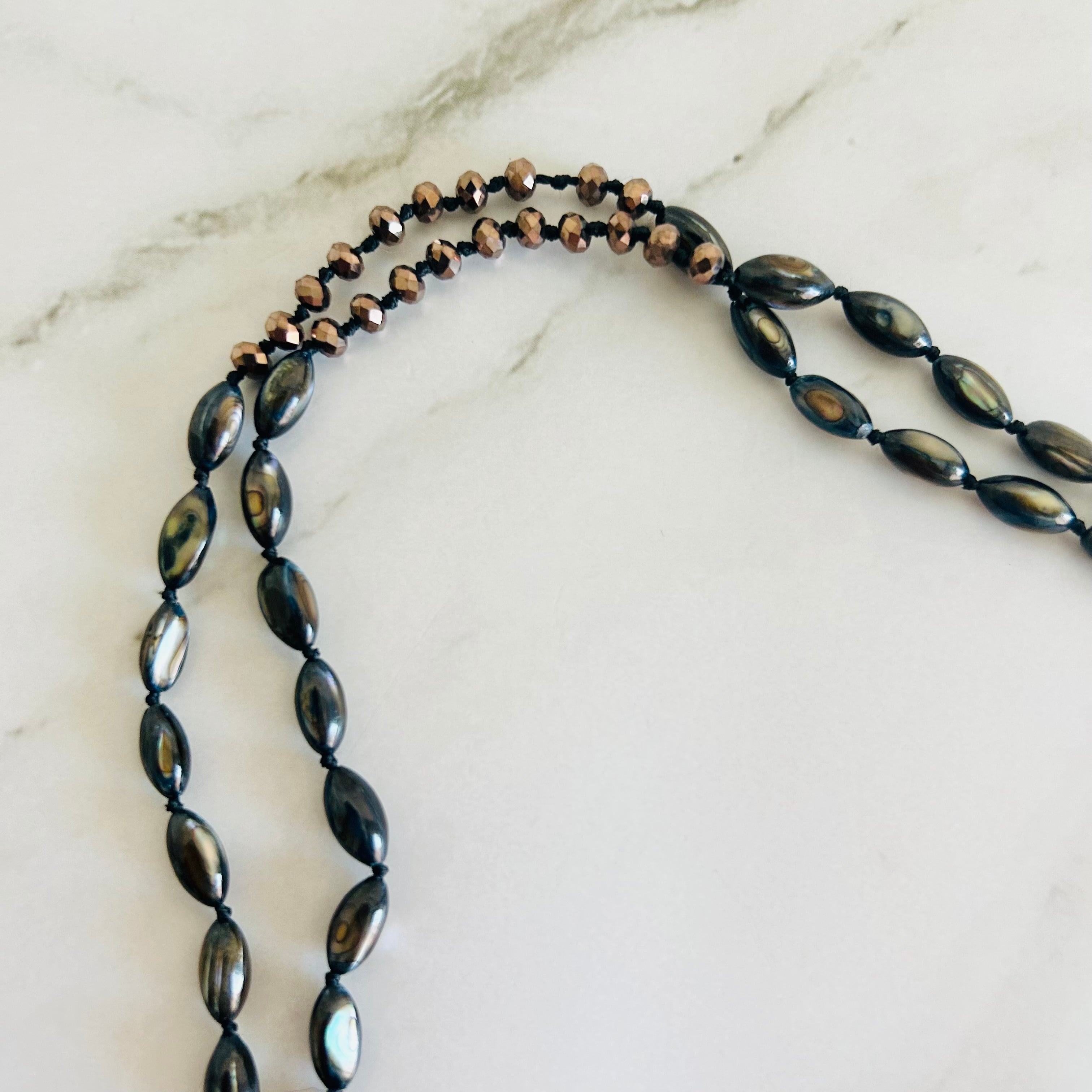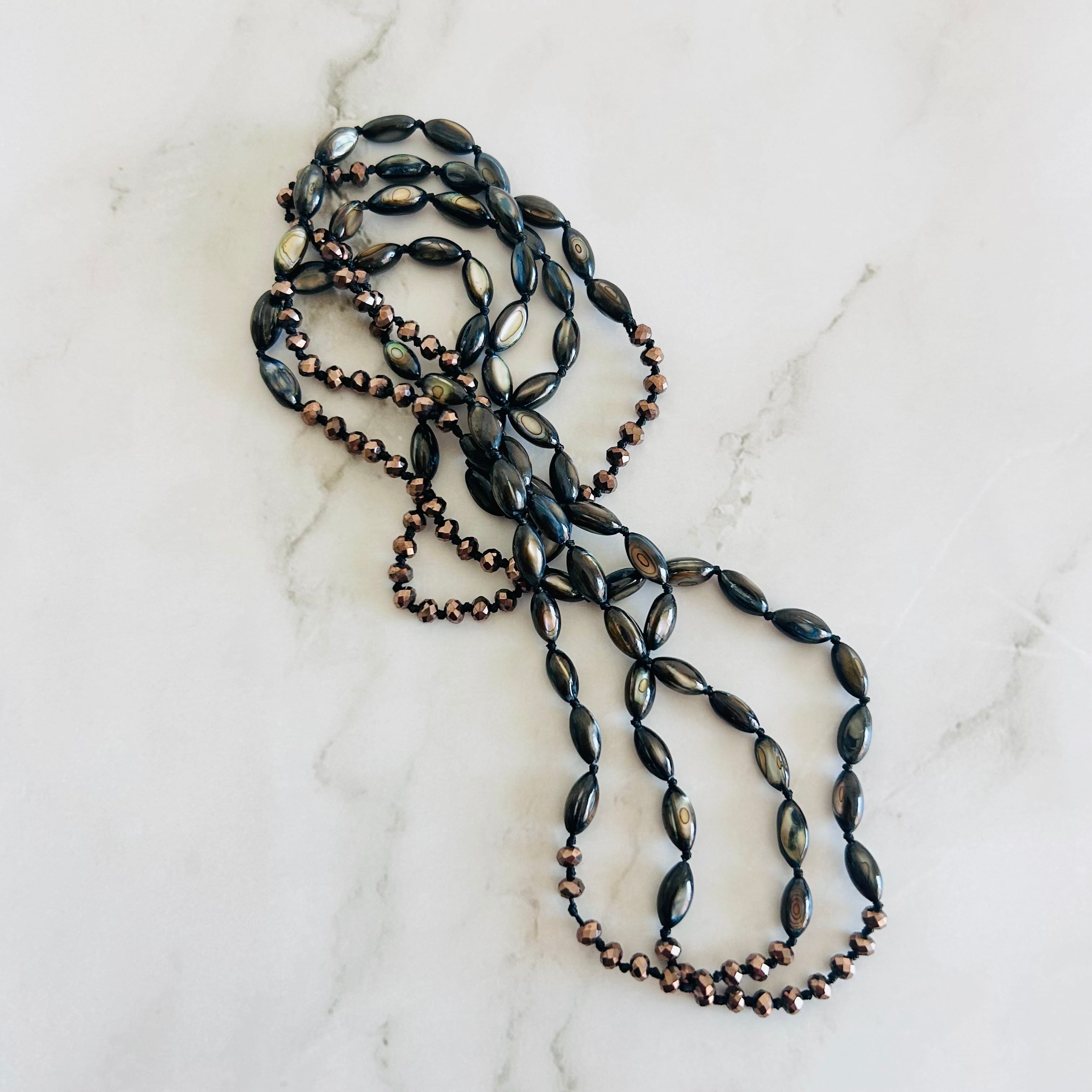 美しい艶のあるシェルと、深みのあるブロンズカラーのチェコビーズが連なる、ロングタイプのネックレスです。