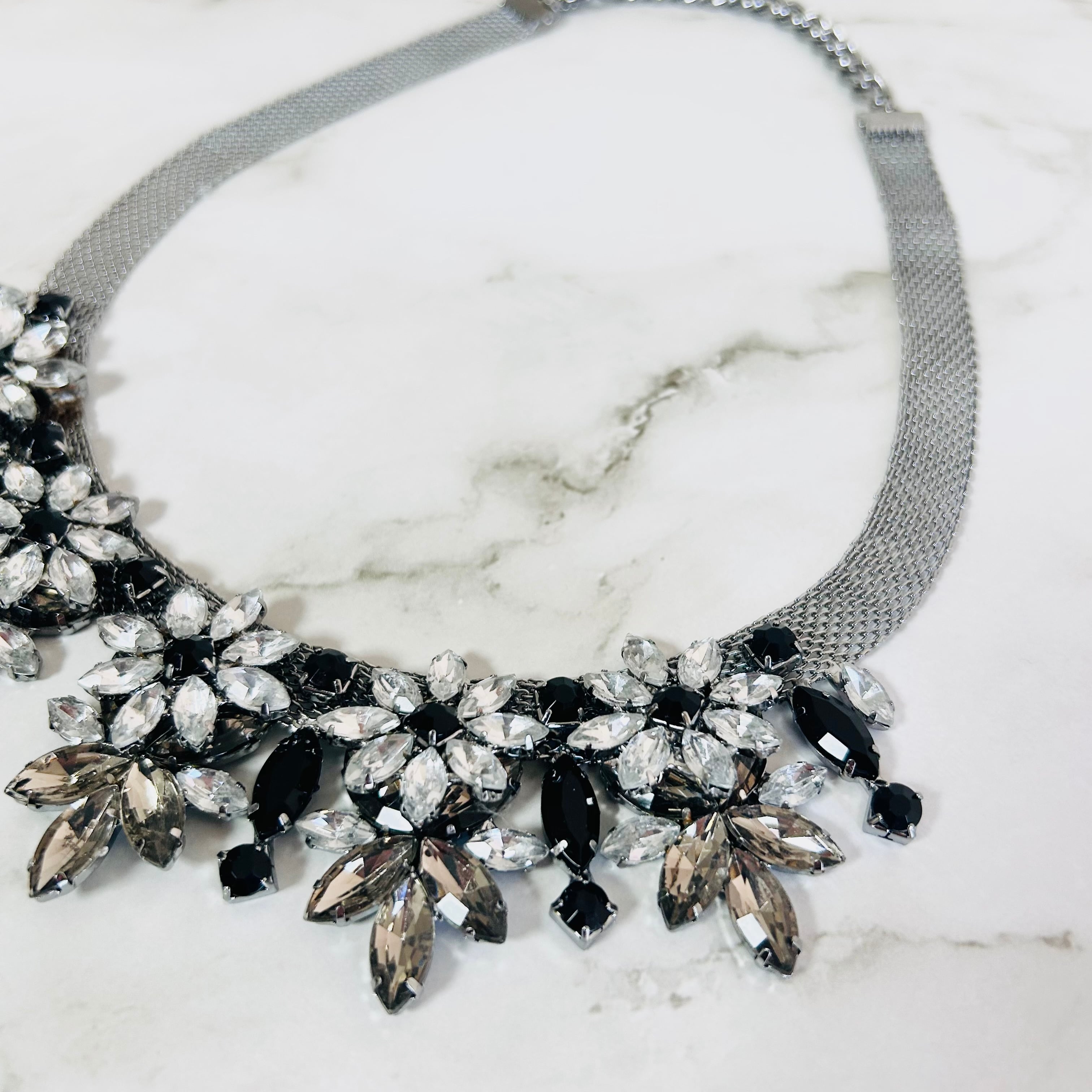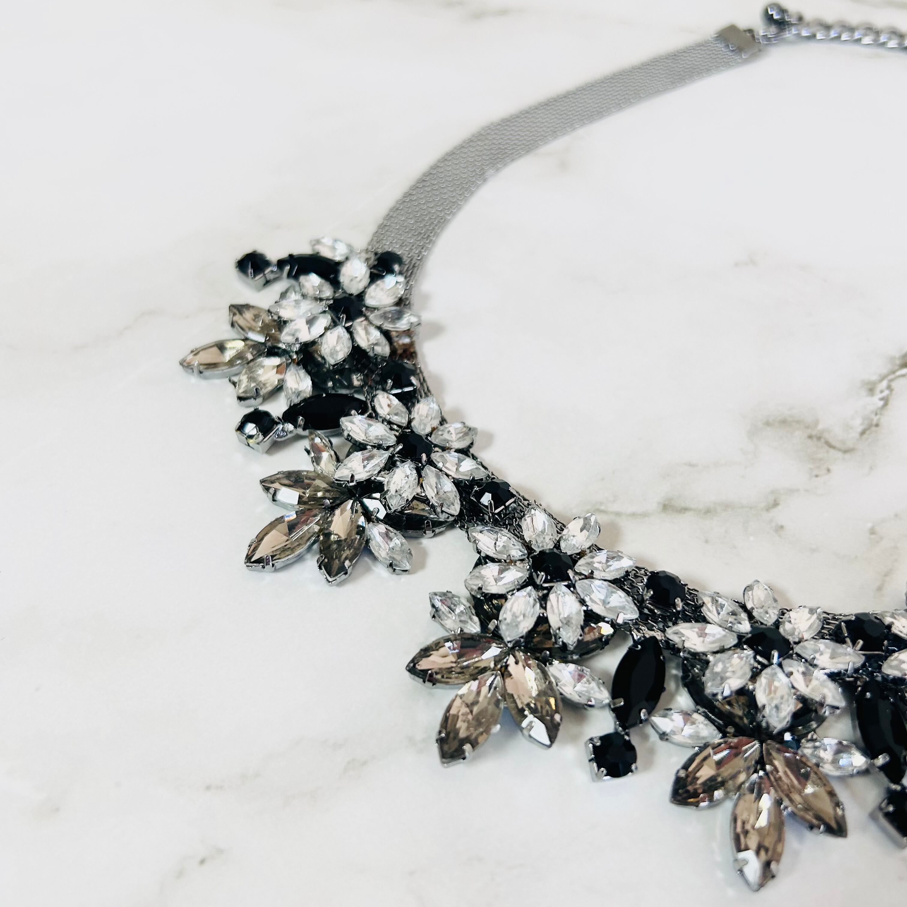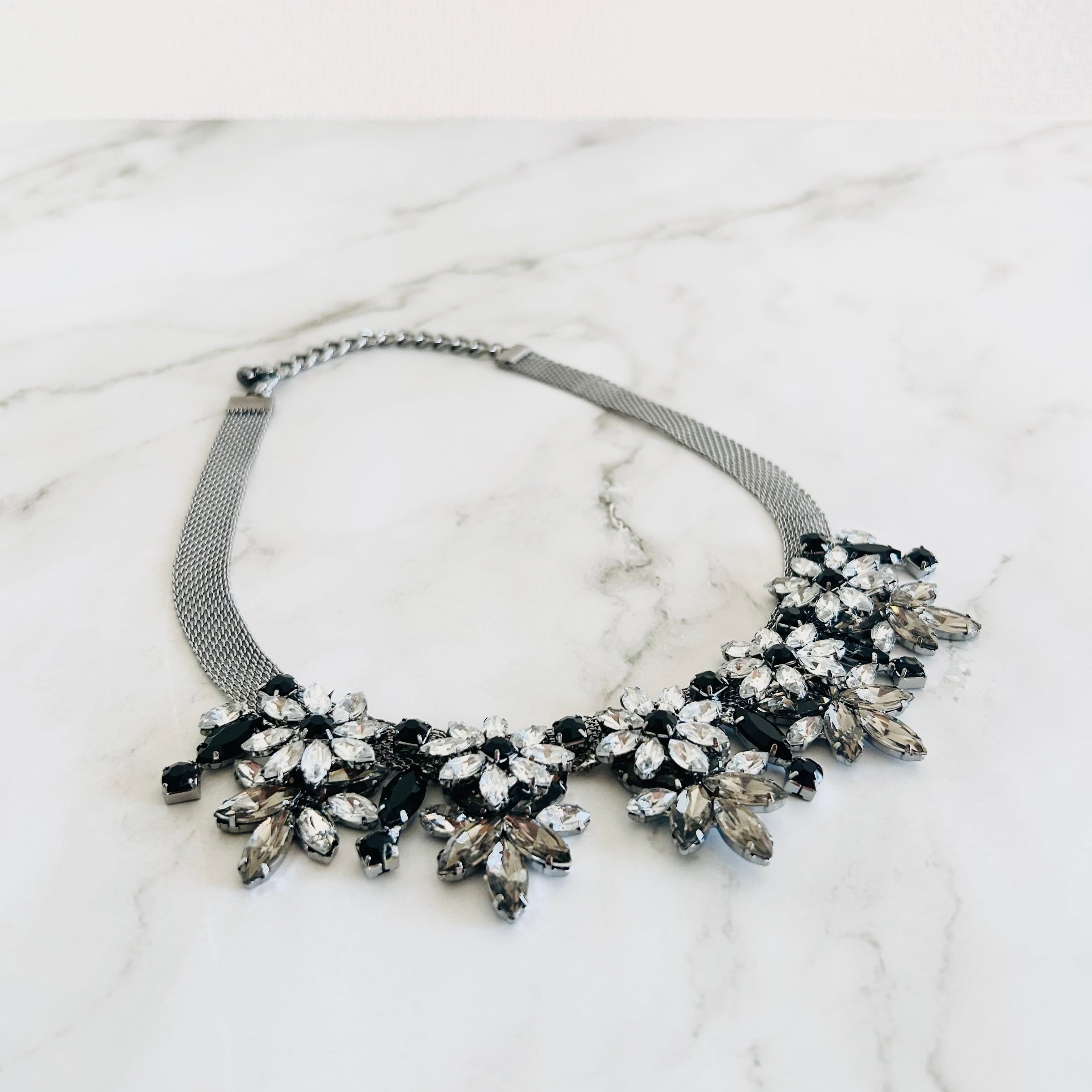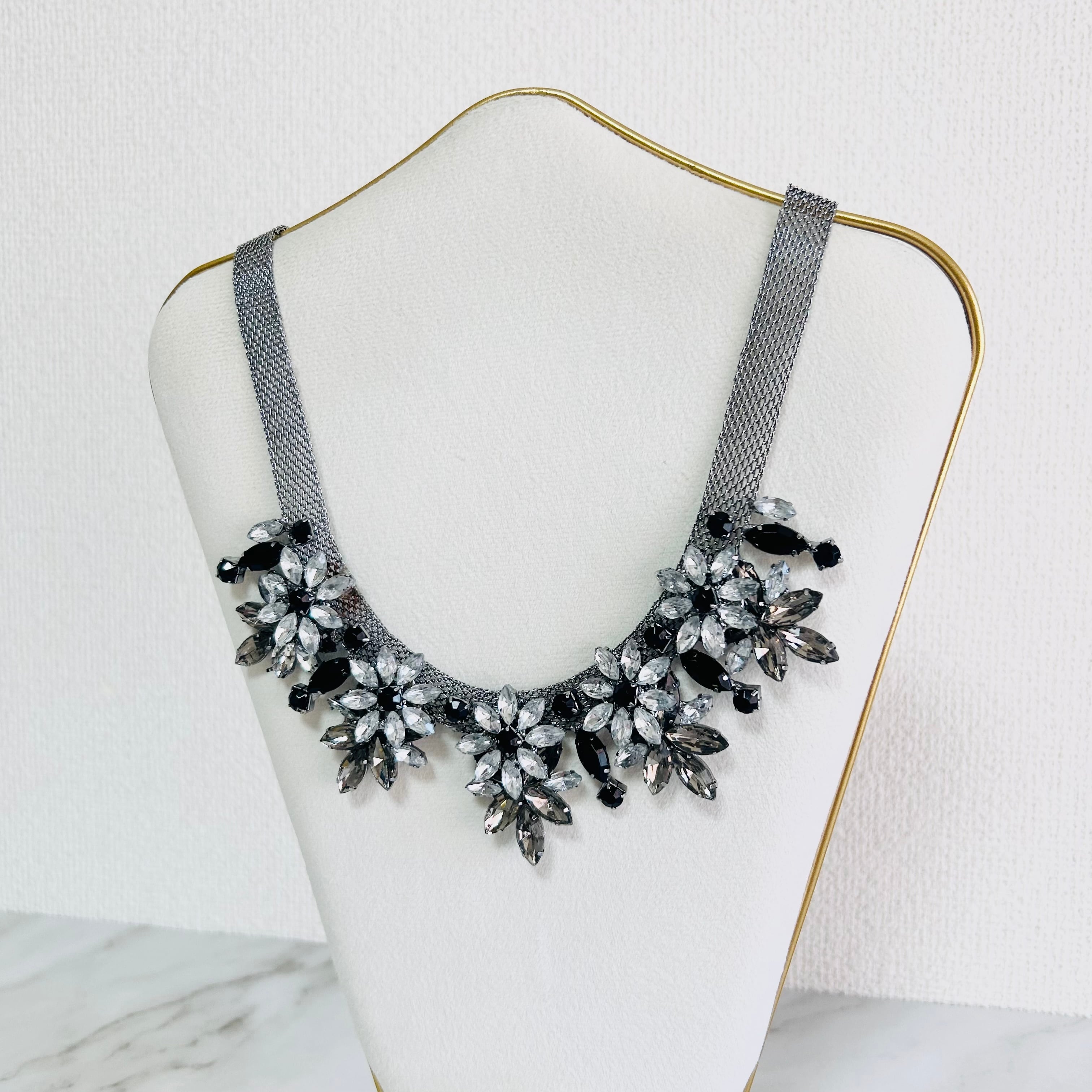 繊細なメッシュチェーンに、贅沢にあしらわれたクリアとブラックのビジューが花のように連なるネックレスです。