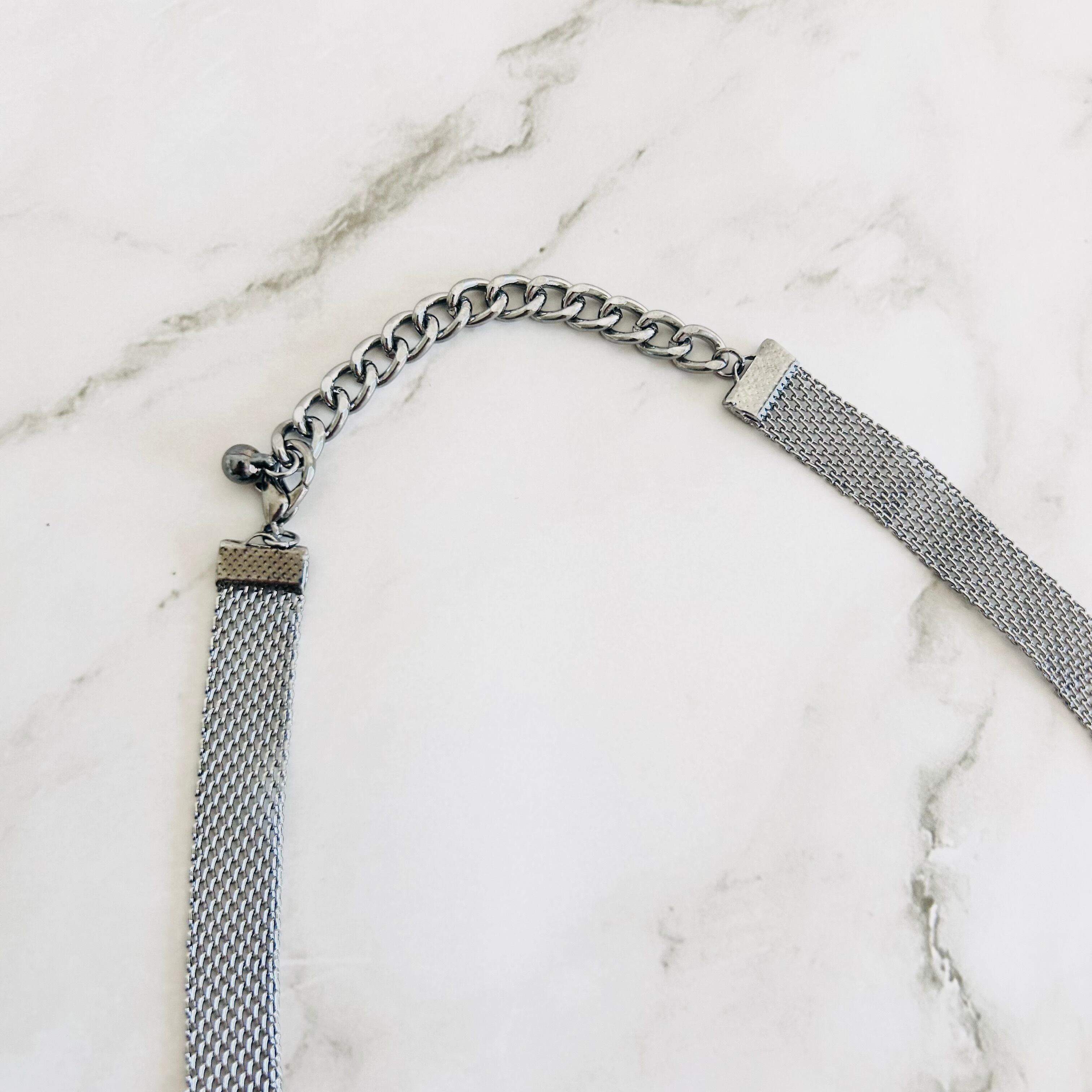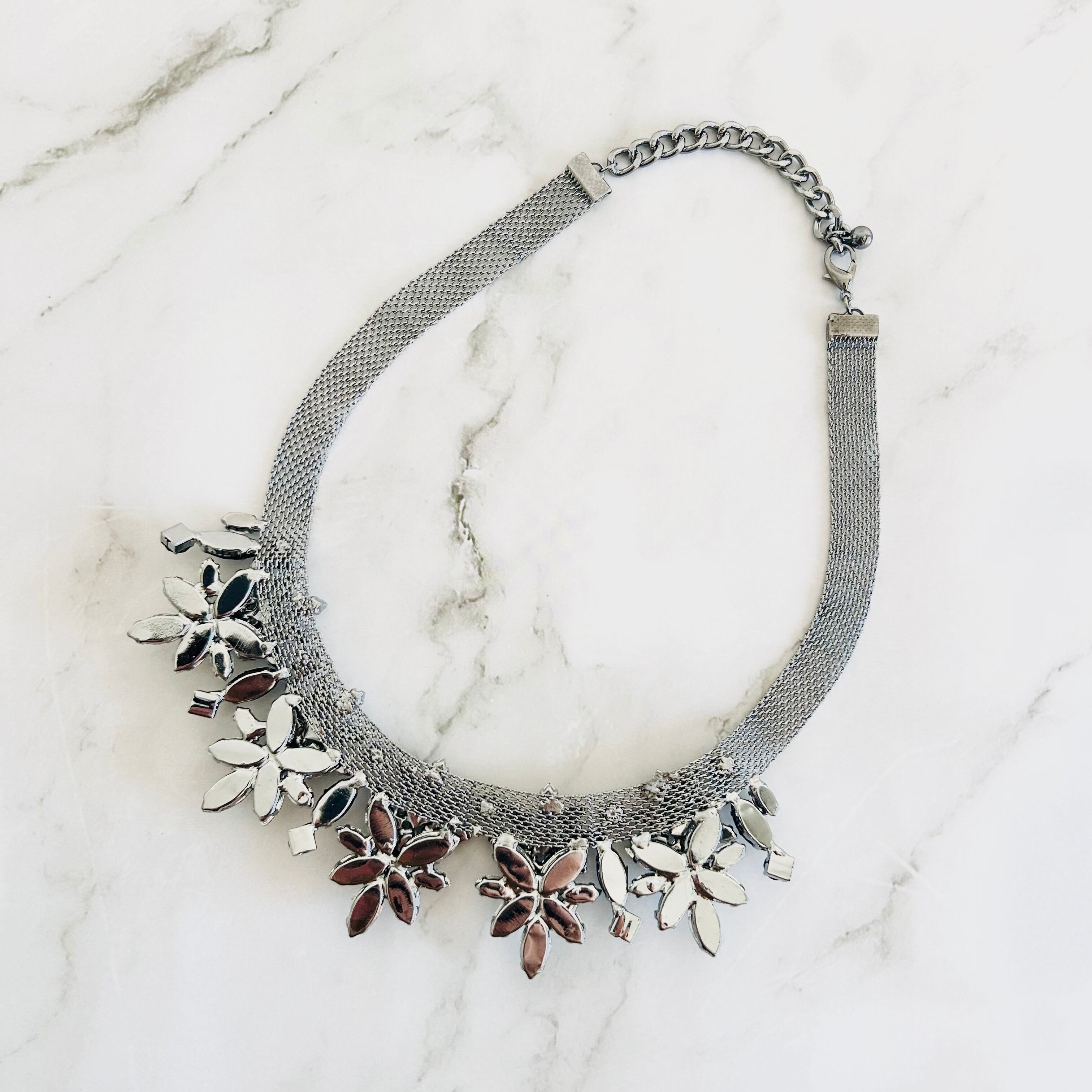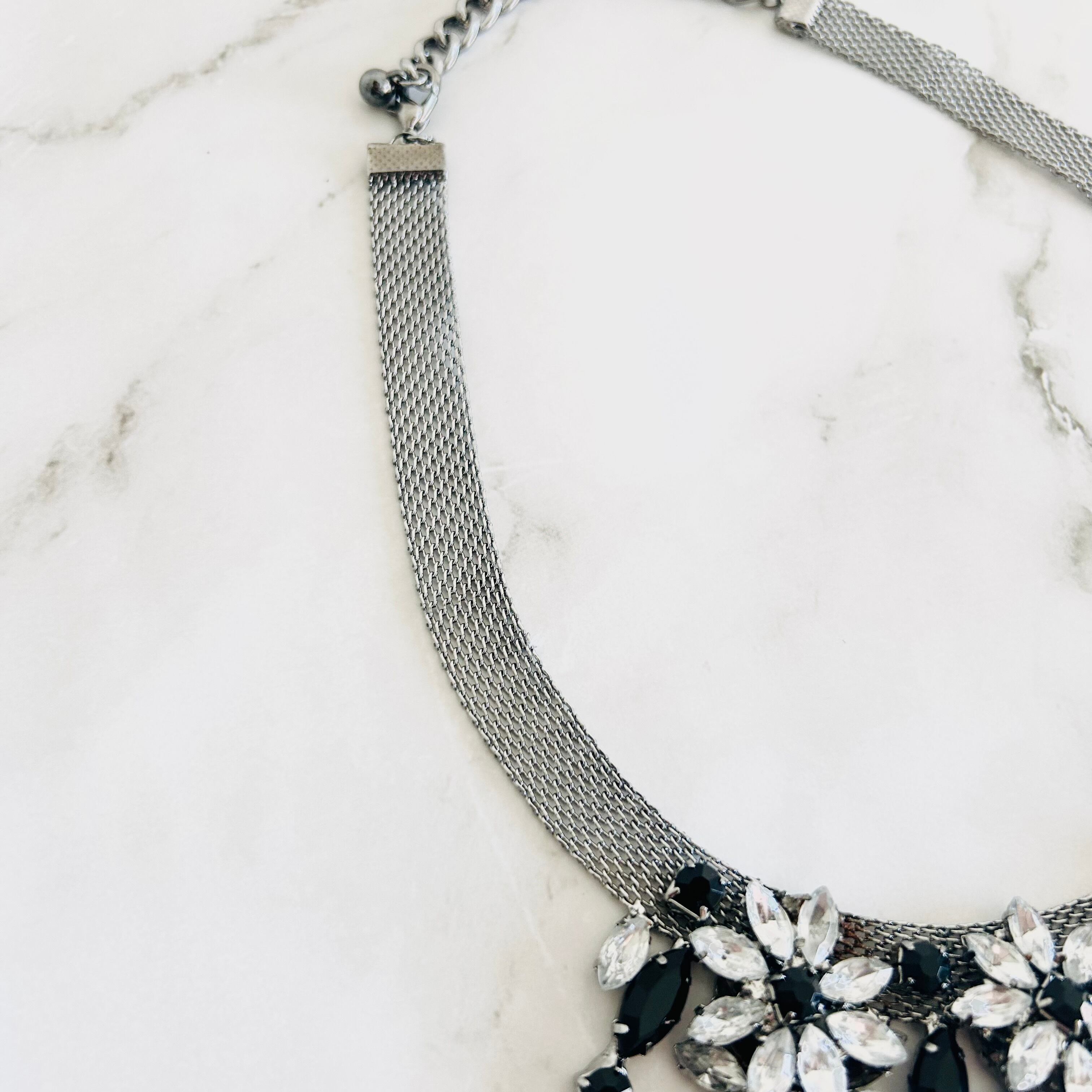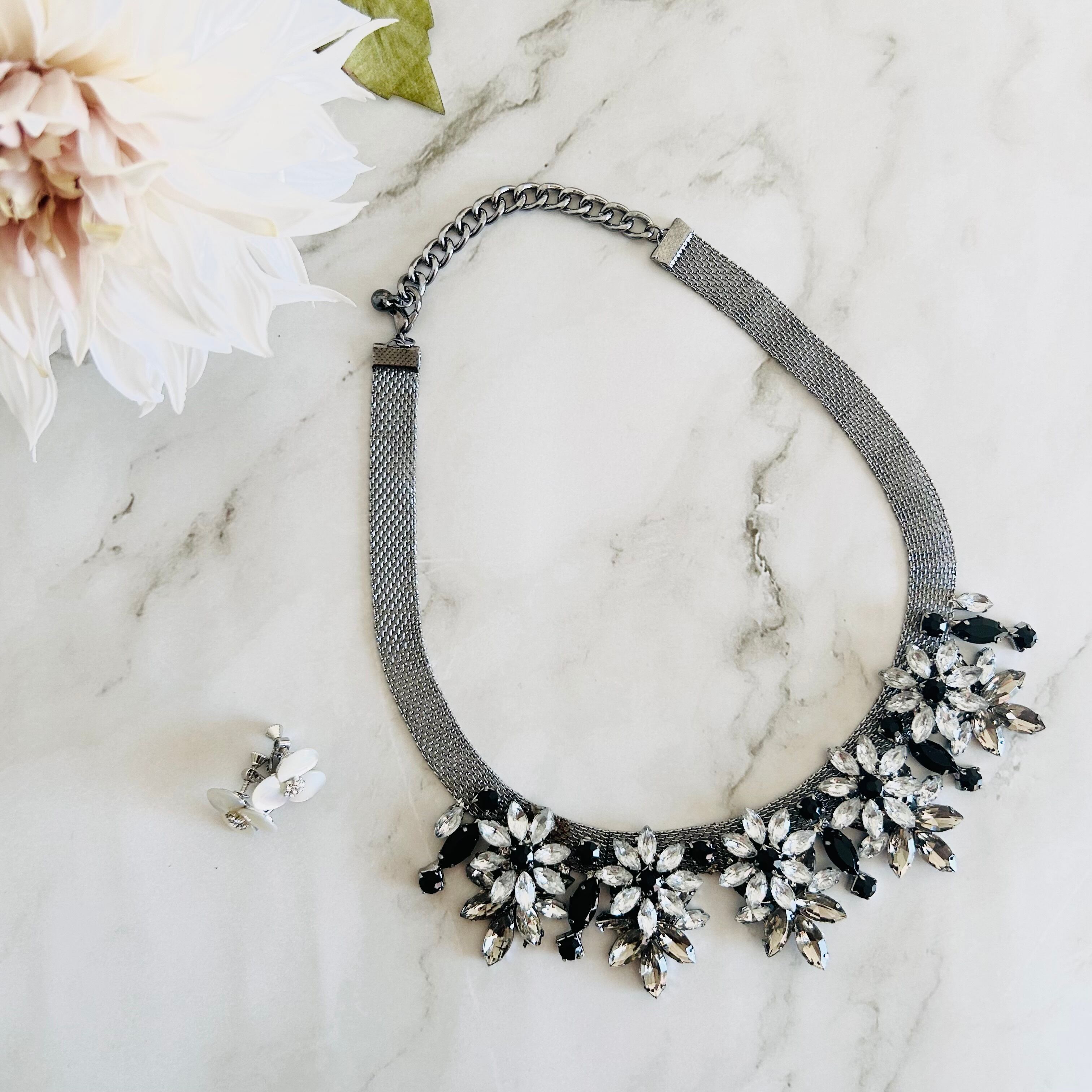 繊細なメッシュチェーンに、贅沢にあしらわれたクリアとブラックのビジューが花のように連なるネックレスです。