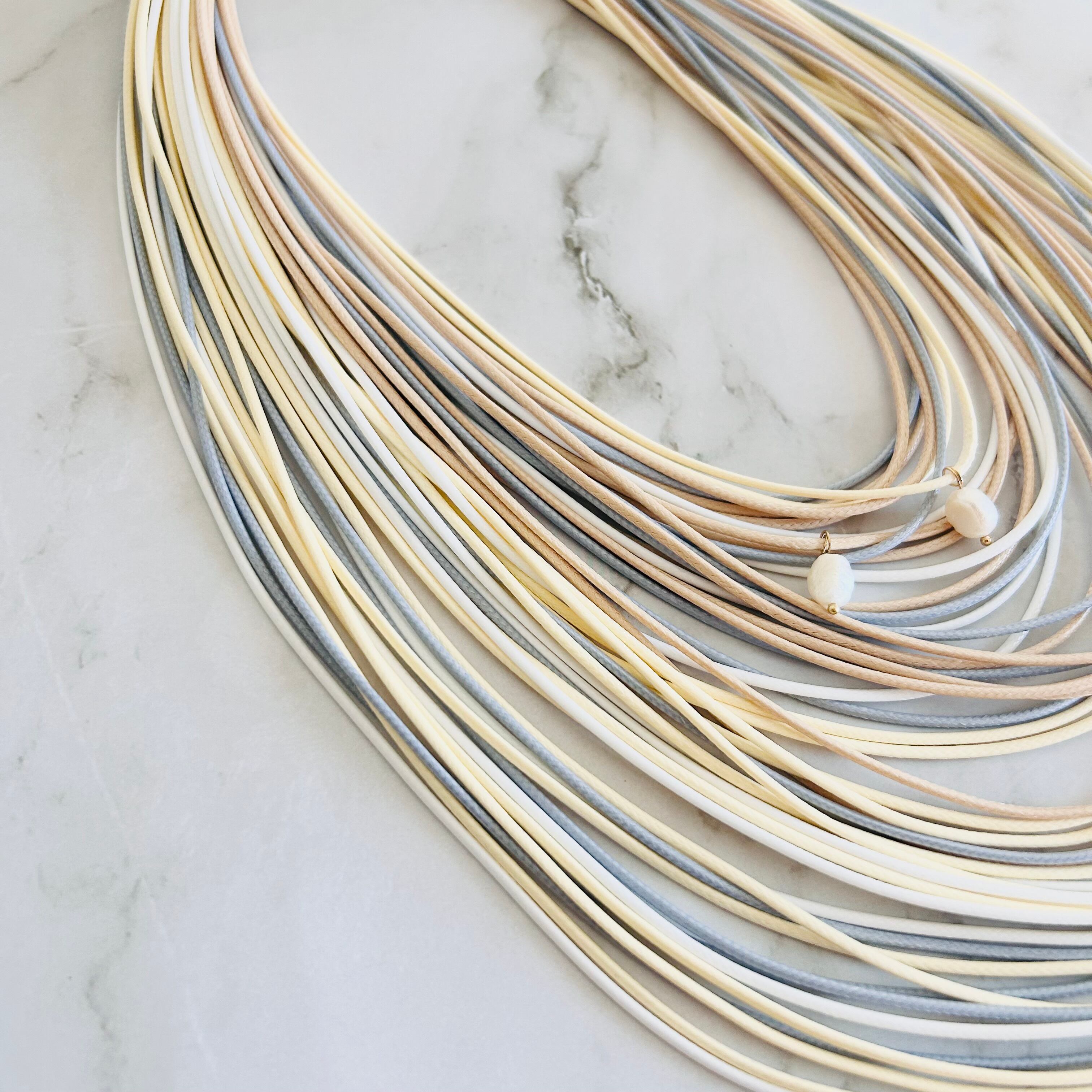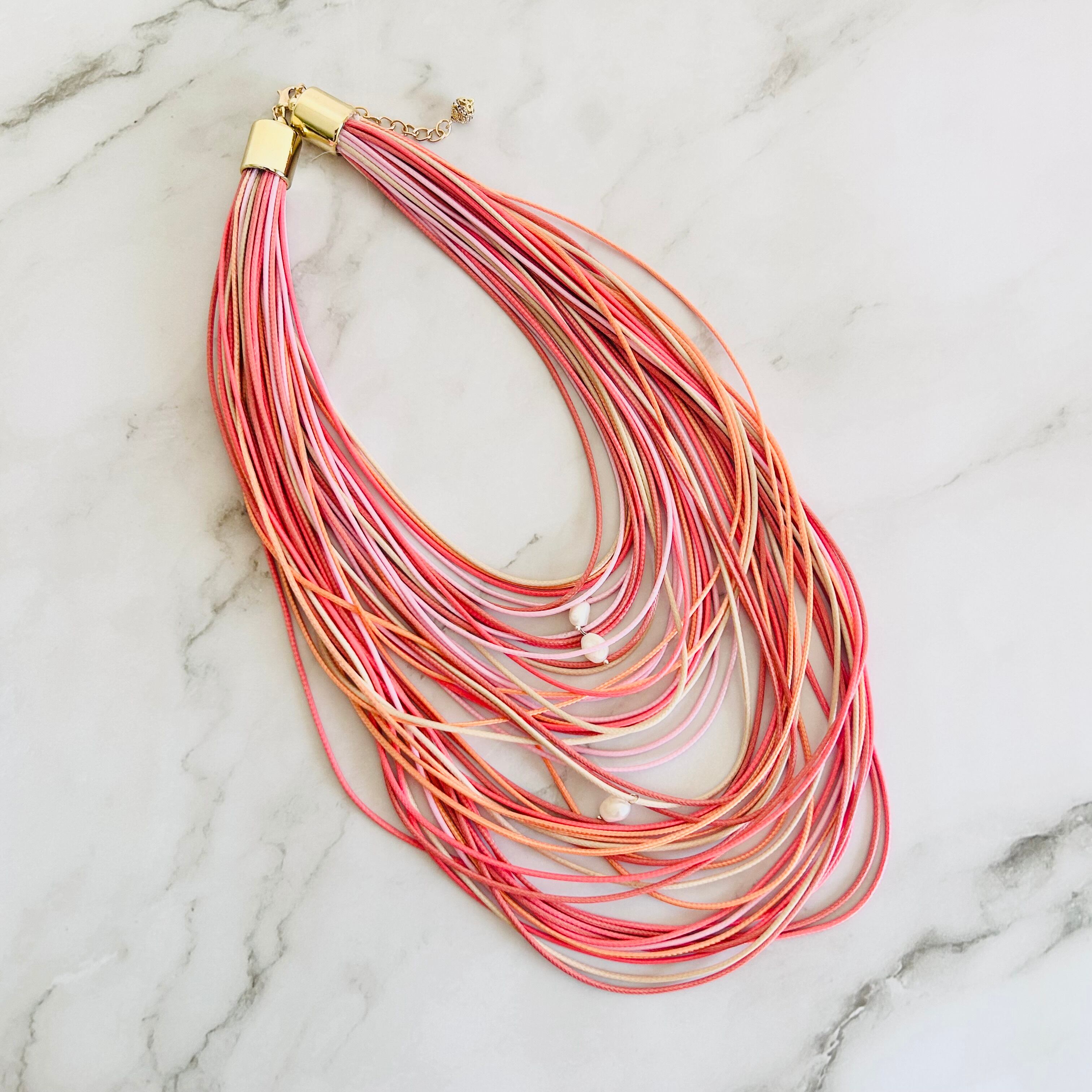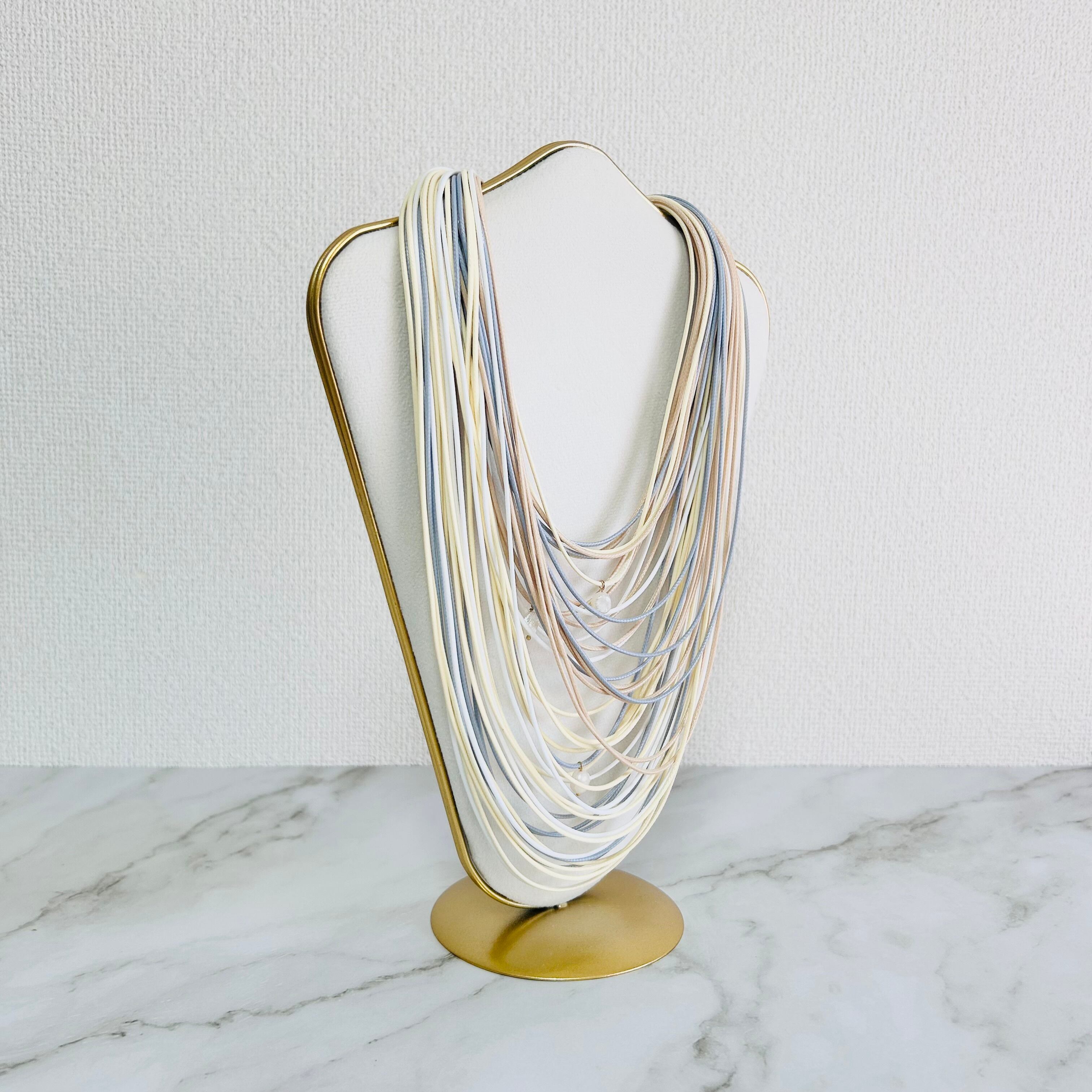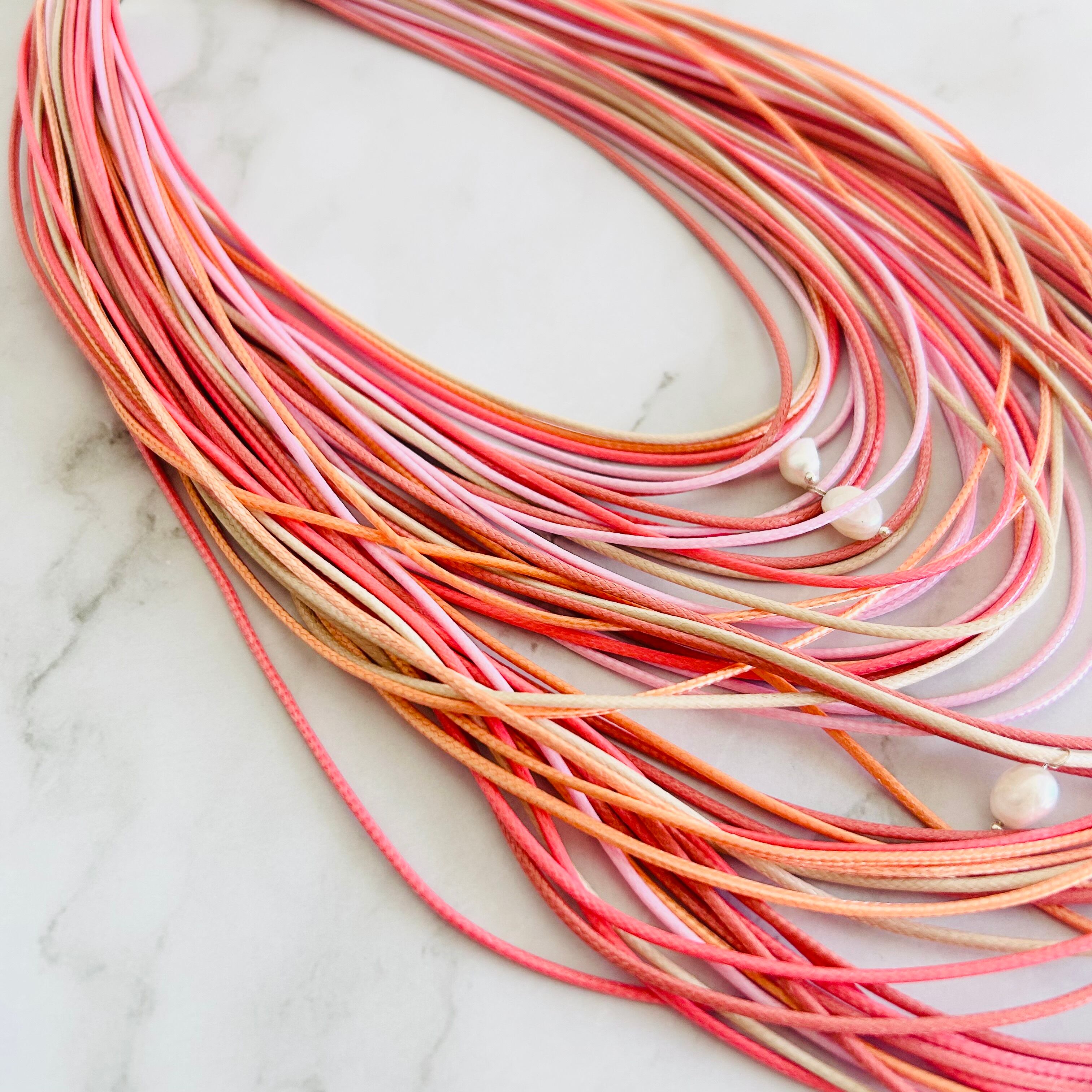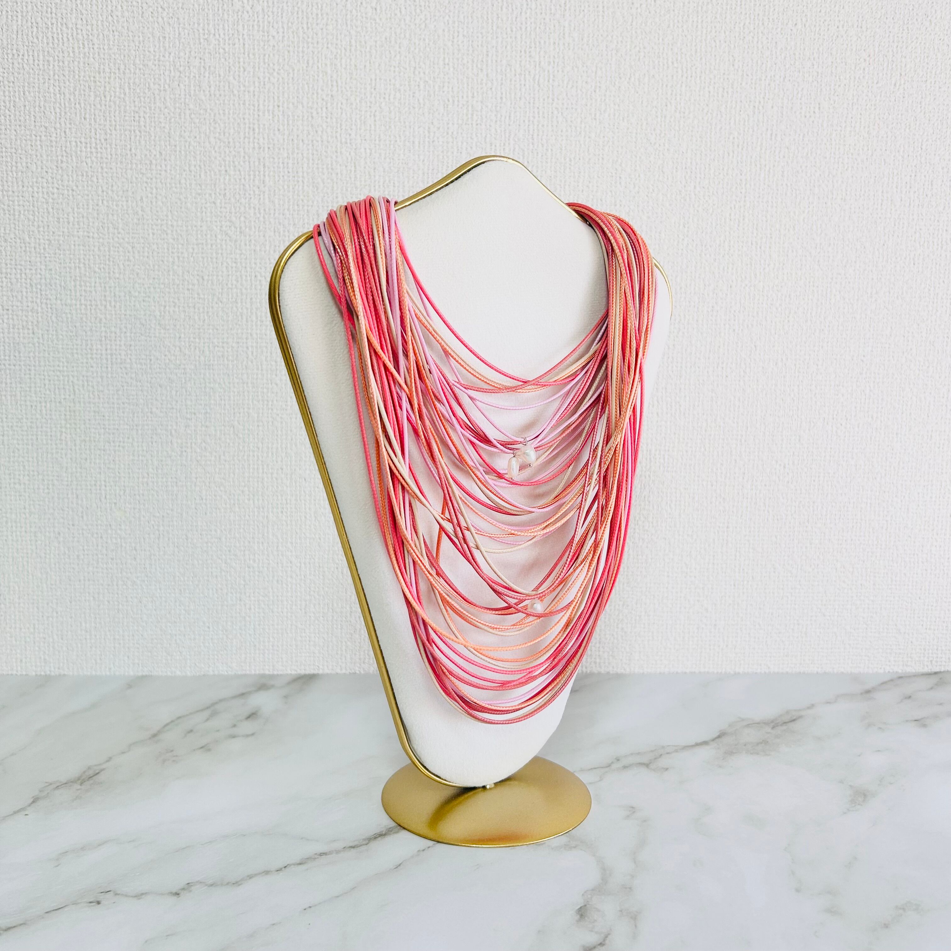 色とりどりの細いコードを何重にも重ね、天然淡水パールをアクセントにあしらった華やかなネックレスです。