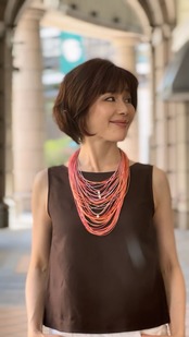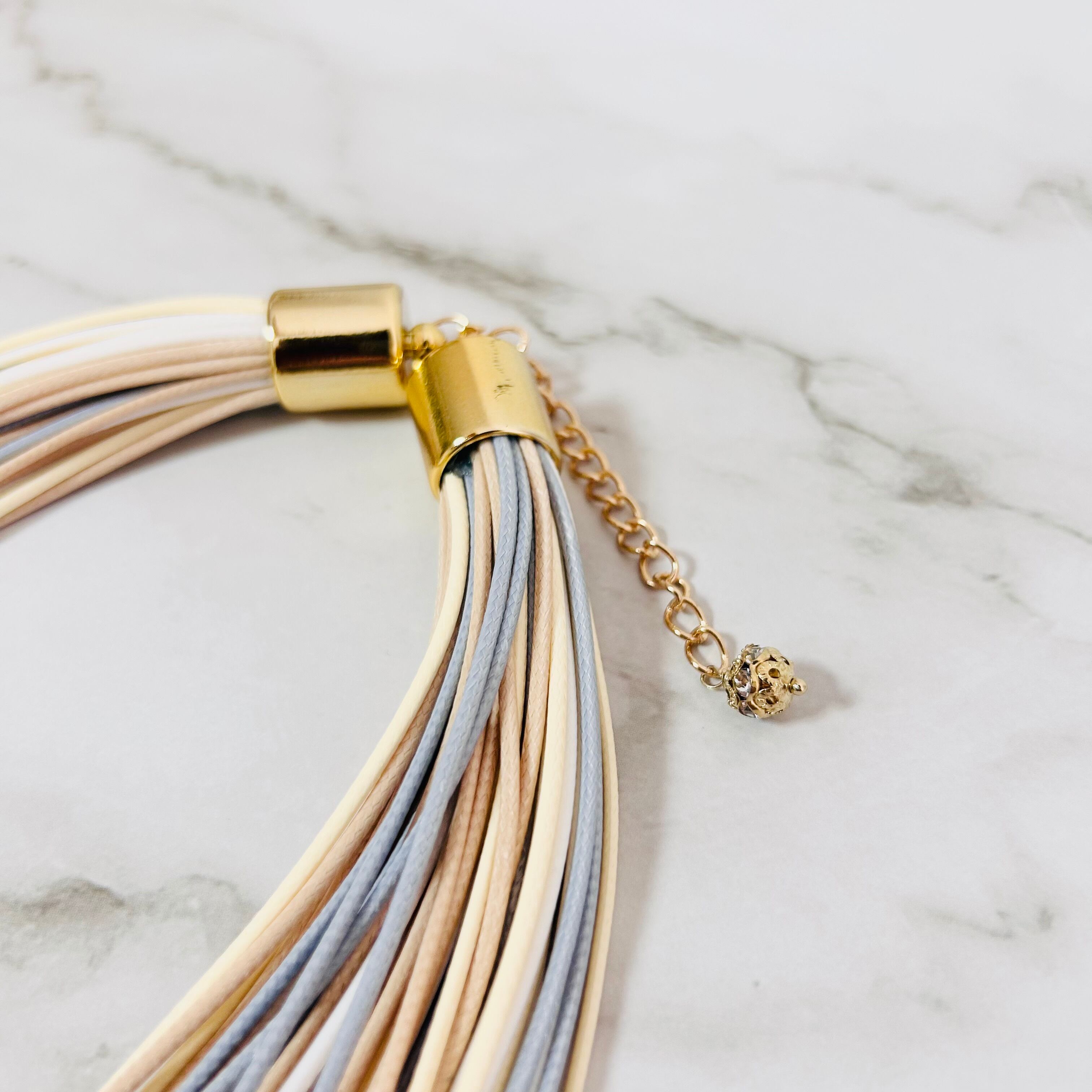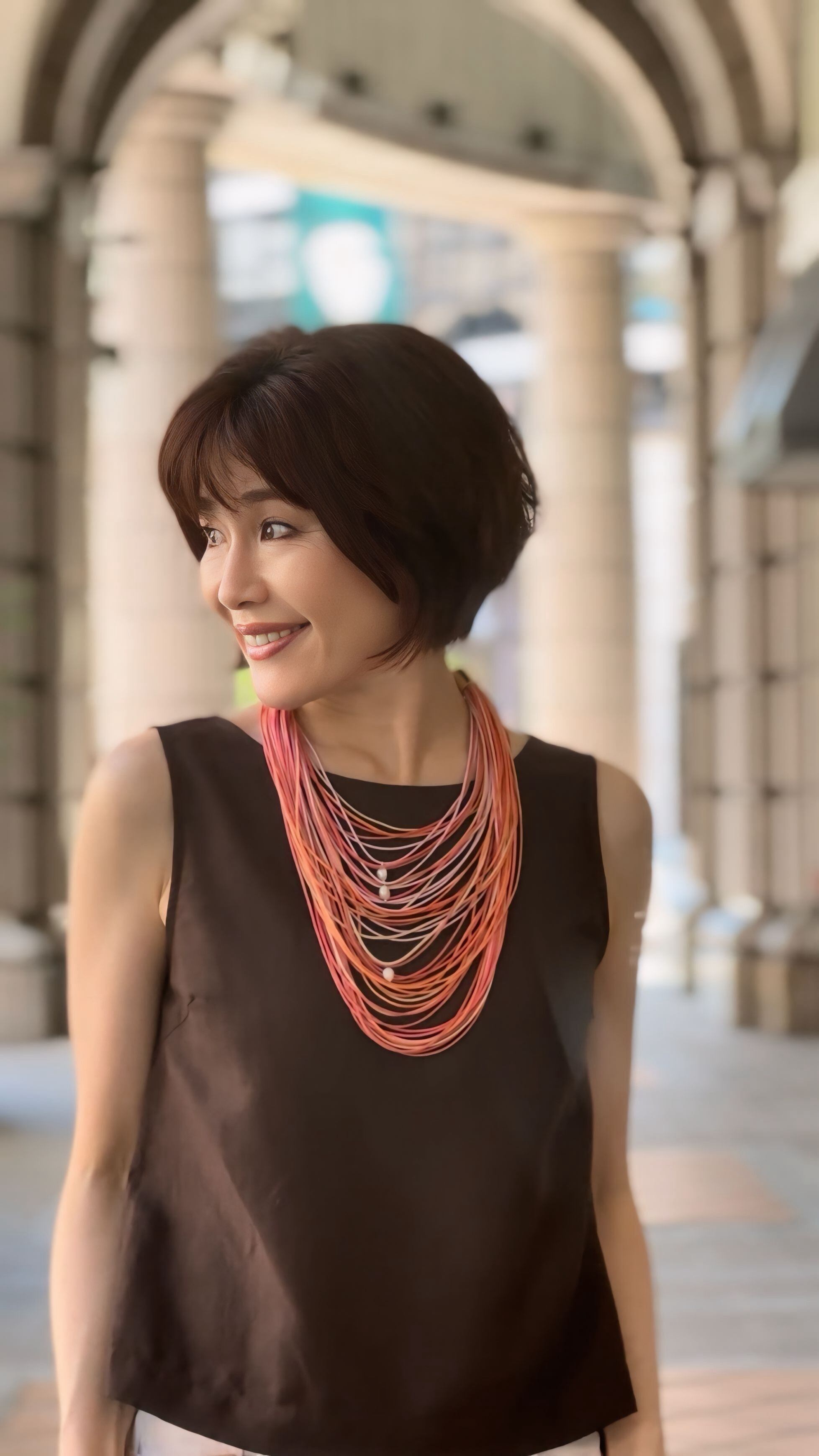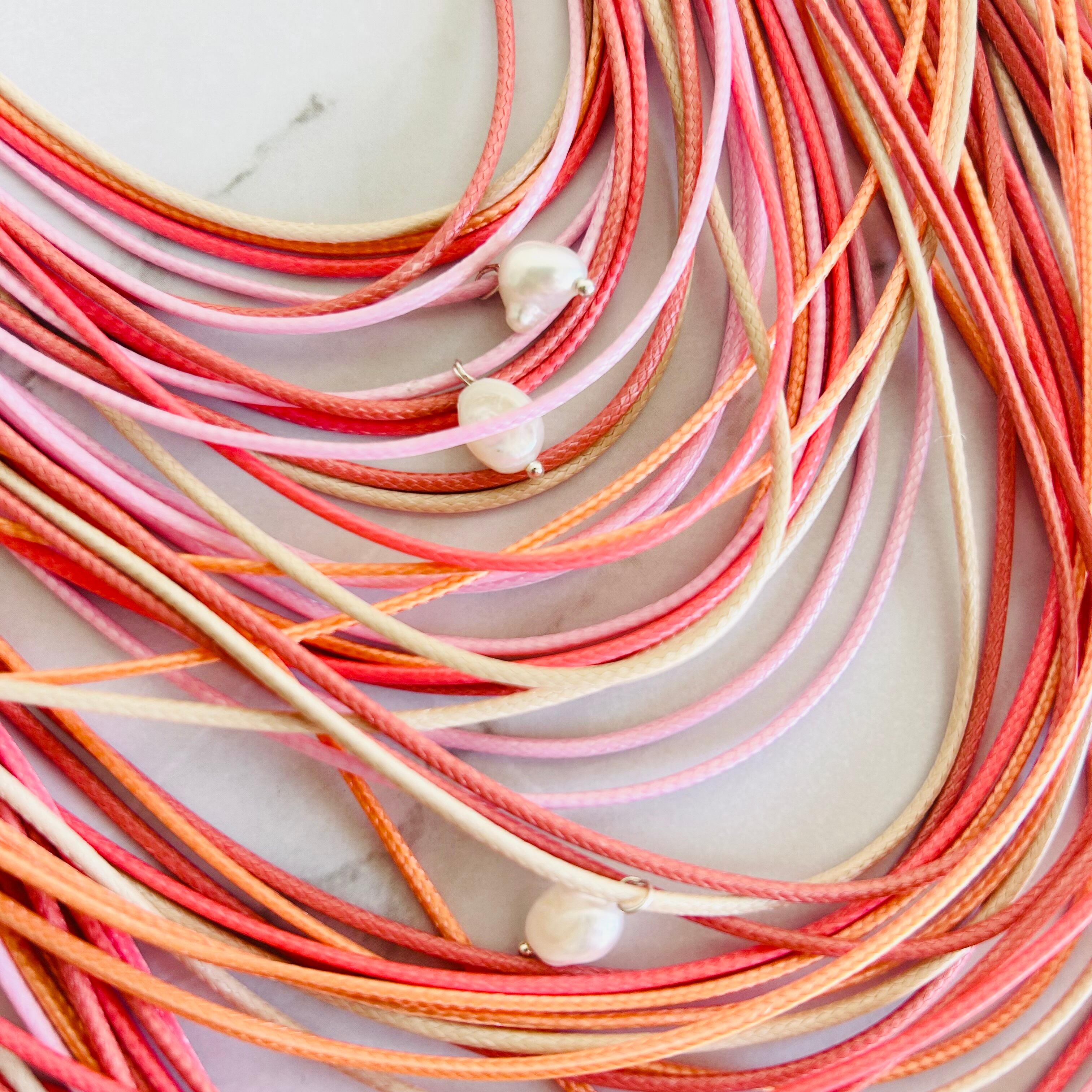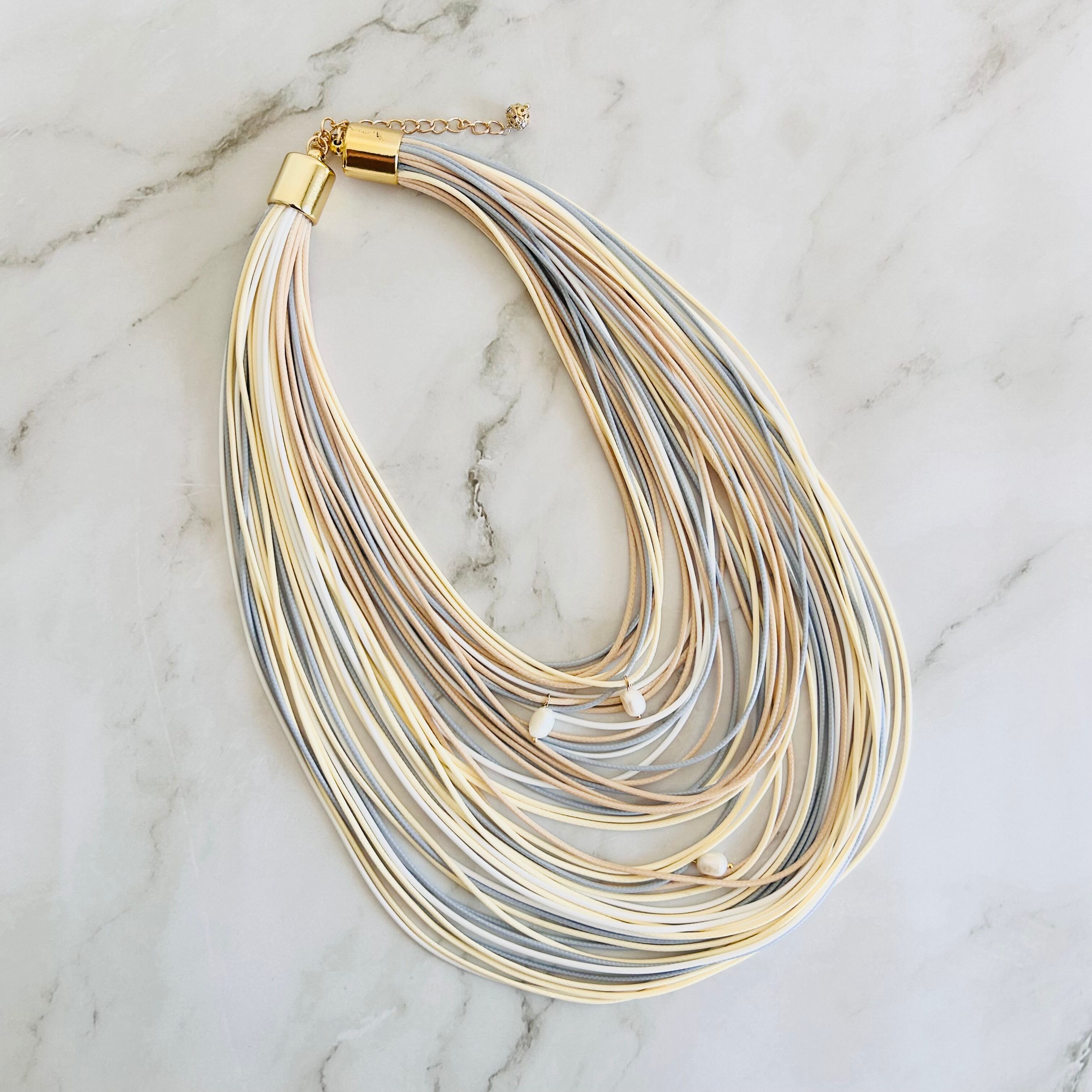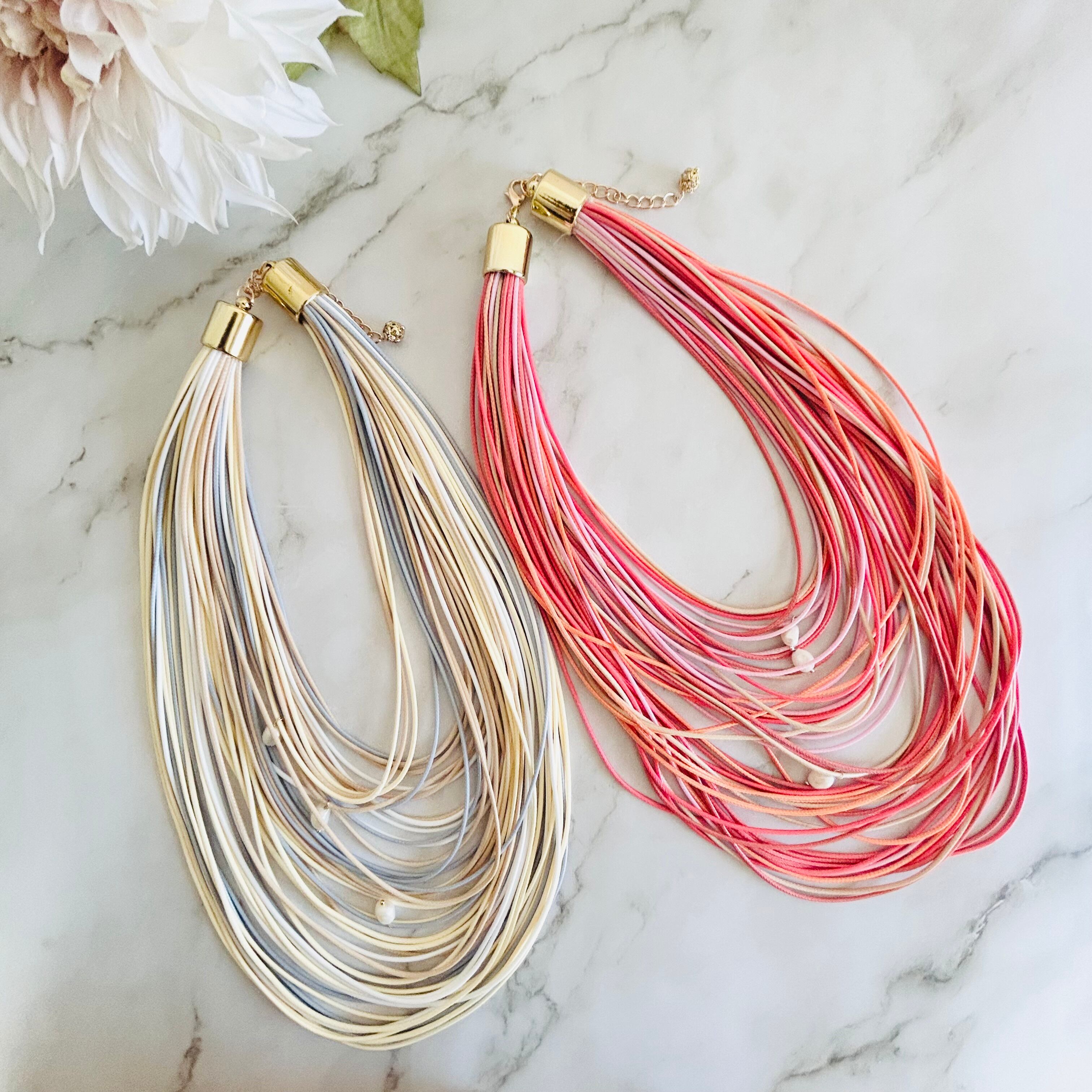 色とりどりの細いコードを何重にも重ね、天然淡水パールをアクセントにあしらった華やかなネックレスです。