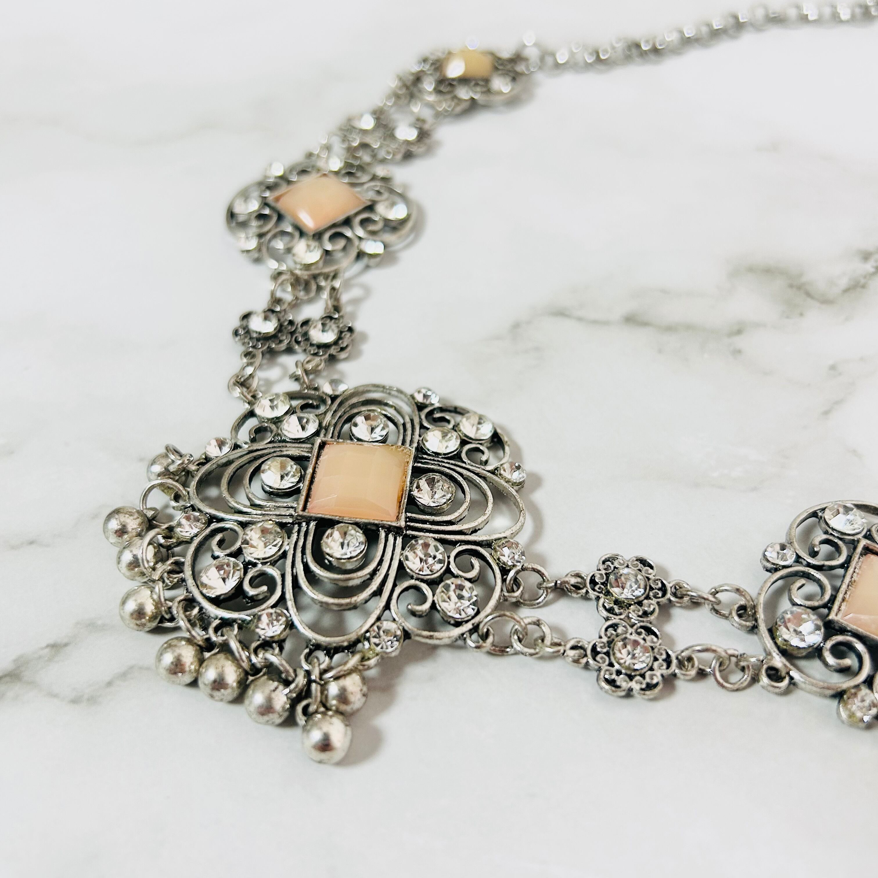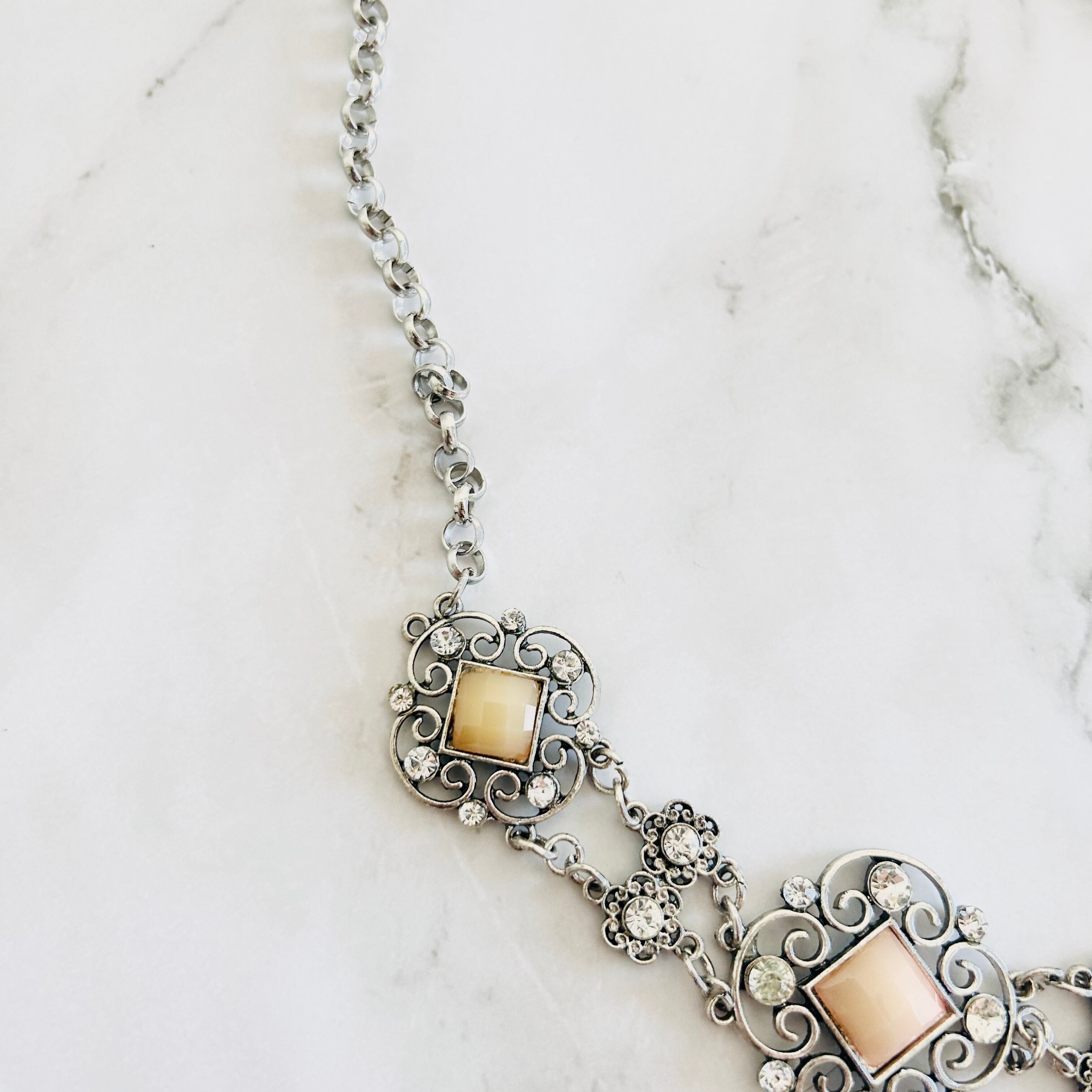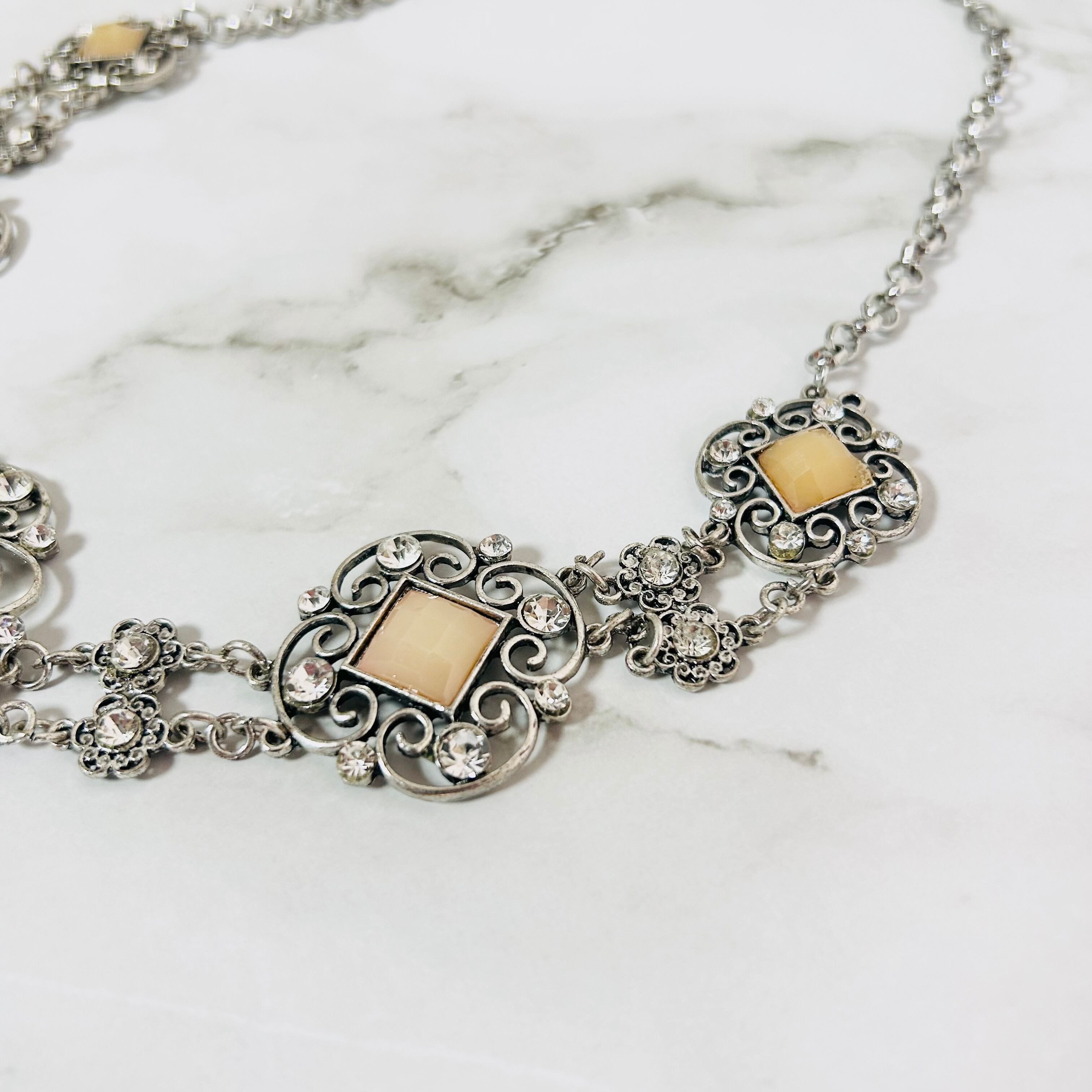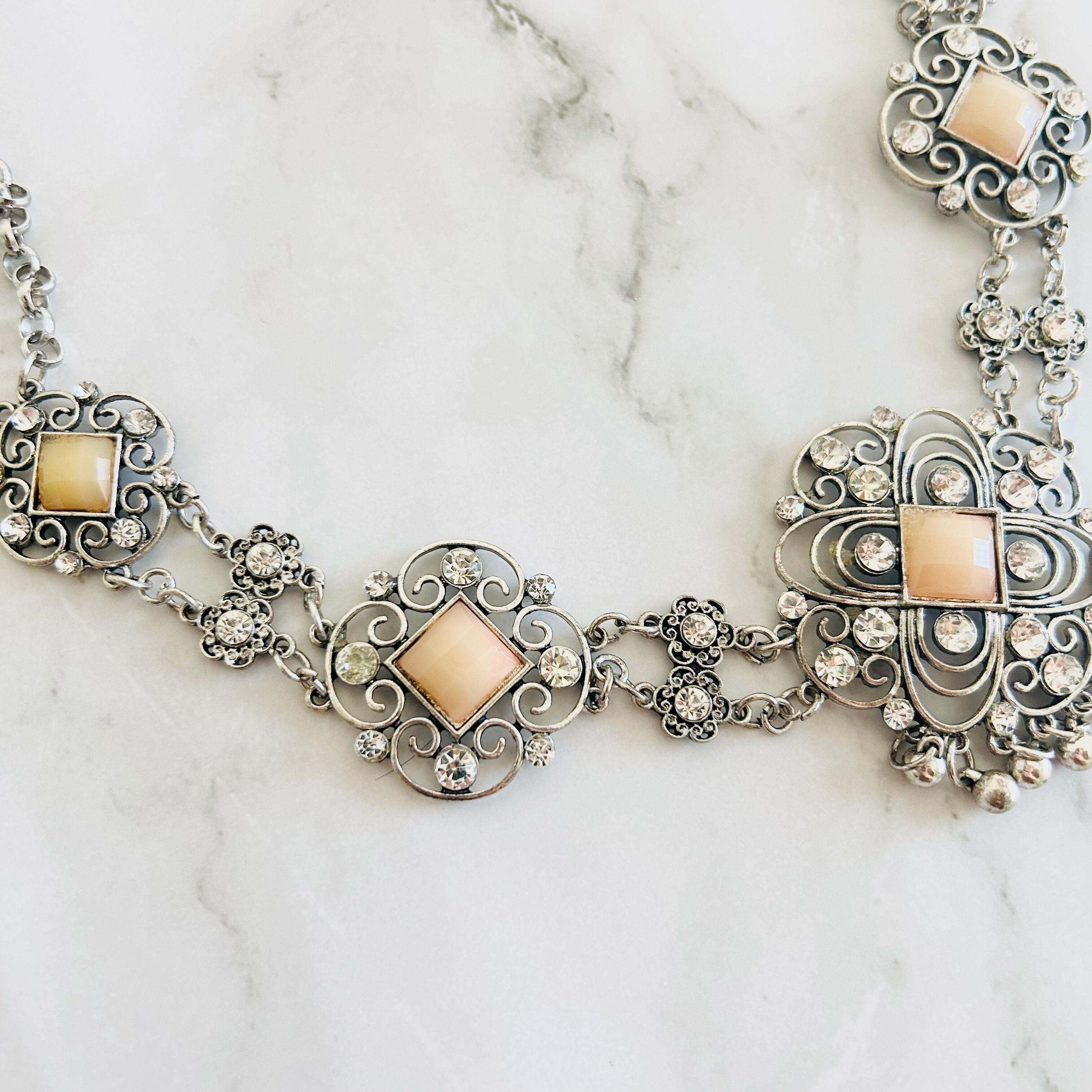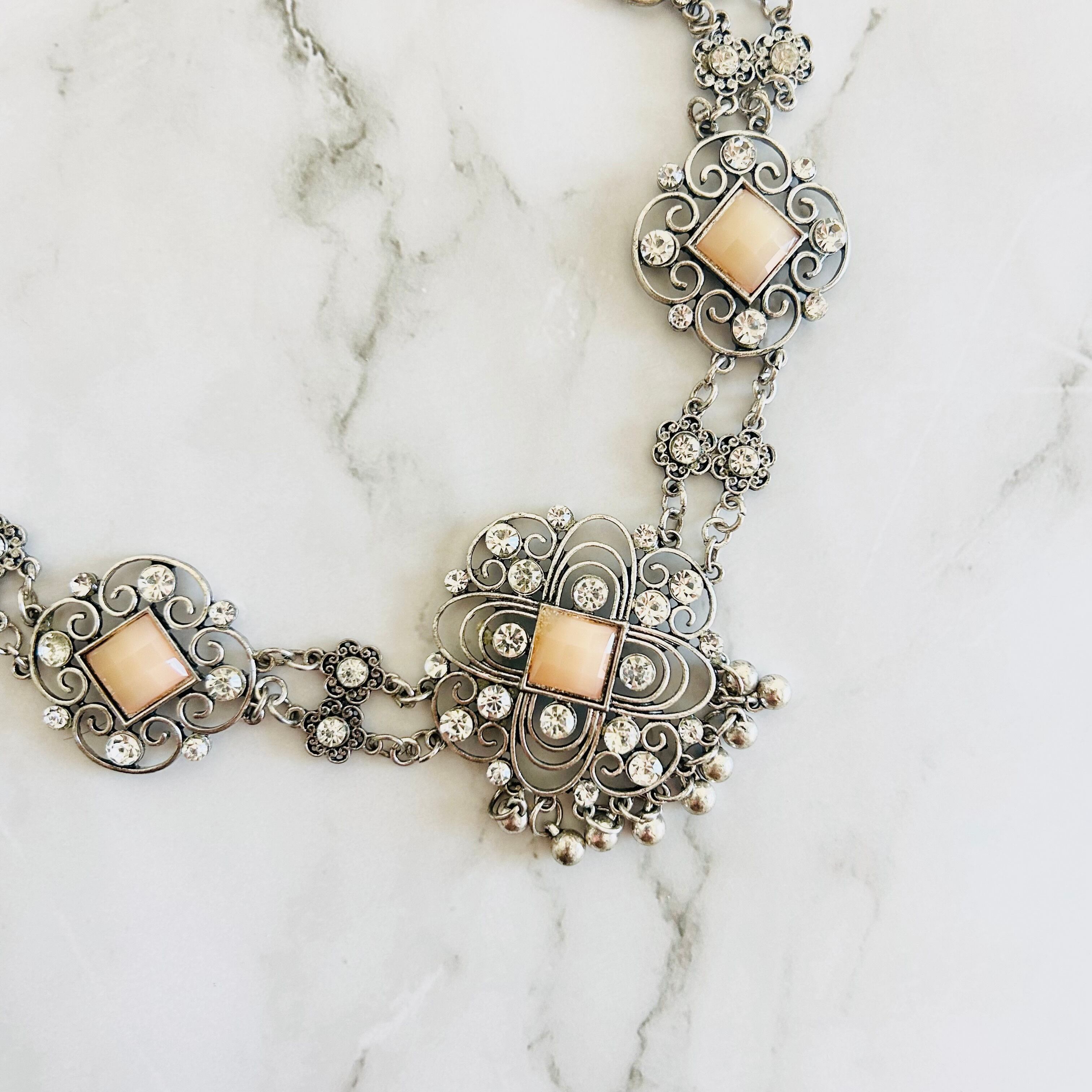 艶やかなピーチカラーのスクエアパーツとラインストーンが、装飾的なシルバーフレームを取り囲むデザインです。