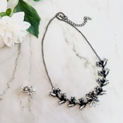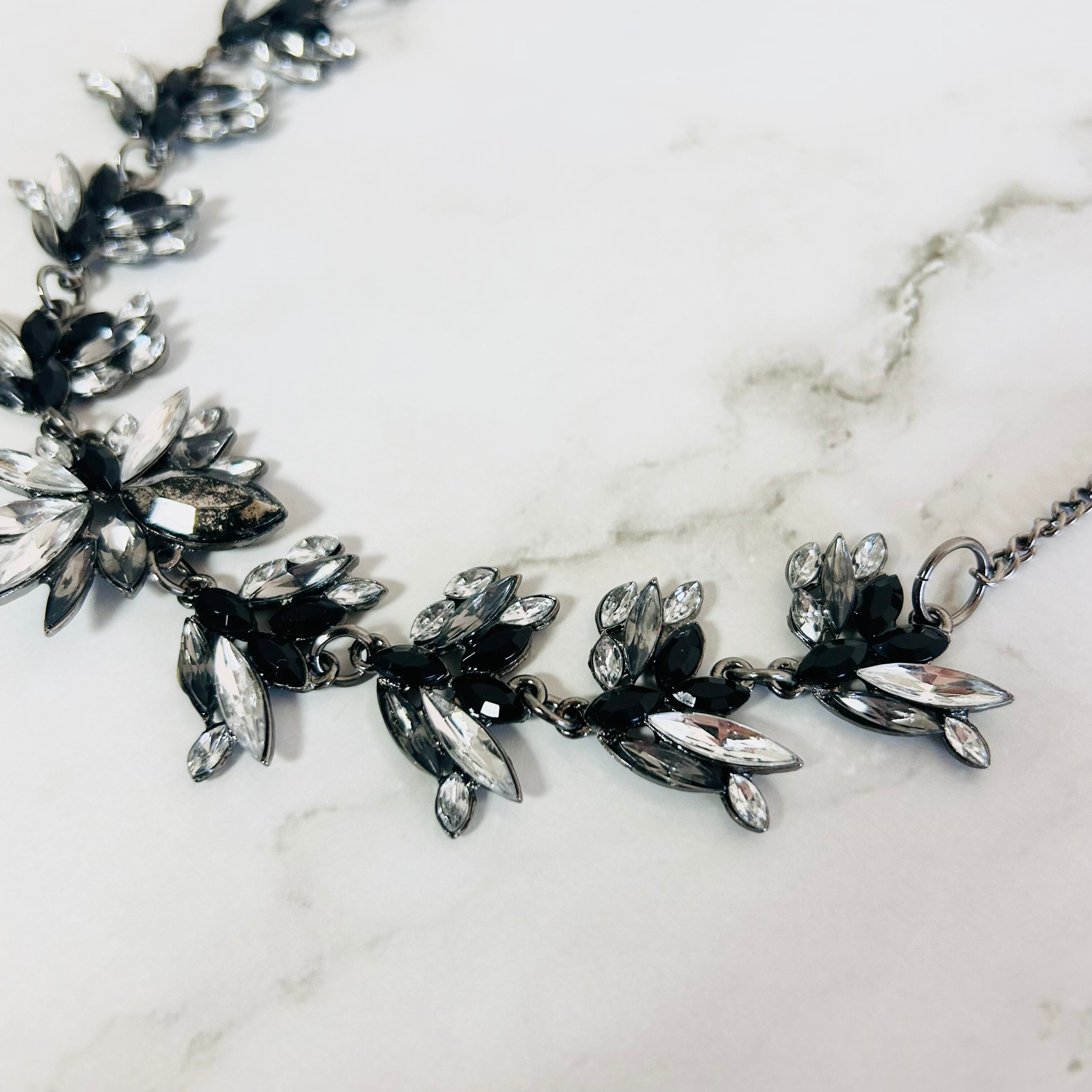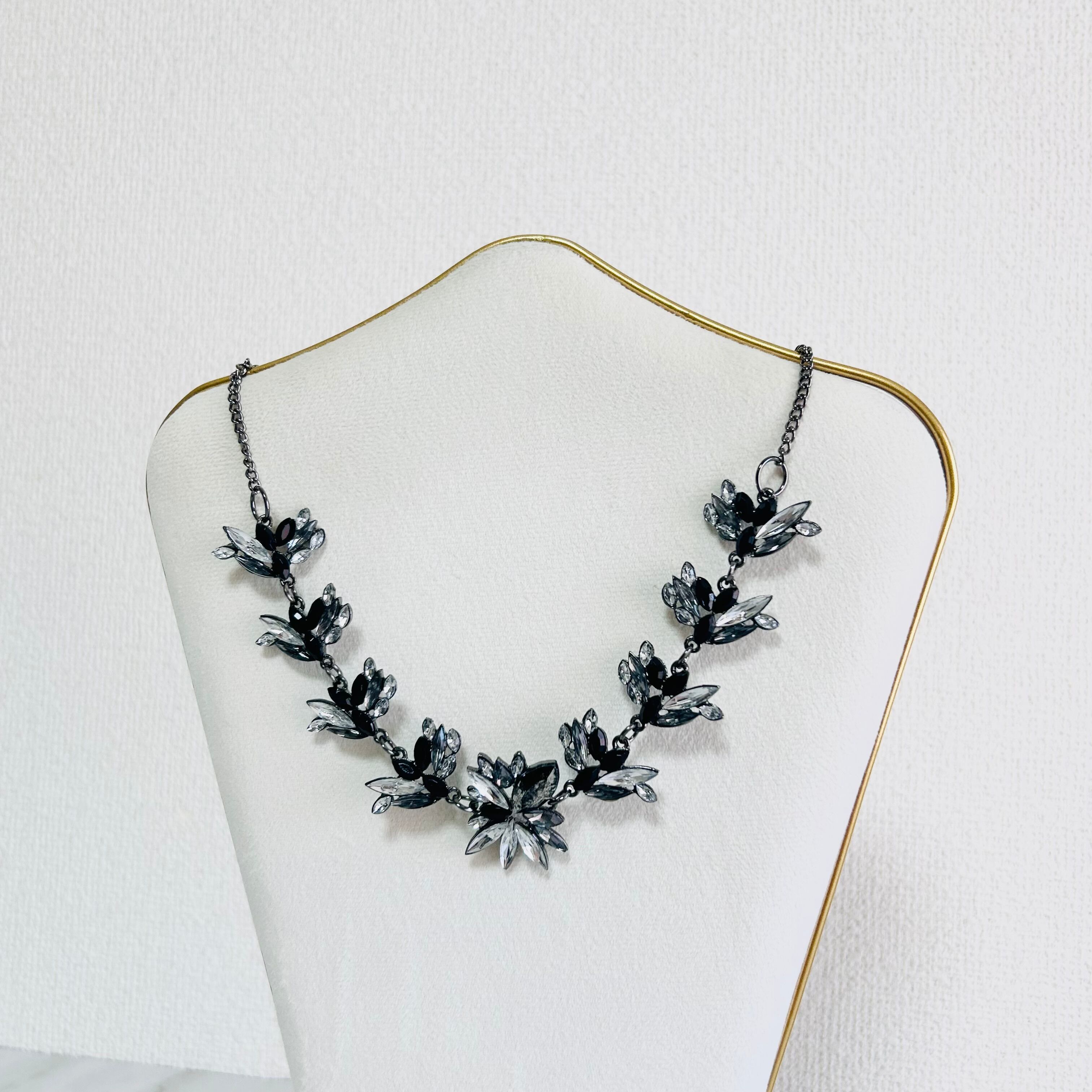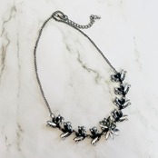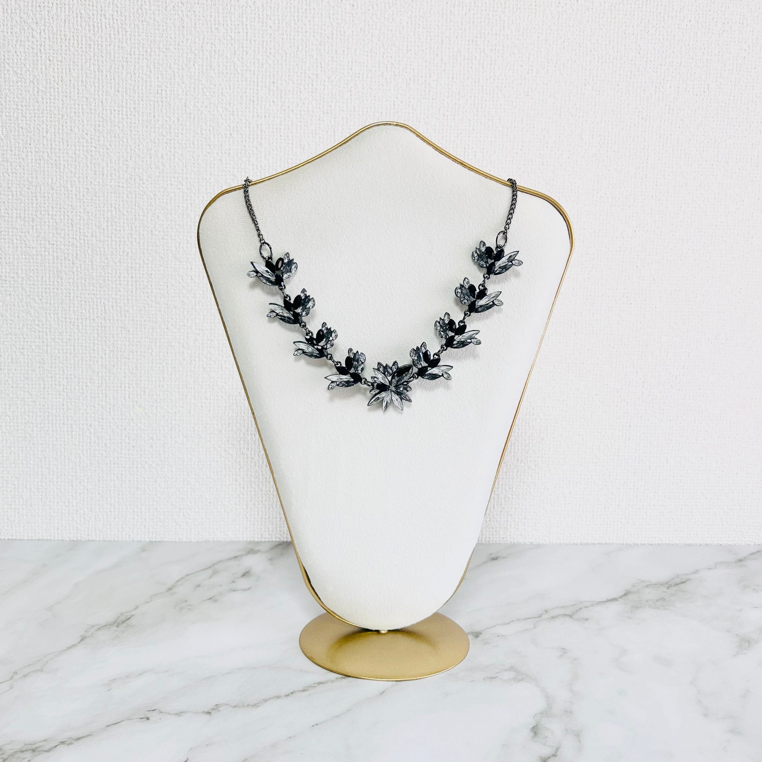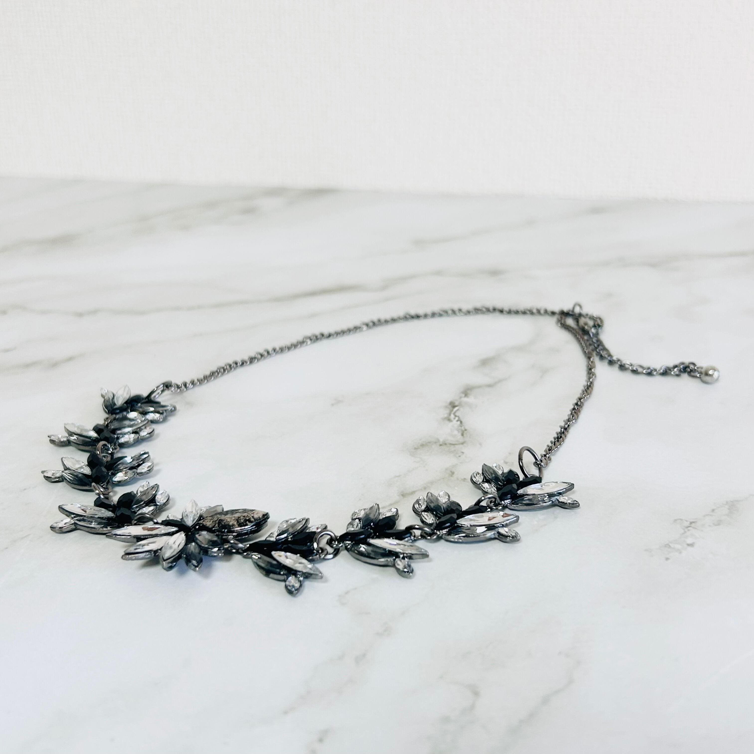 グレイッシュなシルバートーンの土台に、アクリル素材のリーフ状のビジューを贅沢にあしらったネックレスです。