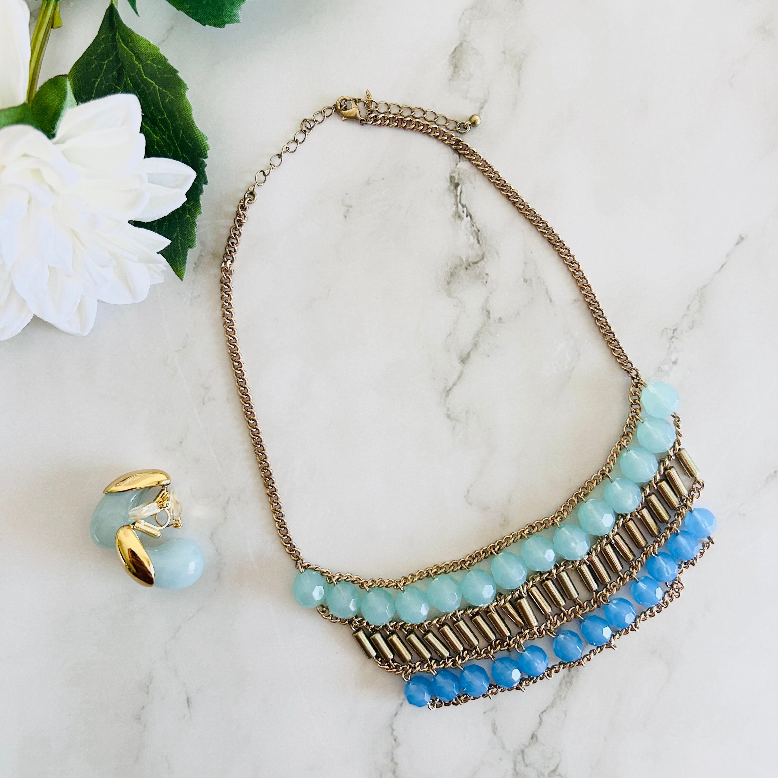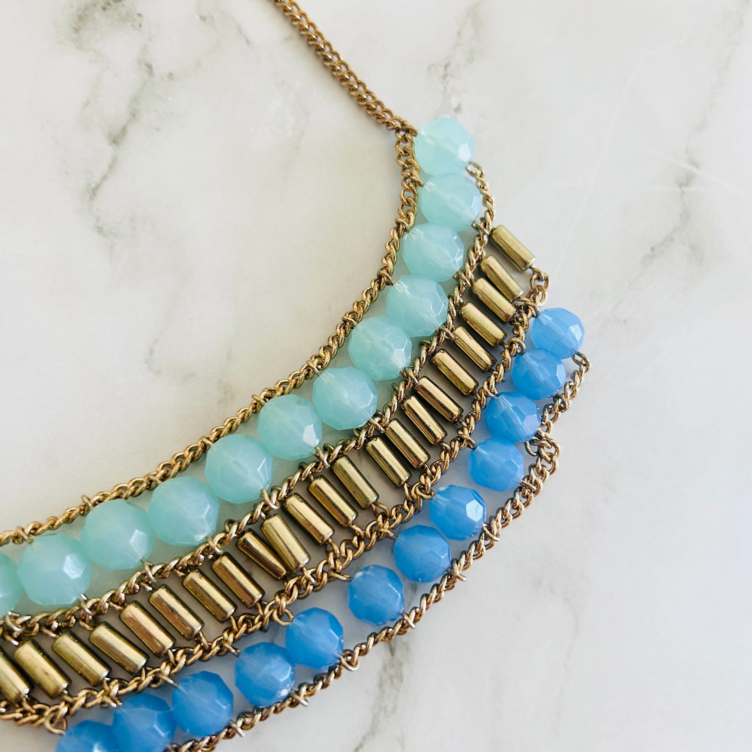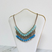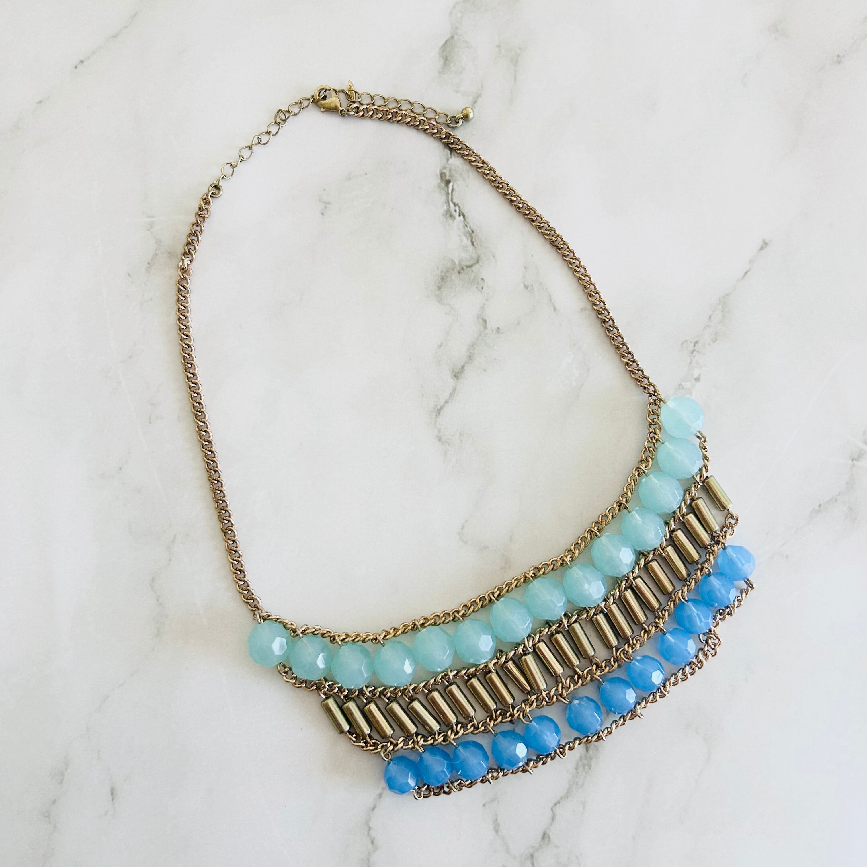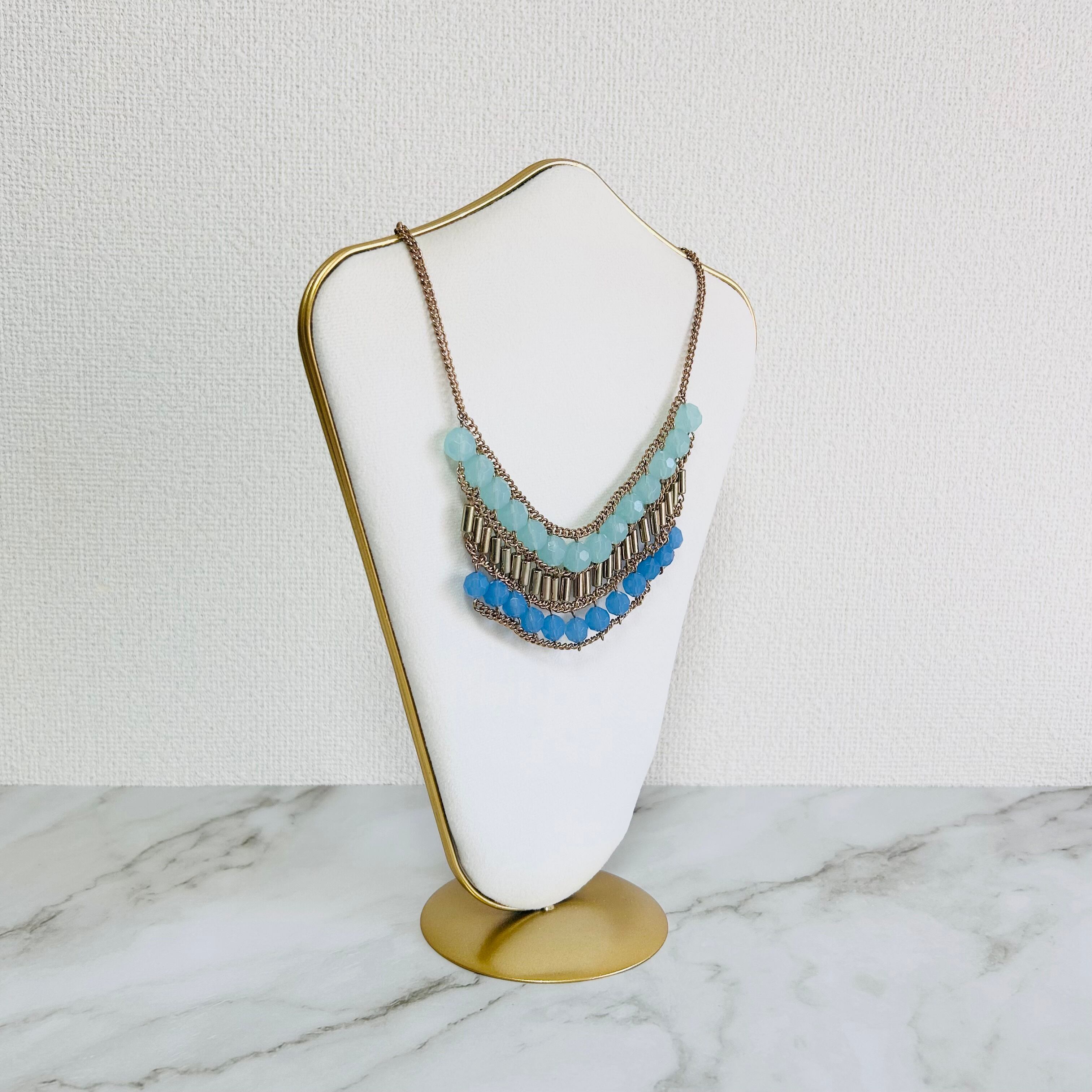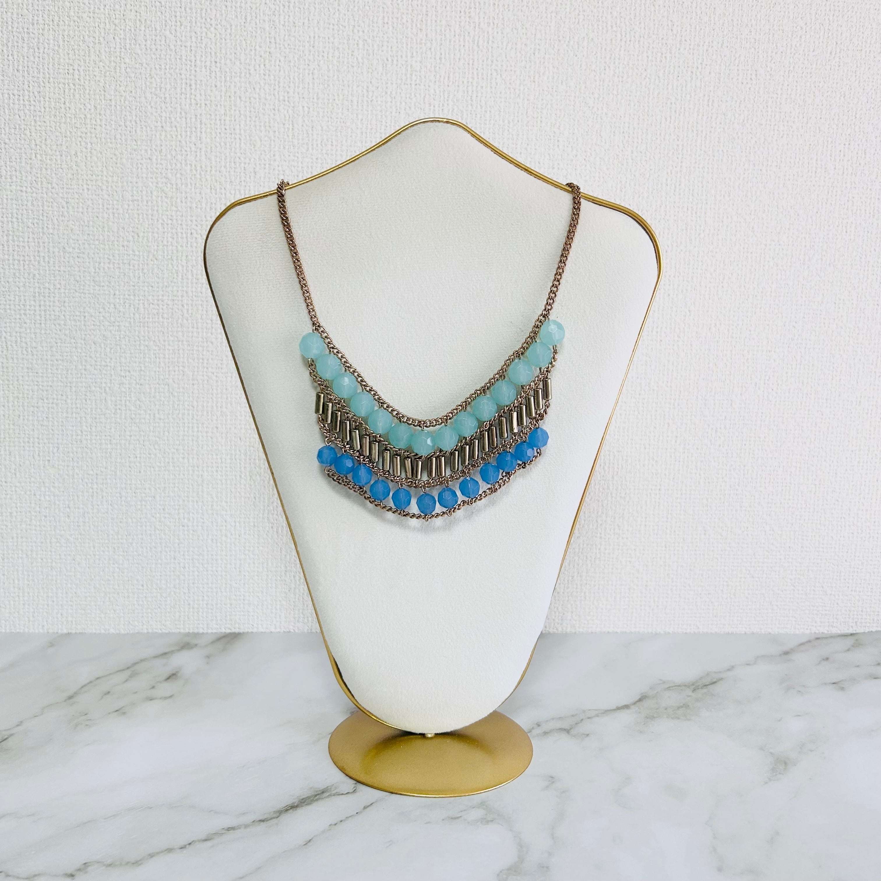 爽やかなライトブルーから色味の異なるブルーへのグラデーションのアクリルビーズに、アンティークゴールドのパーツを組み合わせたネックレスです。