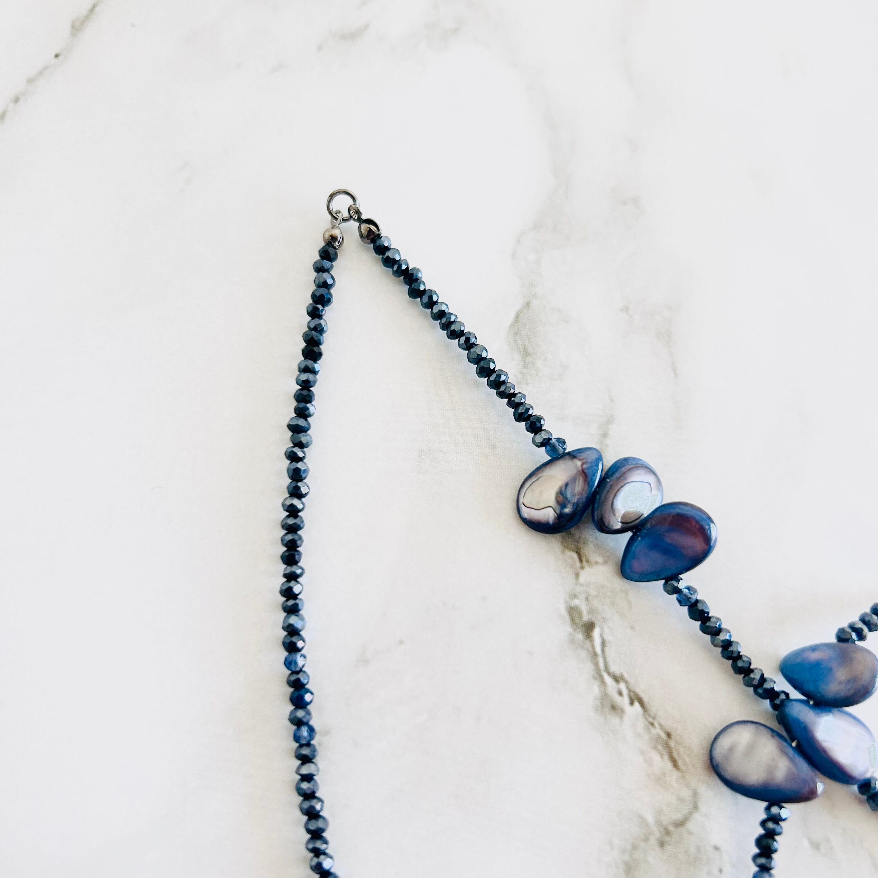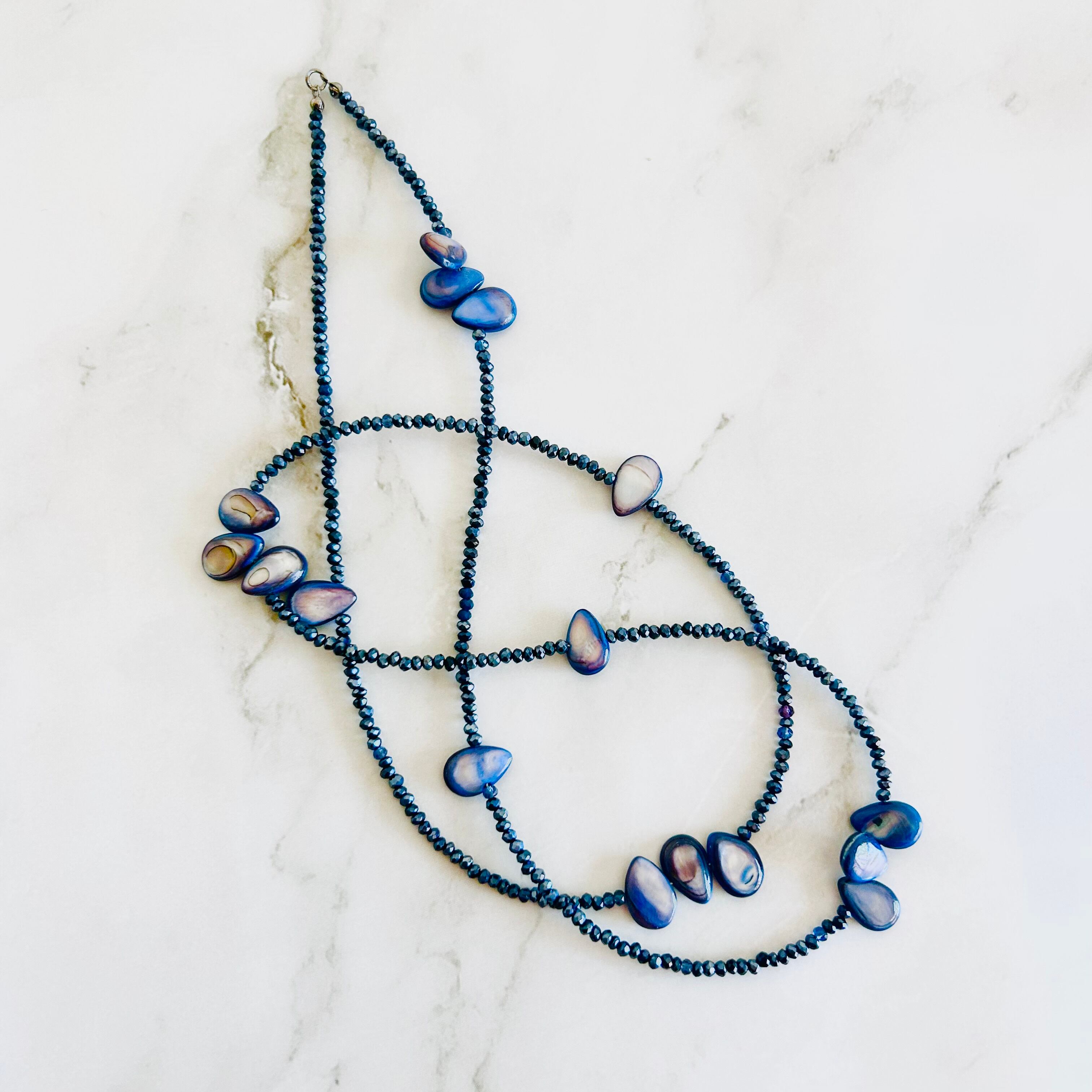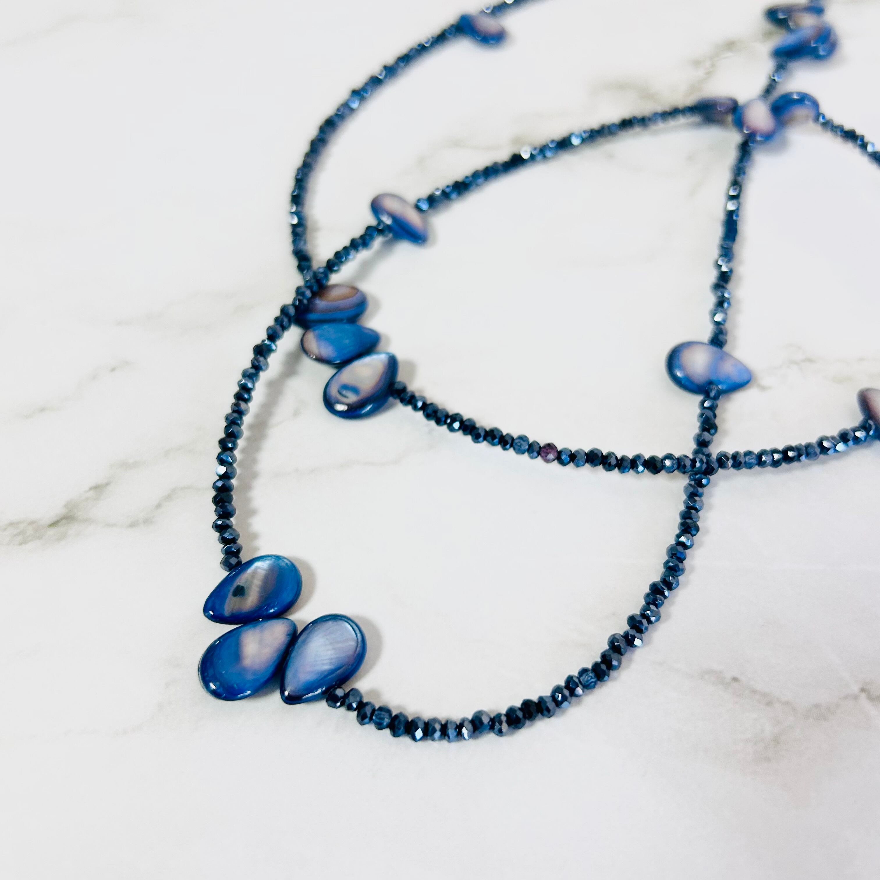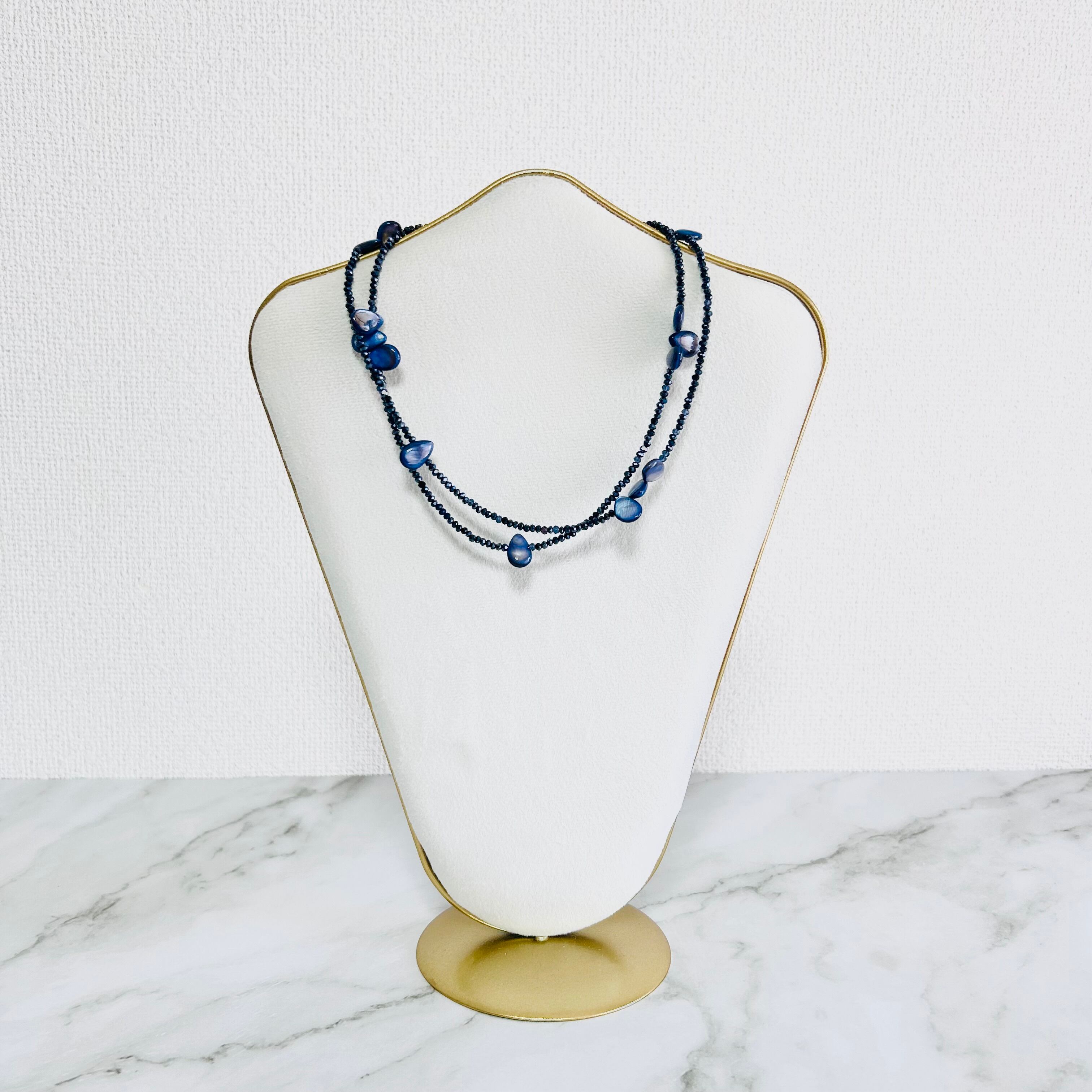 艶やかなシェルパーツと、繊細なカットが美しいチェコビーズを組み合わせたロングネックレスです。
